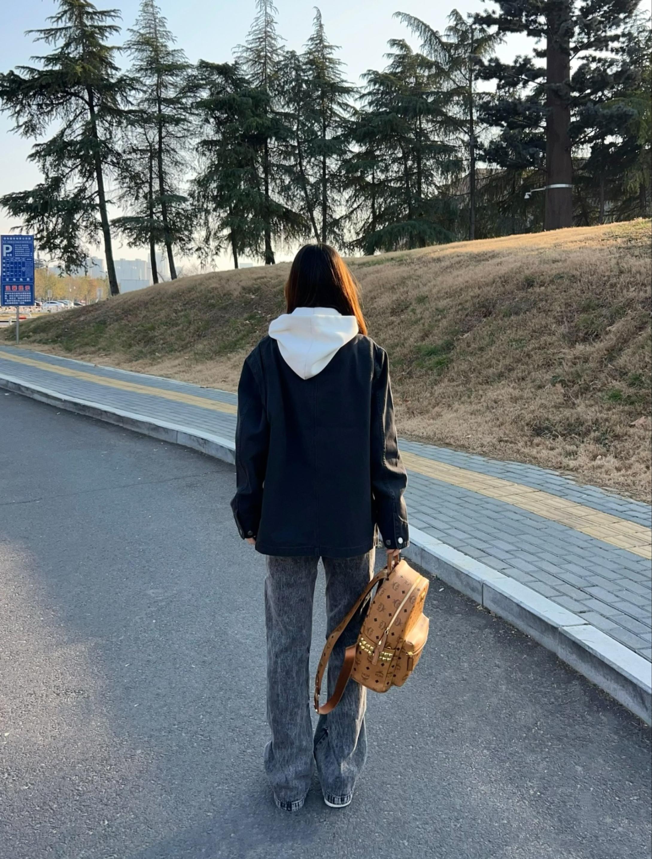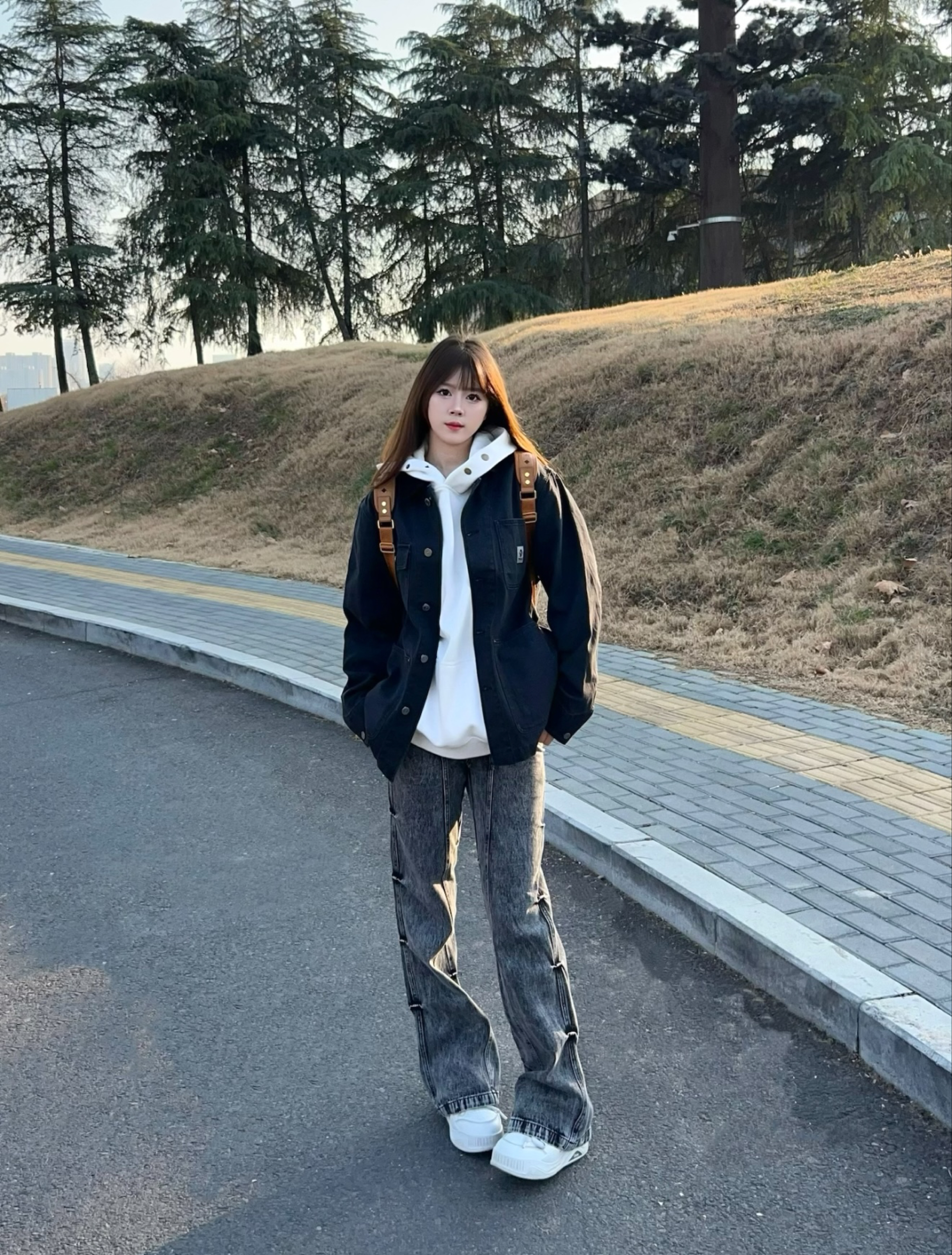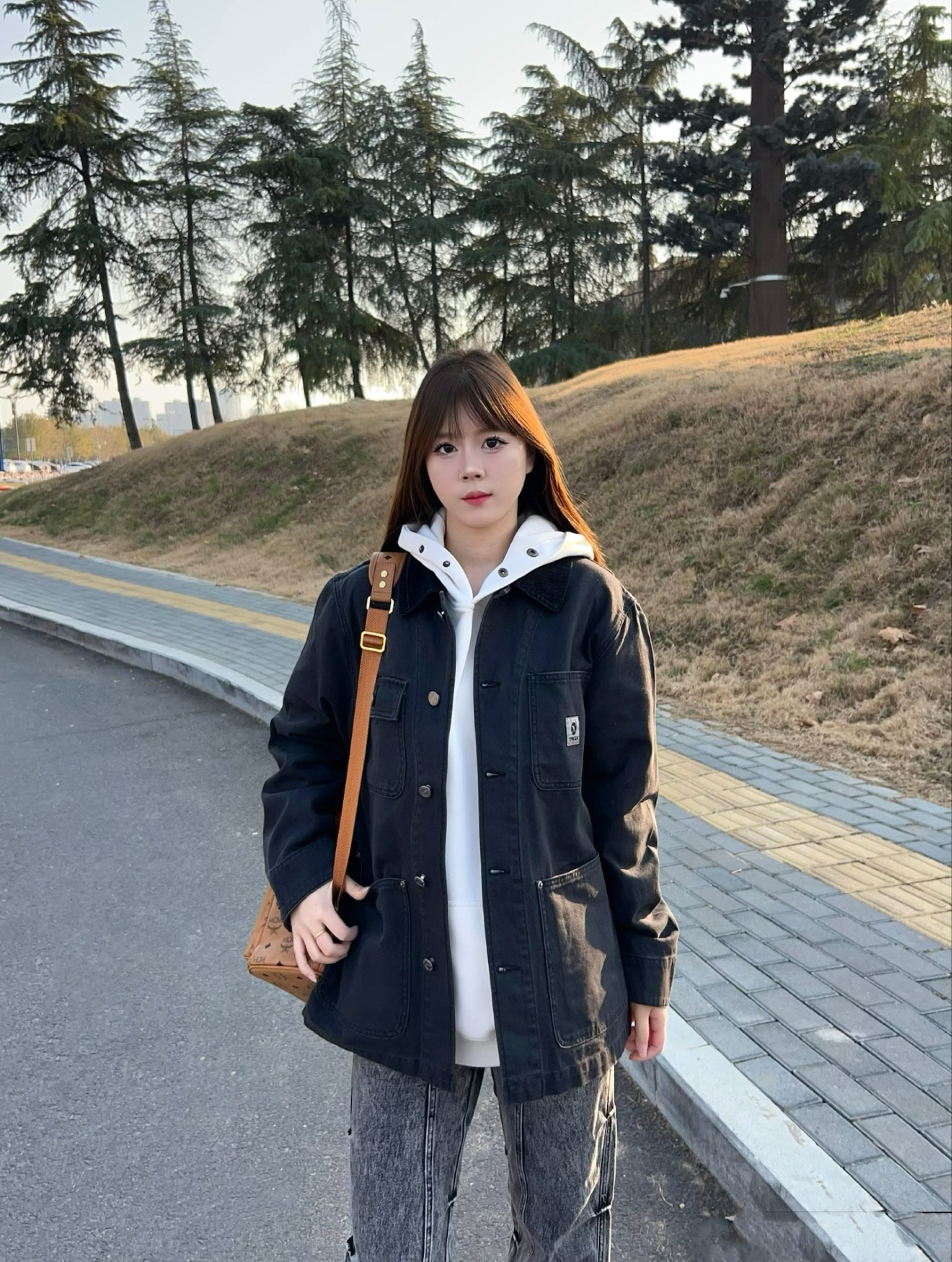 👔今天上身一件黑色的牛仔外套 165 100m 宽宽松松的版型好喜欢呀🉑️ 衣服很立挺不会软榻 ✅ 颜色超显白 里面叠穿卫衣很有层次感👌 男女同款 逛街 通勤都很合适🤩