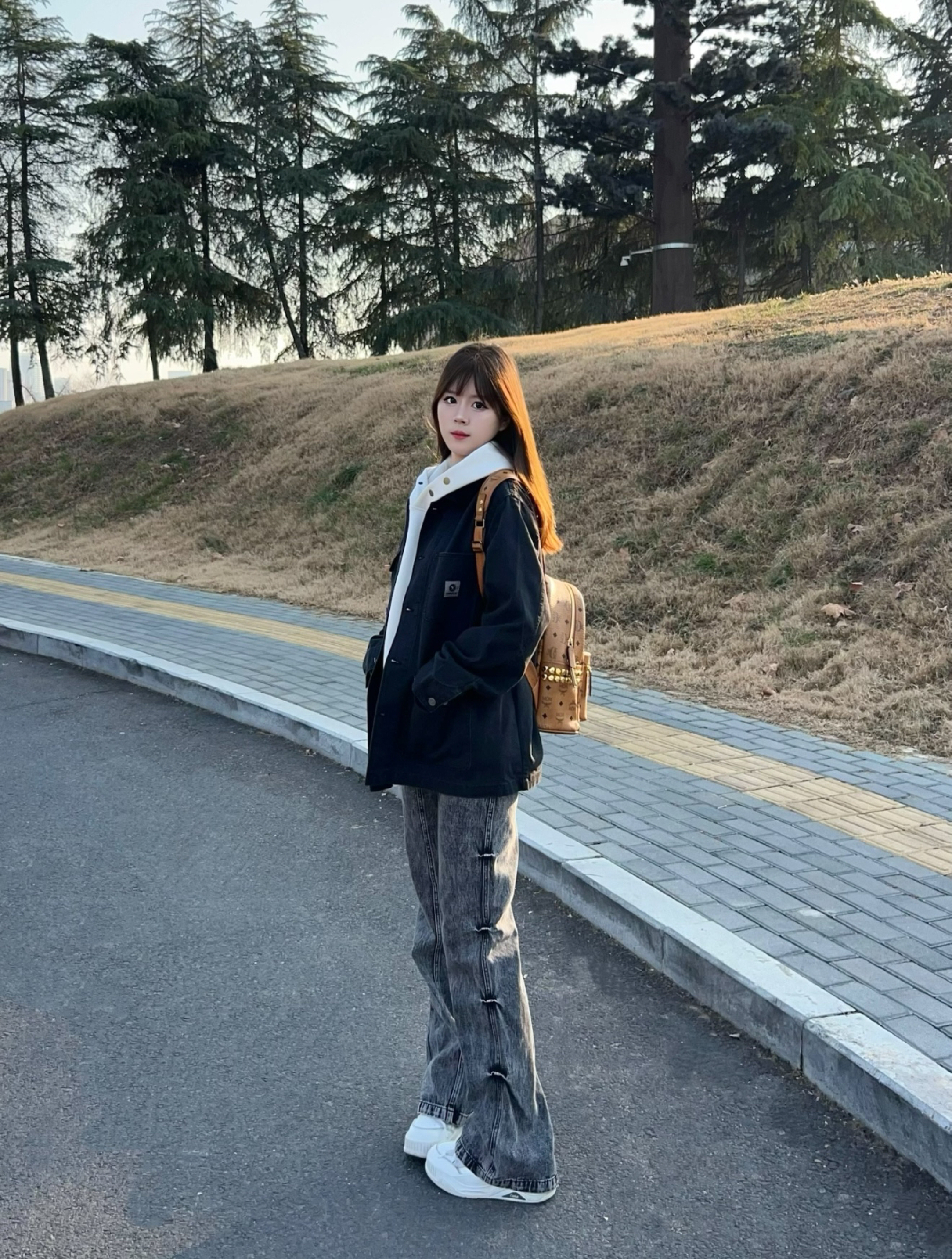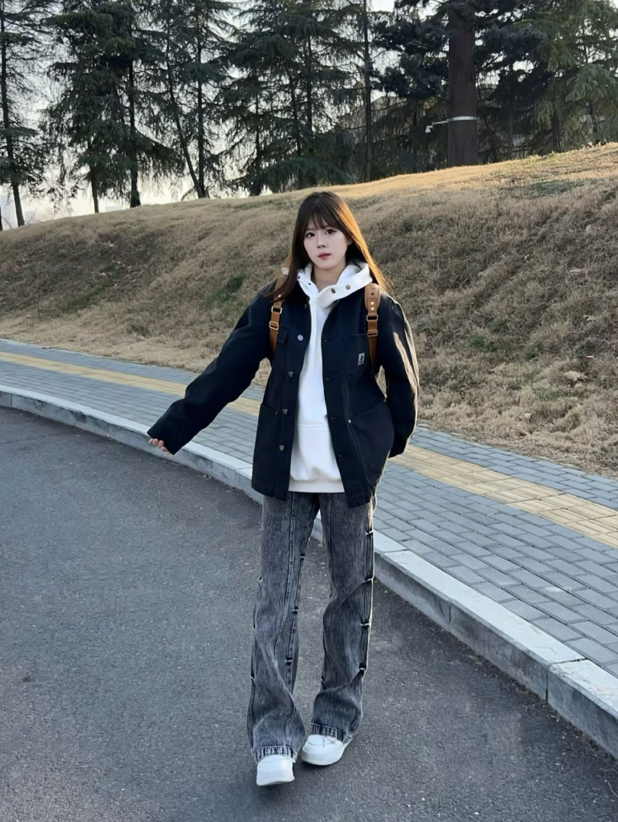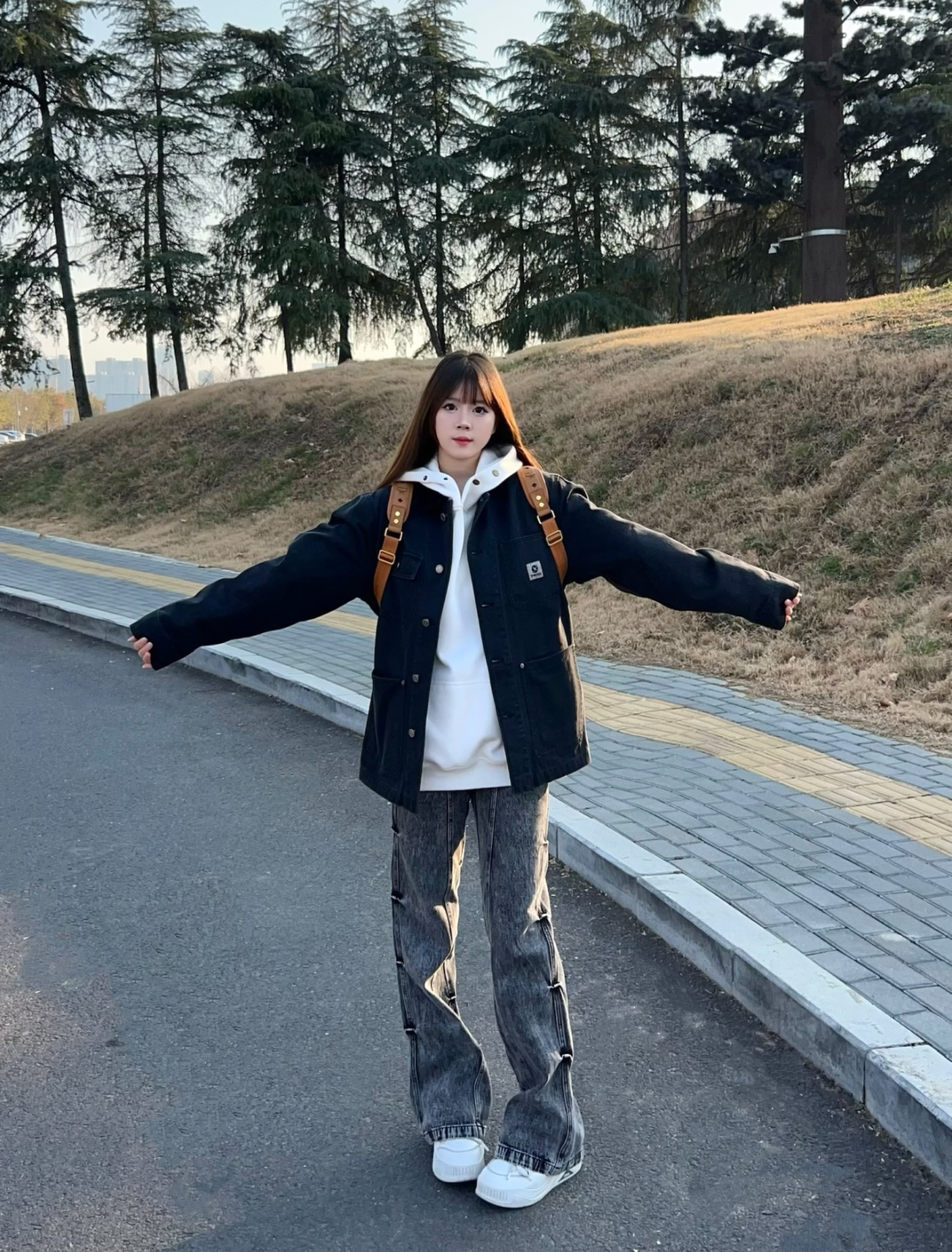 👔今天上身一件黑色的牛仔外套 165 100m 宽宽松松的版型好喜欢呀🉑️ 衣服很立挺不会软榻 ✅ 颜色超显白 里面叠穿卫衣很有层次感👌 男女同款 逛街 通勤都很合适🤩