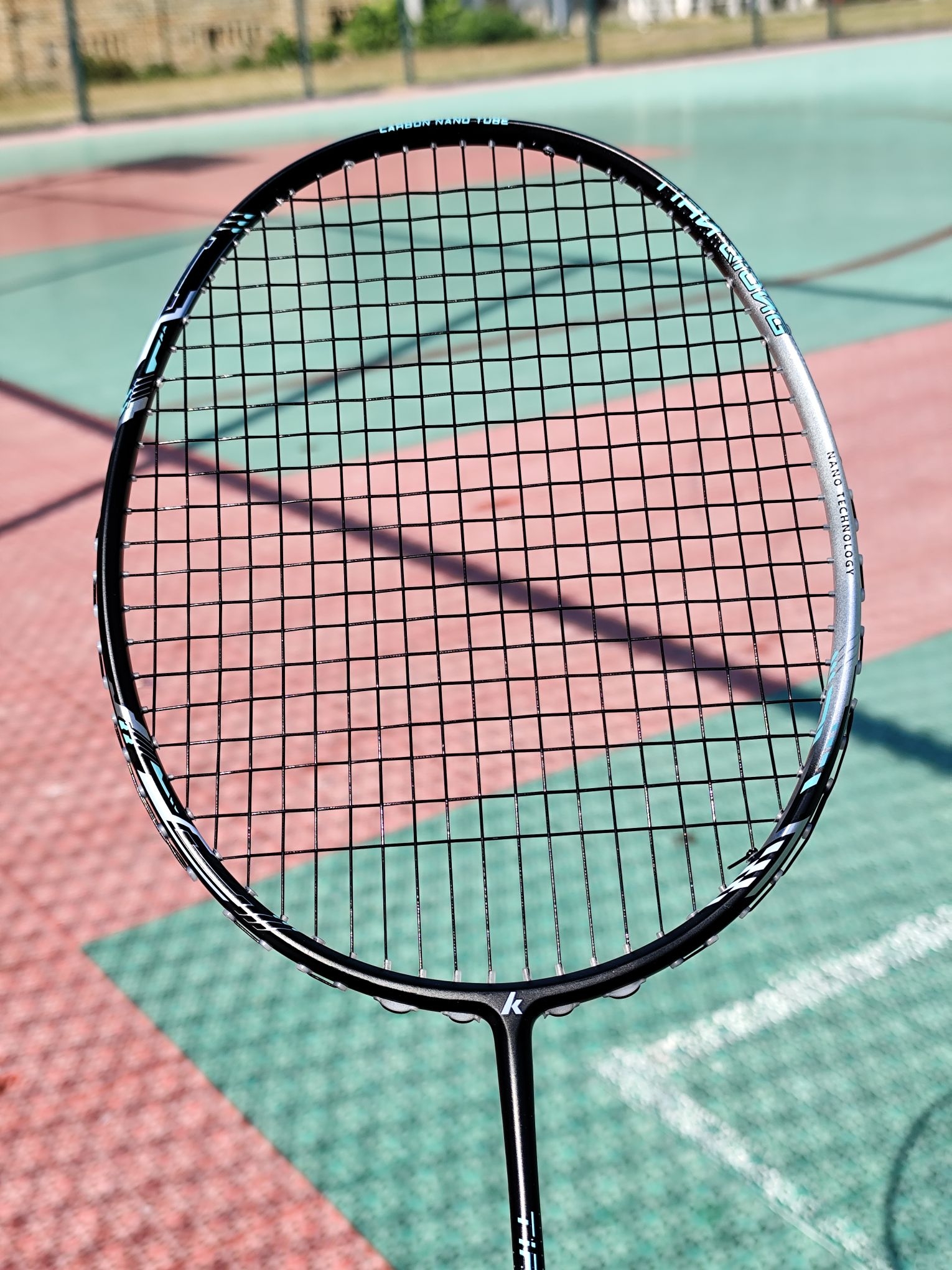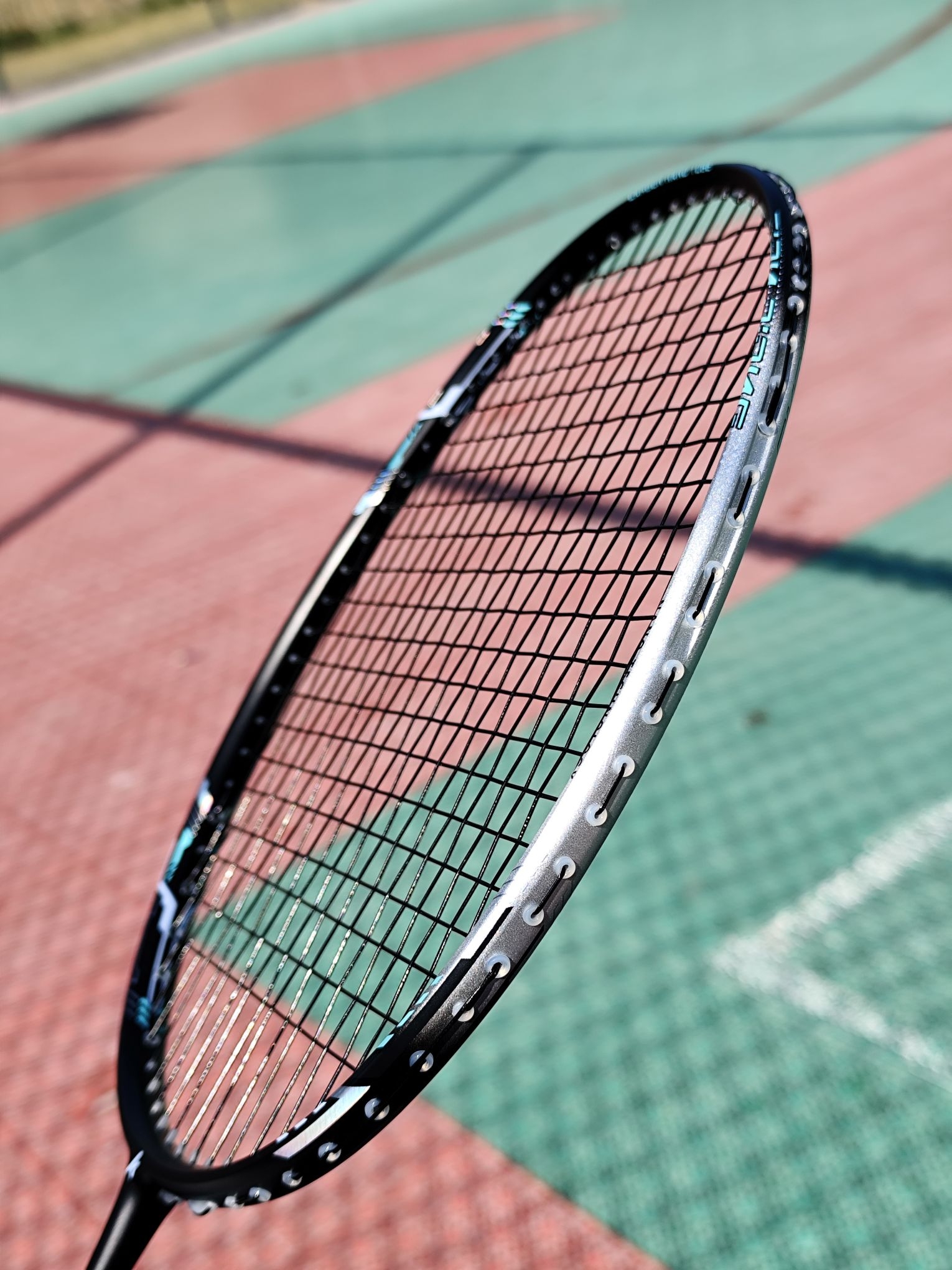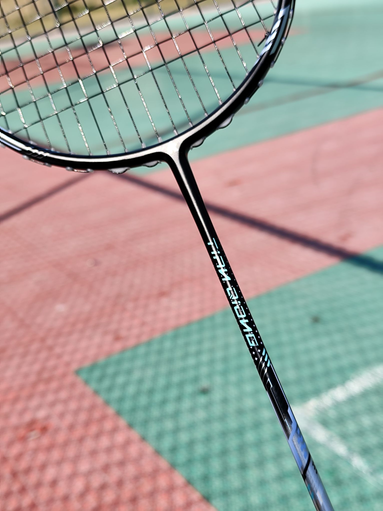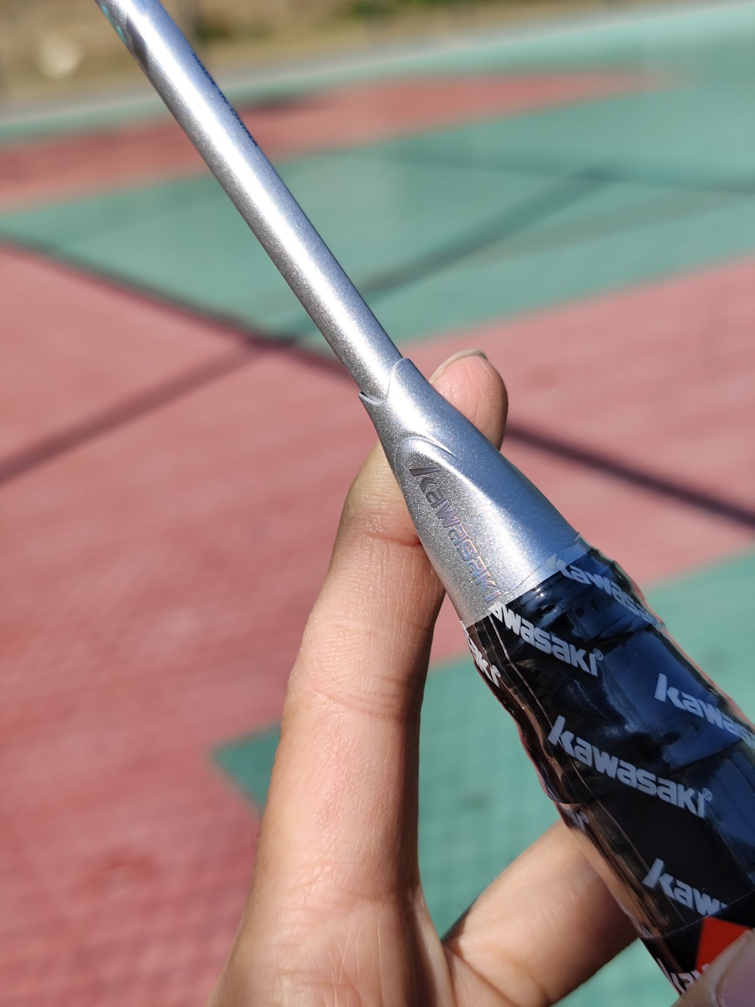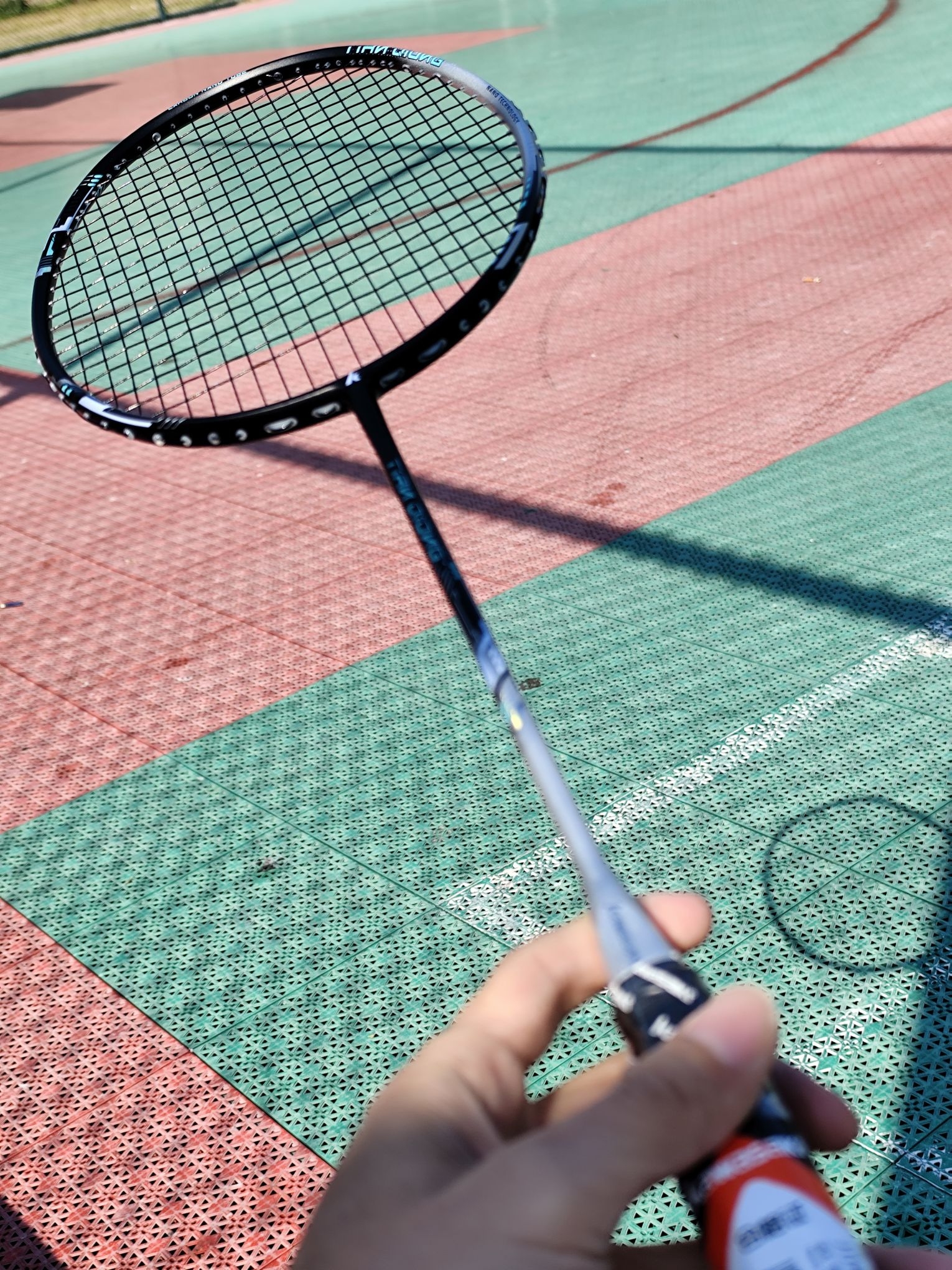今天游泳结束就出来打羽毛球,太舒服了! 这支球拍的手感不错,而且颜值高。 在太阳底下,手柄盖会反光,是带碳板的吗?[思考_blue]