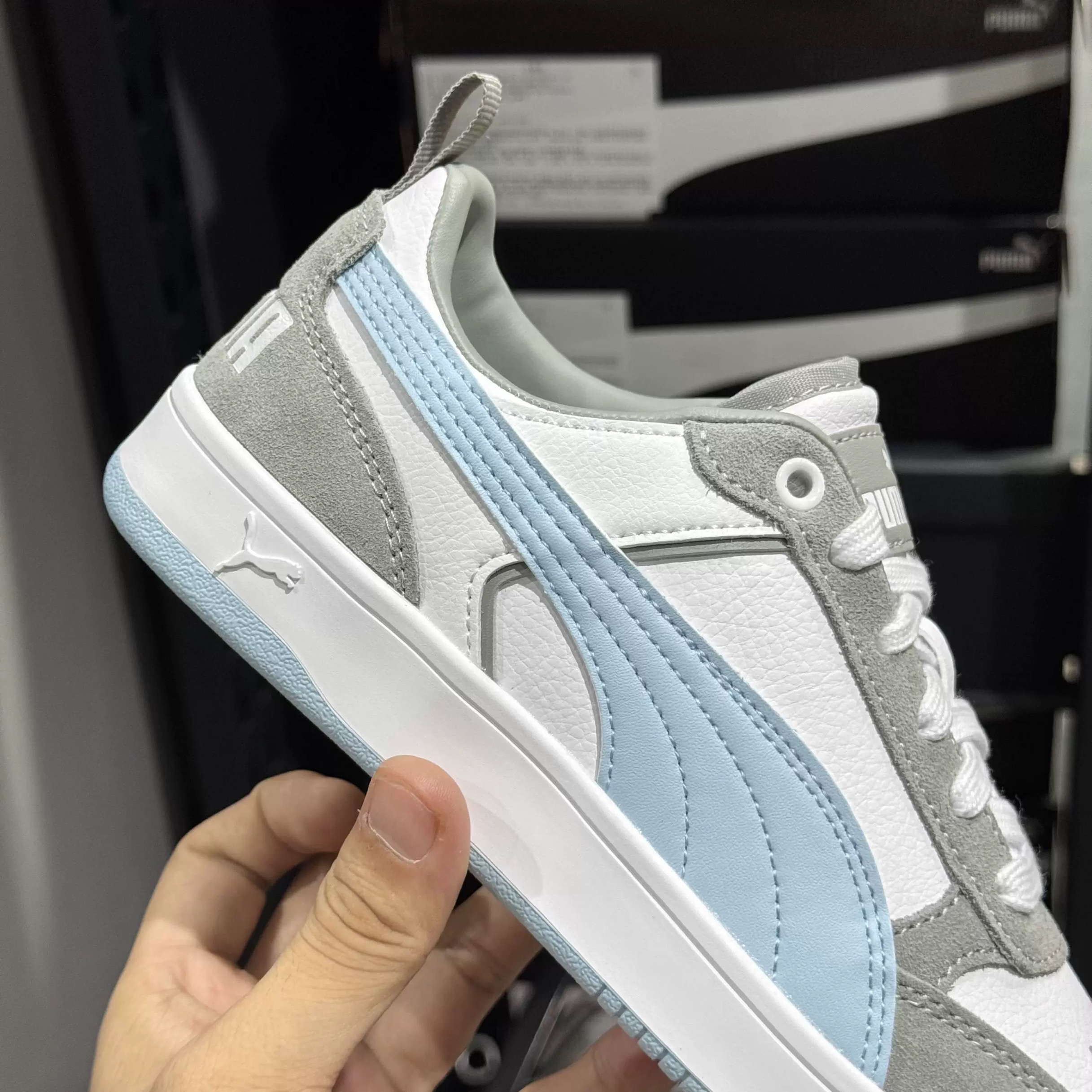 刚上脚这双PUMA板鞋的时候,第一感觉是鞋型的灰蓝拼色很柔和,搭牛仔裤、运动裤都不突兀。鞋面是皮革加反绒皮的组合,摸着手感还可以,鞋后跟的提拉带穿脱也方便。 平时走路脚感偏软,前掌空间够,我这种宽脚穿着不挤,但鞋底偏薄,走久了硬地会觉得脚底有点硌,大概走40分钟左右就想歇一歇。反绒皮的部分也有点麻烦,不小心蹭到水渍会留下印子,得专门用清洁剂打理。 尺码方面我按平时的码数选的,刚好合脚,没有偏大...