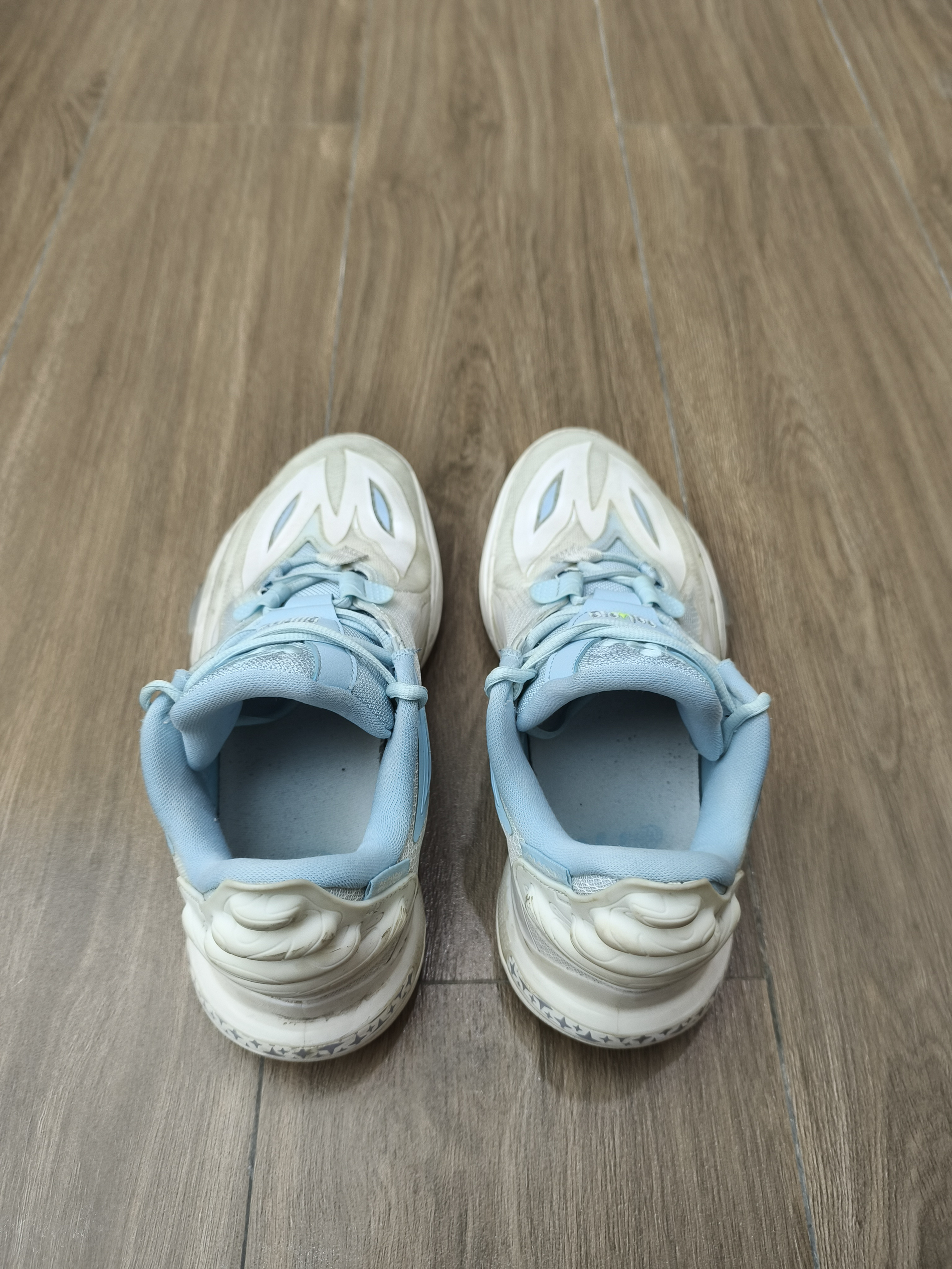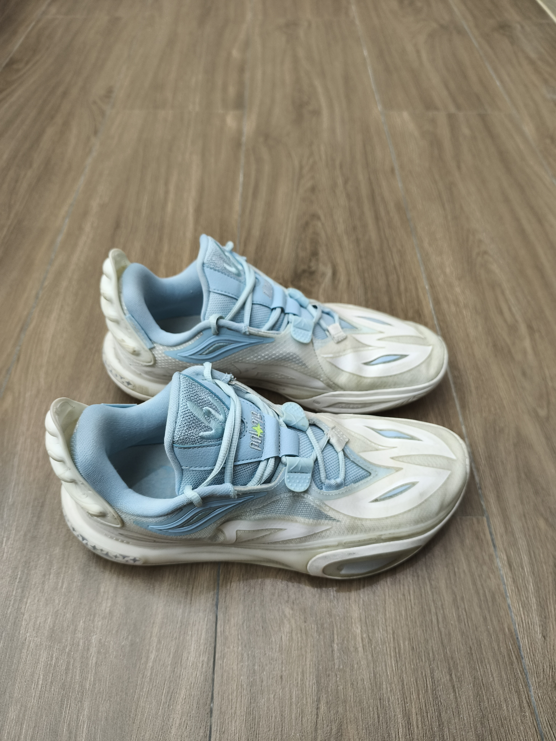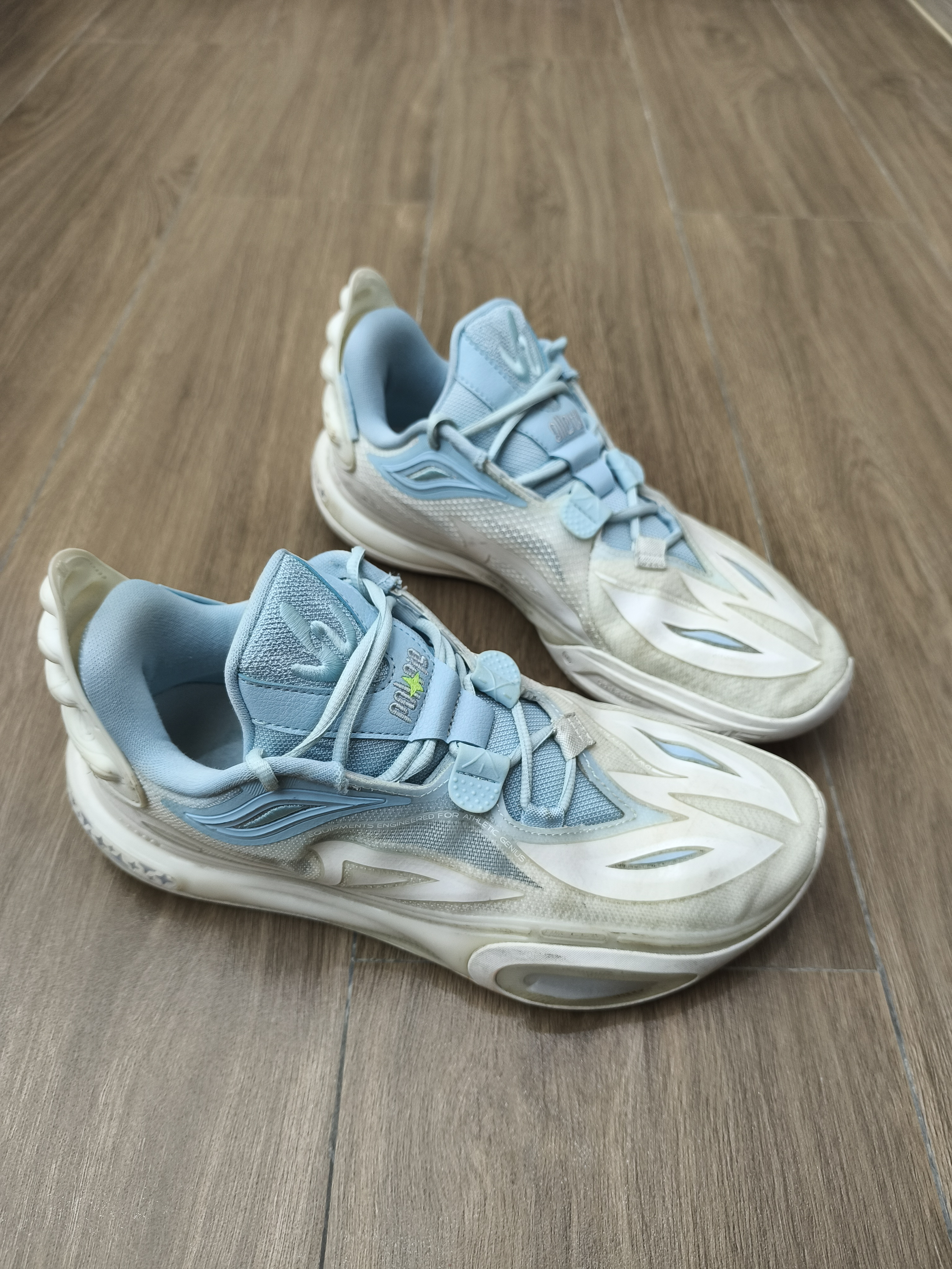 白浅蓝搭配,颜色很清新!鞋身流线型的刀锋纹路做点缀,突出鞋子更长的感觉鞋面是透气网布混着轻质的合成革,透气性好摸起来的质量也舒服,而且这种材质比较耐磨,不会顶到脚背鞋子还采用全掌䨻科技,重心低,脚感韧弹,不易变形,回弹性能不错,室内外场都能驾驭,稳定性高,穿起来防侧防效果明显.以上是我穿之后能明显感受到的效果 价格才300多,挺亲民的,我基本上穿这鞋打球,性能好颜值又高,比较好...