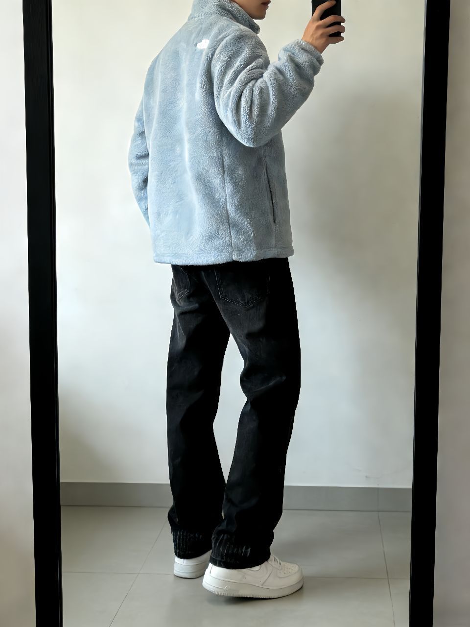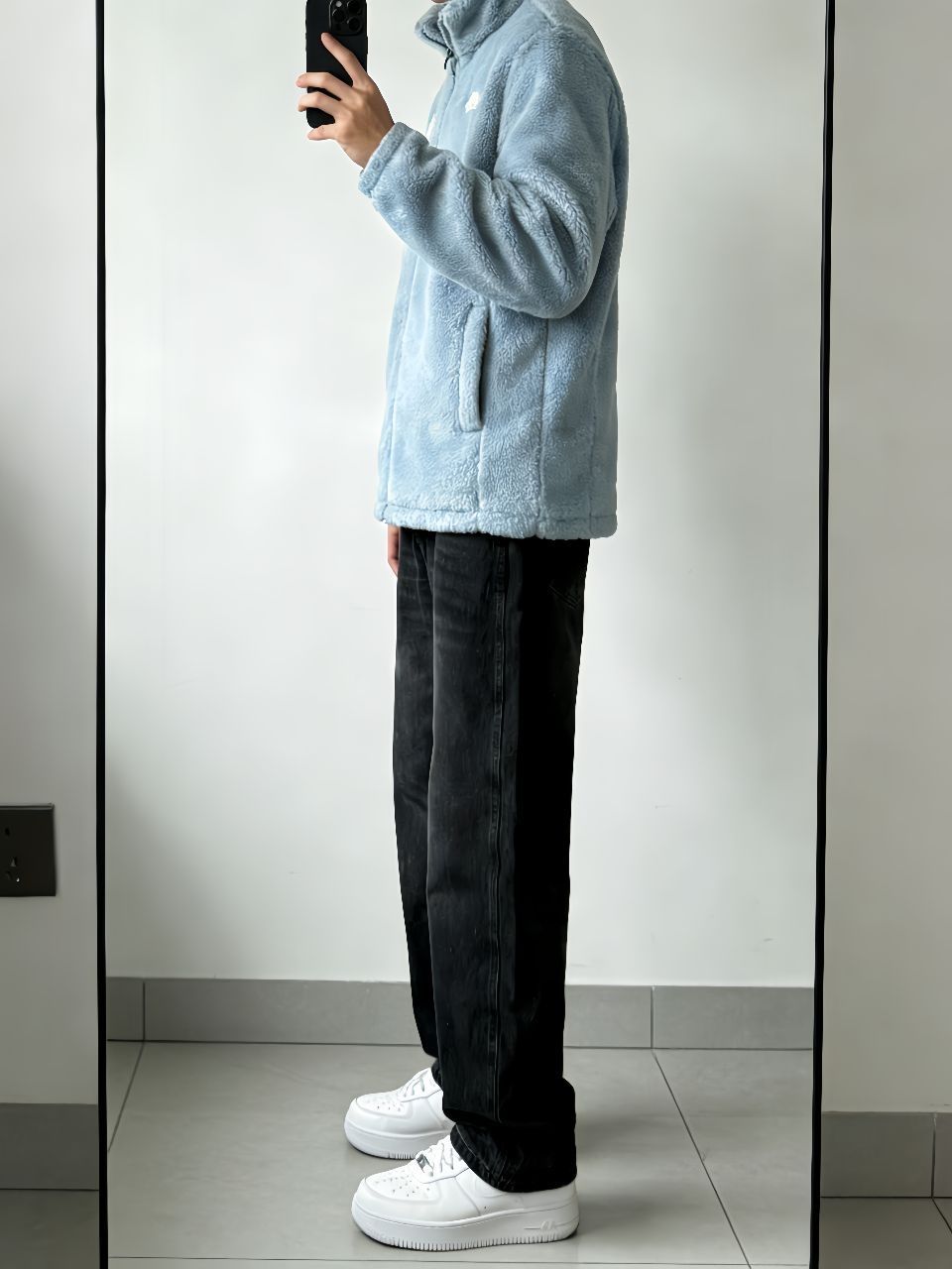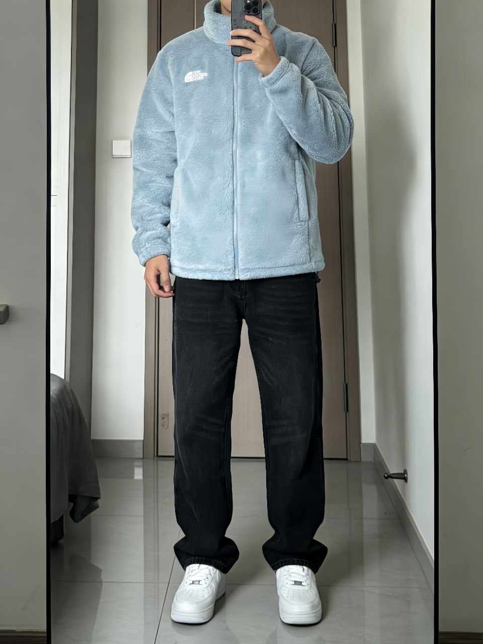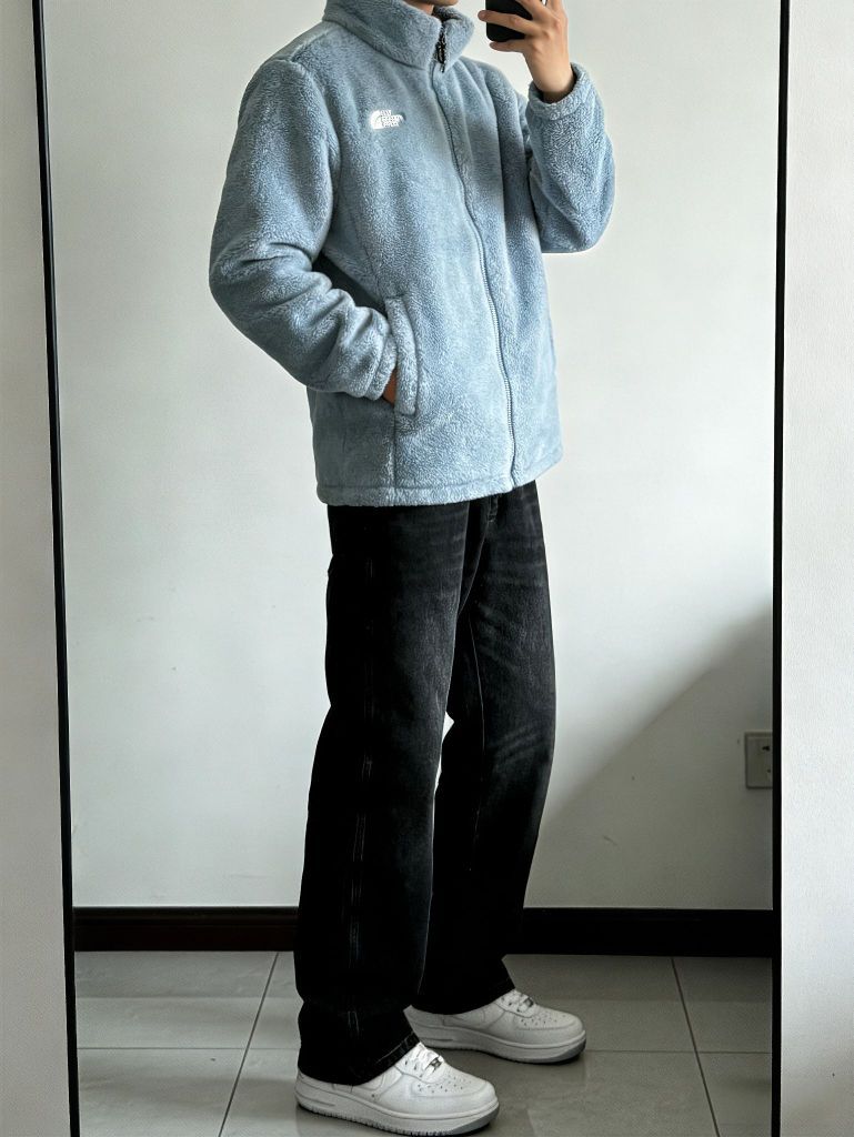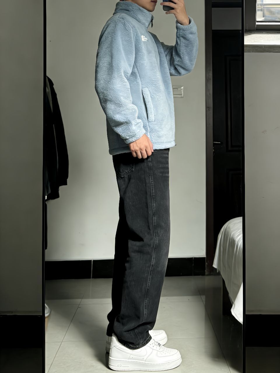 南方秋冬早晚温差大,出门套这件北面抓绒夹克正合适! 一开始怕雾霾蓝显黑还怕抓绒显臃肿,结果版型是直筒的,上身贼藏肉,男女穿都好看。配的66号公路加绒牛仔裤,水洗做旧的质感很对味,加绒款南方穿不闷,直筒版型还显腿长。再踩双纯白空军一号,cleanfit那味儿直接拉满,通勤逛街穿都不违和,这套搭法闭眼抄都不会错~