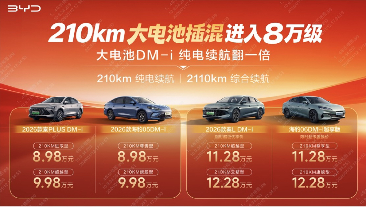 比亚迪开启大电池插混时代:210km纯电续航,8.98万元起!