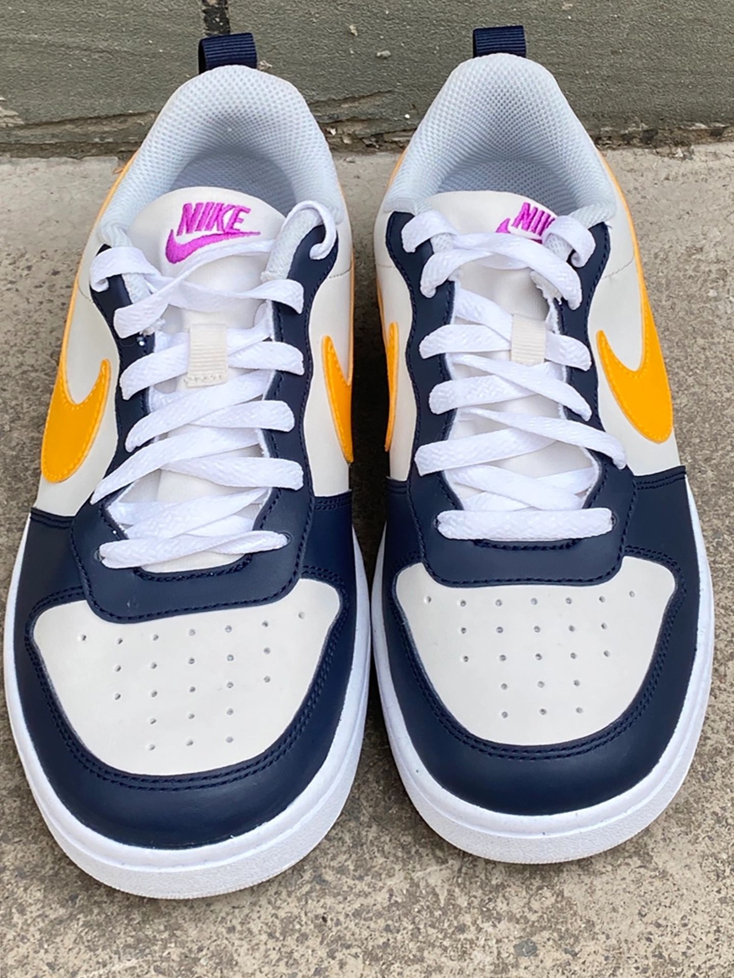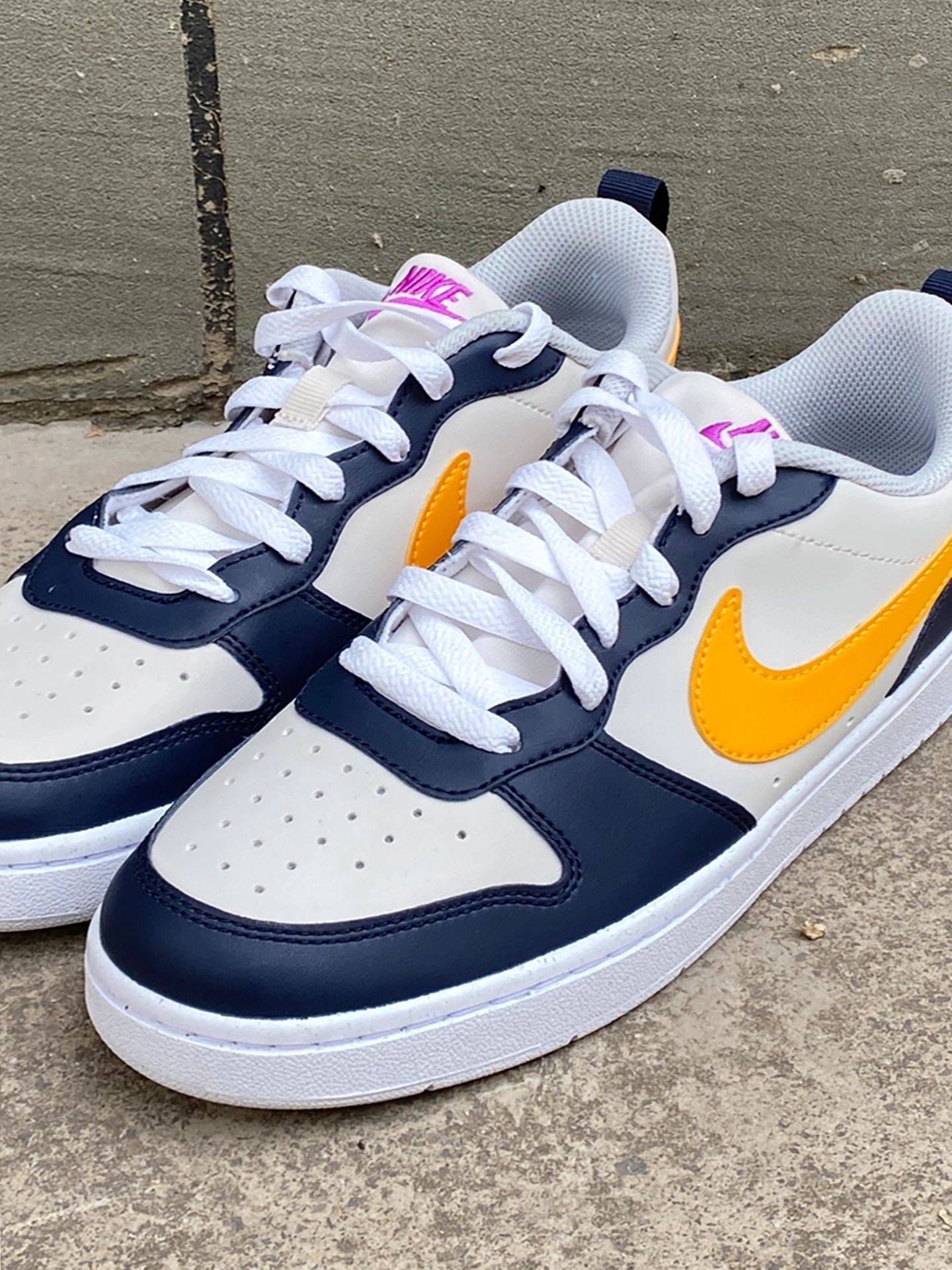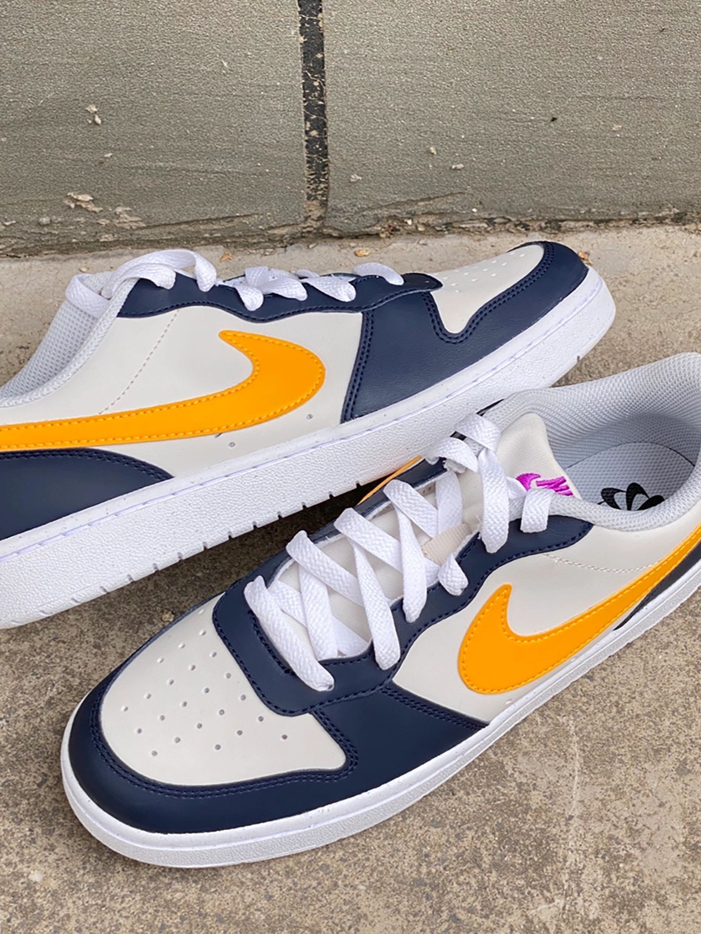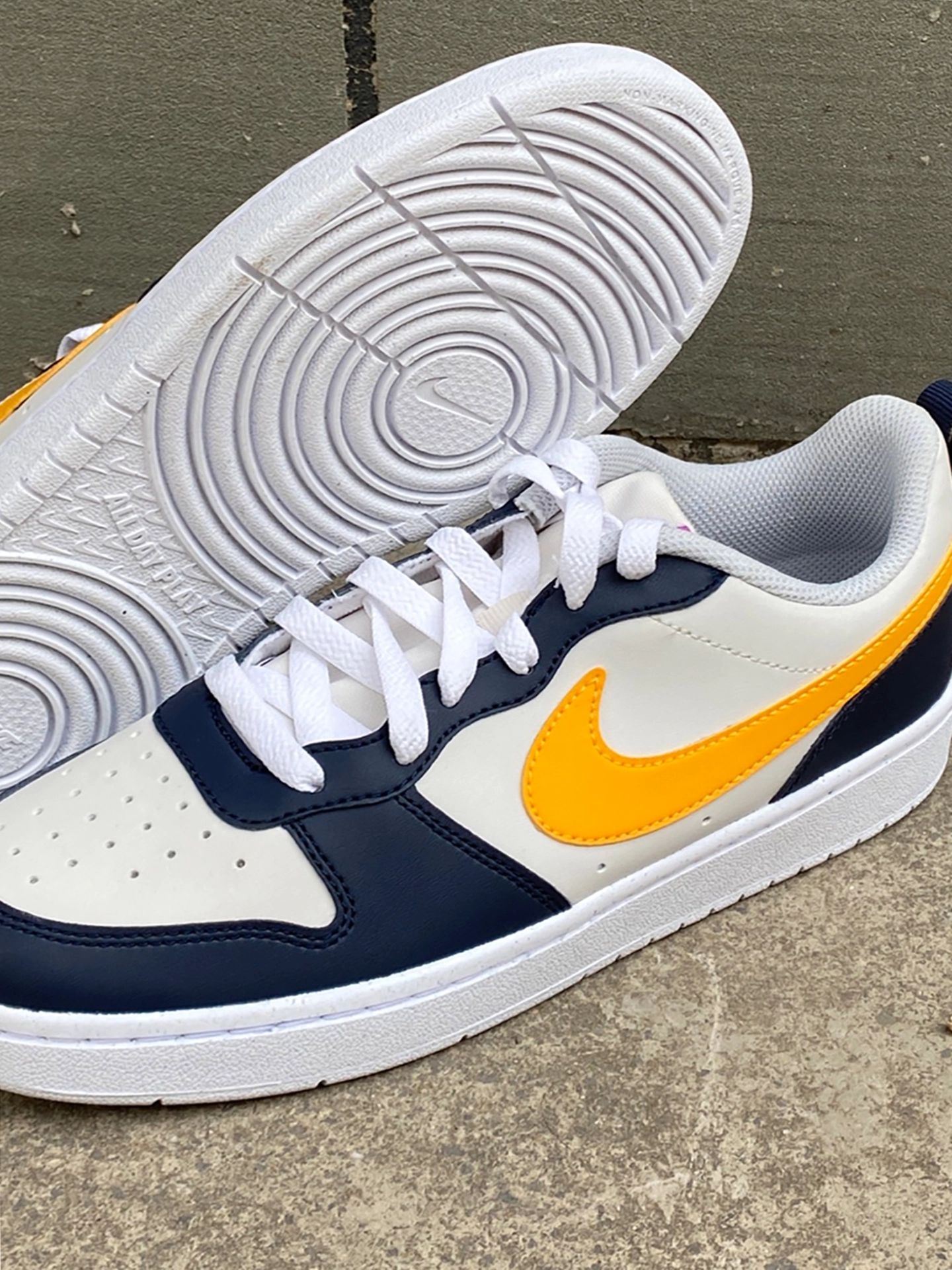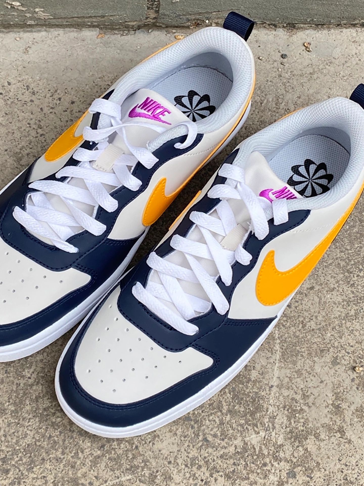 Nike Court Borough蓝黄板鞋:被夸三次|||周末和闺蜜逛公园☀️,穿这双Nike Court Borough板鞋🐾,搭浅蓝直筒牛仔裤+米白短T。走了一下午脚感轻盈舒服,闺蜜突然拉我胳膊说“你这鞋配色绝了!白蓝黄紫撞得好清新🤩”,心里甜滋滋💗。 鞋子是合成革材质,白底色+海军蓝框架,侧面橙黄Swoosh,Logo紫色点缀,颜值在线还耐脏。 尺码我穿不偏码,宽脚姐妹也能入✅。 建议配休...
