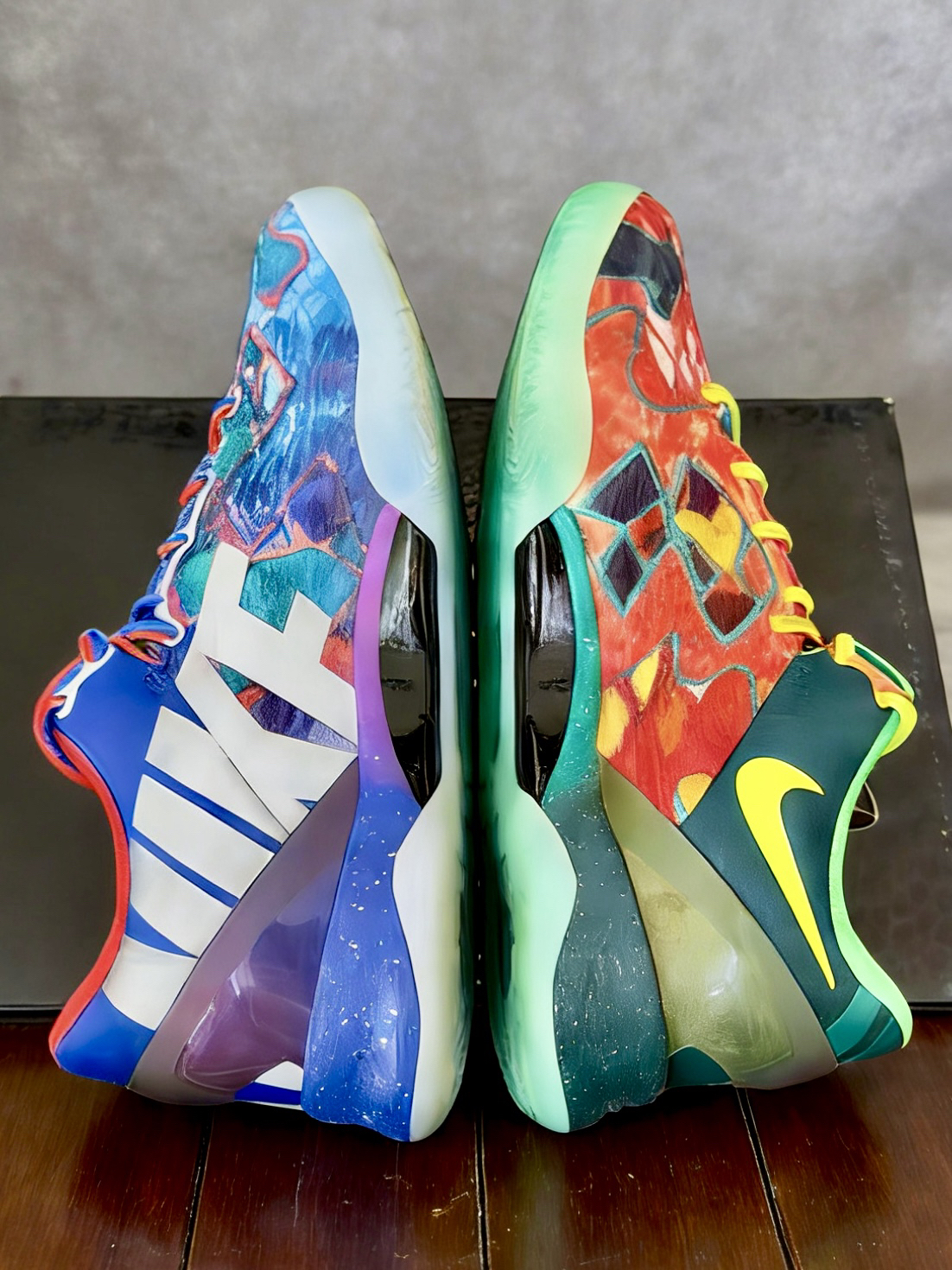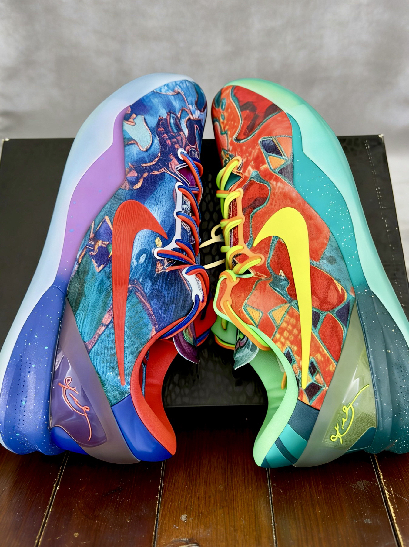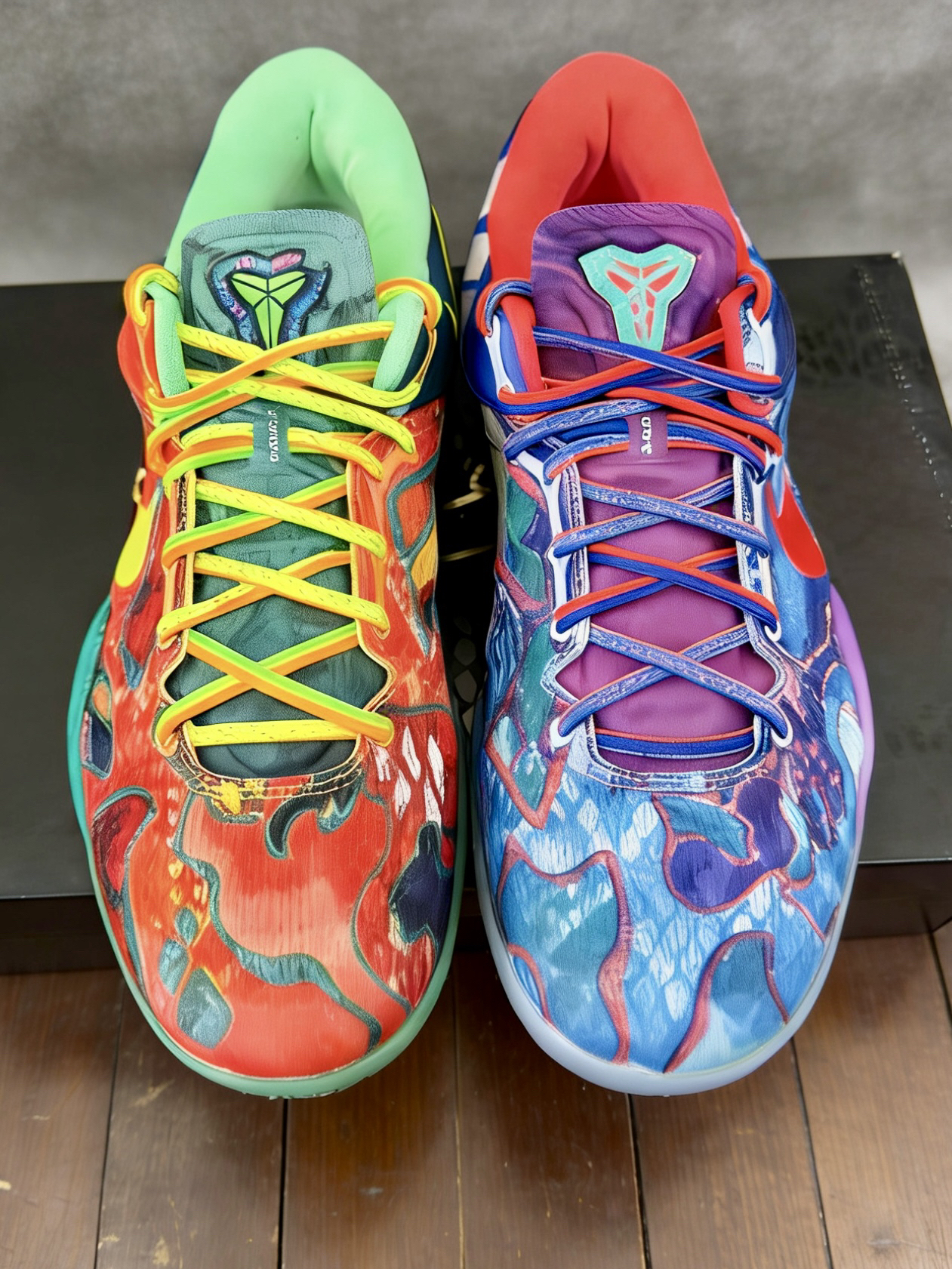 🌟左右脚采用截然不同的设计语言,是这双鞋最震撼的视觉冲击: · 右脚:以亮橙色为基底,搭配极为醒目的荧光绿色Swoosh钩子,热情张扬。 · 左脚:以深空蓝色为主调,点缀亮橙色Swoosh钩子,并在鞋身内侧设计有超大的3M反光“NIKE”字样,深邃而充满细节。 · 特殊元素:鞋面上巧妙融入了科比和他的女儿Gianna的球衣号码“8”、“24”和“2”的重复图案,以此向传奇致敬。 · 外底玄机:半...