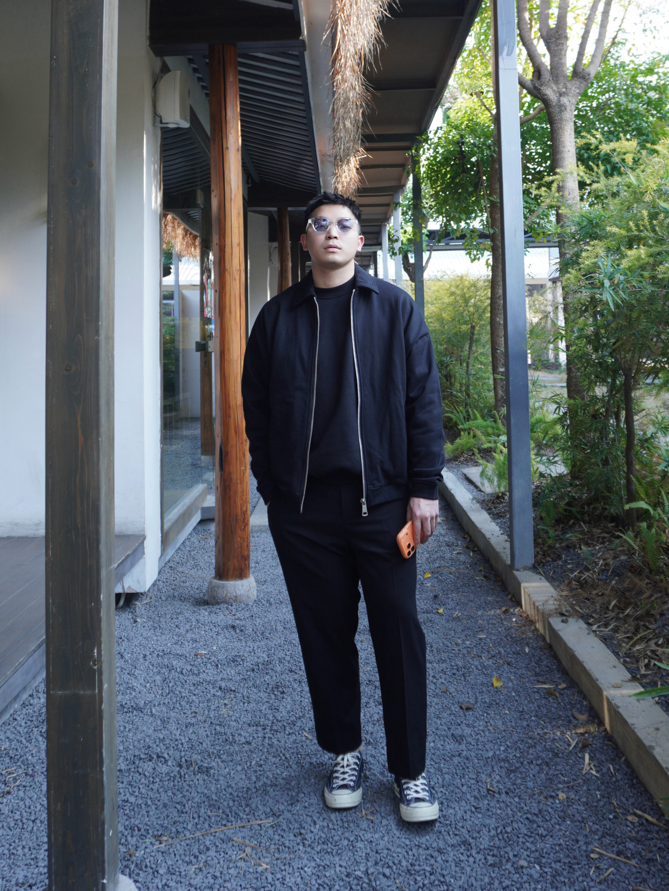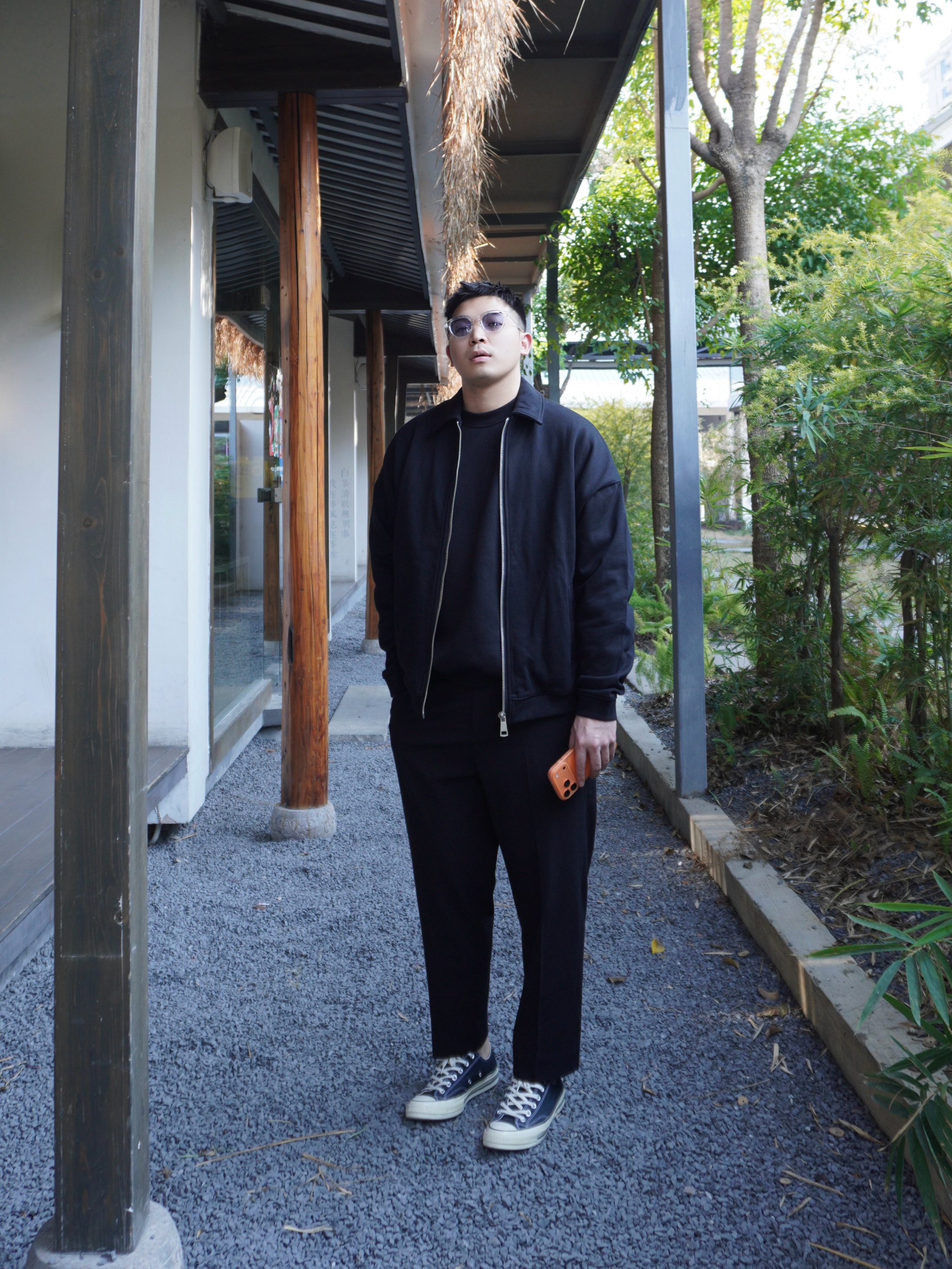1. 上身主打“保暖层次” 冬天通勤怕冷,内搭选了加绒卫衣,先保暖到位。外面叠穿一件微宽松的黑色夹克,同色系颜色利落。 2. 裤长决定“利落感” 通勤风穿搭避免拖沓,选了微九分长度,刚好露出一点脚踝。让裤子和腿部线条更修长。 3. 鞋子保持“松弛” 通勤不想穿皮鞋那么累,一双经典的黑色匡威刚好。鞋型修长显脚瘦,跟九分裤是很搭,职场上也带一些休闲感。
