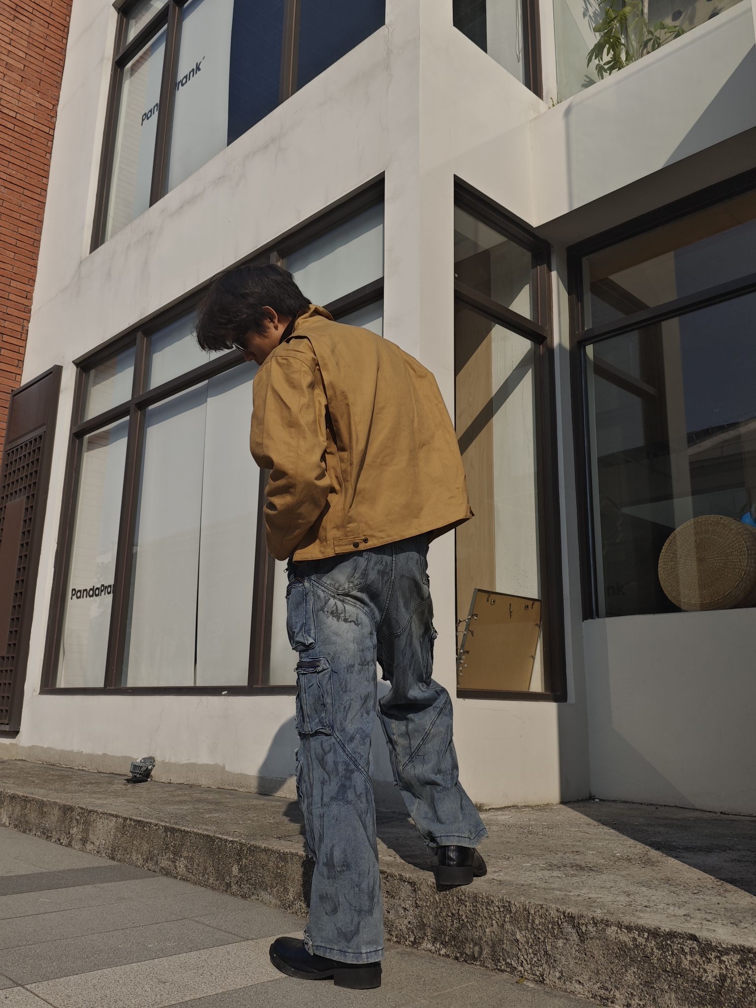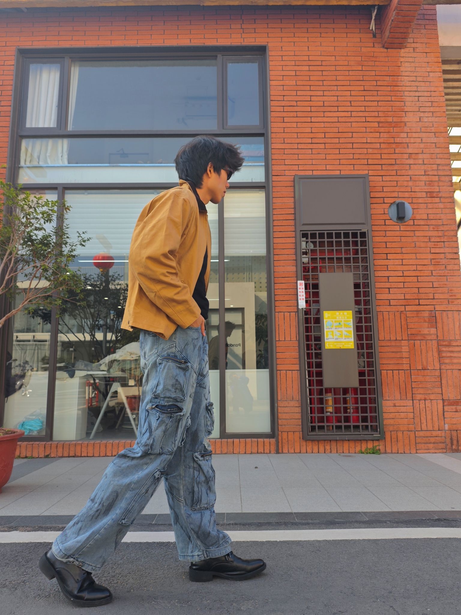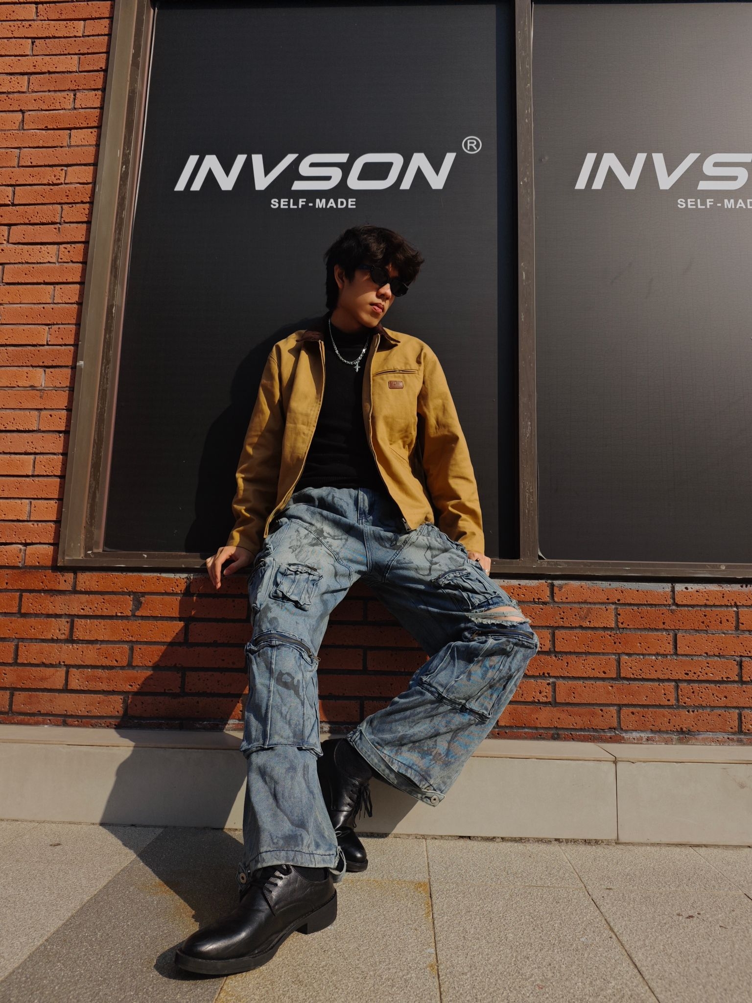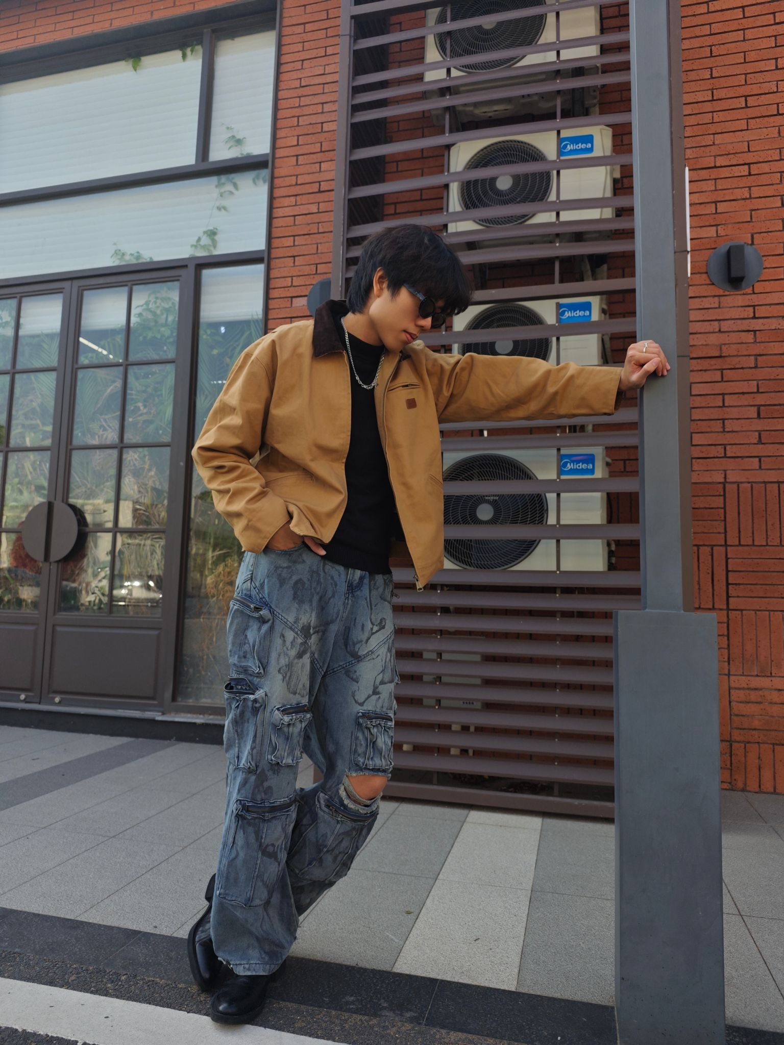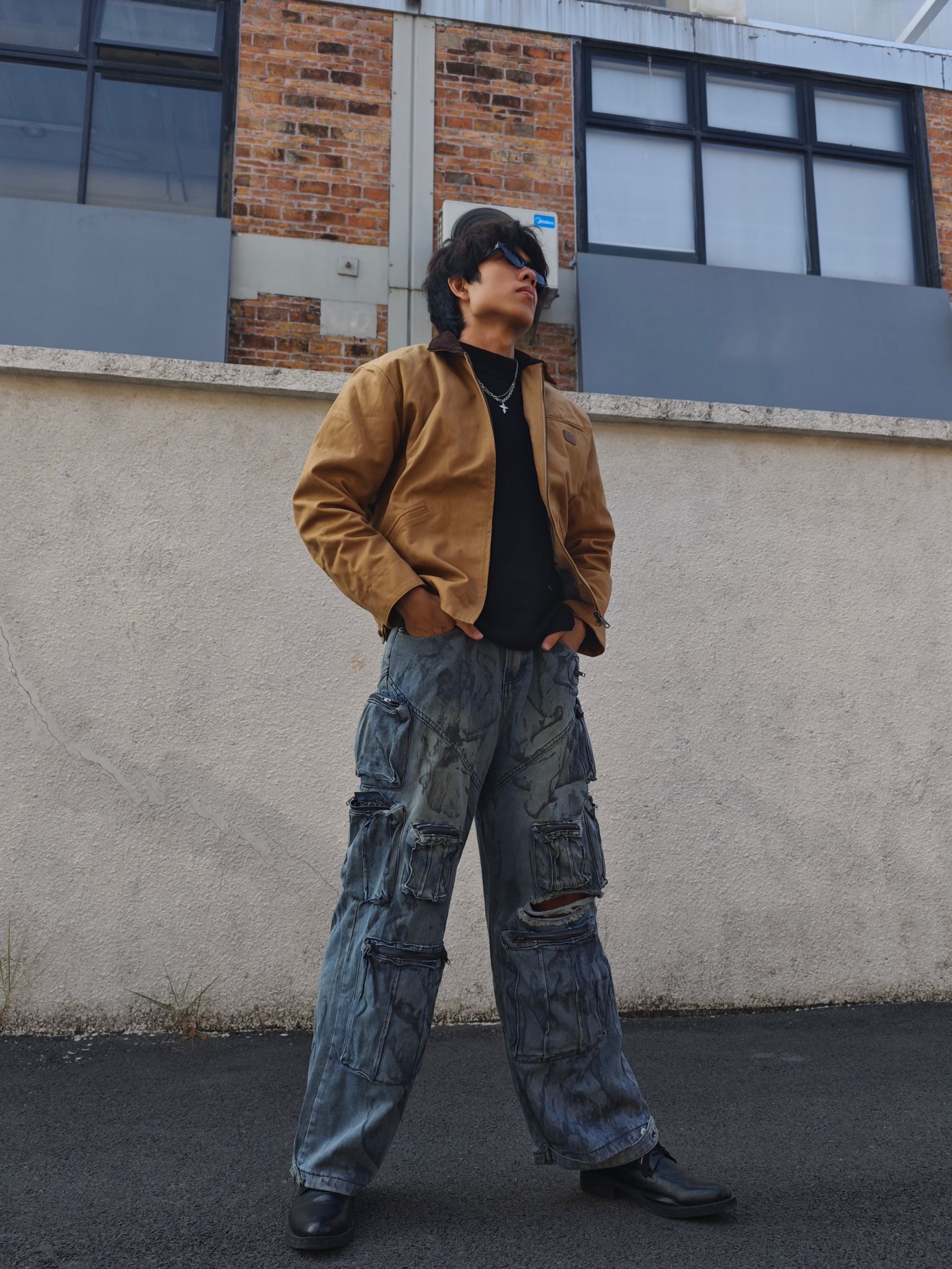 上衣层卡其色工装夹克 采用做旧的仿麂皮材质 质感复古且富有层次 短款的宽松版型提升了整体的随性氛围😎😎😎 内搭黑色高领针织衫 与夹克形成了经典的明暗对比 银色项链则作为精致细节✨✨✨ 为整体增添了一丝潮酷感 下装水洗蓝工装牛仔裤 重度做旧的纹理和多口袋设计 强化了街头工装属性🥰🥰🥰 超阔腿版型带来强烈的松弛感 这套穿搭通过做旧材质与宽松版型的组合 将复古工装的随性与街头潮感完美融合 视觉层次丰富...