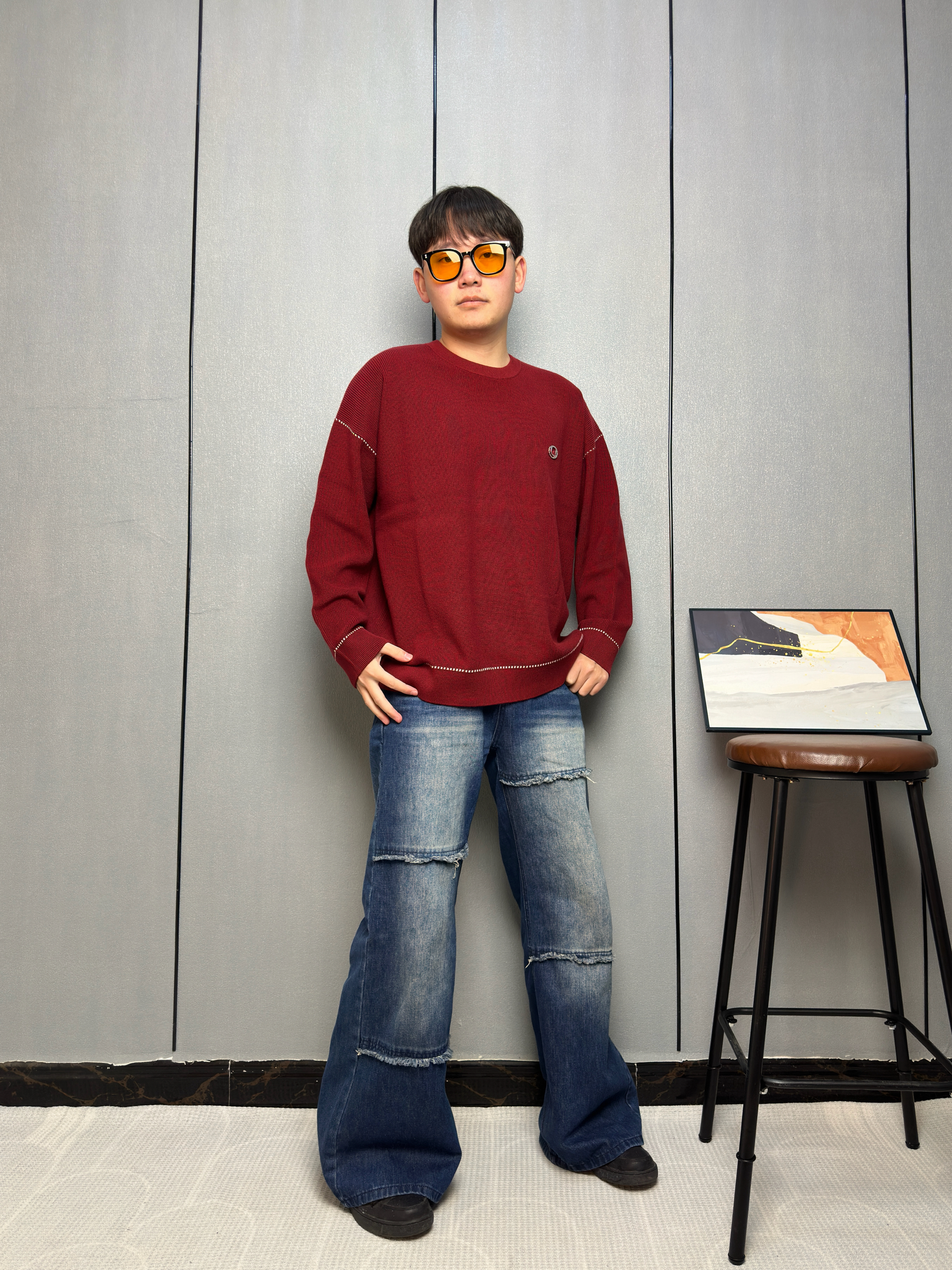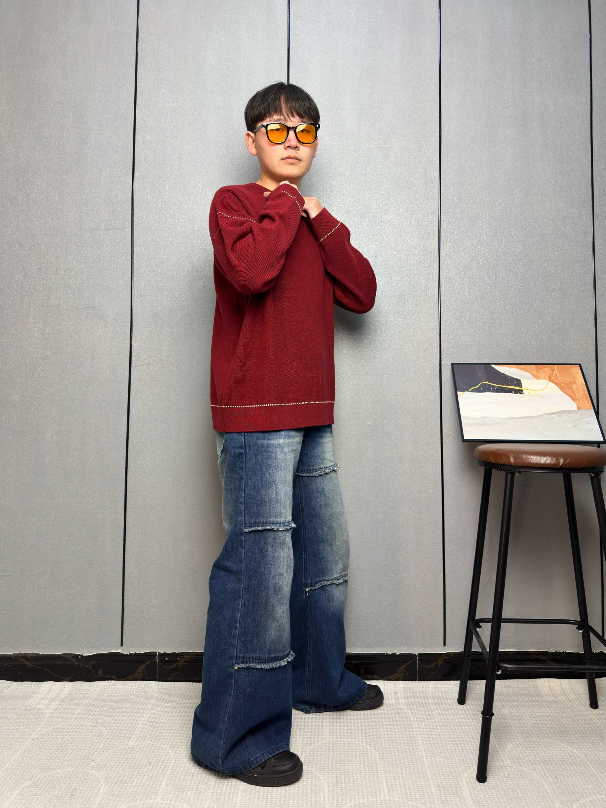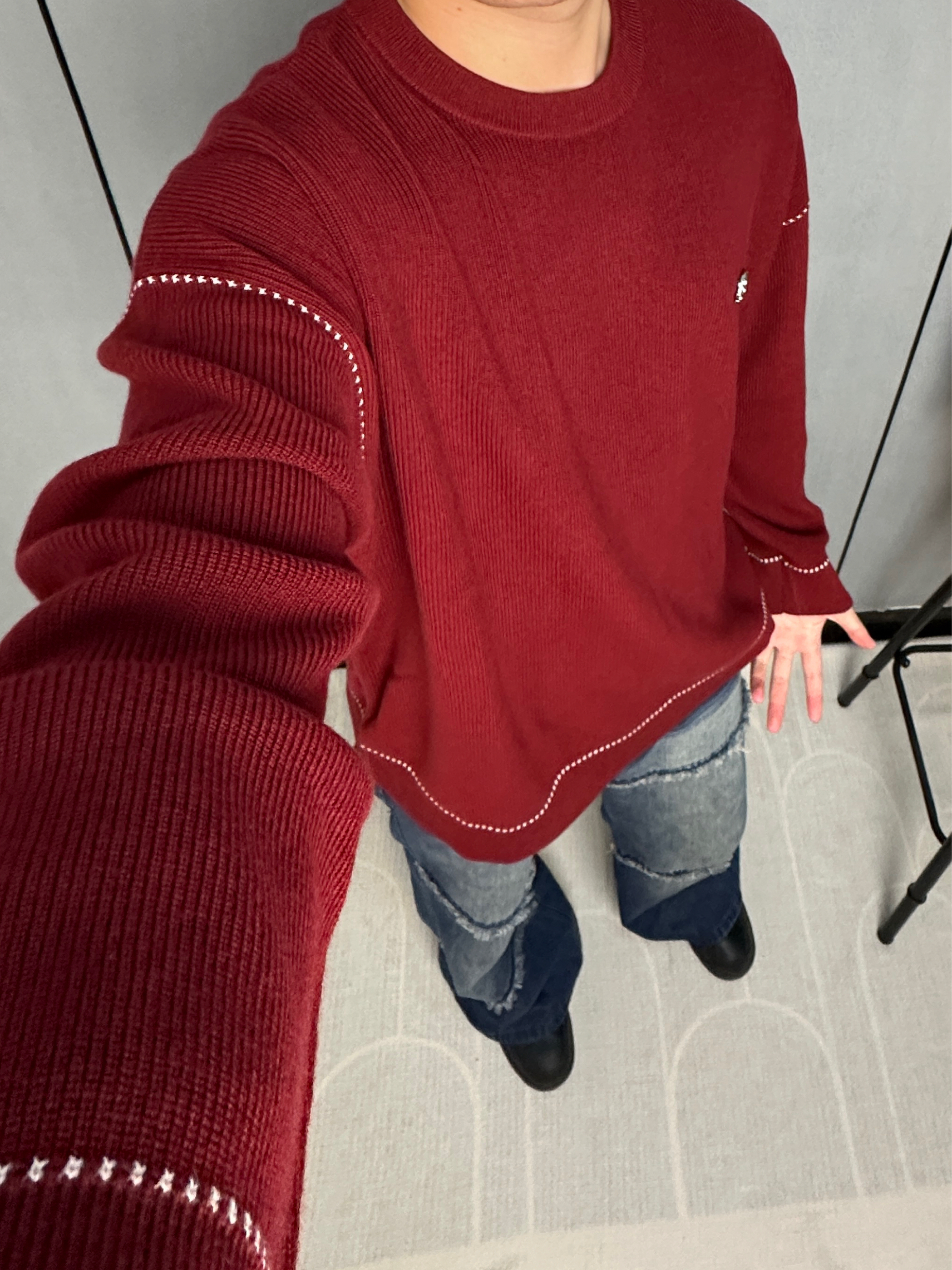 这件酒红色毛衣一上身 感觉整个冬天都温暖了起来 面料软软糯糯的,贴身穿也不扎 身上袖口和下摆的白色线条设计 让整体不会显得单调 搭配我这条拼接牛仔裤,休闲中带点小细节 冬天也能穿出活力四射 见朋友或者出门逛街都很合适