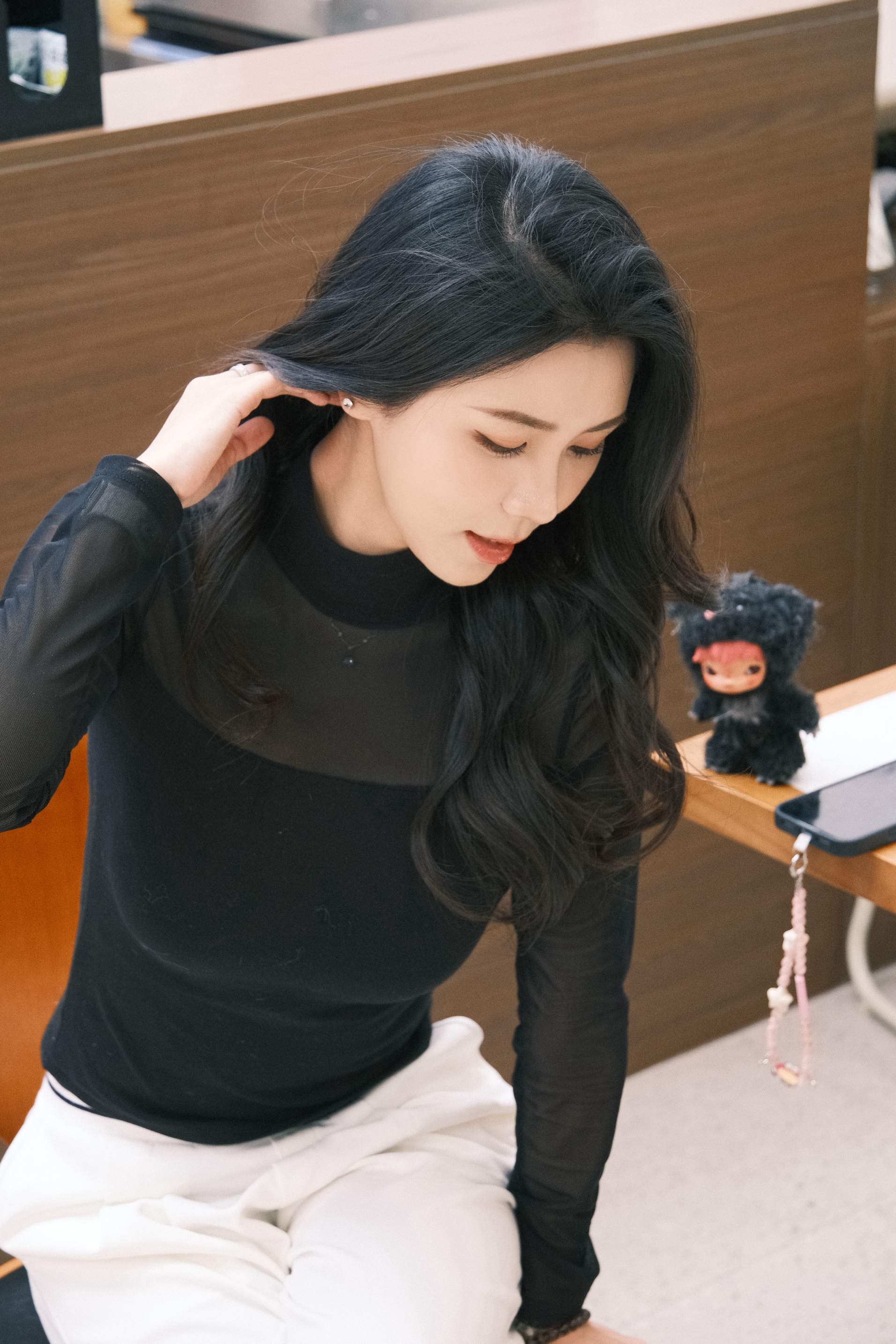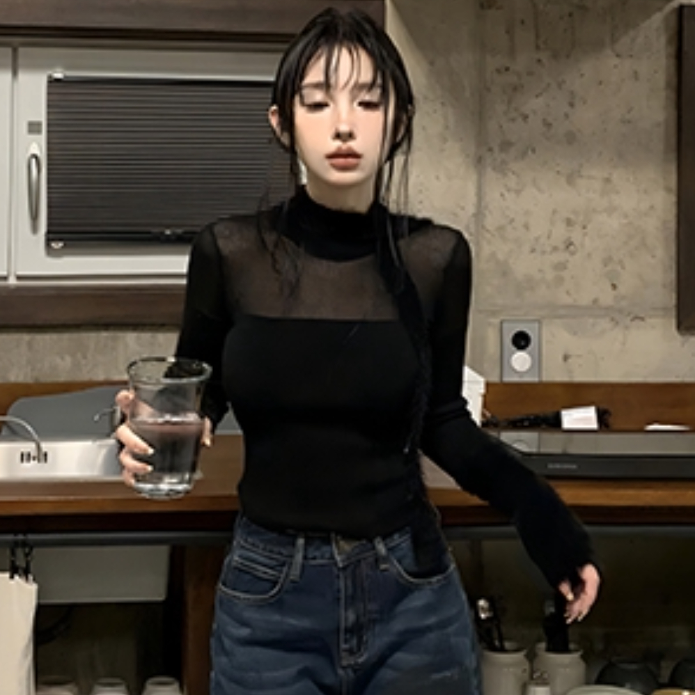 黑色网纱半透~在冬天的微透感 适合暖气十足的室内和温暖的南方啦 搭配裤子小裙子都格外显气质 虽然高领但是却显脖子修长 弹力也很大