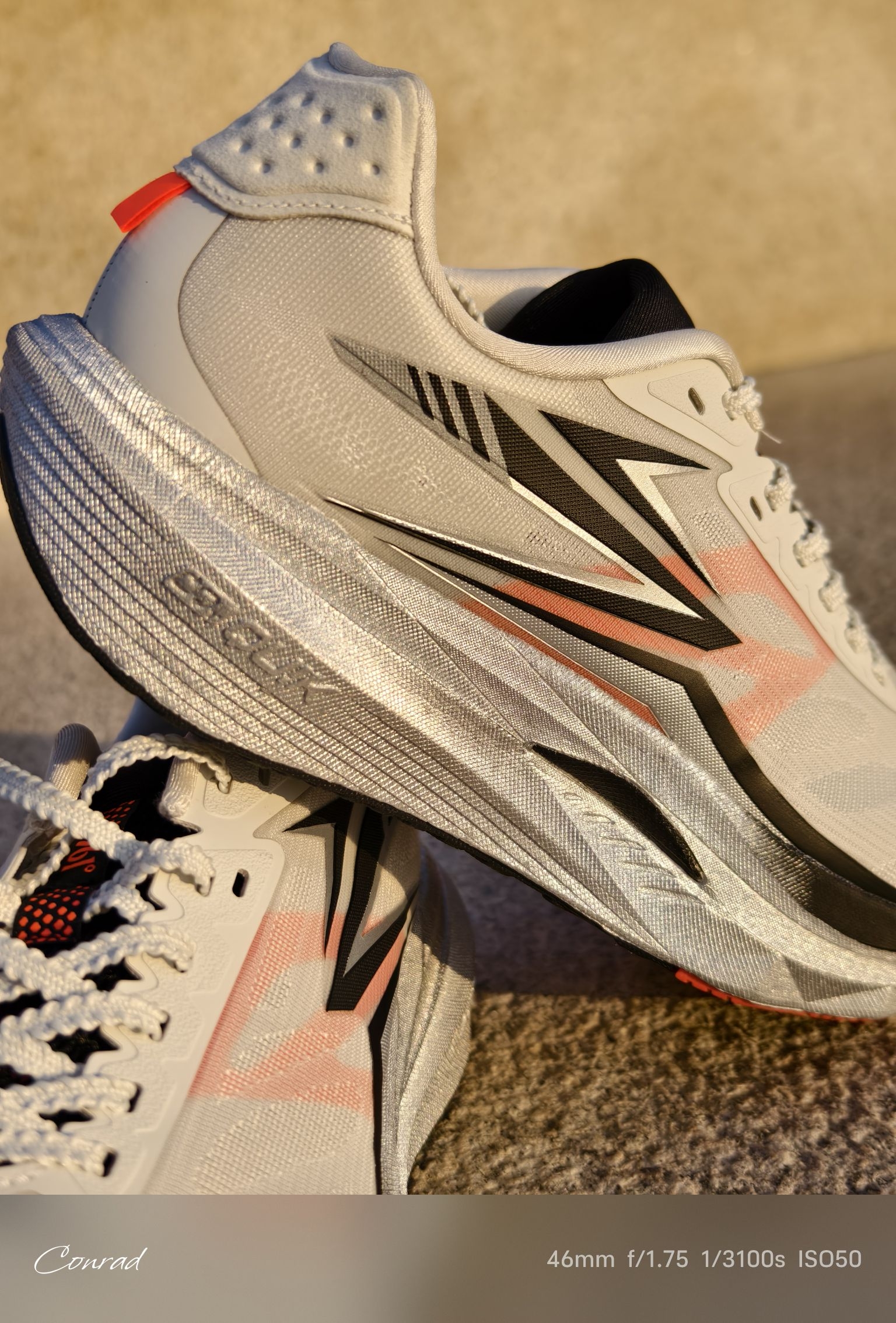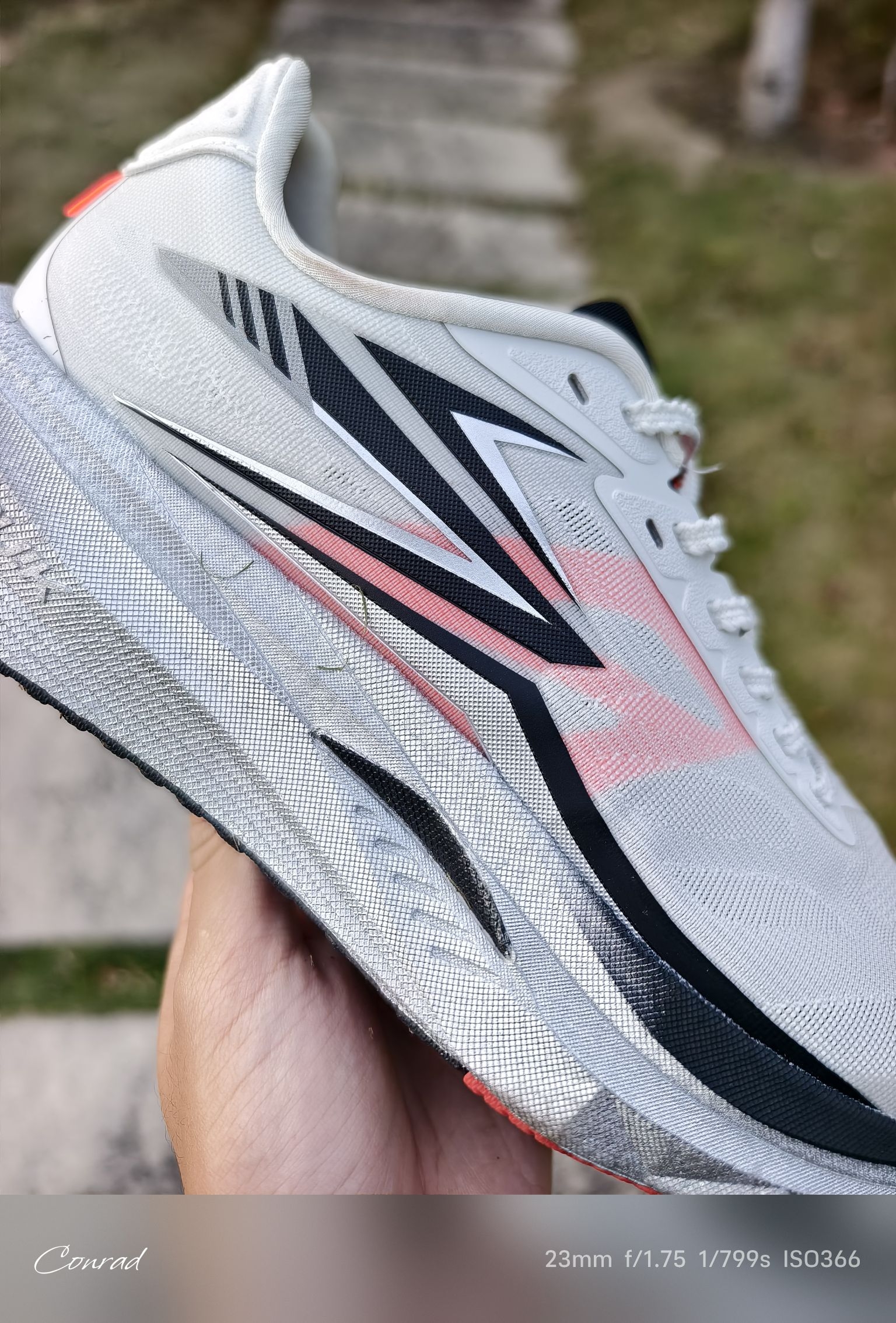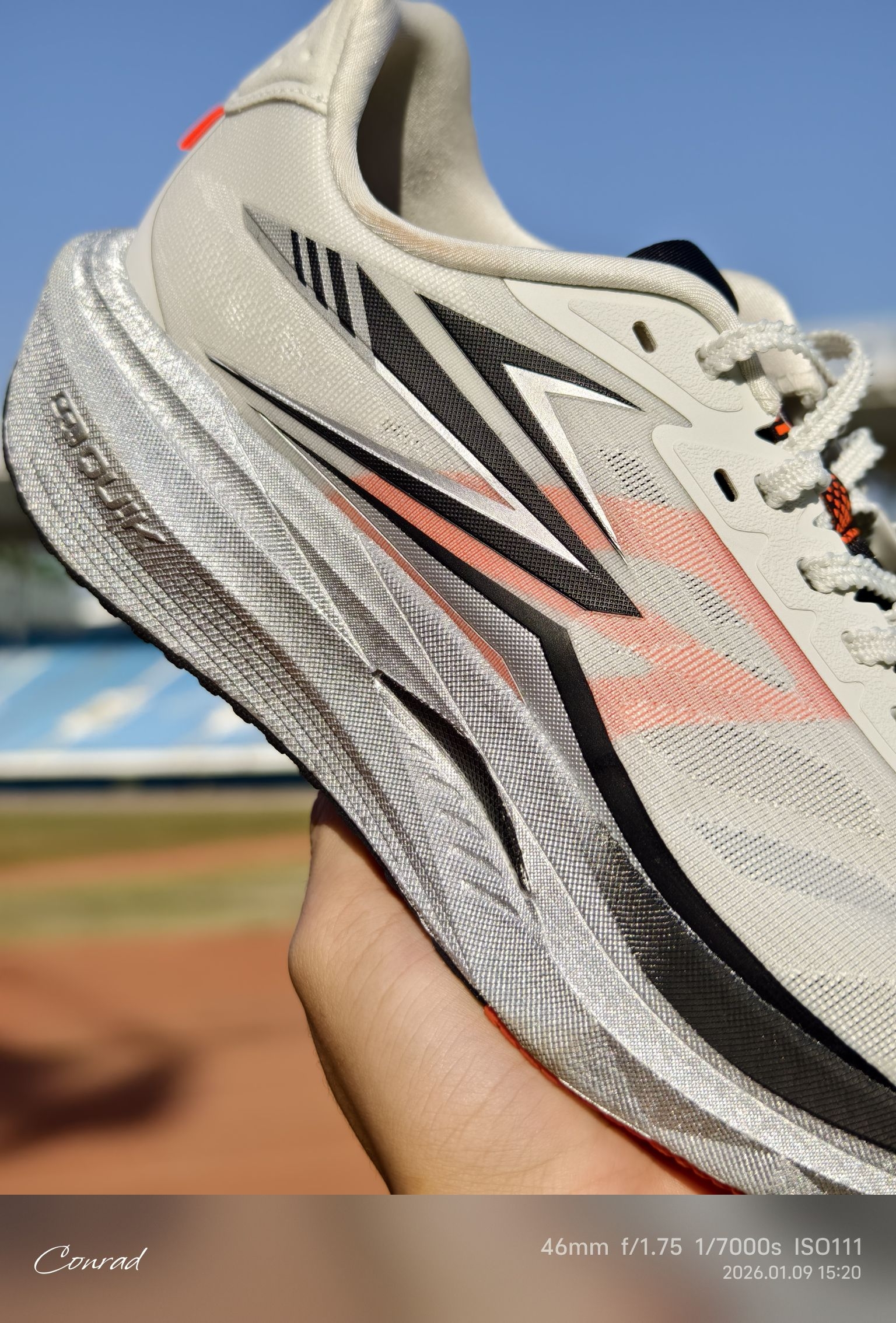 配置:中底是全掌脂肪族+一体发泡的双前叉异形尼龙板,延续了6mm的黄金坡差,材料调教得更活泼,所以哪怕用的是脂肪族,也能有不错的脚感。配合加宽底楦,稳定性直接拉满。重点说下这个玻纤板,不是单纯的前叉上翘,而是把前掌分成了内外两个部分,内侧加长,推进力更强劲;外侧加宽,过弯的时候稳定性更好,而且内外侧不同的曲度,更贴合脚部发力,蹬伸的时候又舒服又灵活。中段内外侧都做了外延上翻,就像一双手托住足弓一样,配合后端的上翻,中后段落地更稳定,滚动也更自然。这里提个小槽点,鞋垫是欧索莱的,不太适配这双鞋,我自己换了个带足弓上翻的,体验直接提升一个档次,大家可以参考下。