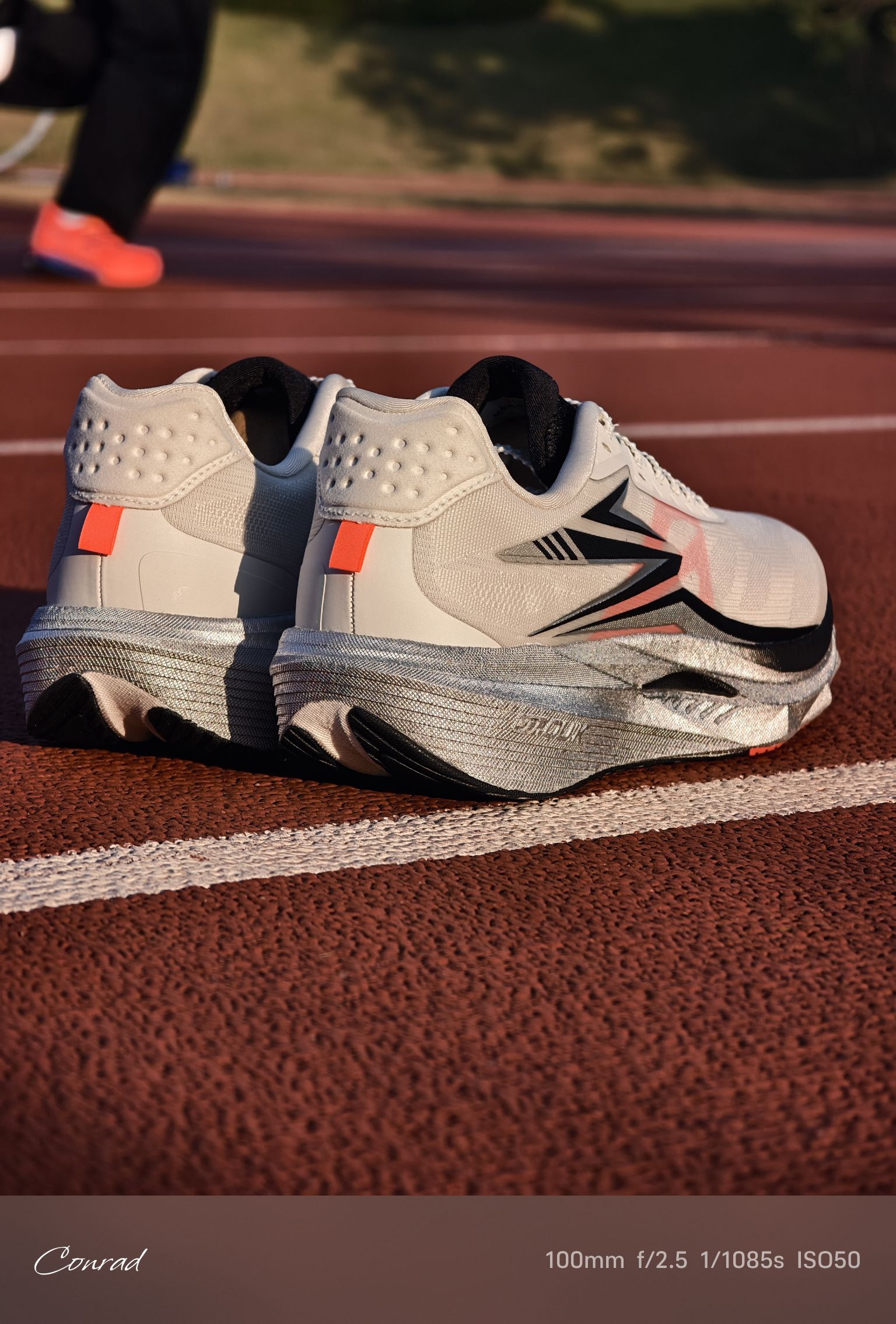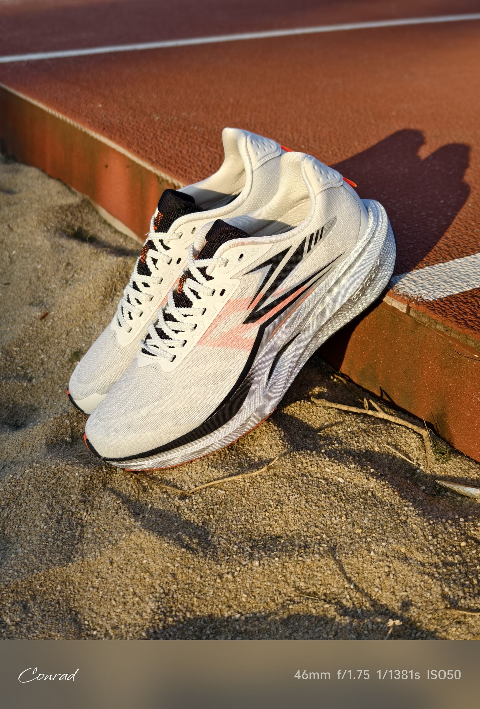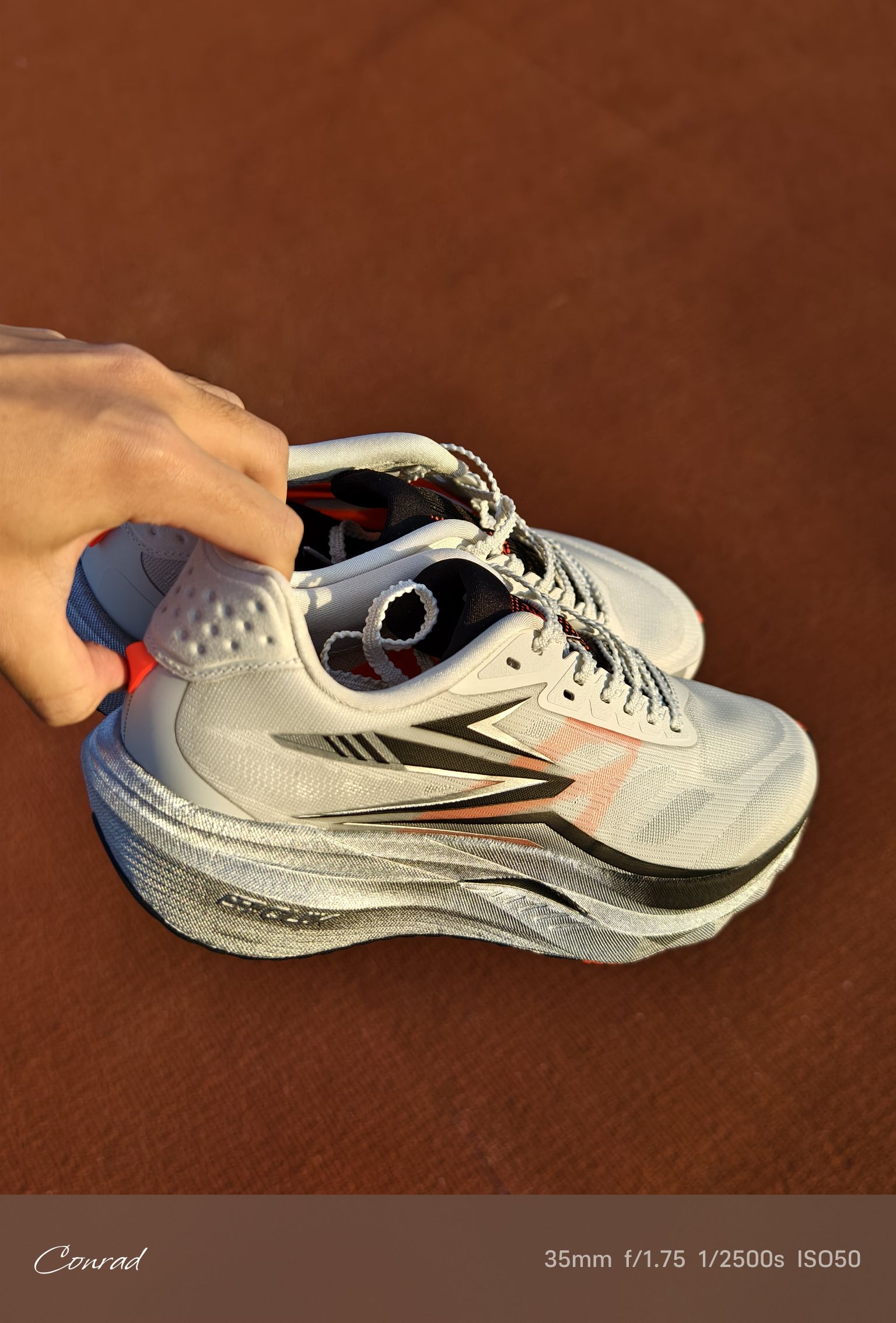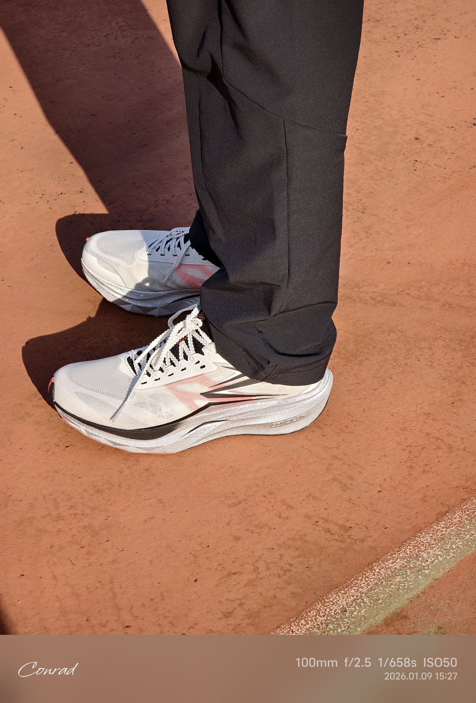 配置:中底是全掌脂肪族+一体发泡的双前叉异形尼龙板,延续了6mm的黄金坡差,材料调教得更活泼,所以哪怕用的是脂肪族,也能有不错的脚感。配合加宽底楦,稳定性直接拉满。重点说下这个玻纤板,不是单纯的前叉上翘,而是把前掌分成了内外两个部分,内侧加长,推进力更强劲;外侧加宽,过弯的时候稳定性更好,而且内外侧不同的曲度,更贴合脚部发力,蹬伸的时候又舒服又灵活。中段内外侧都做了外延上翻,就像一双手托住足弓一样,配合后端的上翻,中后段落地更稳定,滚动也更自然。这里提个小槽点,鞋垫是欧索莱的,不太适配这双鞋,我自己换了个带足弓上翻的,体验直接提升一个档次,大家可以参考下。