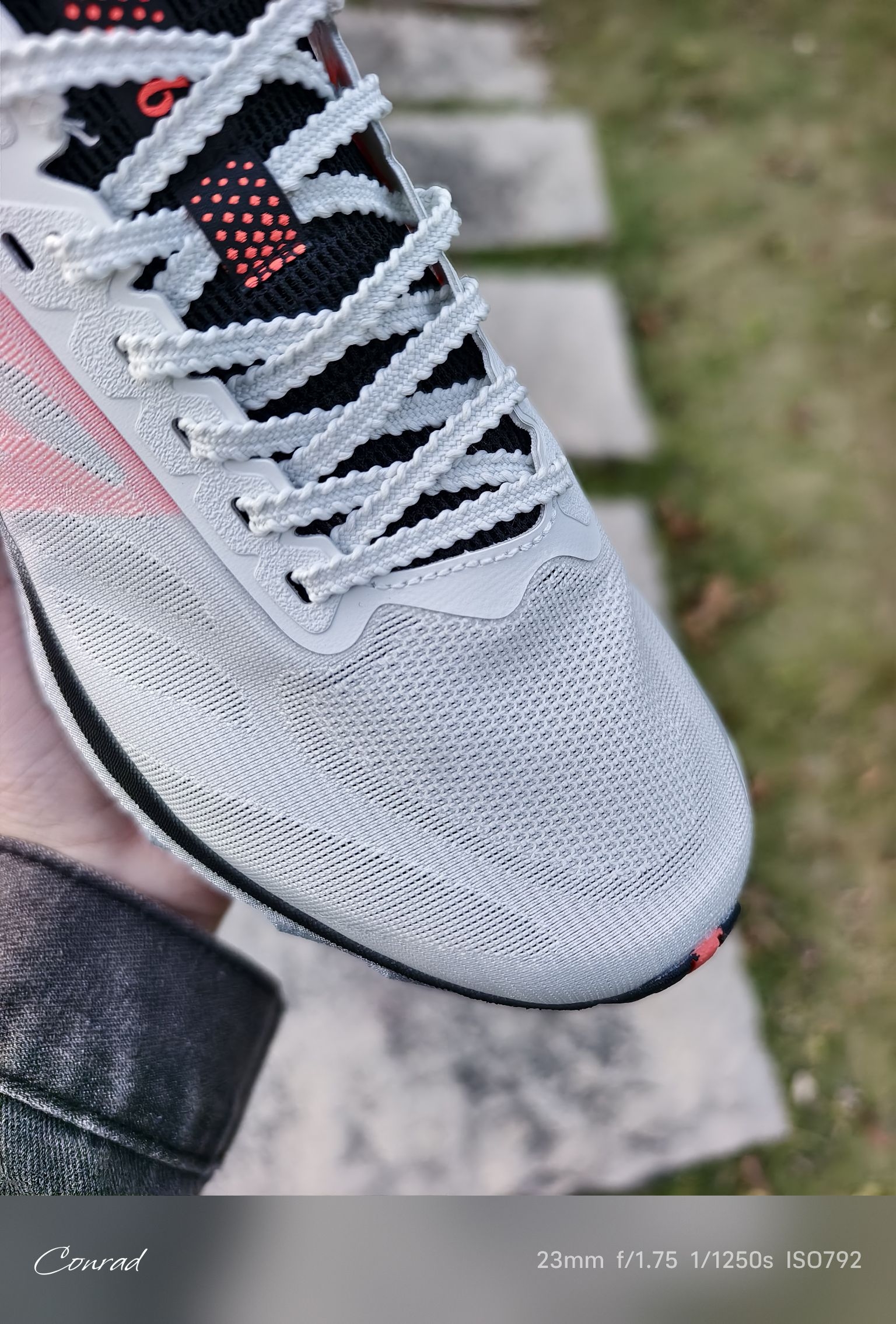 鞋面用的是分区绞综材质,搭配类国际线鞋楦,既保证了强度和支撑性,又兼顾了轻透感,贴合度很高,而且能适配更多脚型。鞋舌用的是薄海绵,本来担心锁定不好,结果发现配合鞋面内侧的支撑贴片,中段锁定和支撑都没问题。平时通勤的时候把鞋带放松,也不会出现松动的情况,这得益于后跟的锁定做得确实到位,用较薄的填充也实现了不错的锁定体验。