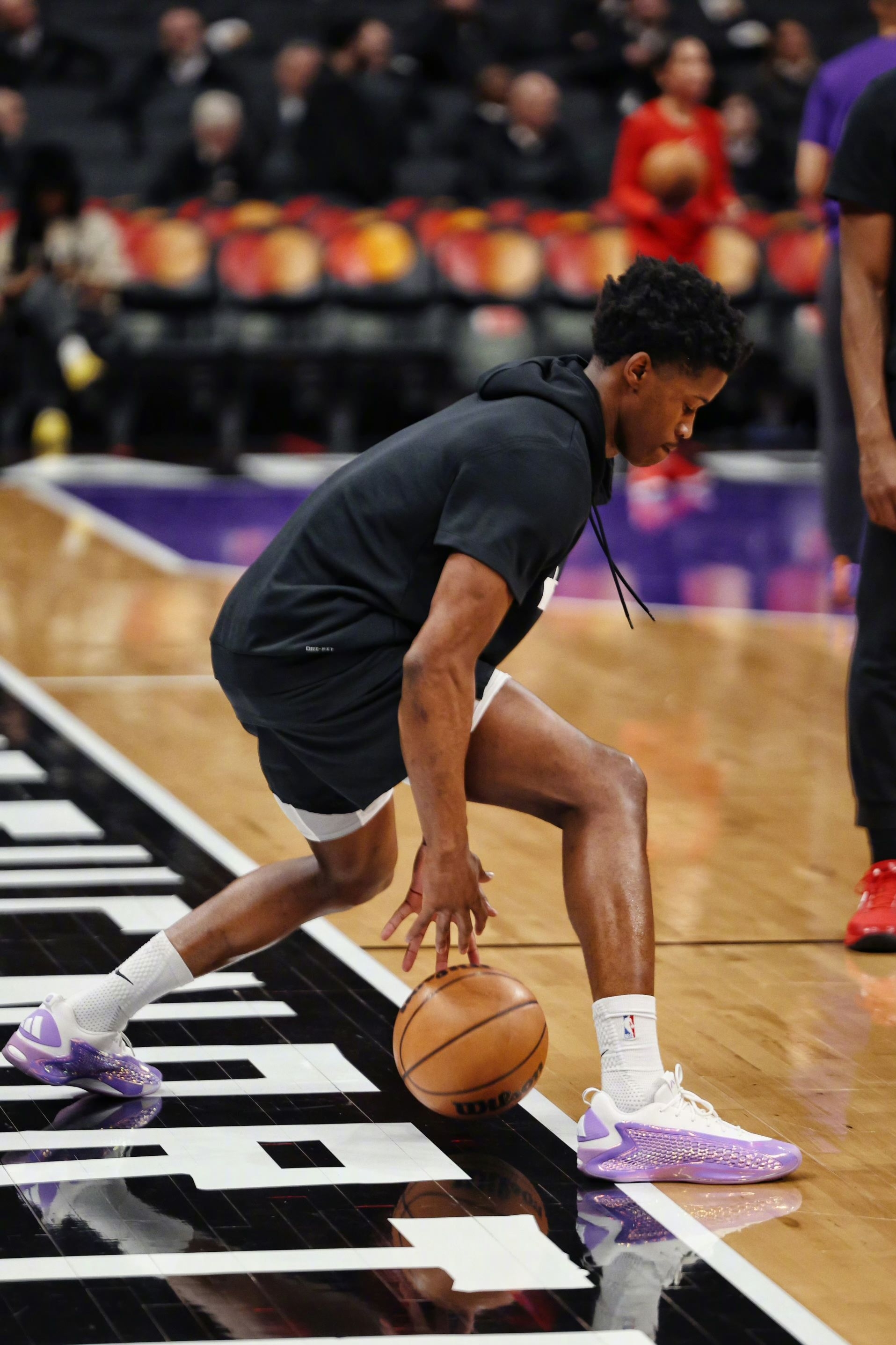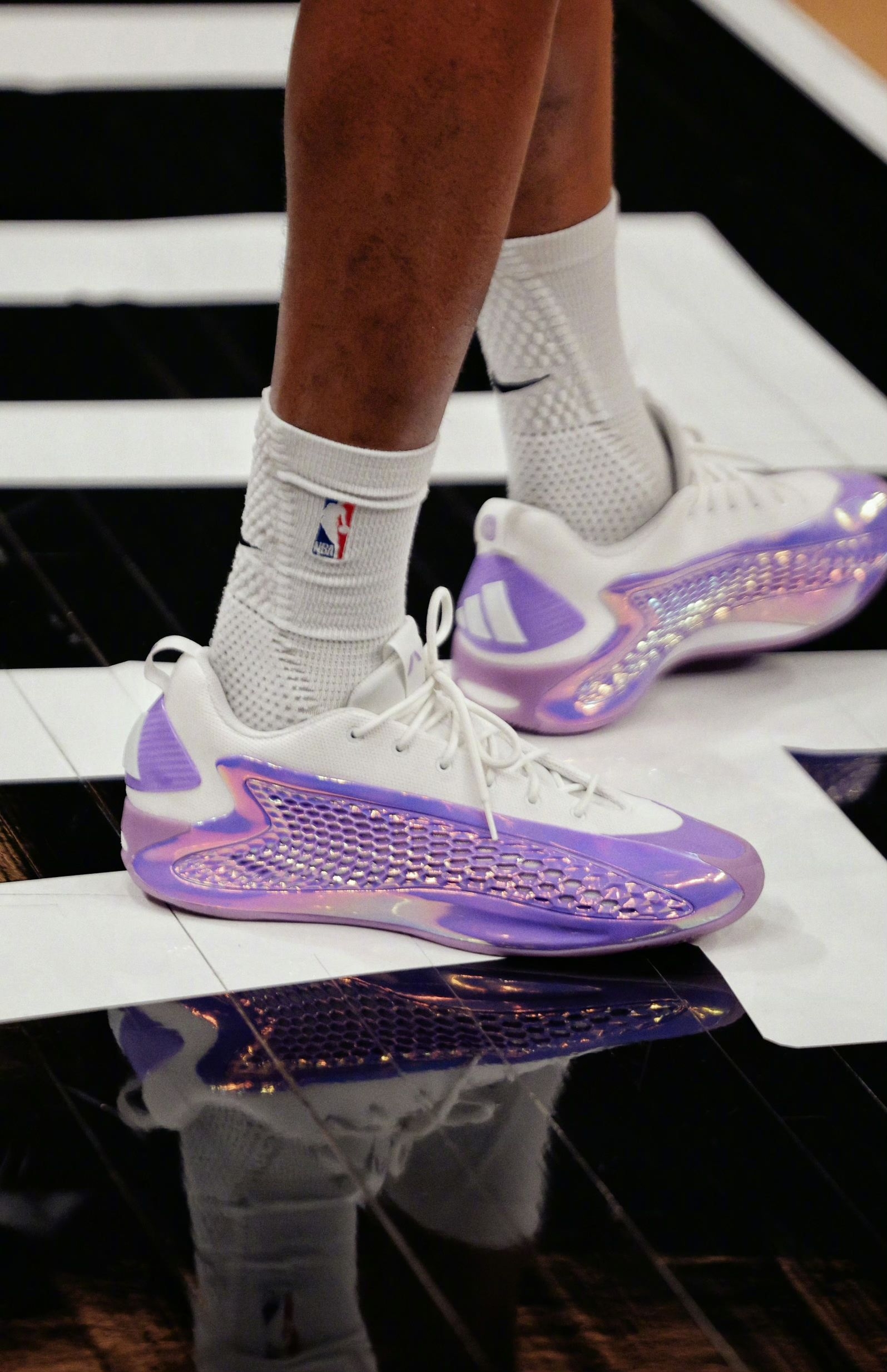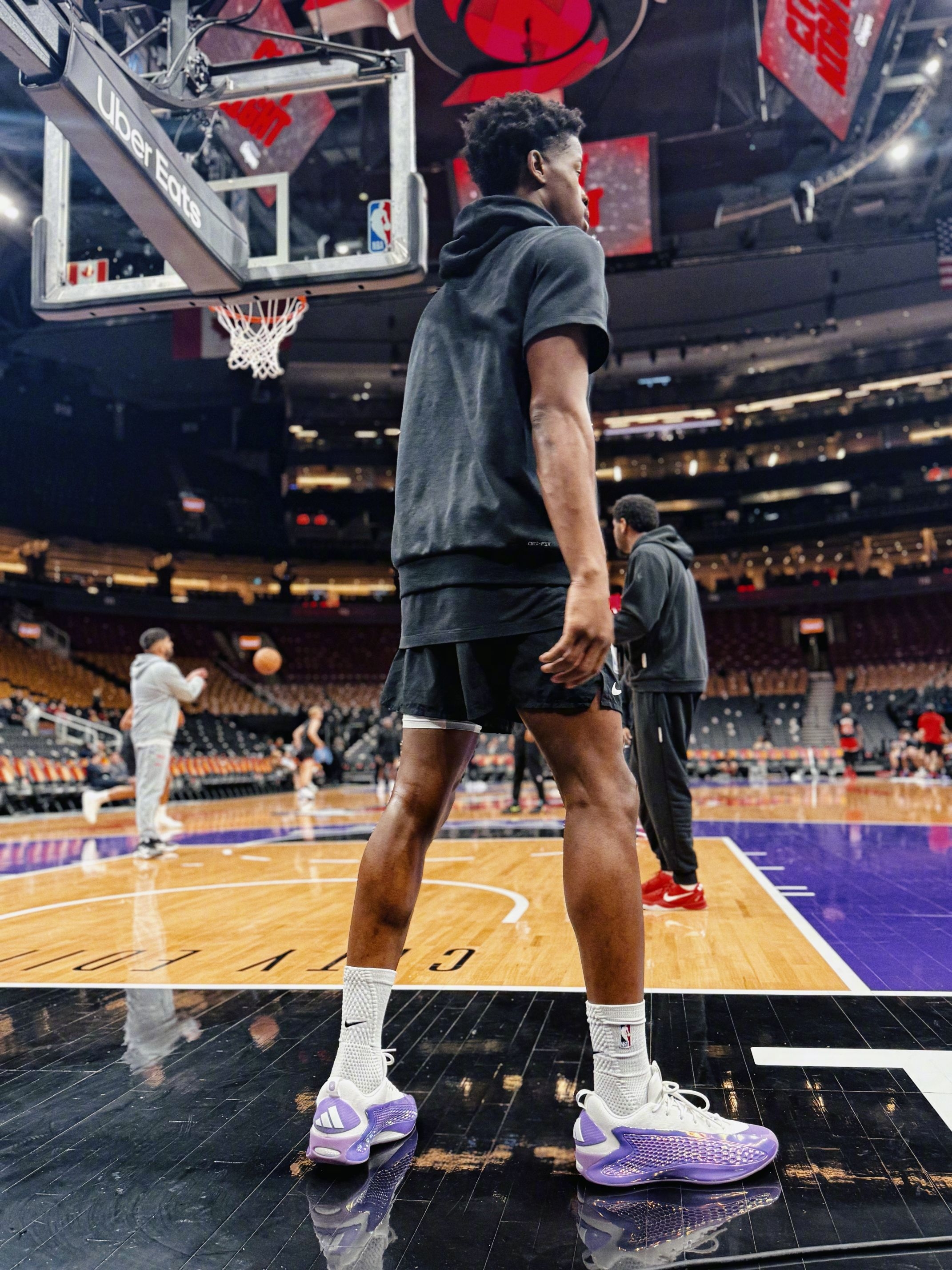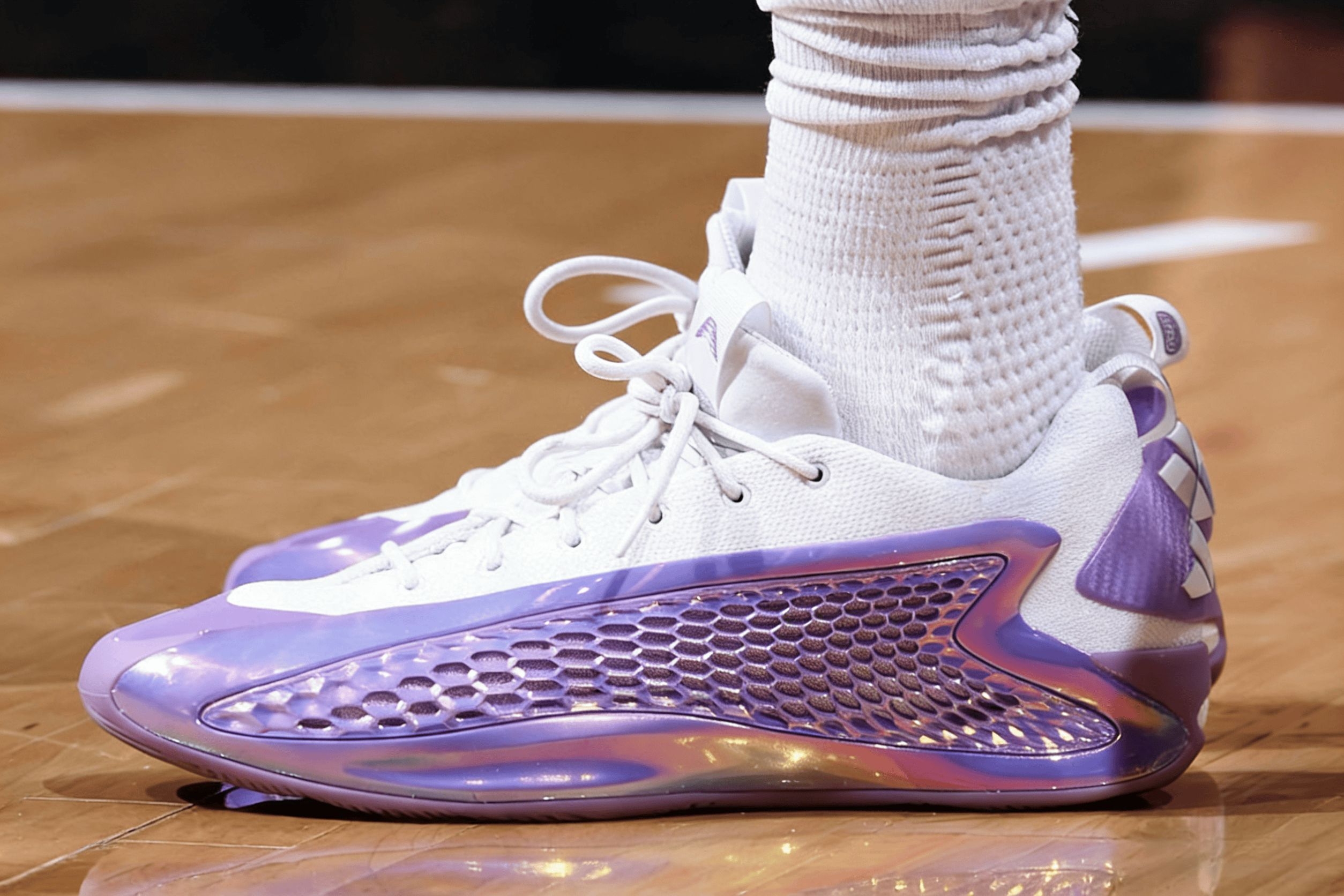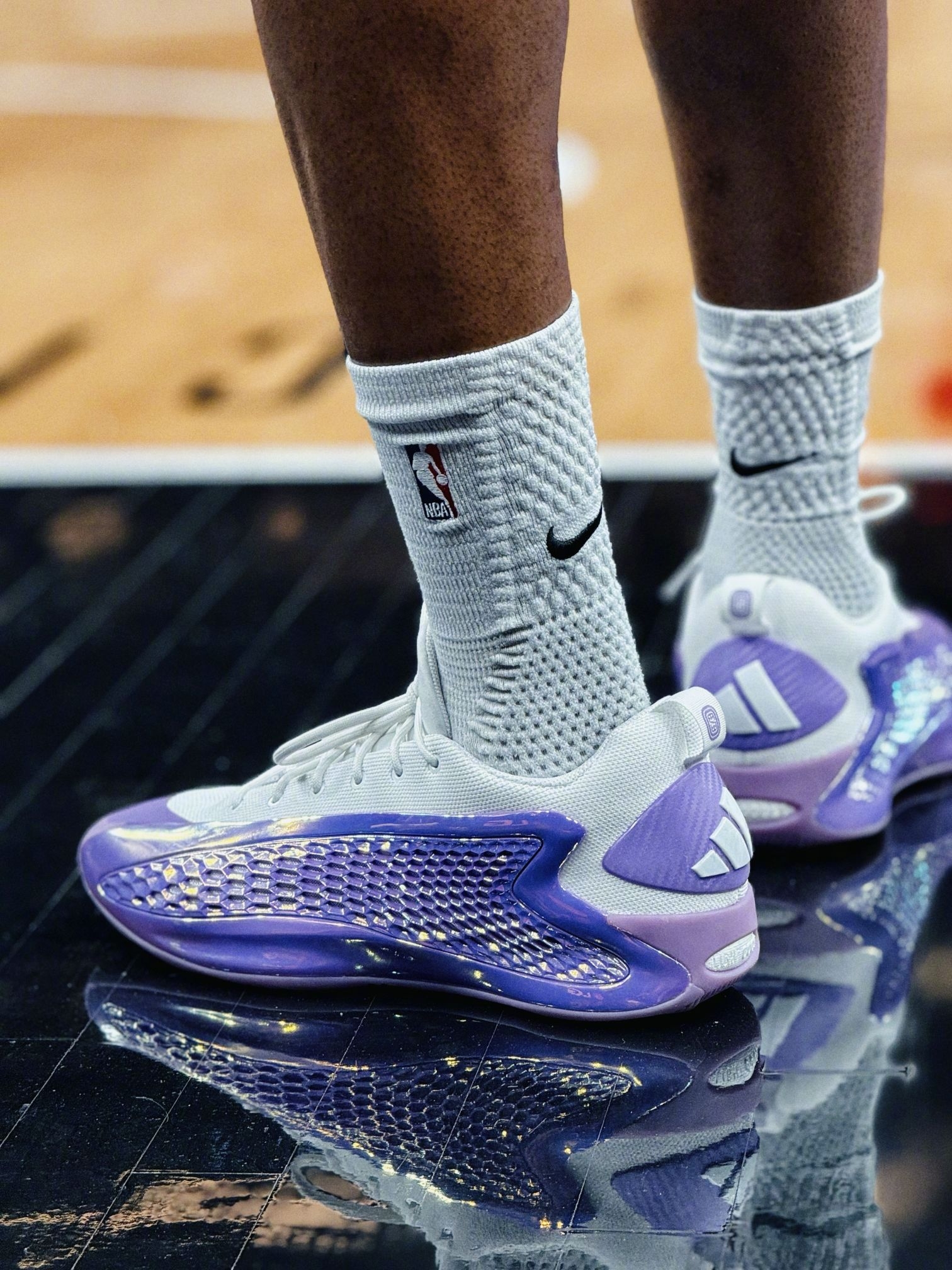 NBA常规赛赛场,76人以115-102击败猛龙的比赛里,VJ-埃奇库姆的表现成了替补席上的惊喜——出战33分钟,投篮7投5中,三分线外6投5中,交出15分2篮板8助攻1抢断的成绩单,攻防两端的活跃度直接拉满。 而赛场上他脚下的这双adidas AE1 Low "Overtime Select" PE,更是把视觉焦点拉满。白紫为主的配色方案里,鞋身侧面的蜂窝状材质覆盖层泛着珠光渐变的紫调光泽,...