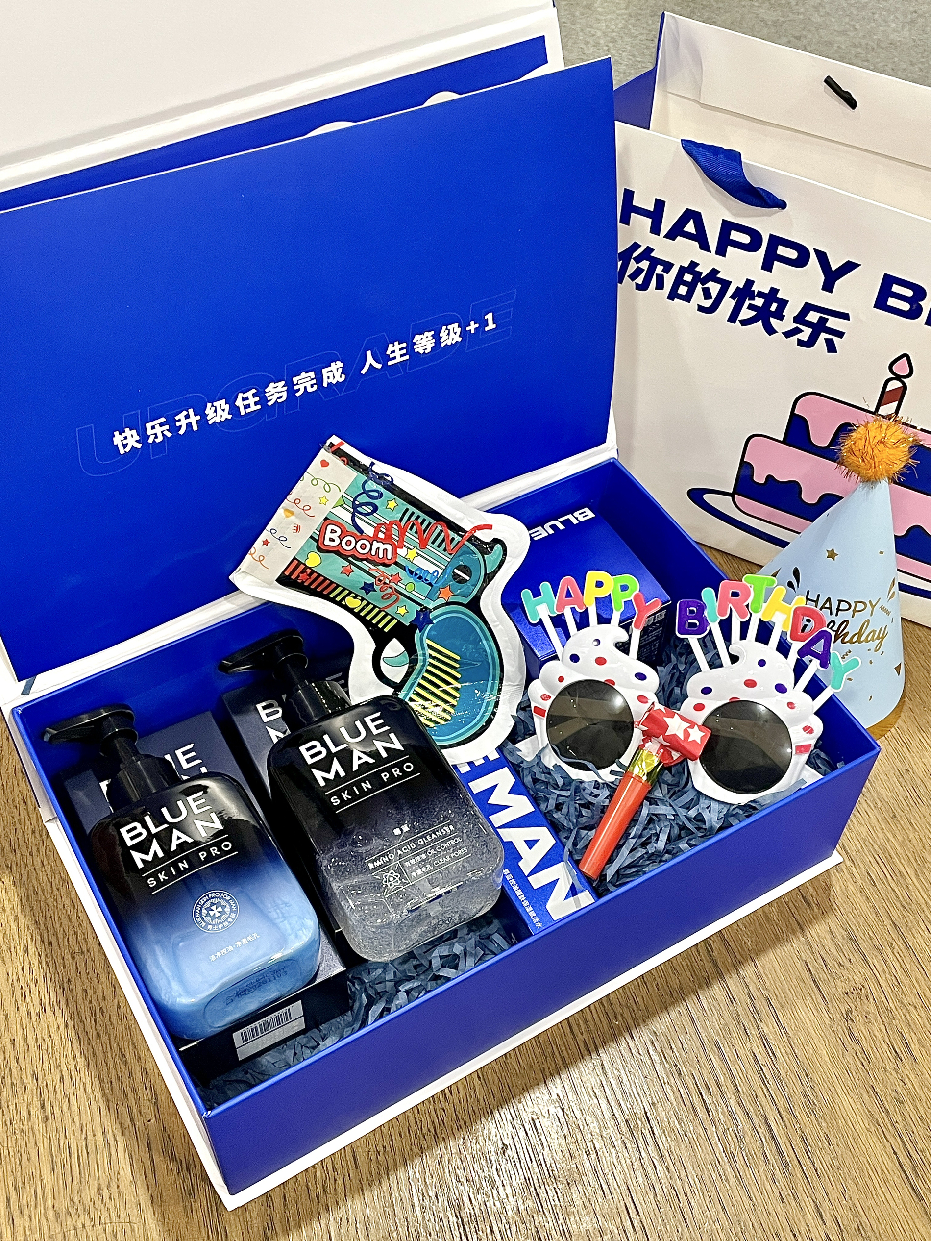 打开就是立体生日蛋糕和生日周边小道具 里面是两瓶洗面奶➕补水喷雾➕面霜 基本他日常护肤需要用的都有 洗面奶泡沫丰富又绵密 补水喷雾的用起来也很方便 面霜是水润又清爽的质地 礼盒礼袋的设计太适合送npy了!