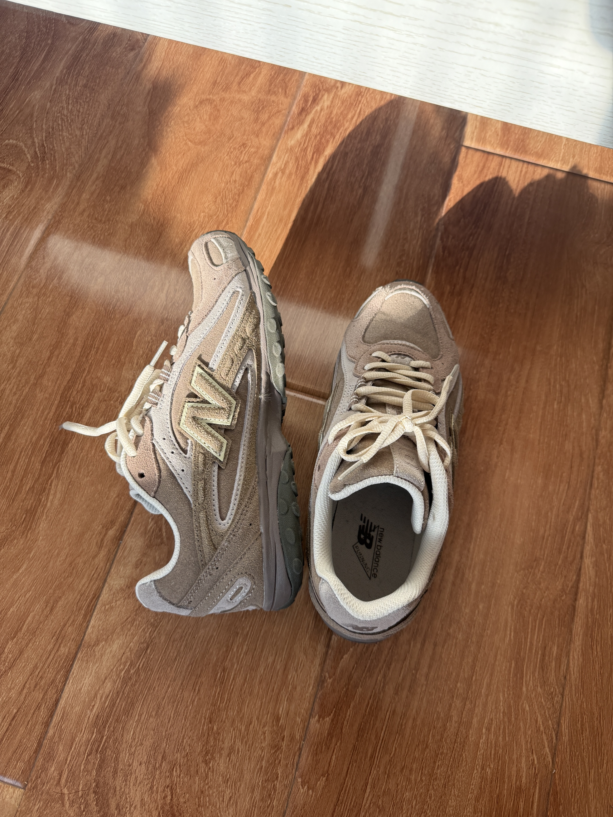 谁懂啊家人们!挖到这双New Balance奶茶色老爹鞋,直接把秋冬的温柔氛围感拉满了 麂皮的材质摸起来软乎乎的,奶茶棕的配色低饱和又高级,不管搭牛仔裤、运动裤还是百褶裙都巨适配,随便穿穿都像韩系女主出街~ 鞋型是那种微微显脚小的款,踩上去软弹得很,暴走一万步都不磨脚,日常通勤、逛街穿它贼舒服😌 关键是这种温柔挂的奶茶色真的不挑人,黄皮穿也巨显白,搭配同色系的卫衣、大衣,氛围感直接拉满,已经荣升我...