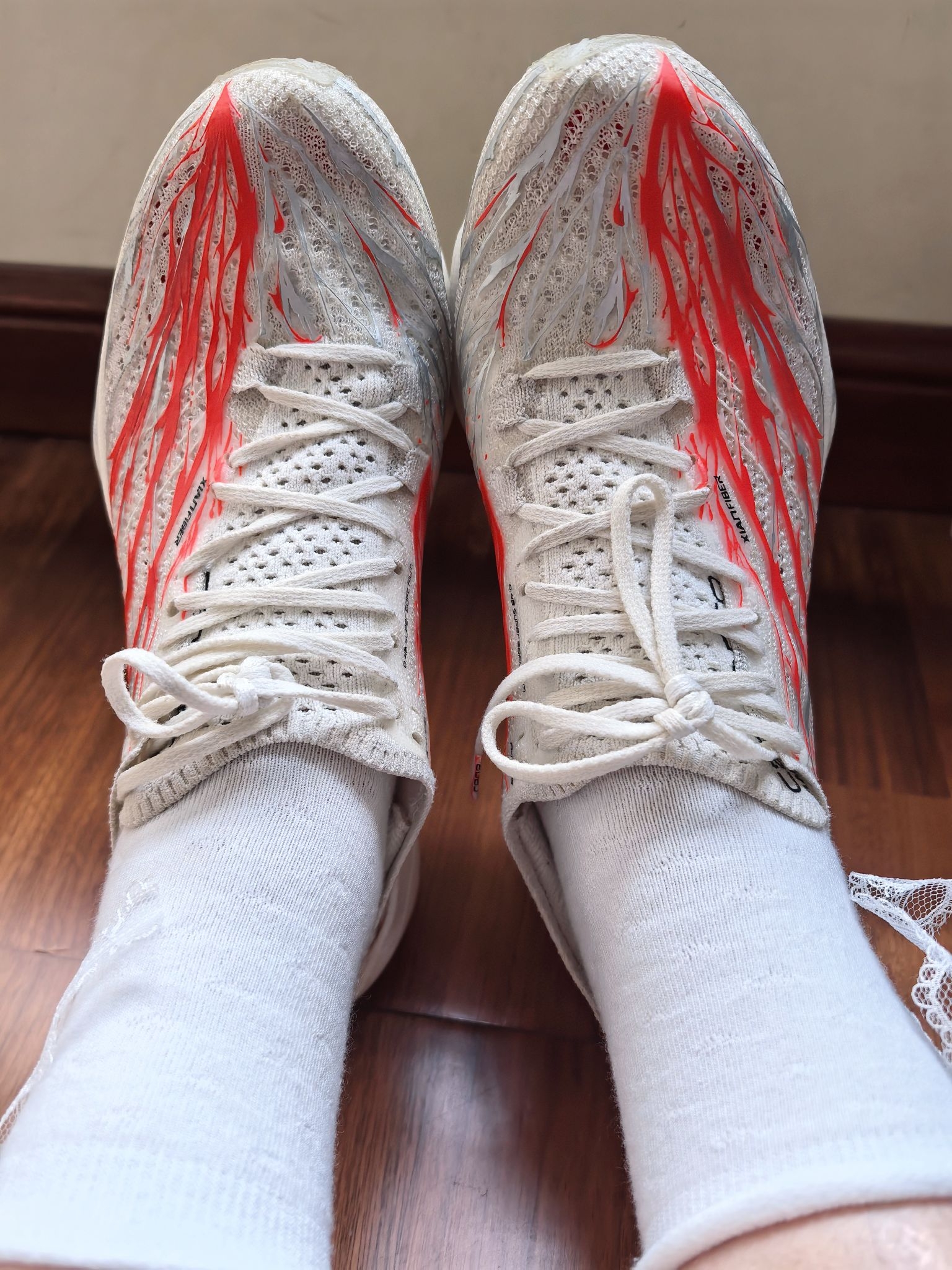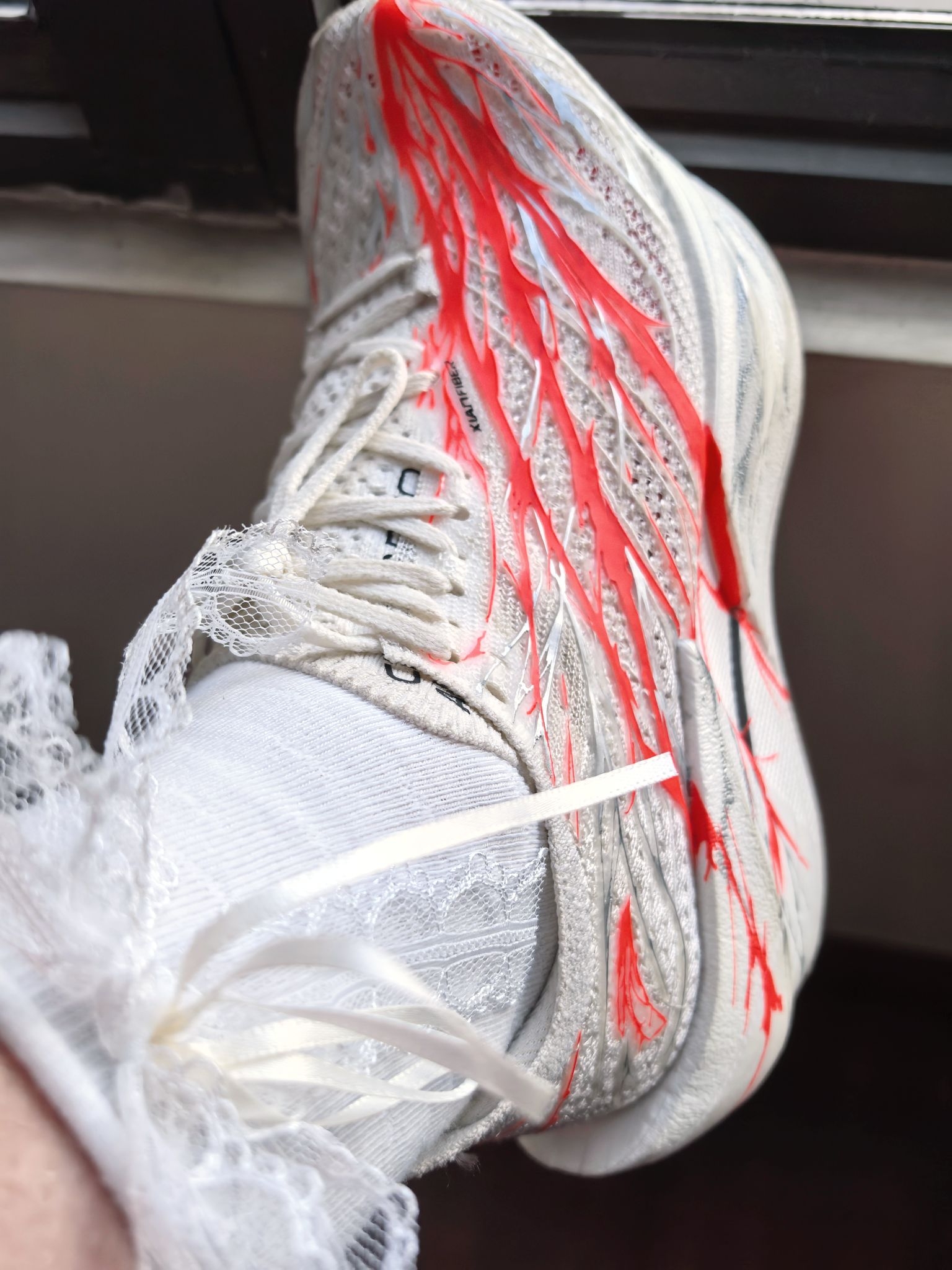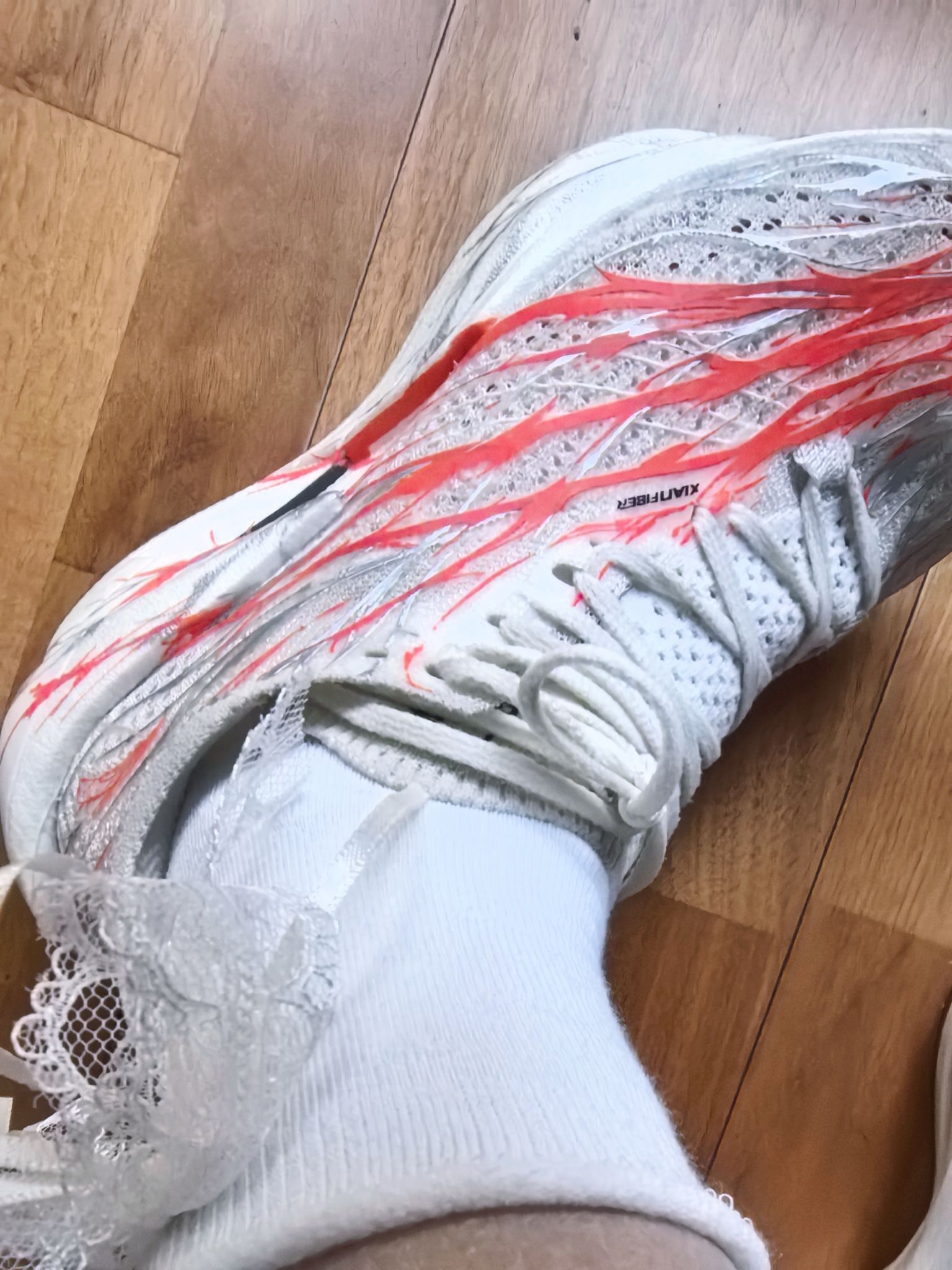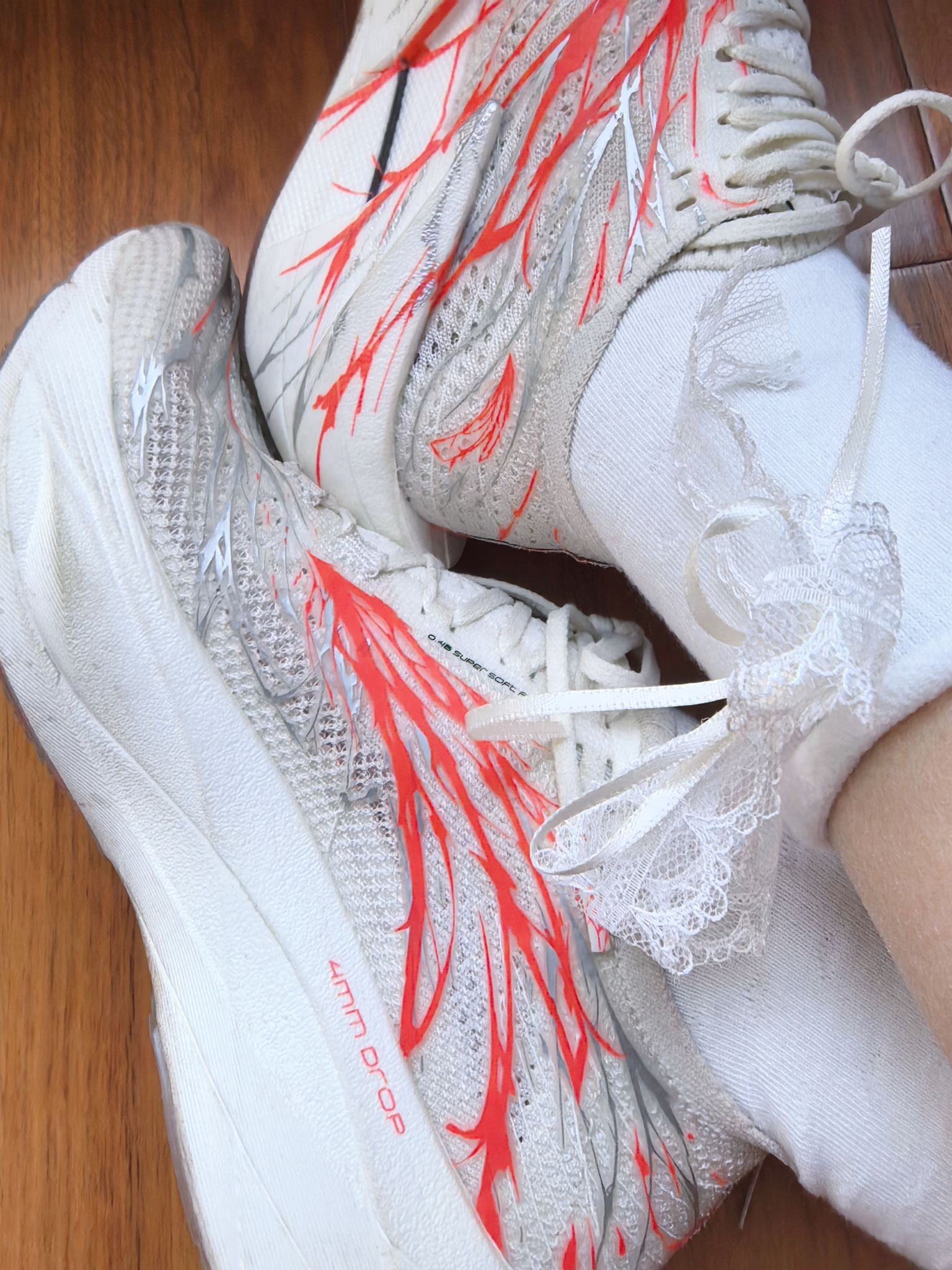 纯白蕾丝蝴蝶结白袜+红色心跳,简直就是一眼入魂 强烈的反差色彩,张扬又冷静! 安踏c2026pro的心血管图案,真的给人很跳动的美感!