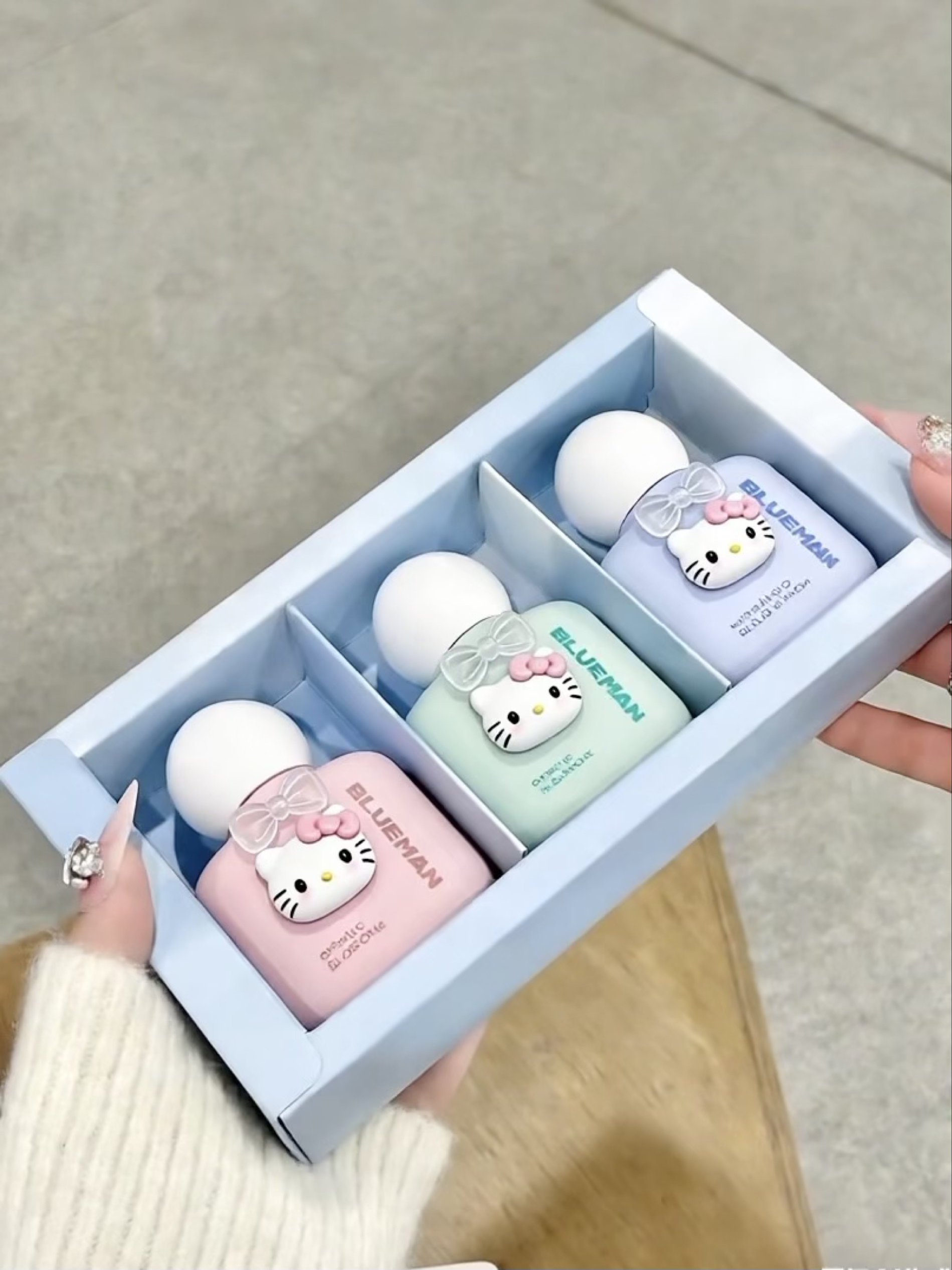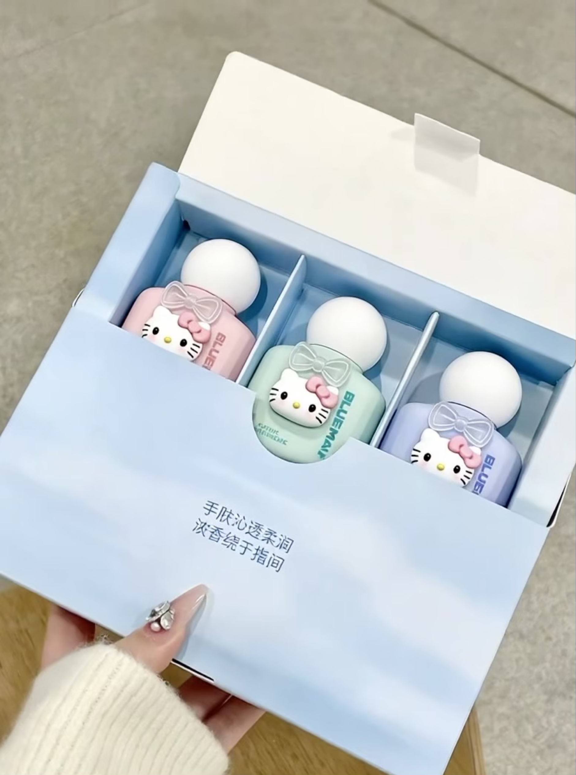 女孩子的礼物选就选实用又好看的 我挖到了介个尊蓝香氛护手霜礼盒 搭配上hellokitty 小配件尊嘟泰可爱了叭~ 我尊嘟超喜欢嘟~ 三支奶乎乎的香香护手霜hin难拒绝的好吧! 三种不同的香味都好好闻,涂上护手霜这不就自带体香了吗 上手是滋润又hin好吸收的那种 涂完没有黏腻感 出门装兜里带着可以随时涂很方便