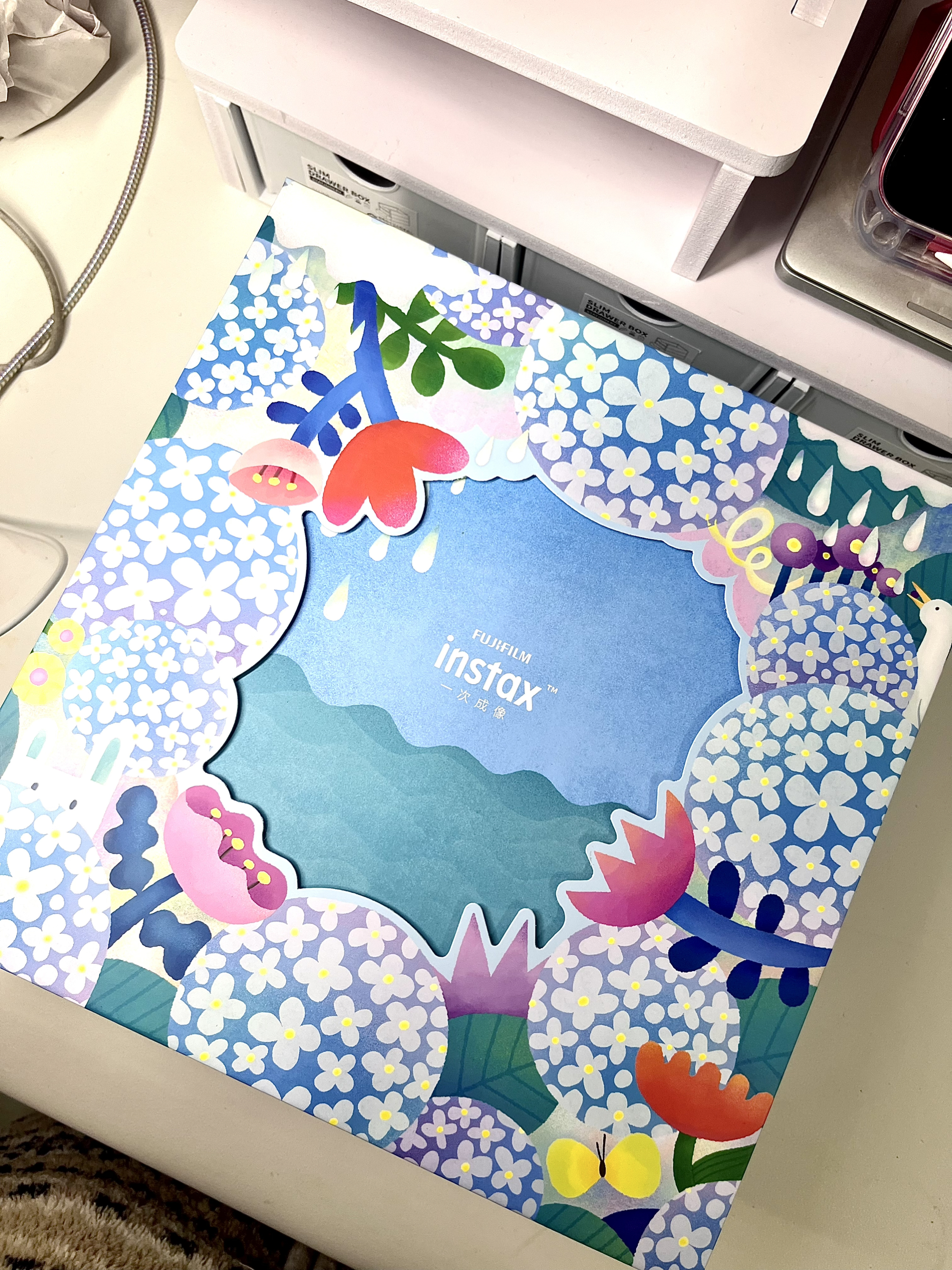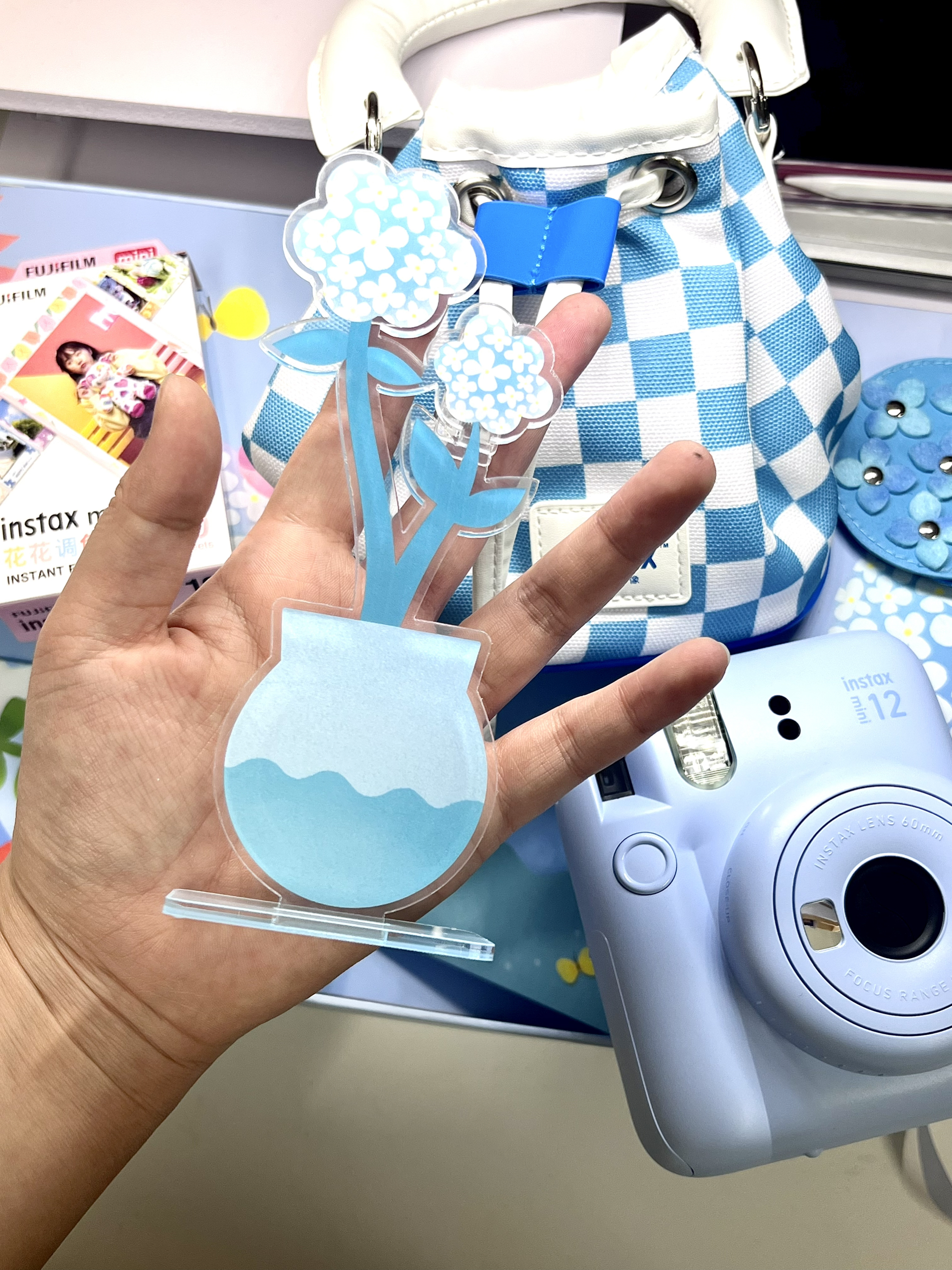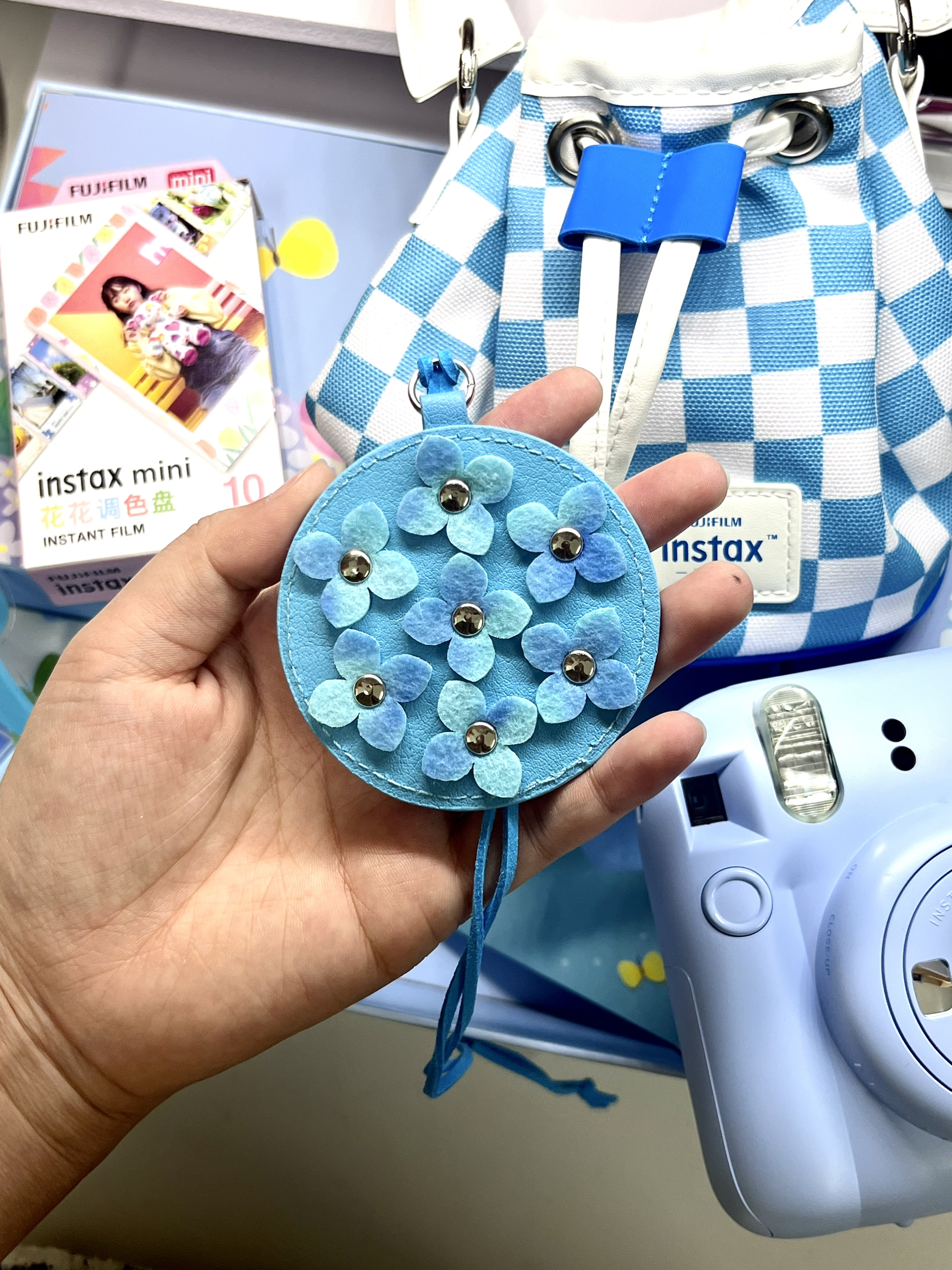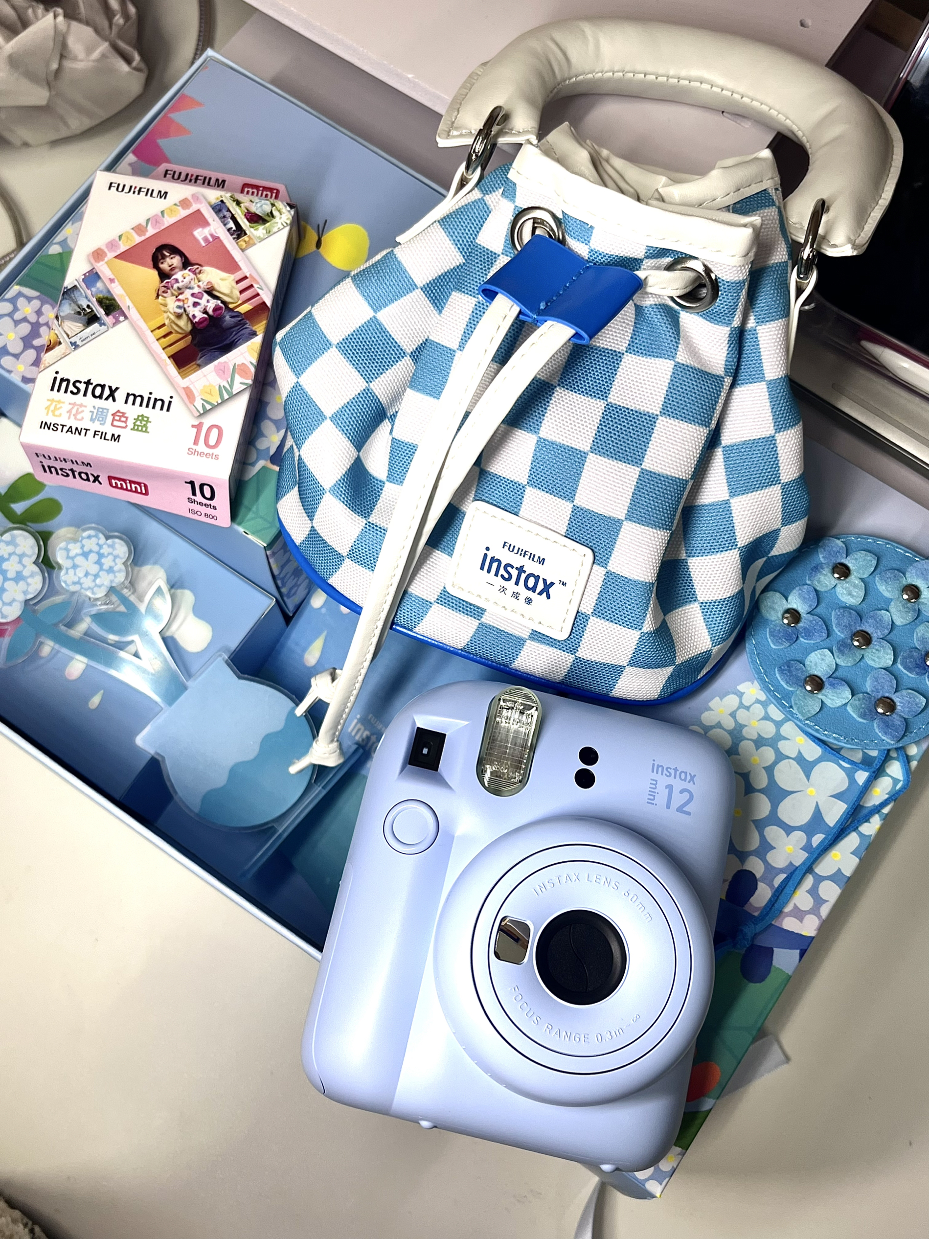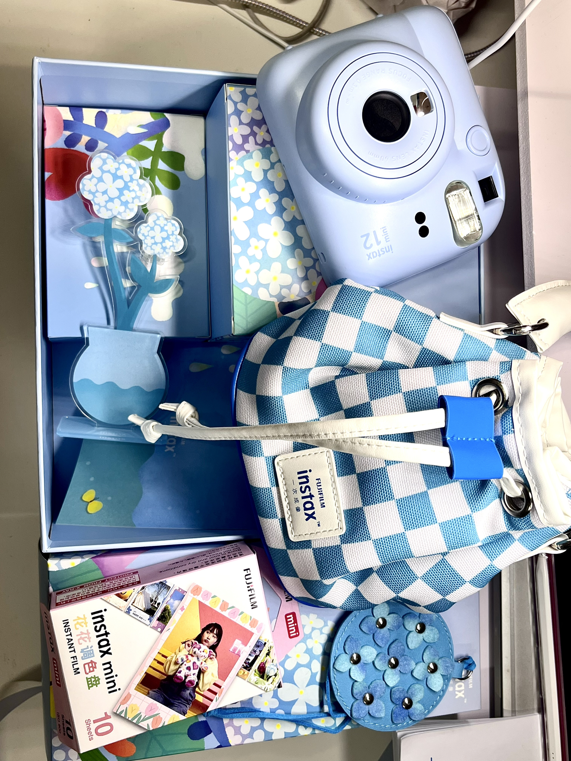 蓝色到手真的很好看很清新 有一个相机包,我看了一下有长肩带可以斜挎🌌 花花相纸也很可爱,之前只用过白色的 没想到这个套盒里送的是花花的🌹 蓝色小花摆件背面可以放拍立得照片 最最最喜欢这个蓝色的小挂件!超有质感也好看 最后最后整个包装盒可以废物利用😍 里边有一截麻绳,可以吧套盒挂起来当装饰画 不得不说这个套盒真是颜值超在线~ 有了拍立得接下来就是不停的“投资”了哈哈 有无推荐的小装饰和保护壳🥳