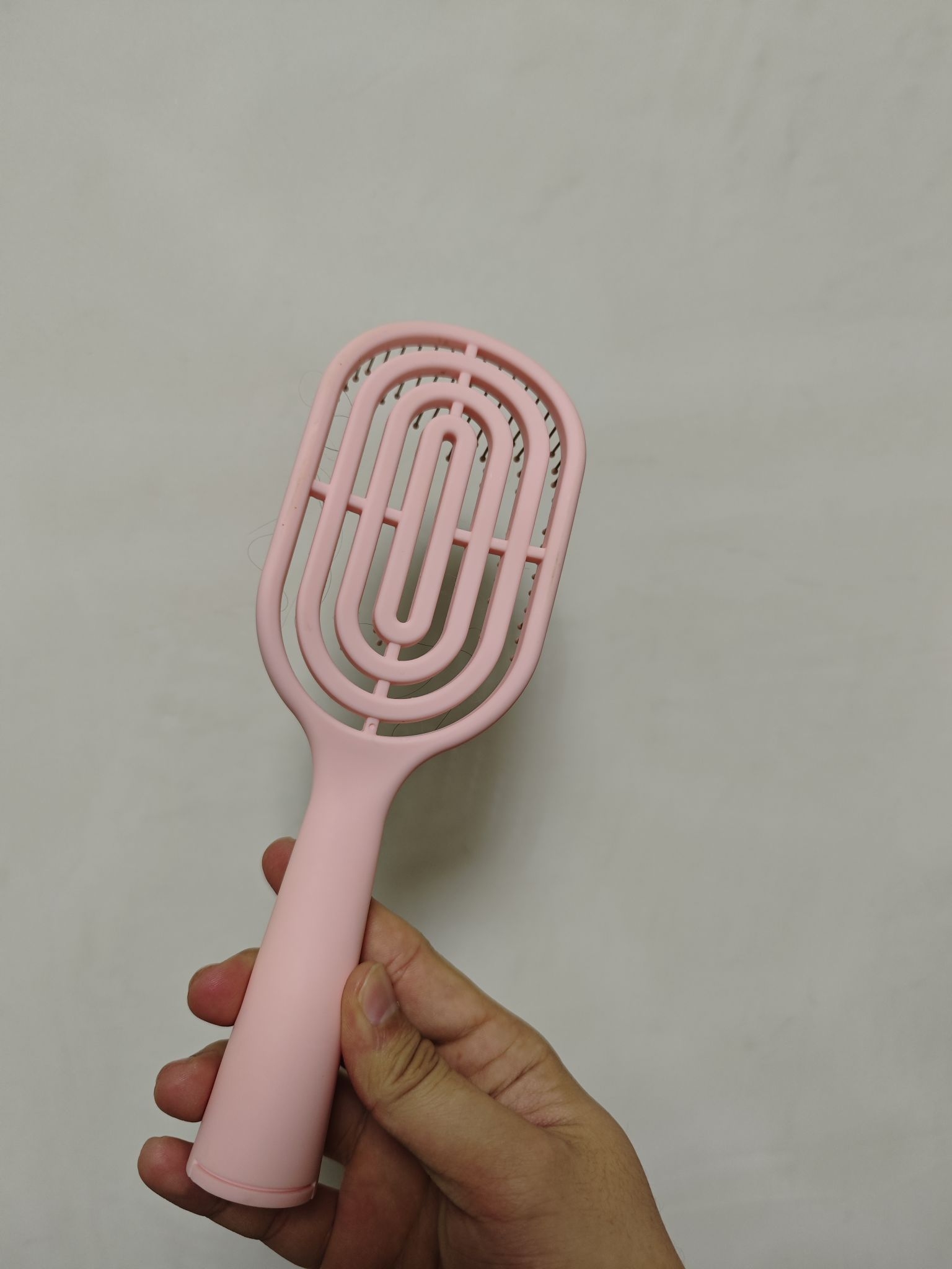 被朋友安利的镂空梳,用了一周直接封神!我是细软塌发质,用它梳头发不会把头发梳得贴头皮,反而能梳出点蓬松感,圆头梳齿接触头皮还挺舒服的,像轻轻按摩一样。粉色的外壳质感也不错,不是那种廉价的塑料感,日常放化妆包里也不占地方,真心推荐~