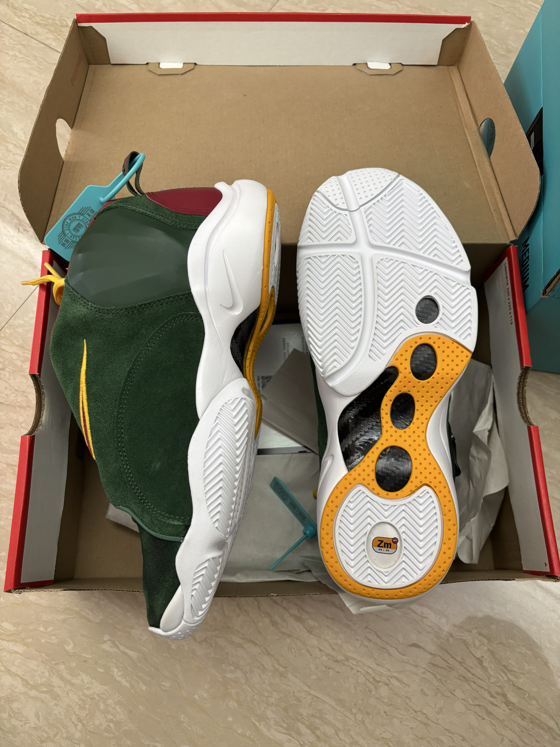 手套佩顿的第一代签名鞋,19年复刻当时买过两双,一双黑色和一双白色,但当时尺码没拿捏好,这双鞋码可以说是偏小的,前掌很窄。 前后的减配薄zoom➕中足异形碳板,放在现在实战也是不错!