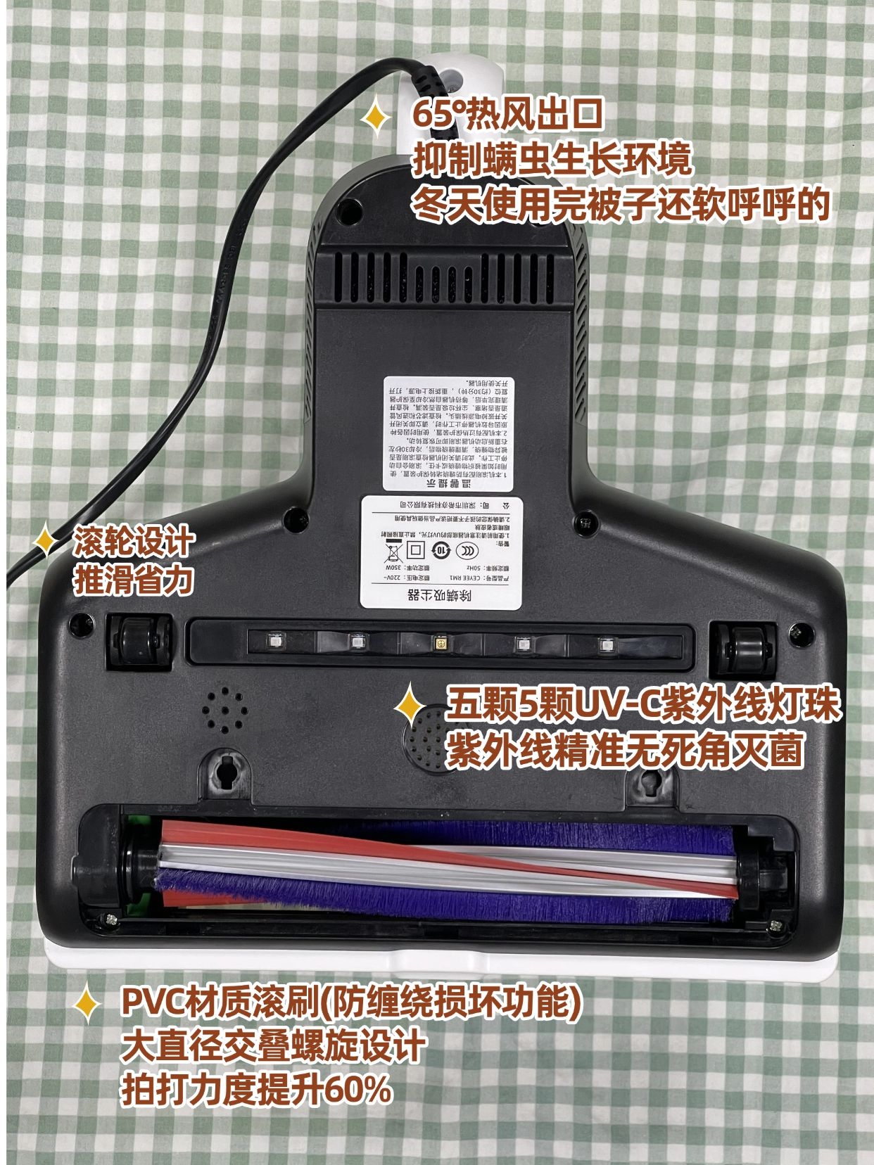 更戳家居健康需求的是它的双重杀菌抑螨设计:5颗 253.7nm 波长的UV-C紫外线灯 + 超声波协同作用,能直接破坏螨虫DNA,杀灭率高达99.99%;65℃恒温热风功能太适合南方回南天、梅雨季,既能烘干织物潮气,又能从根源切断滋生路径。而且紫外线灯有防漏光设计,贴紧面料才亮,抬起自动熄灭,有娃有宠家庭用着也放心。