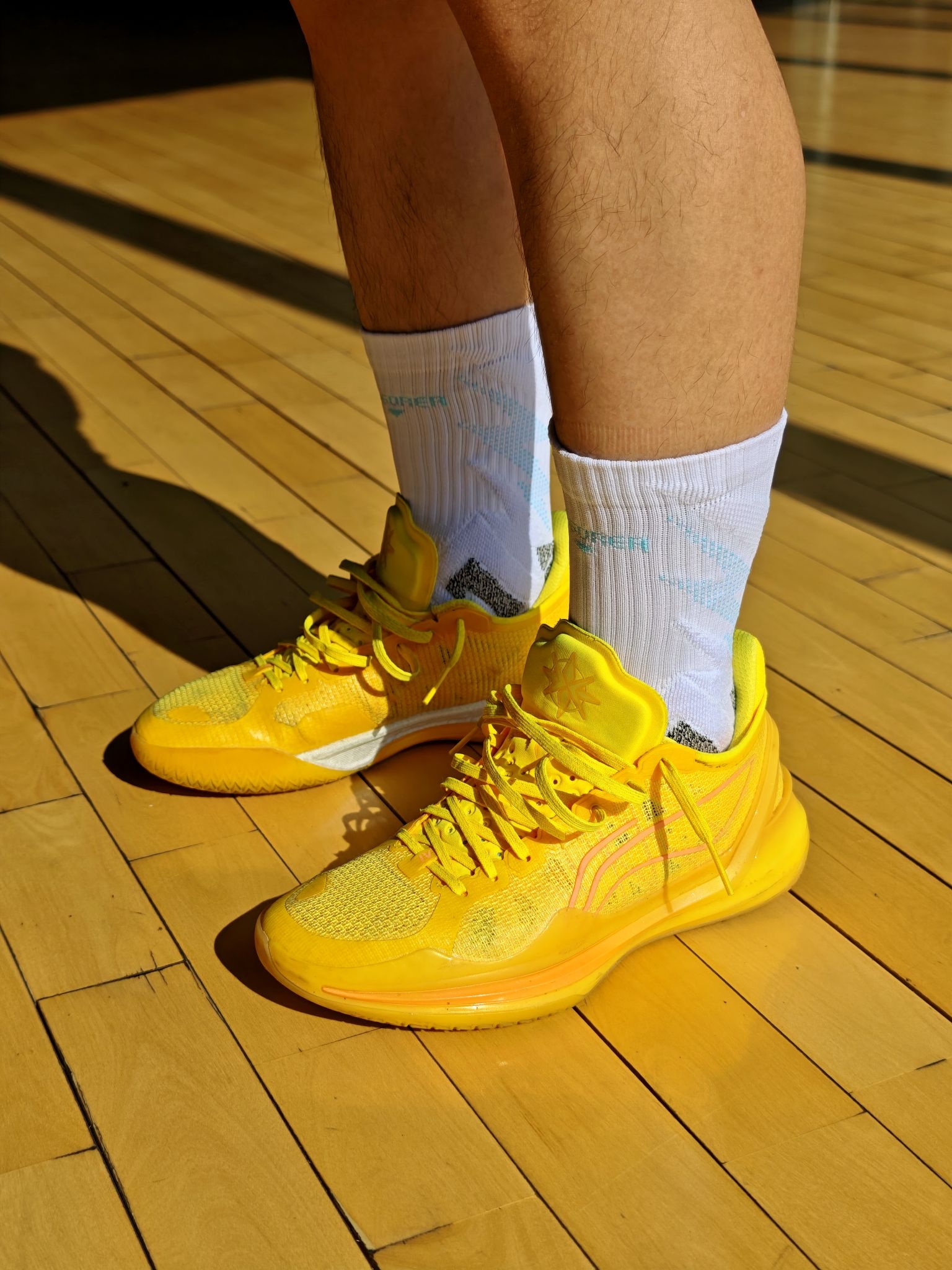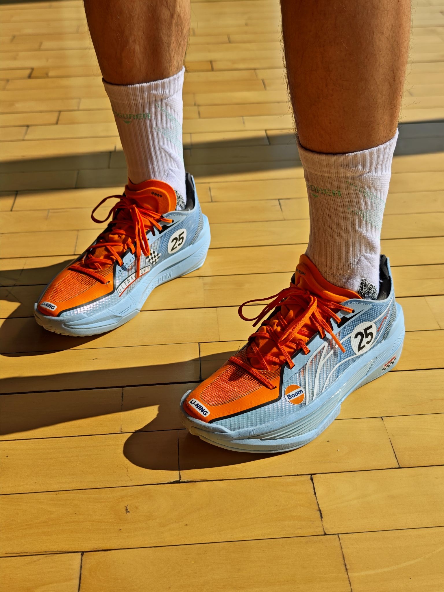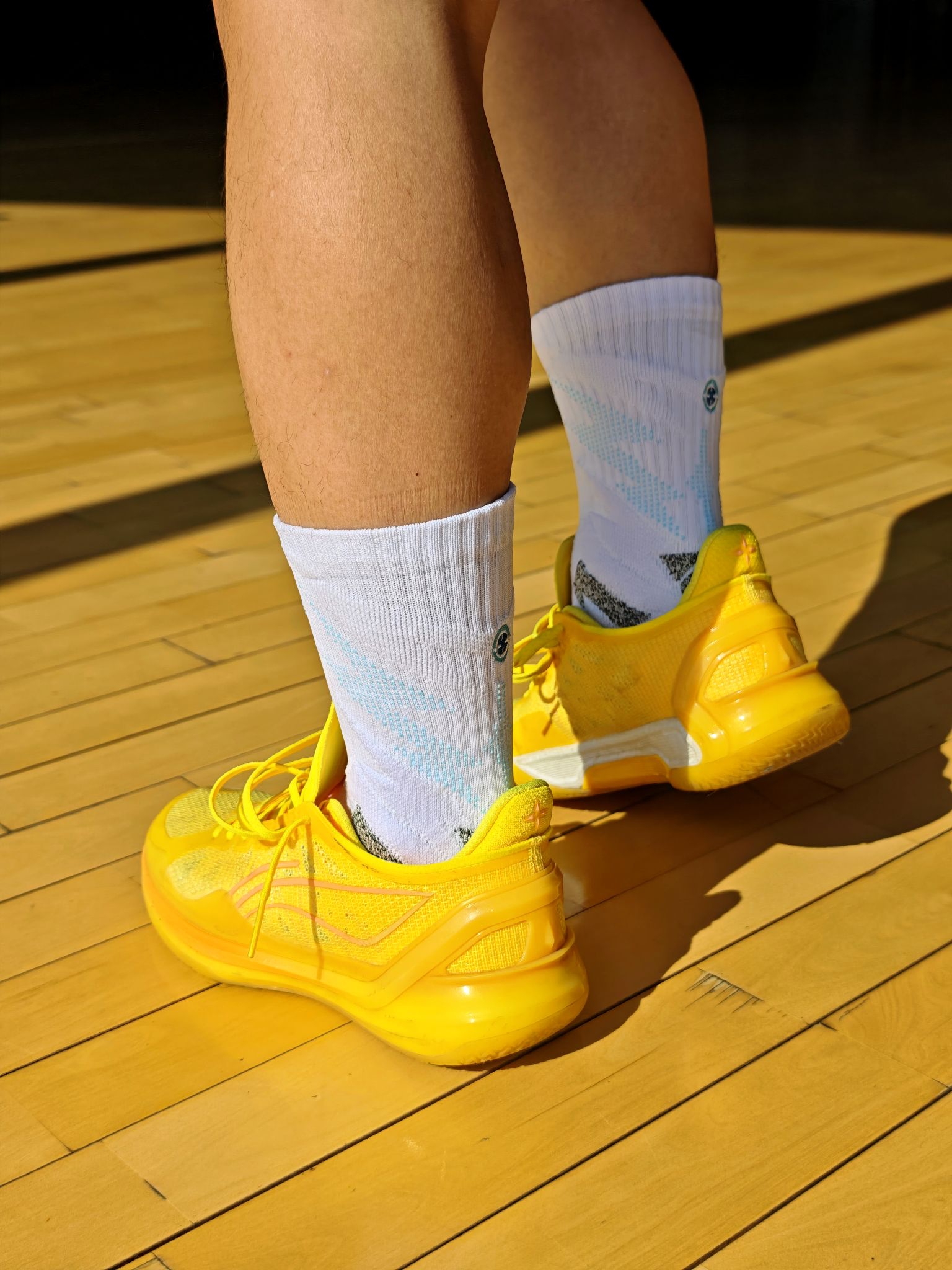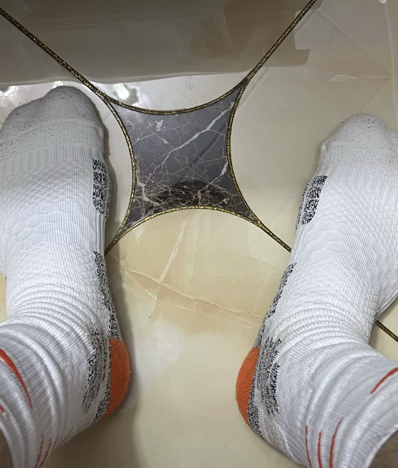 白黑闪电纹上脚超有辨识度,搭黑绿实战鞋往球场一站,光看袜子就知道是速度型选手✨。莱卡橡筋的袜筒弹性贼好,热身拉伸时扯到最大也不松,打满全场袜筒还紧紧贴在小腿上,完全不卷边也不勒得慌。 变向突破那一下,脚底防滑纱线跟鞋底粘在一起似的,急停再蹬地压根不打滑,快攻冲起来脚步都更利索了;抢板起跳落地,加厚毛圈把震感卸得干干净净,膝盖都少了不少压力。脚背的网眼跟开了小空调似的,三伏天打外场,打了三节脚还是...
