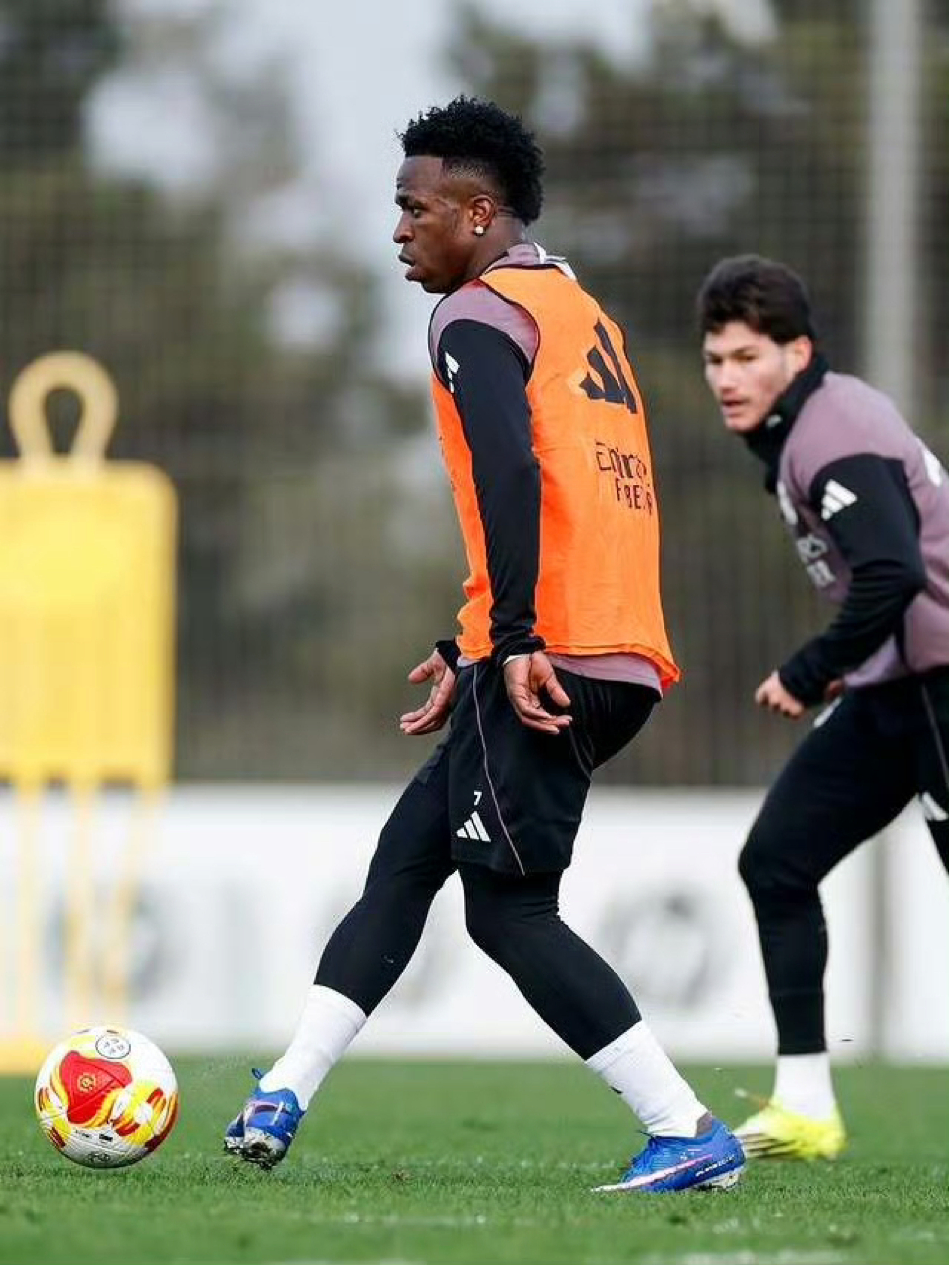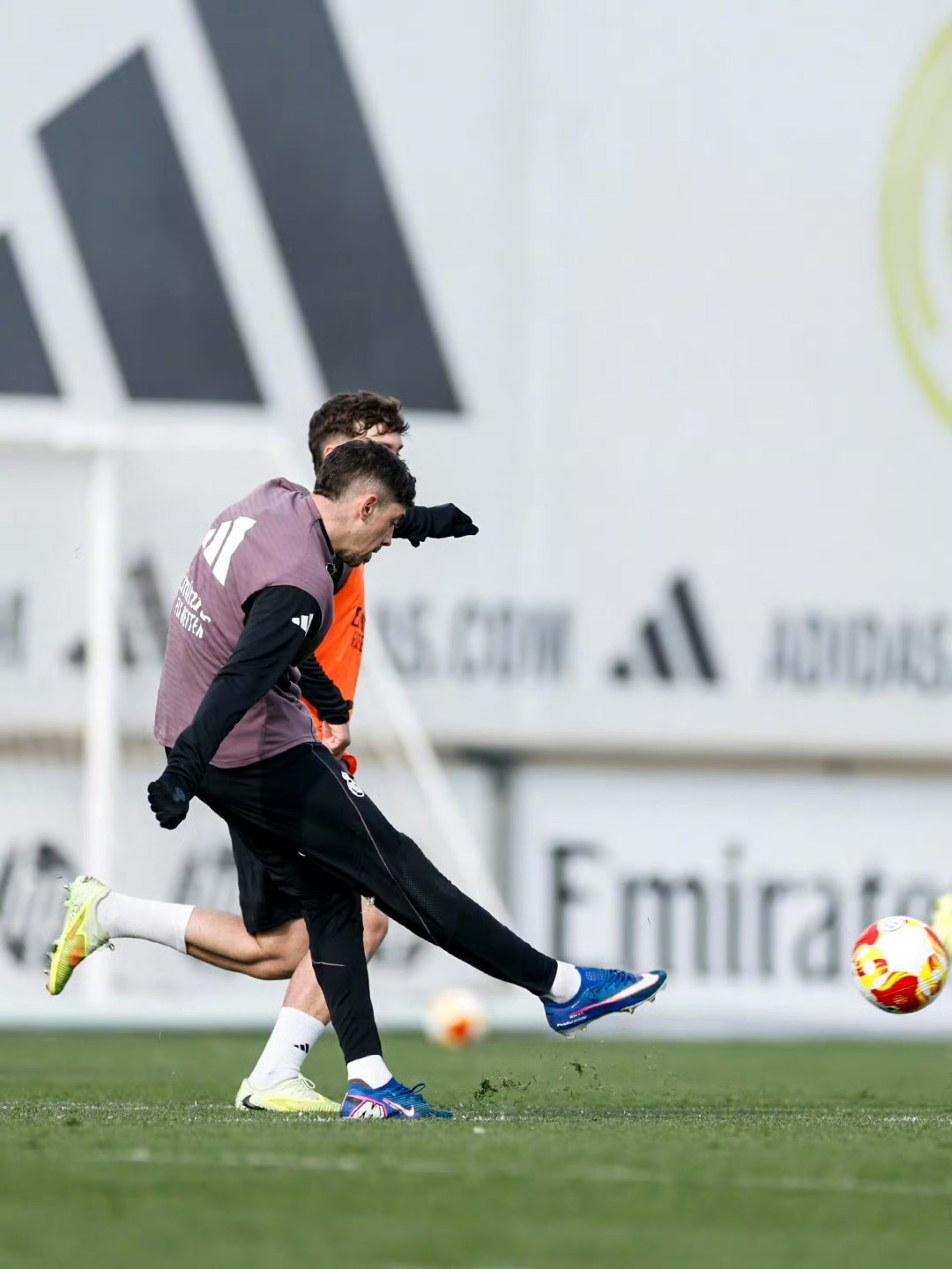 在皇马的训练场上,球员们身着紫色训练服,正为即将到来的比赛全力备战。 • 锋线尖刀:维尼修斯在边路展现了出色的爆发力和盘带能力,他的每一次突破都极具威胁。 • 新星闪耀:年轻球员居莱尔在训练中毫不怯场,他的控球和传球展现了巨大潜力。 • 老将担当:队长卡瓦哈尔带伤坚持训练,用行动诠释了皇马的铁血精神。 • 团队协作:巴尔韦德与队友的攻防演练,展现了球队中场的硬度与创造力。 这套紫色训练服...