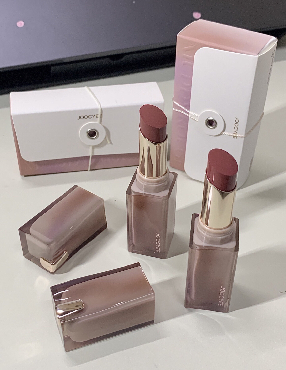 淡颜冬天尊滴好适合涂这种低饱和度的雾面口红 我选的这一支是C01桃雾粉 淡淡的颜色但是很能中和嘴巴的紫色调 涂上看起来很有质感的低饱和度雾粉色 素颜或者韩系一些的妆容都很适配 还送了很漂亮的发圈