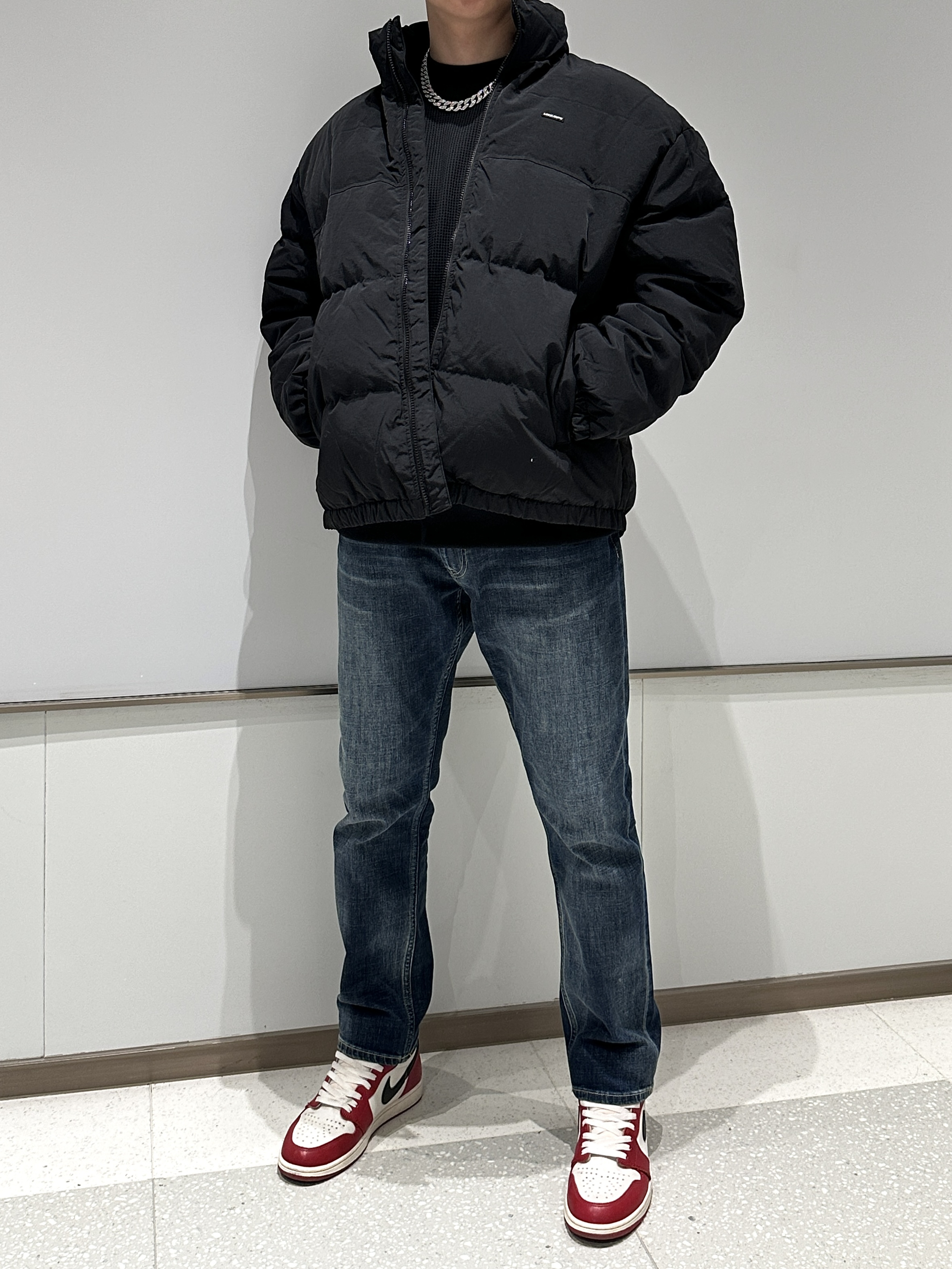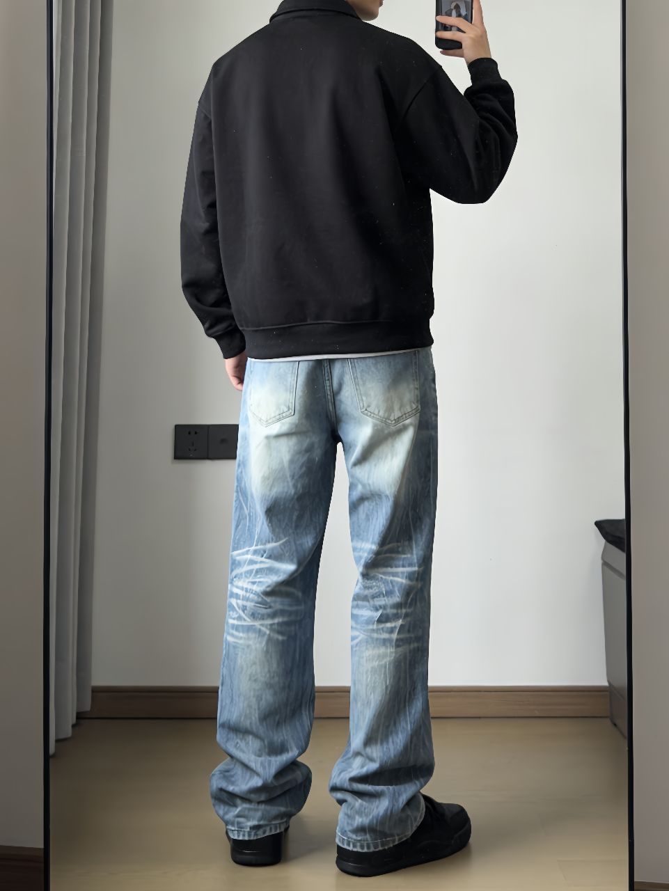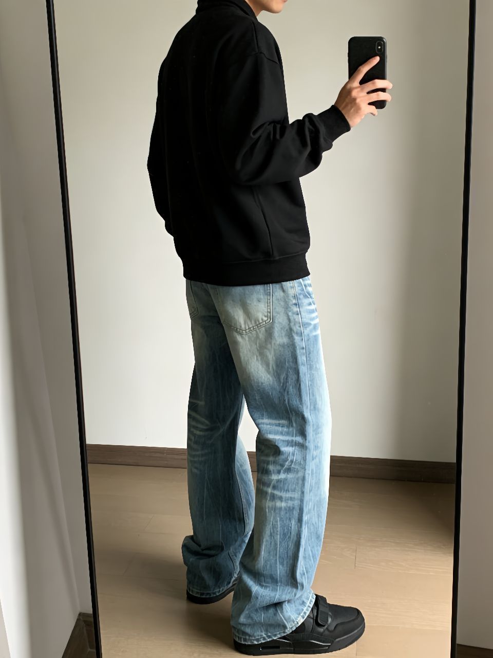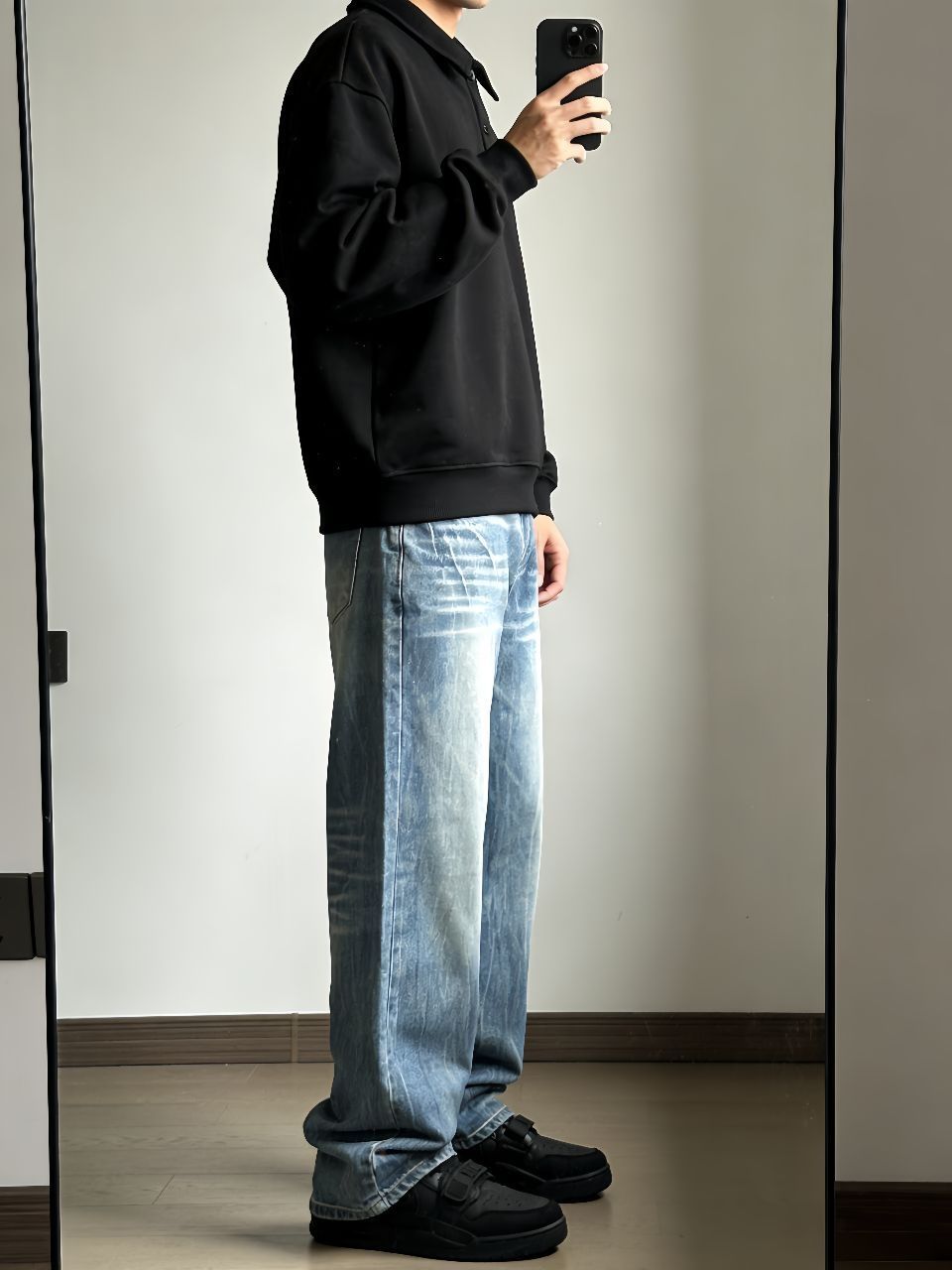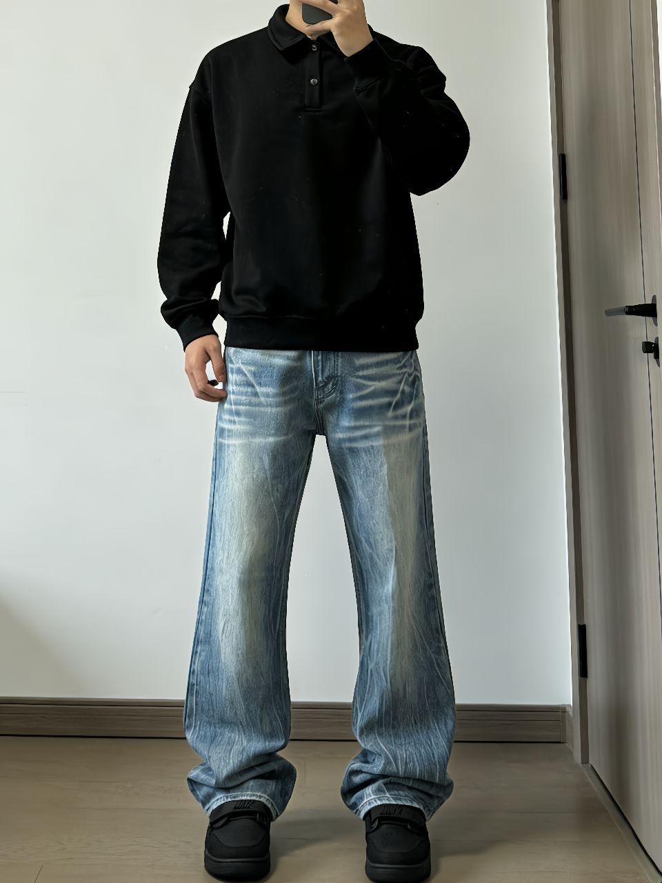 今天这套真是我近期随手抓出门最爽的一次!卫衣是环球那个翻领款,纯棉的洗过也不变形,廓形够大藏肉一绝。牛仔裤特意选了芝麻街的拖地款,水洗蓝颜色正得刚好,裤腿堆在鞋面上那种懒散劲儿一下就来了。 重点夸这双乔丹312黑武士!低帮设计特别利落,和拖地牛仔裤简直是天作之合——裤脚刚好盖住鞋帮,露出点鞋头超显腿长。一身黑灰蓝配色不费脑子,但高级感就在这些细节里:卫衣领子立起来精神,裤子垂感够显瘦,鞋子踩着软...