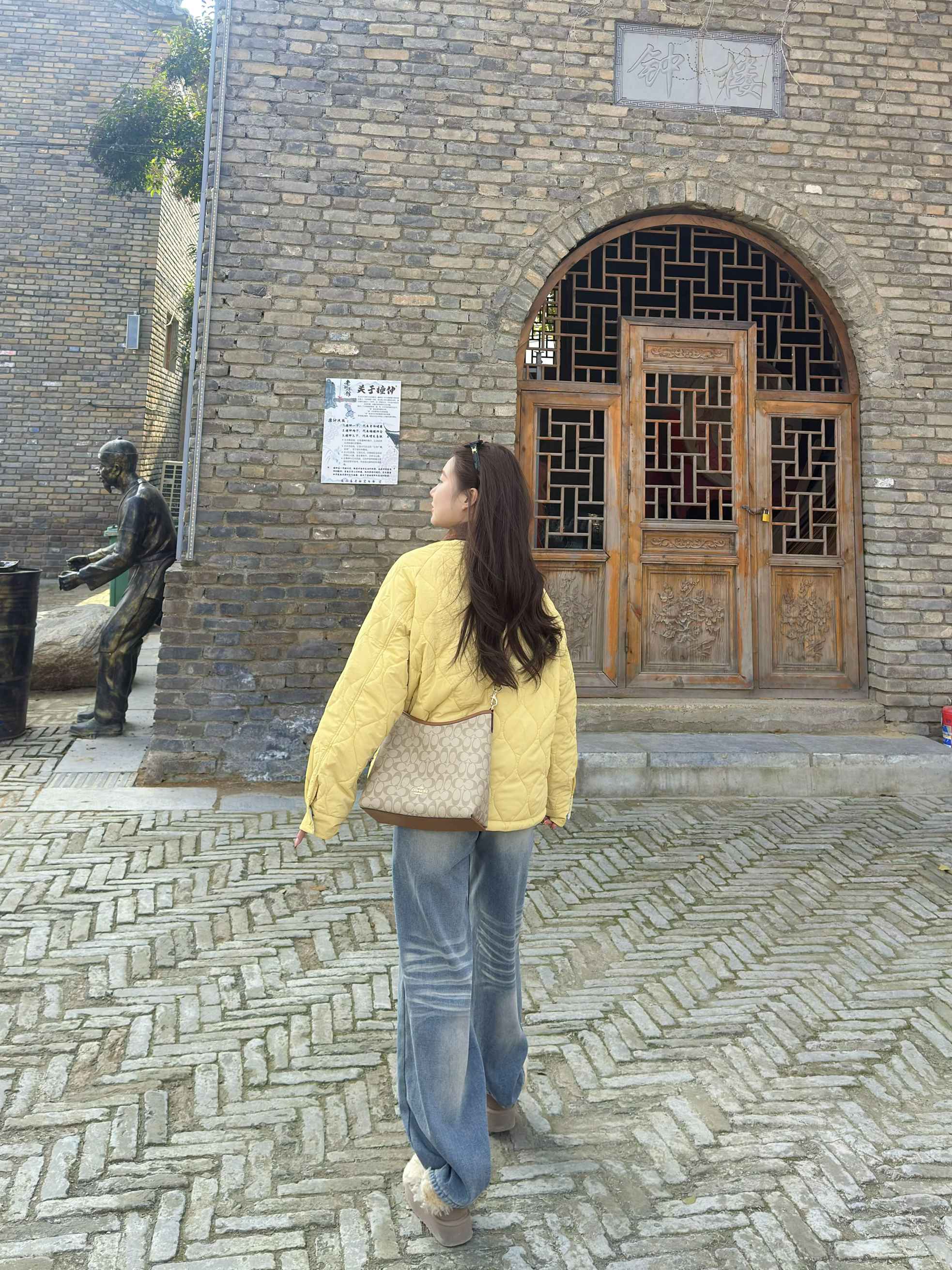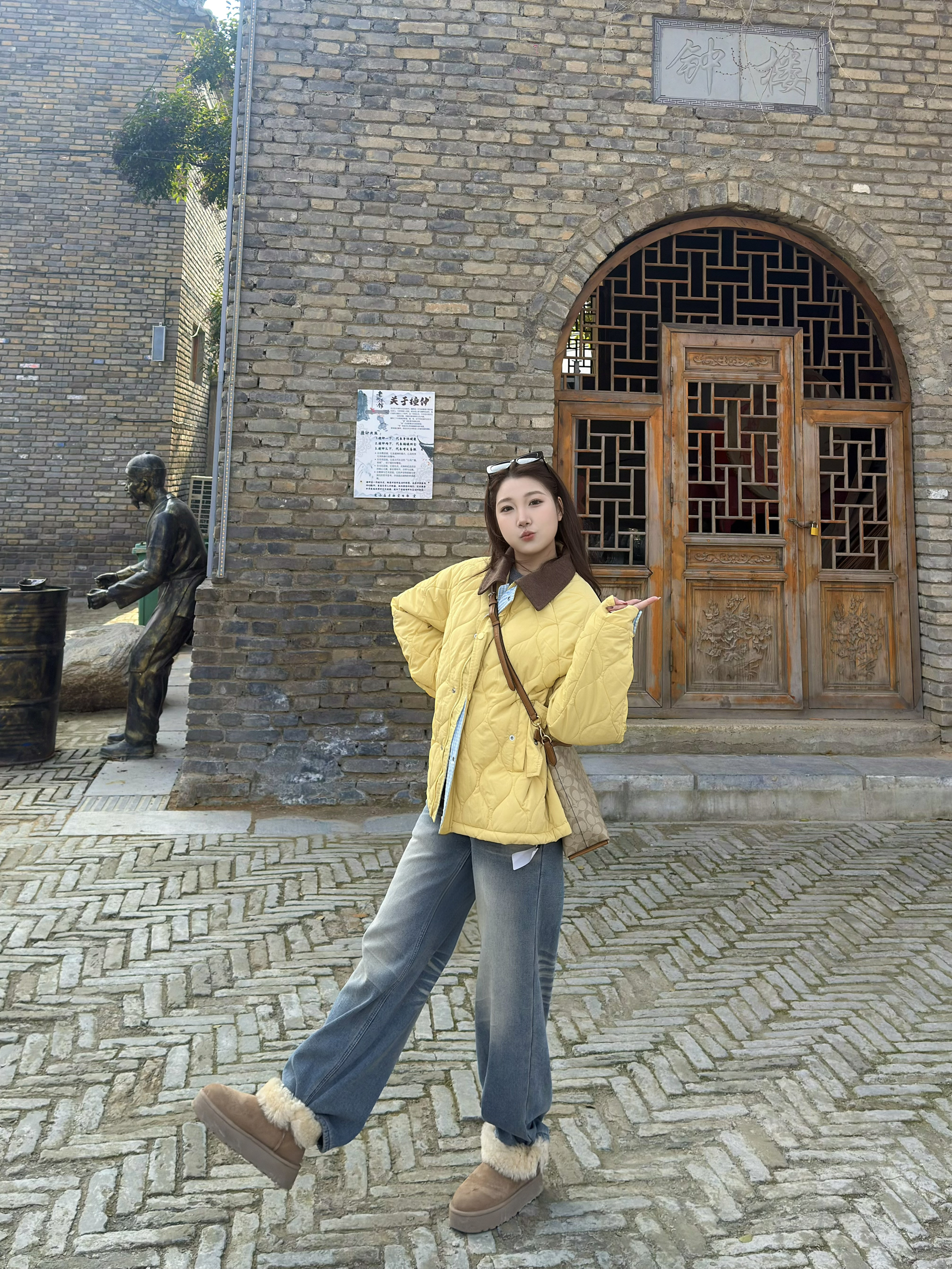 这件鹅黄色菱格棉服也太戳我了!软软糯糯的还很轻便,棕色翻领复古感拉满,菱格纹设计不显臃肿,现在天气穿正合适~ 搭配做旧蓝阔腿牛仔裤,垂感巨好!裤脚堆在鞋面上慵懒感拉满,还能把腿型遮得明明白白,梨形身材闭眼冲🌬️ 脚踩棕色毛毛雪地靴,暖呼呼的踩一天都不累,鞋口毛绒和棉服质感好搭~再挎上Coach老花包,容量大到能装下相机和小零食,实用性拉满💯