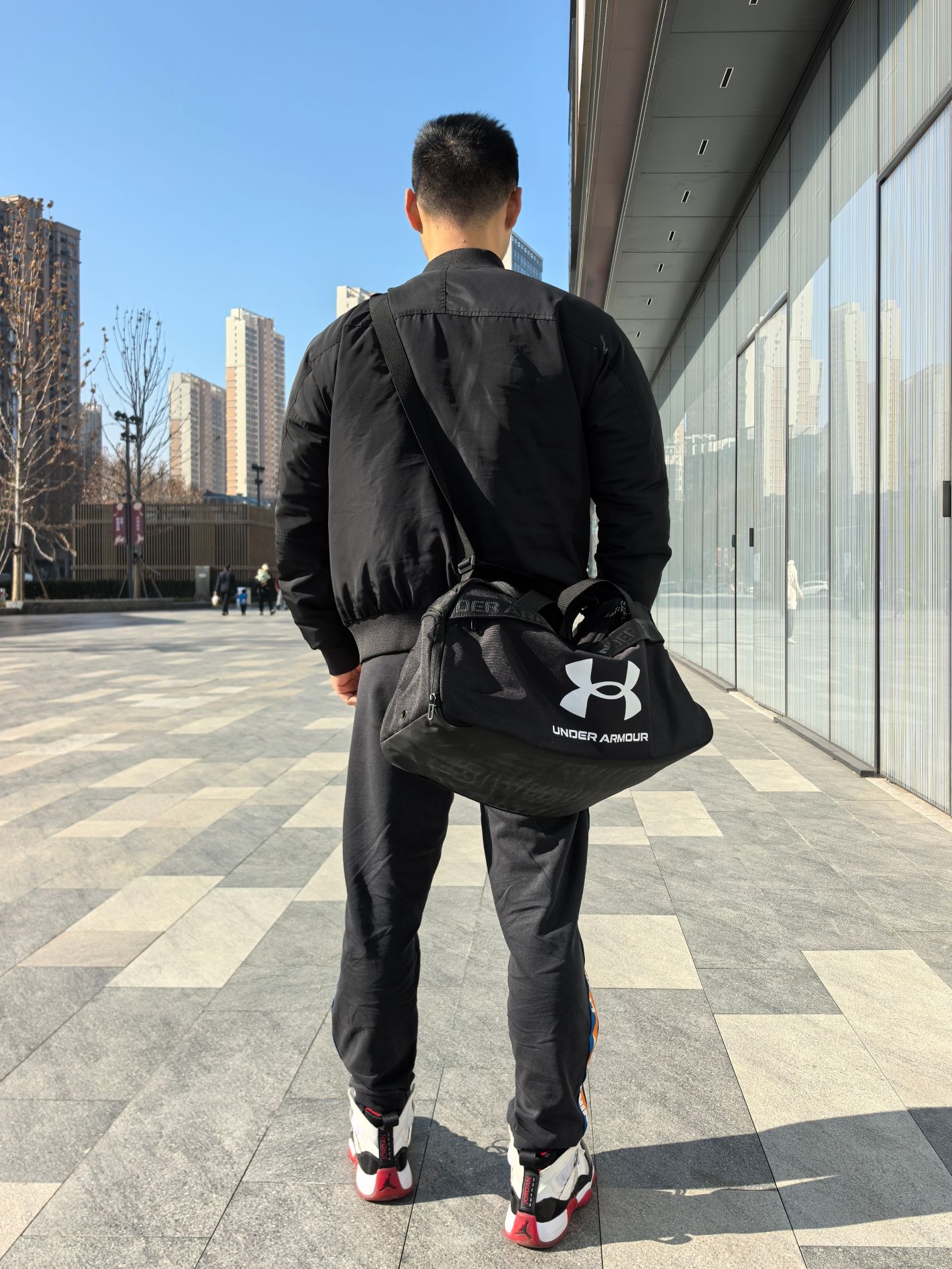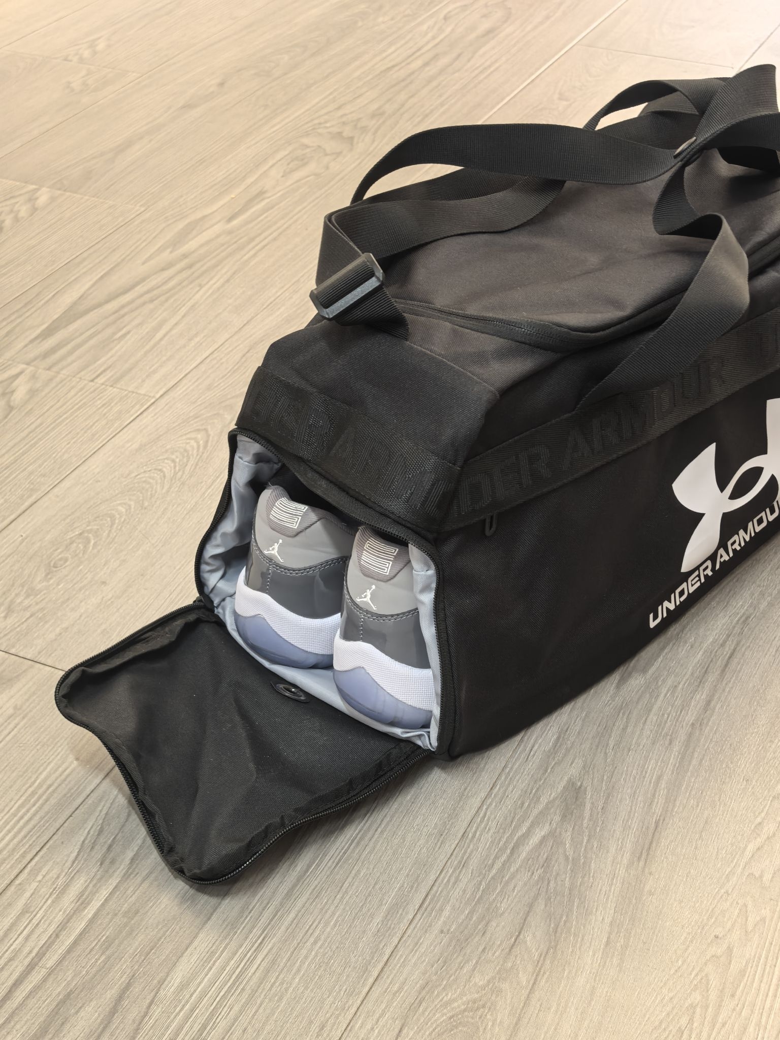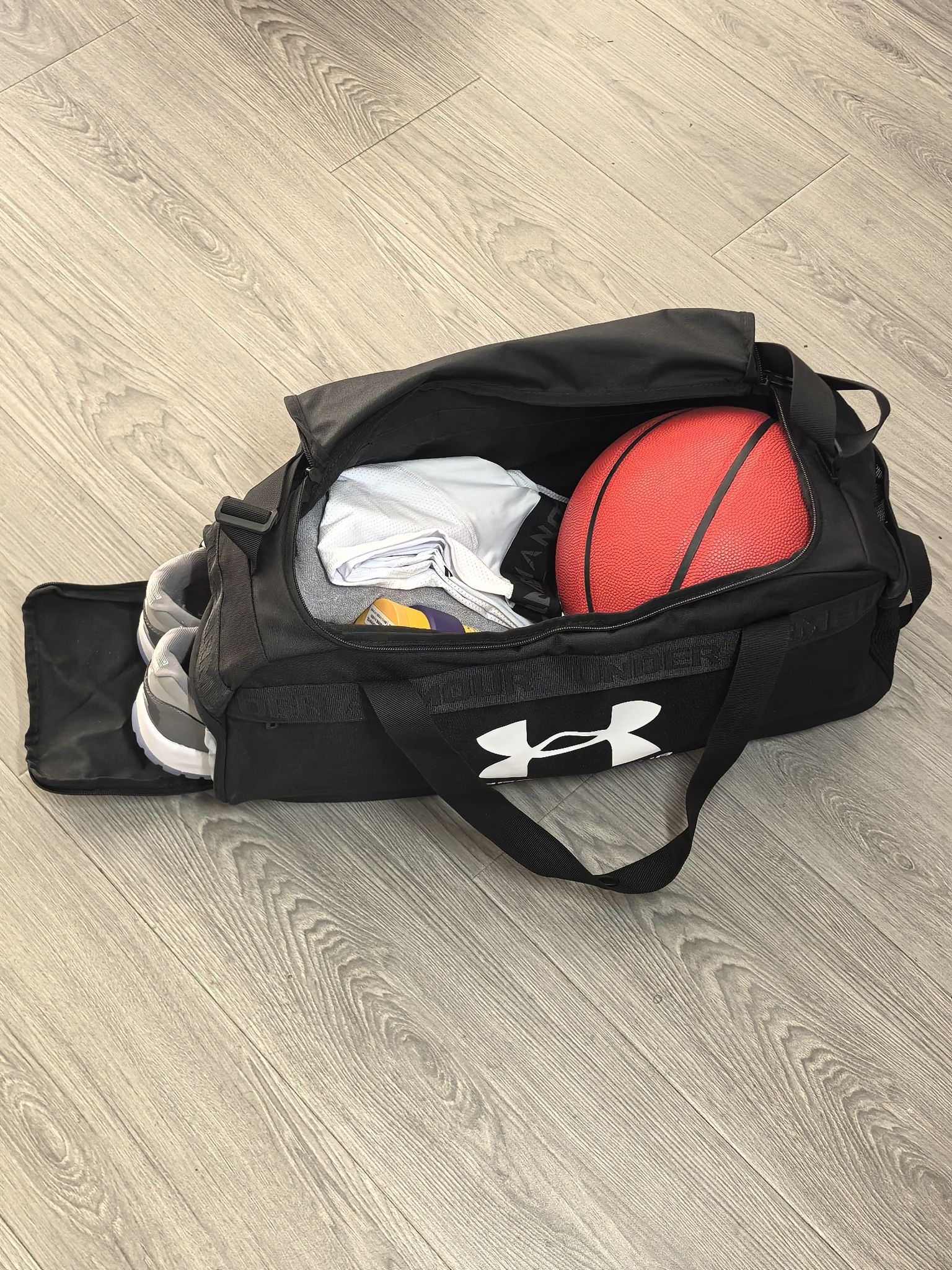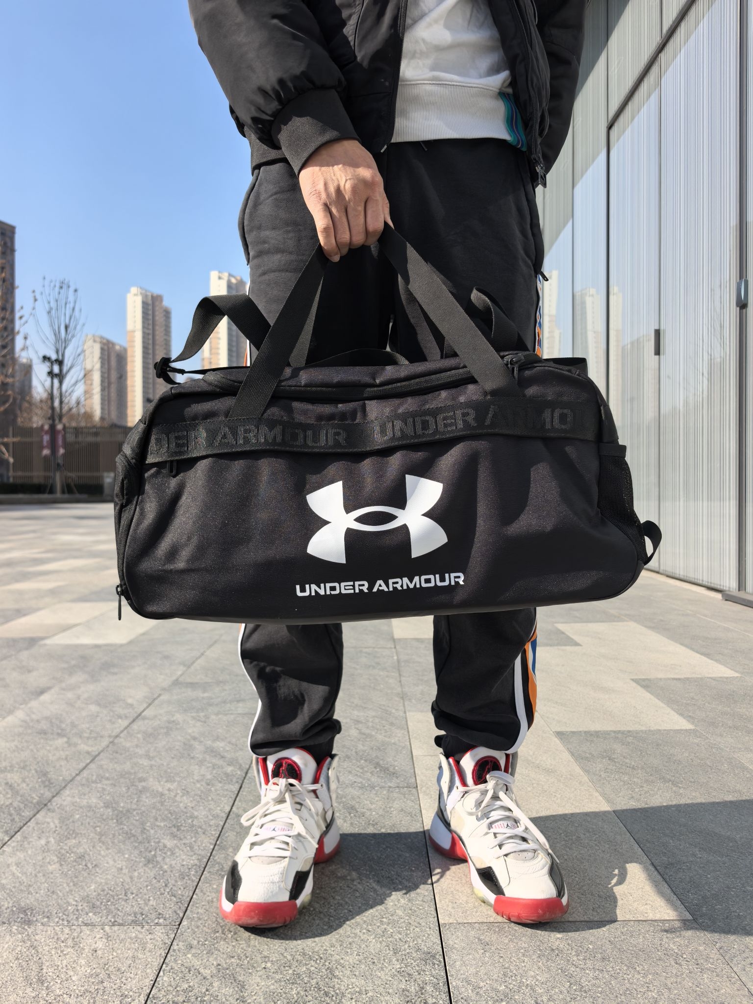 刚入手的安德玛运动包,真心觉得值。面料摸起来特别厚实,耐磨抗造,容量也够大,我打球的衣服、球鞋、篮球,水杯塞进去还能剩不少空间。拎着不勒手,还有可调节肩带,单肩背也舒服。侧边有专门的鞋仓,湿衣服和干净衣服能分开装,不会混在一起,平时打球健身背上它太方便了!