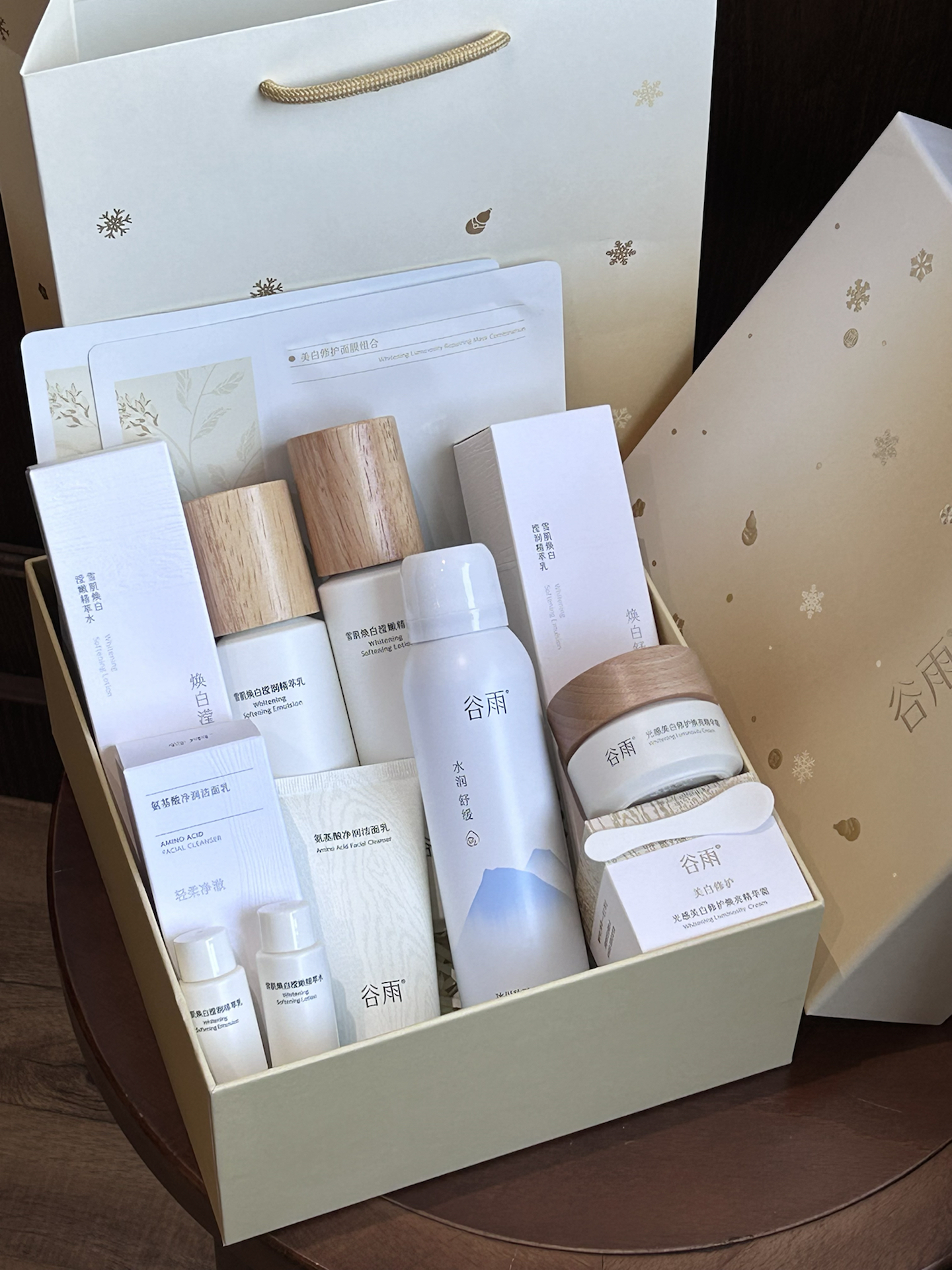 是介个谷雨的金喜流光水乳礼盒 金色的礼盒我觉得还蛮好看的 里面水乳 面霜 喷雾 还有面膜 小样 一套搞定我日常的护肤需求啦 像我们女孩子喜欢熬夜追剧 用这套尊嘟好合适耶 我用了一段是感觉皮肤都透亮不少 我觉得雪肌水乳都还蛮清爽的 上脸好吸收 搭配奶罐面霜 冬天我感觉也蛮滋润的 我平时还会随身带喷雾 随时补水 我觉得介么一大套情人节拿来送礼物蛮合适滴 #养出冬日好气色 #寒假逆袭变美 #空瓶才有说...