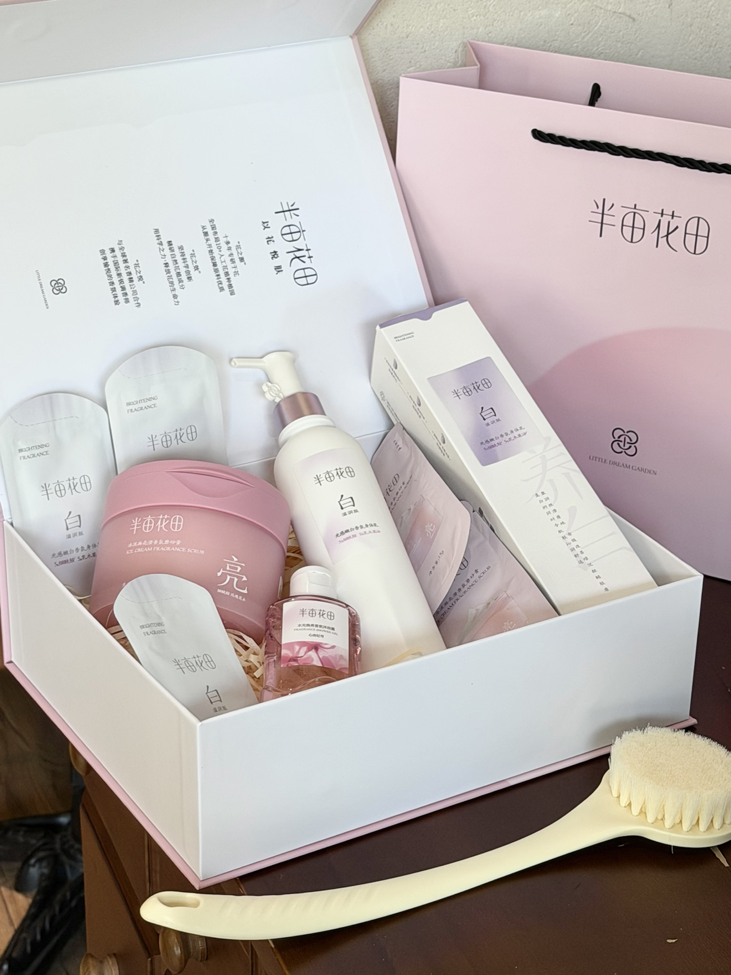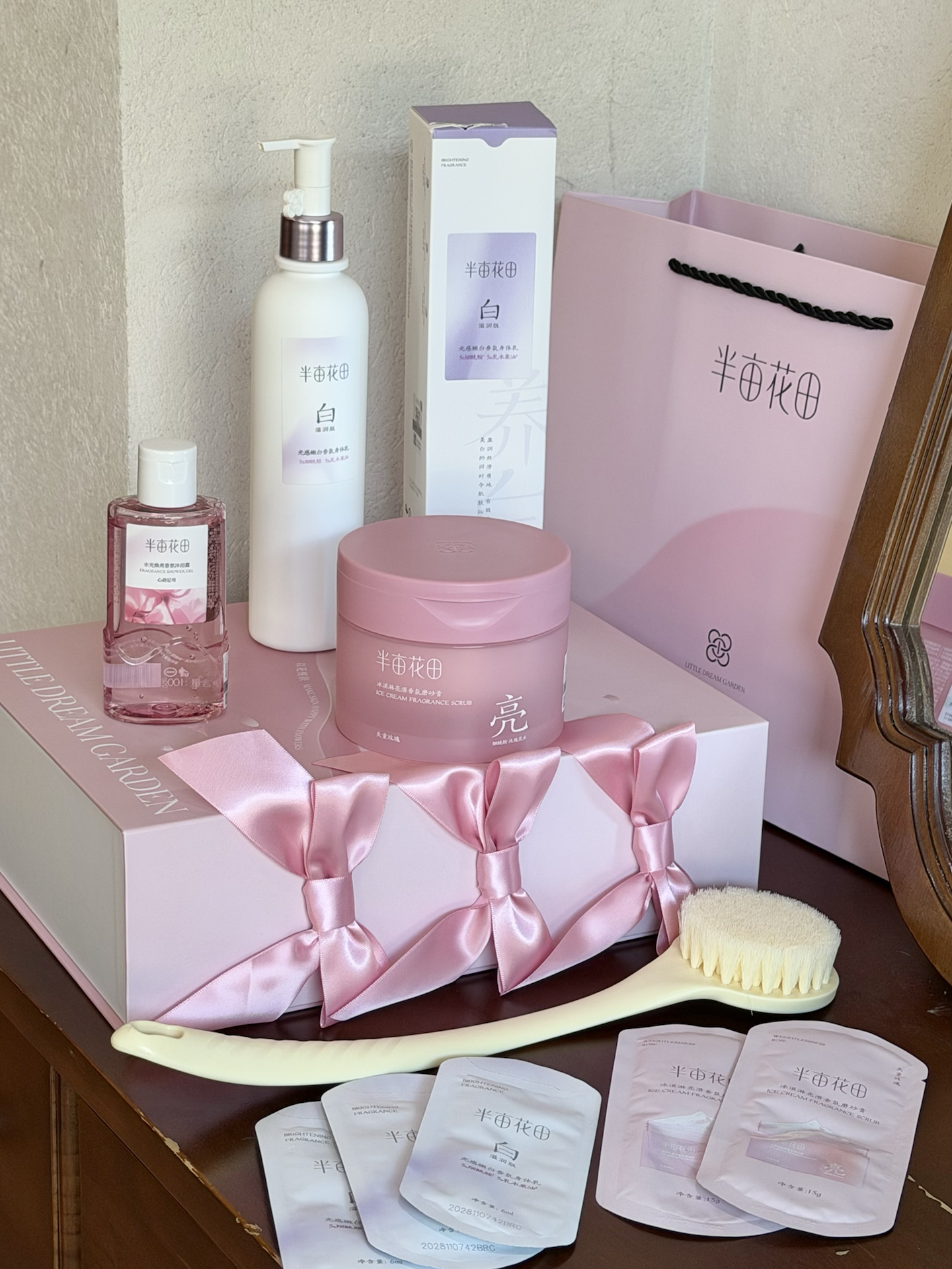 挖到了好少女心的礼盒也 素介个半亩花田的身体乳礼盒 粉嫩嫩的蝴蝶结设计看着很精致 少女心满满 女孩子真的拒绝不了哇 里面的身体护理单品很齐全 一整套搞定我的身体护理啦 磨砂膏质地细腻 好大一罐能用好久 每次我我用它搓完 皮肤会变光滑 搭配身体乳 秋冬涂完皮肤香香软软滴 这对CP用下来 皮肤感觉细腻了些也 沐浴露也香香嘟 洗完皮肤不会干 还搭配了一个刷子好实用 而且这套身体护理礼盒小预算也能轻松拿下...