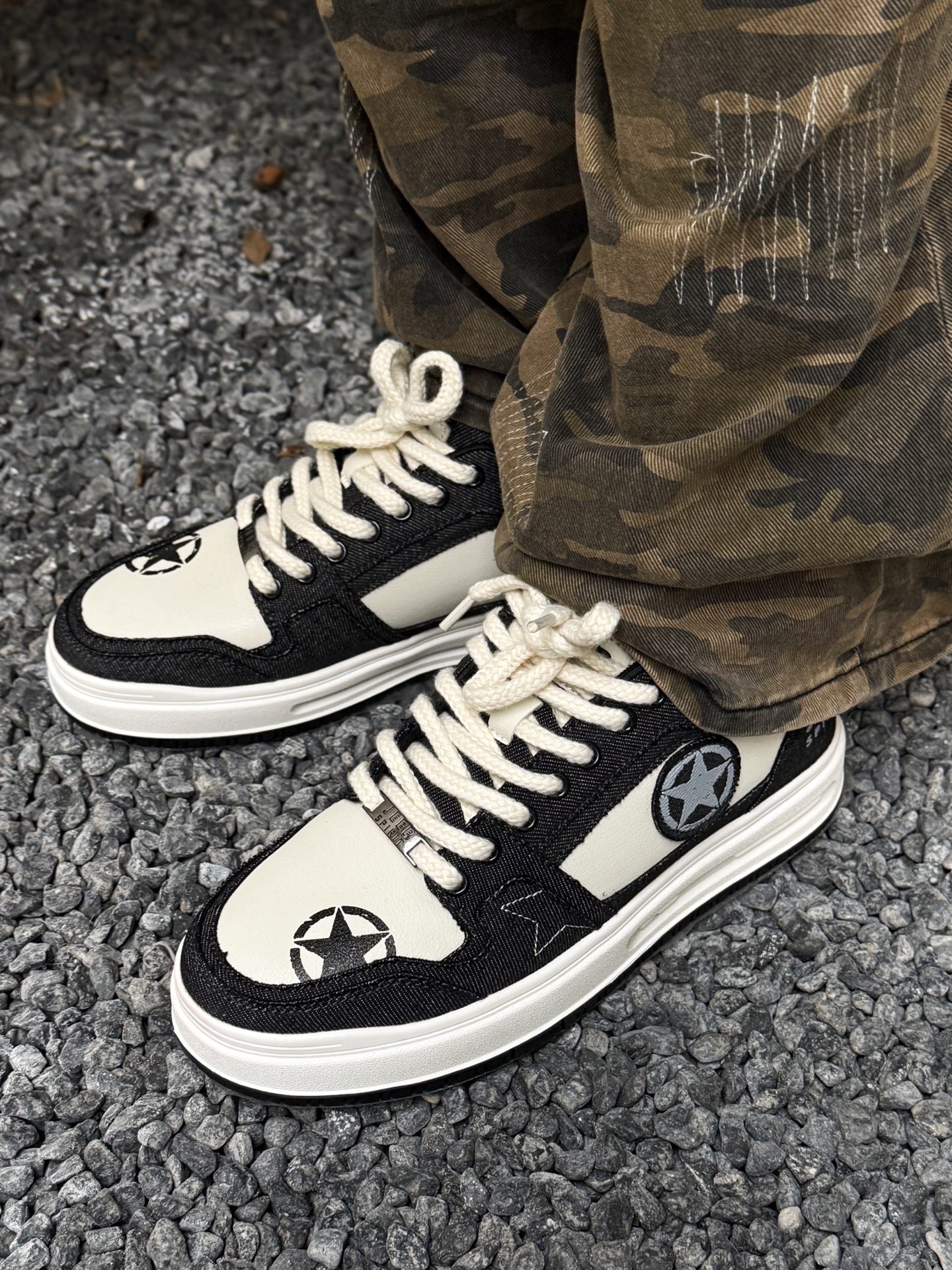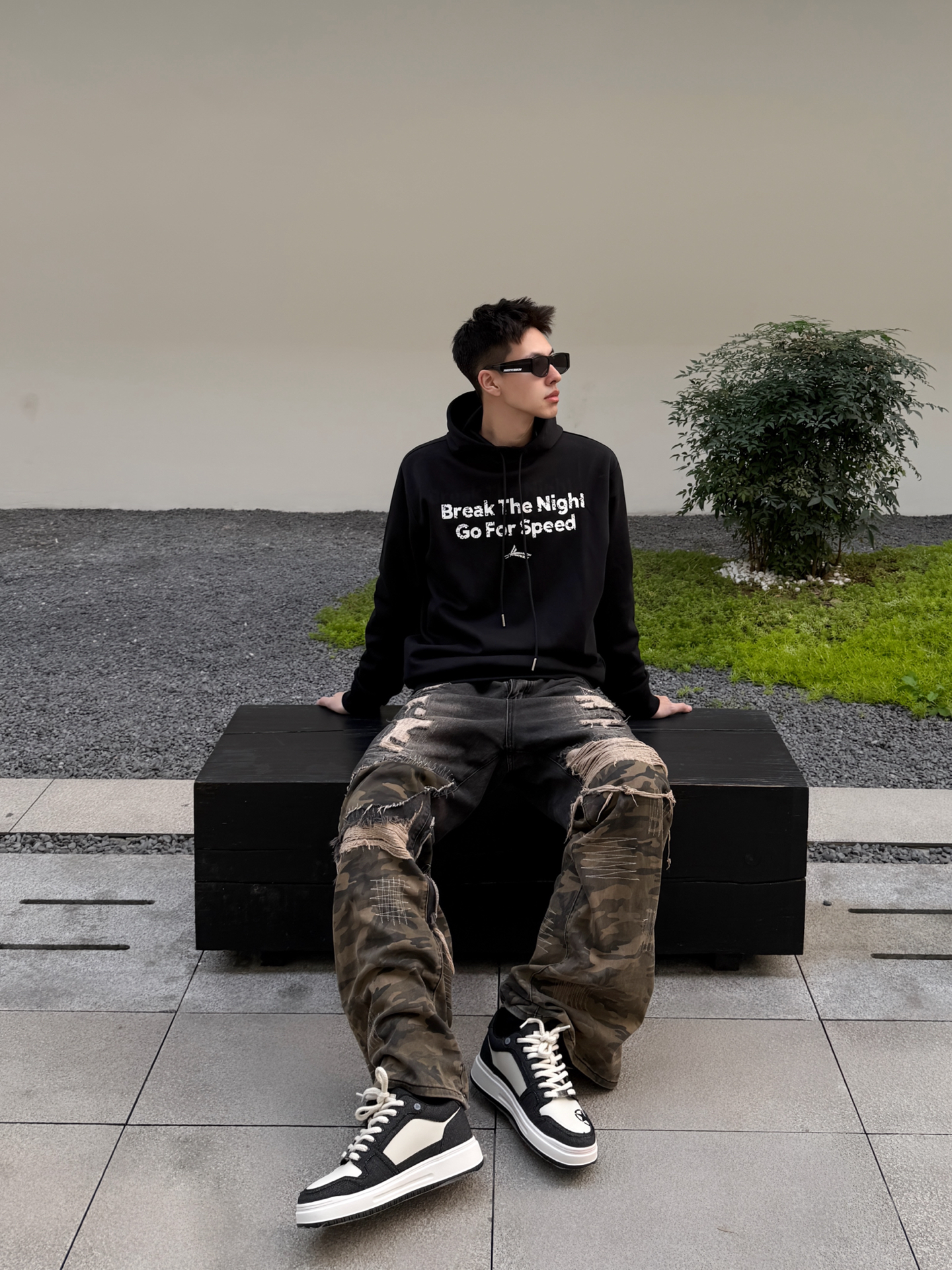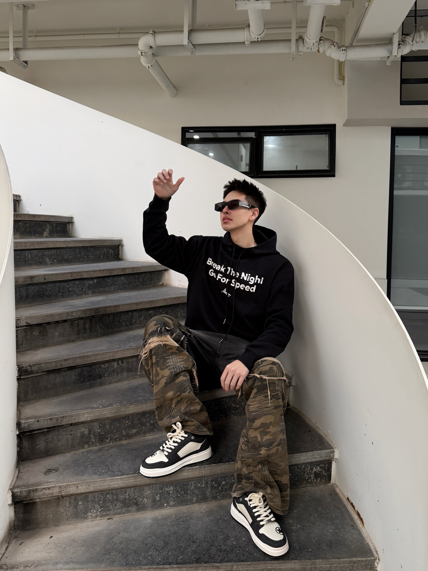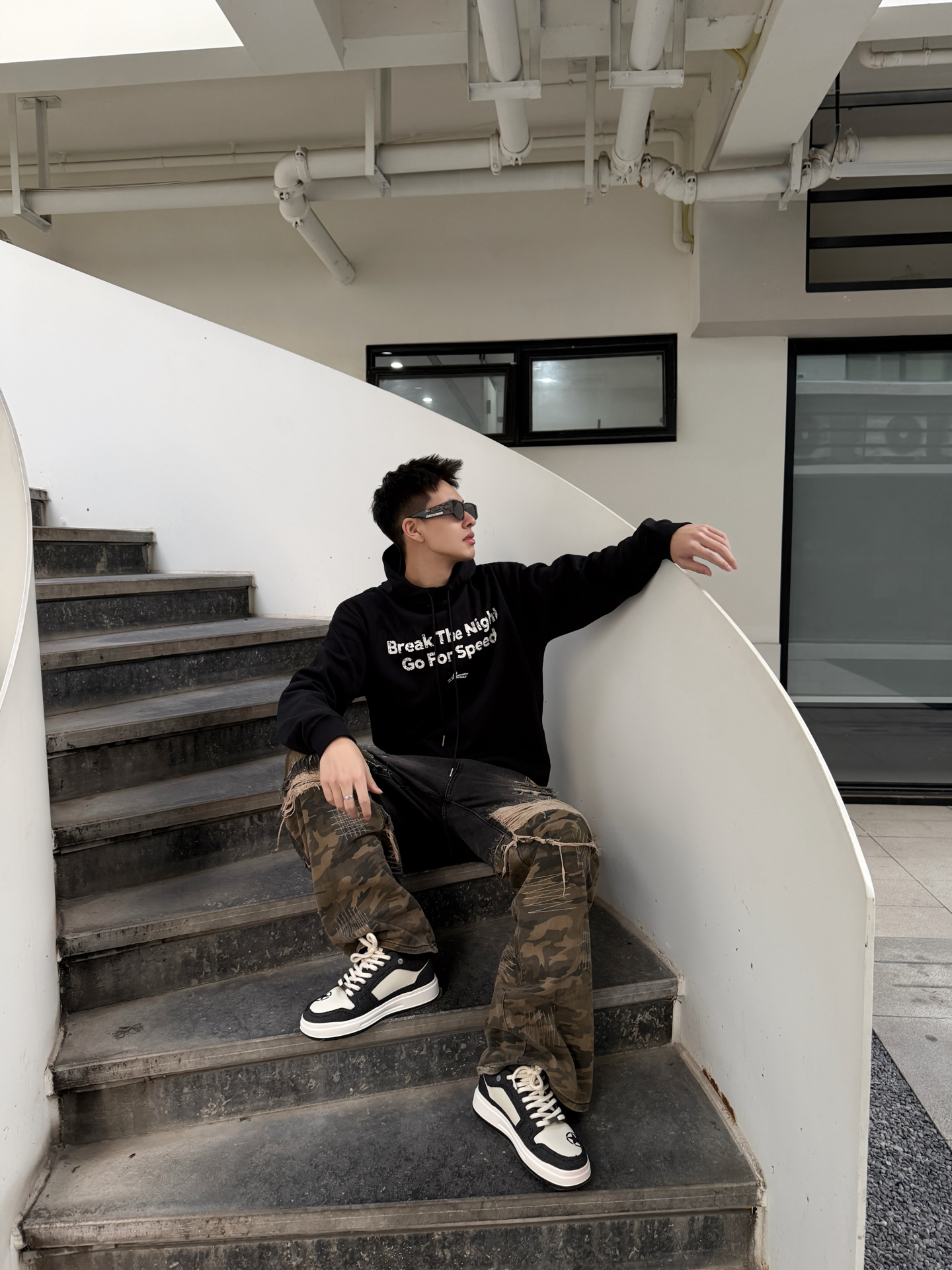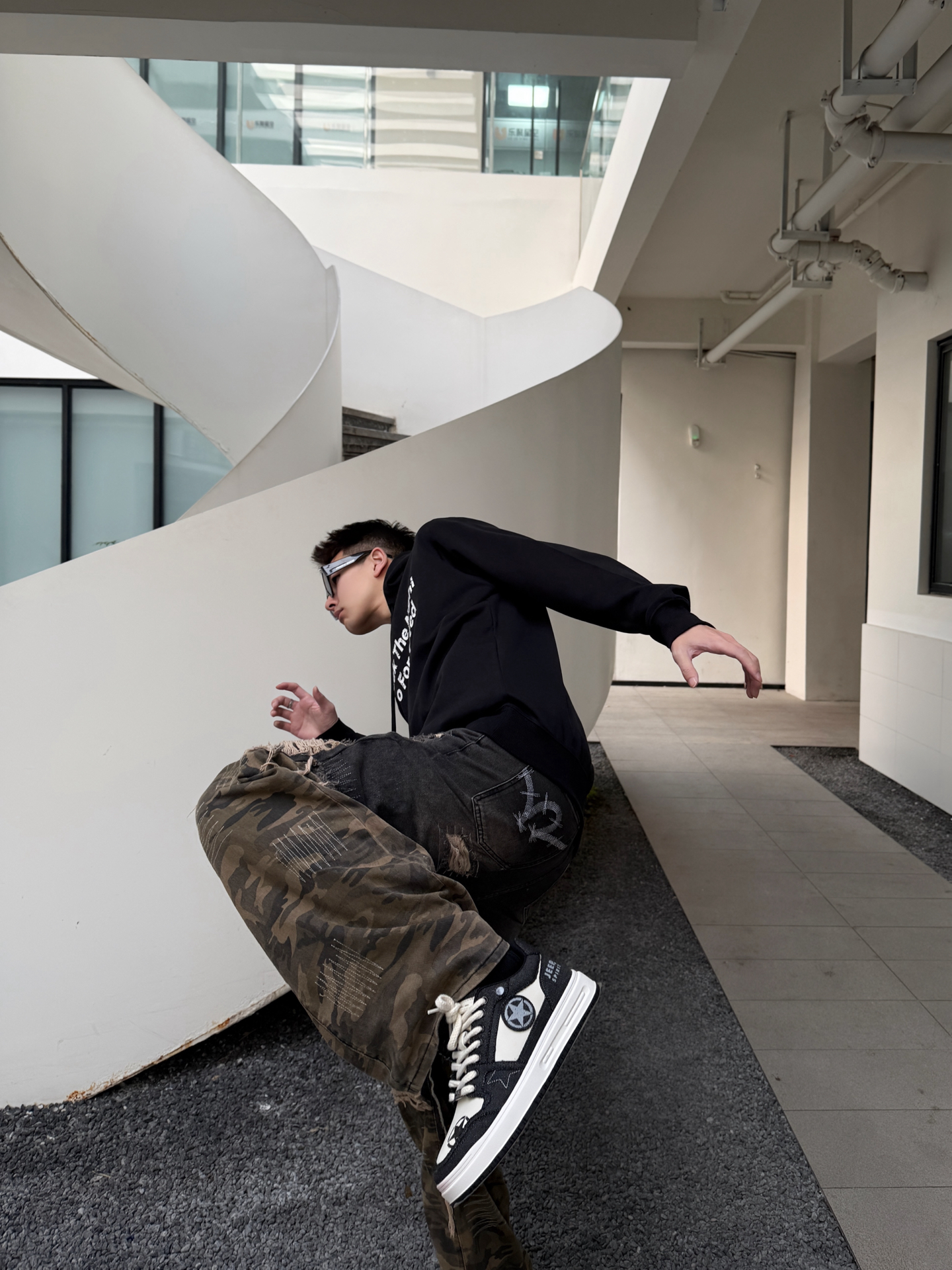JEEP SPIRIT黑白板鞋:给字母黑卫衣迷彩裤焊上街头酷感 字母印花黑卫衣自带美式街头的随性,简约的白字印花打破纯黑单调,宽松的连帽版型藏着慵懒的少年气;搭JEEP SPIRIT黑白板鞋时,黑白拼色鞋身与卫衣的配色呼应,星标装饰添了复古潮味,厚底版型适配破洞迷彩裤,让迷彩的粗犷与板鞋的利落撞出硬核街头风,不用复杂搭配,一双鞋就让整体造型的酷感拉满。 黑卫衣配迷彩裤的经典组合,靠一双JEEP...
