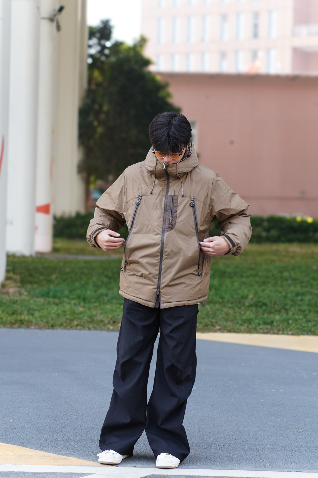 日系复古慵懒风弯刀工装裤,宽松剪裁勾勒随性线条,弯刀裤脚洒脱飘逸,复古色调沉淀时光质感,慵懒中透出不经意的时尚态度。