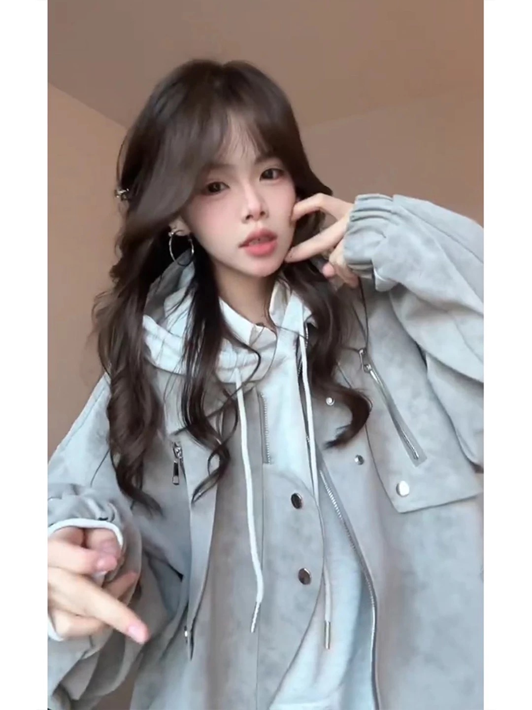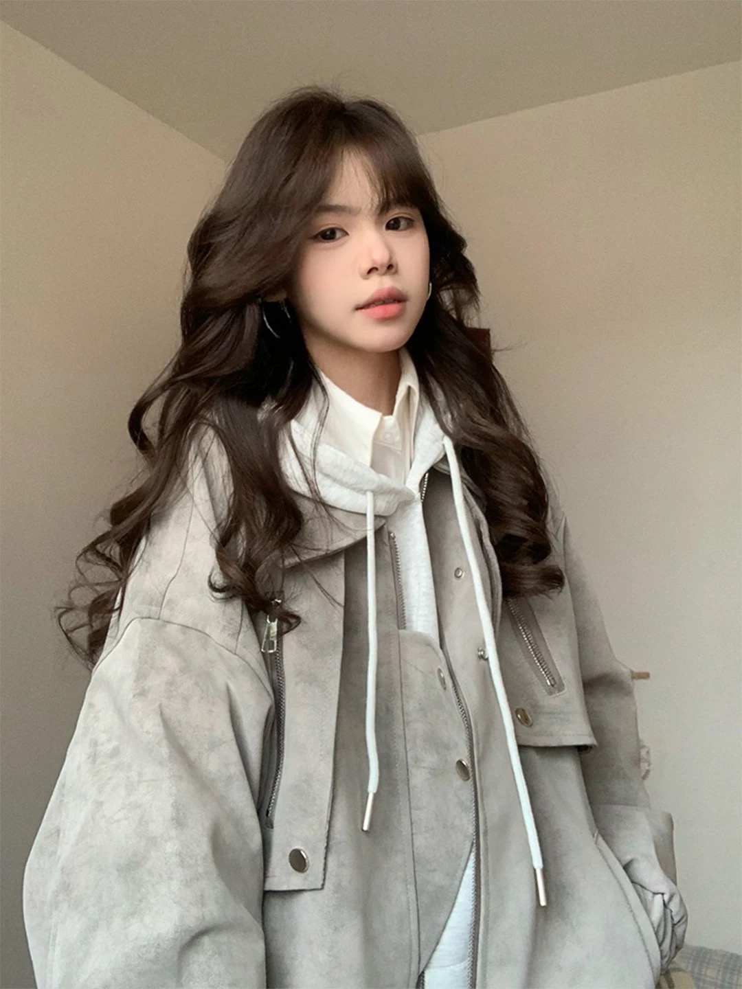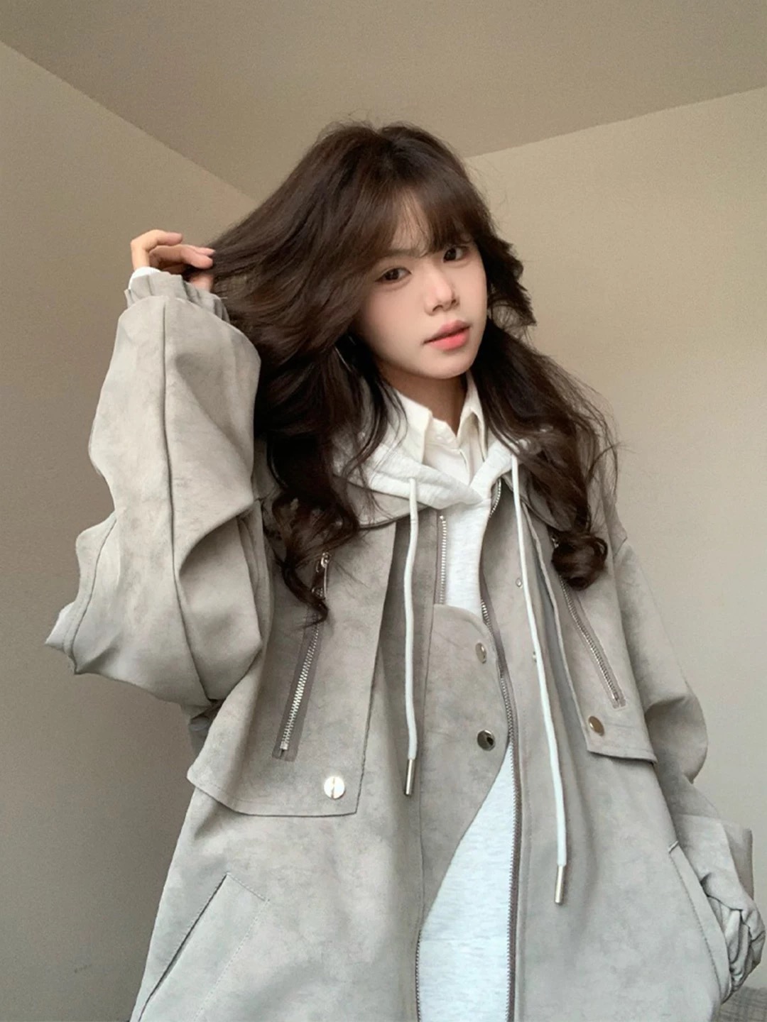 周末逛街时偶然看到这件外套,一试穿就被惊艳到了~柔和的浅灰色调,质感满满的麂皮面料,穿在身上瞬间提升气质✨ 外套的版型超棒,宽松的设计超显瘦,不管是搭配连帽衫还是衬衫都很出彩~细节处的拉链和纽扣设计,精致又别致,让整体造型更有层次感啦😎 穿上它出门,回头率真的超高~不管是通勤还是约会,都能轻松hold住,是那种让人一眼就心动的穿搭单品呀~