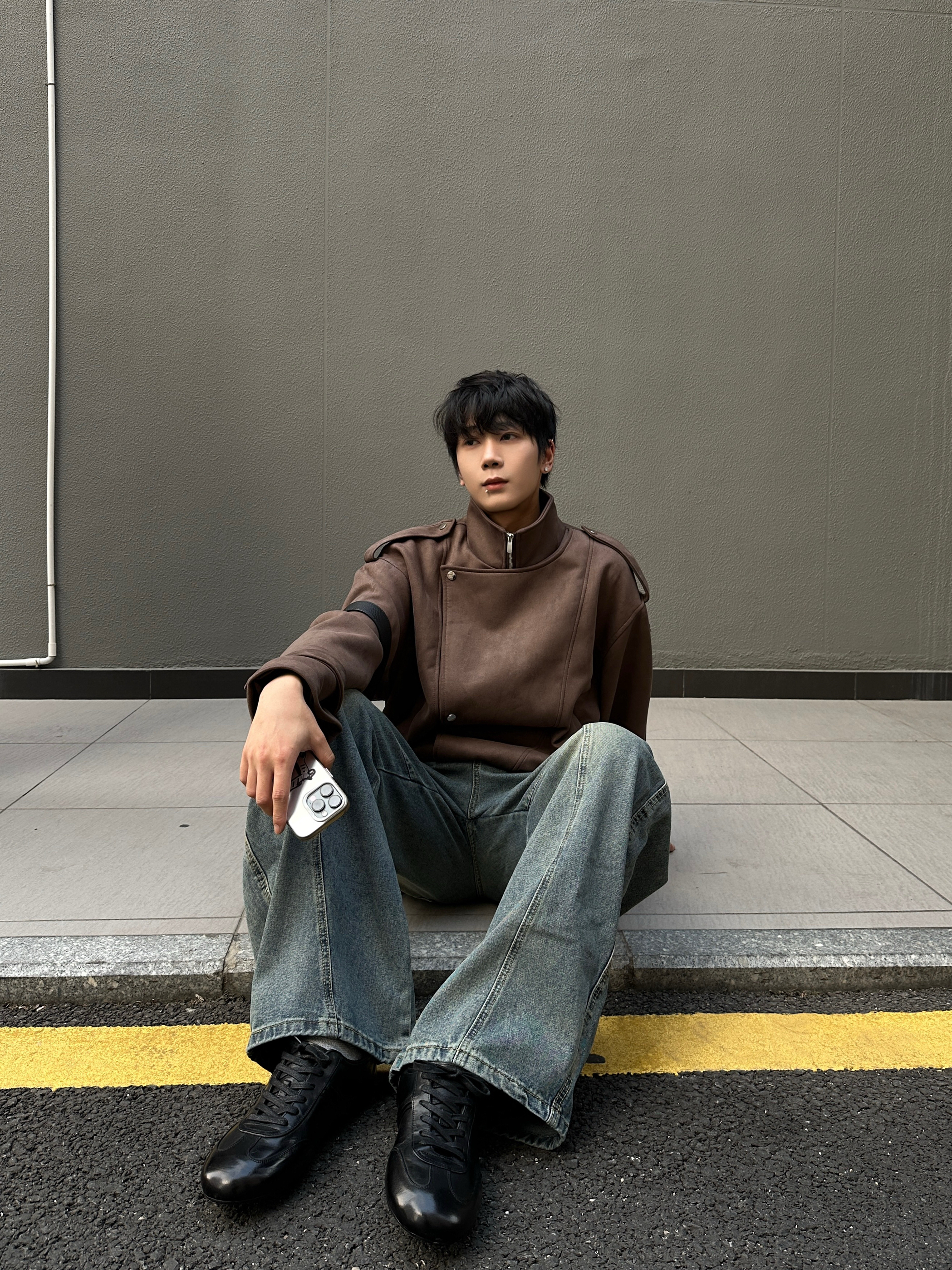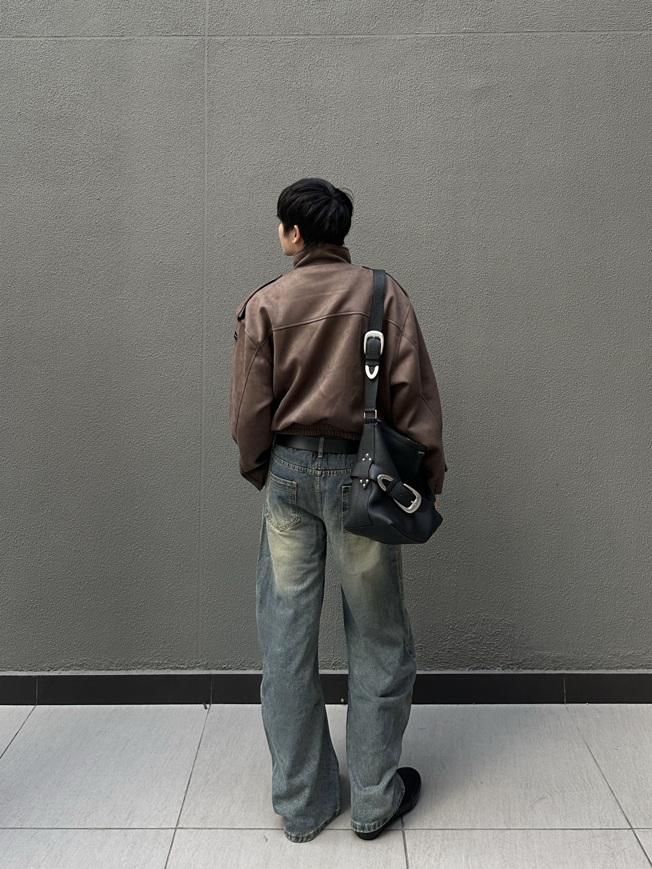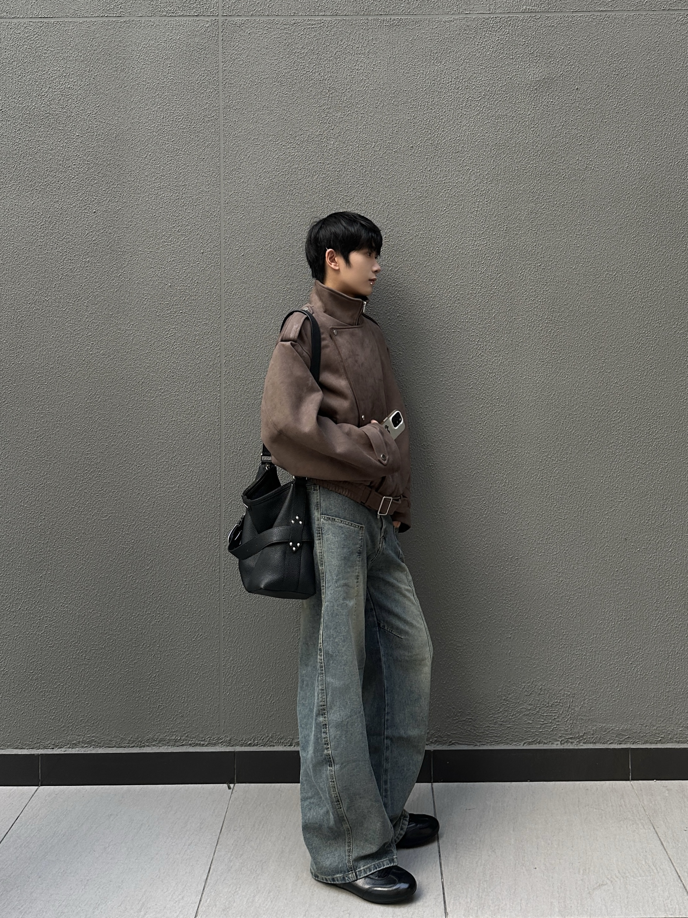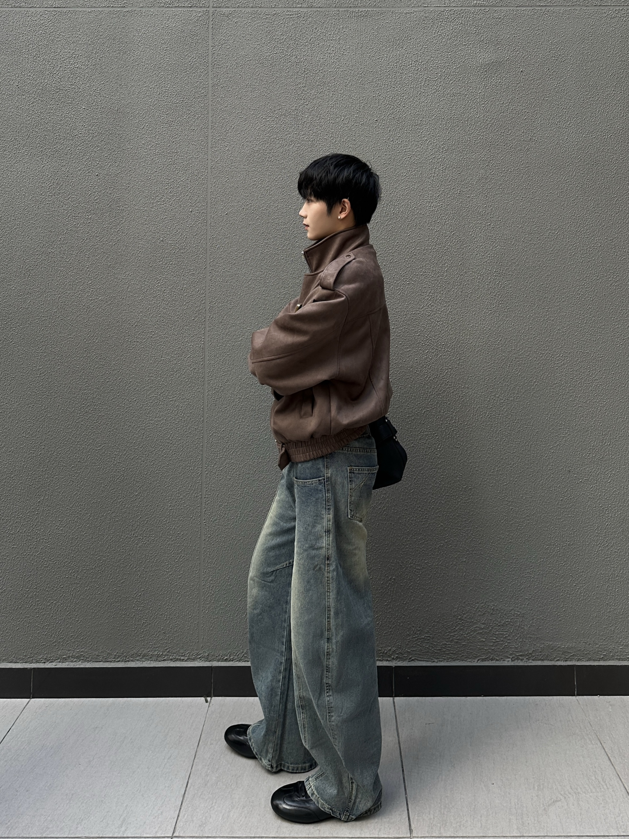 上衣是美式复古PU皮夹克 往身上一套就有街头那味儿了 宽松的版型不仅藏肉还显气场 搭做旧拼接口袋渐变牛仔裤 复古蓝调中和皮衣的厚重感 弯刀的版型还能藏住腿型小缺点 鞋子是马皮的黑色德训鞋 日常出街非常百搭 整套穿下来痞帅复古感拉满 出门溜达回头率直接爆棚!