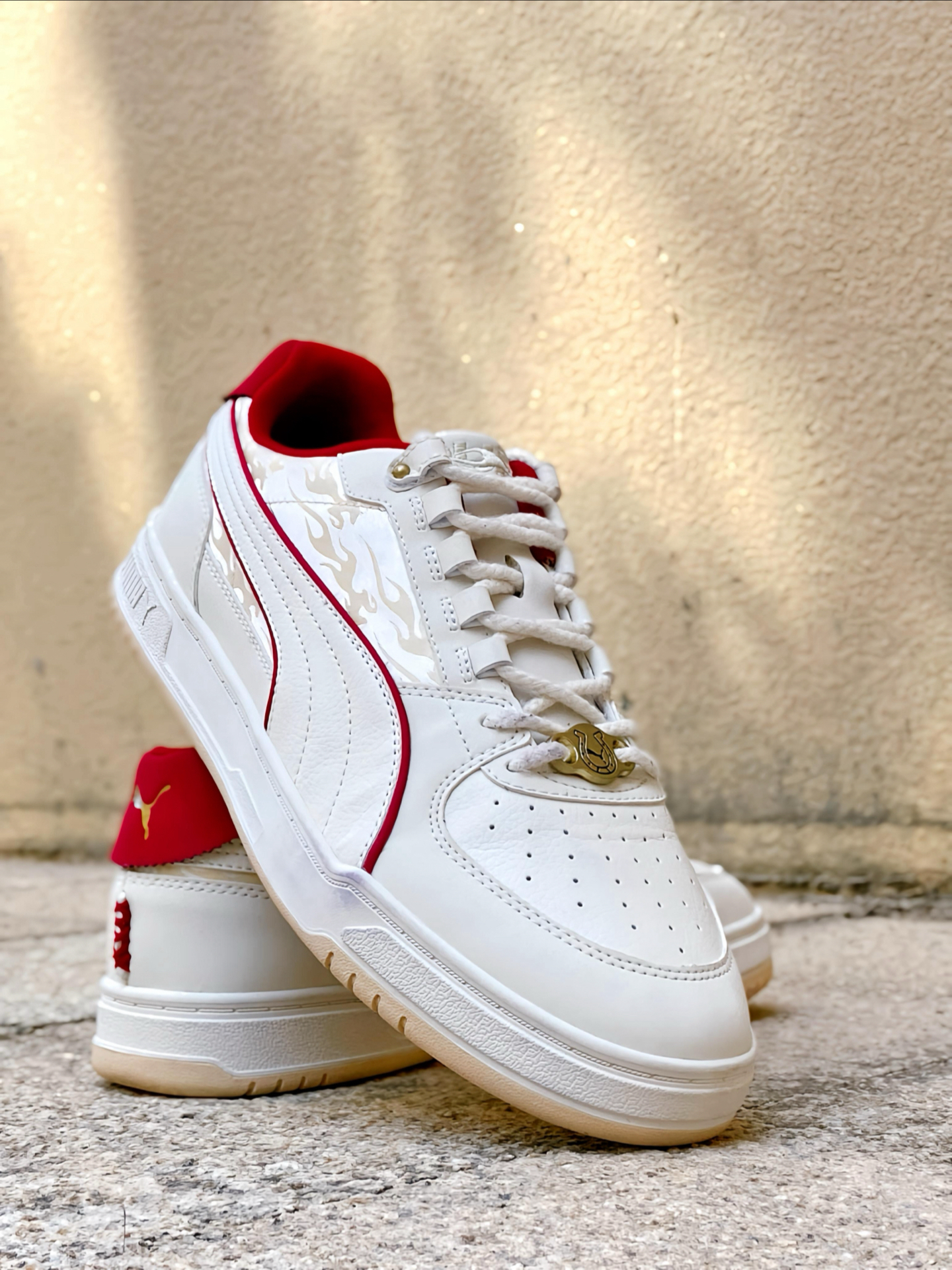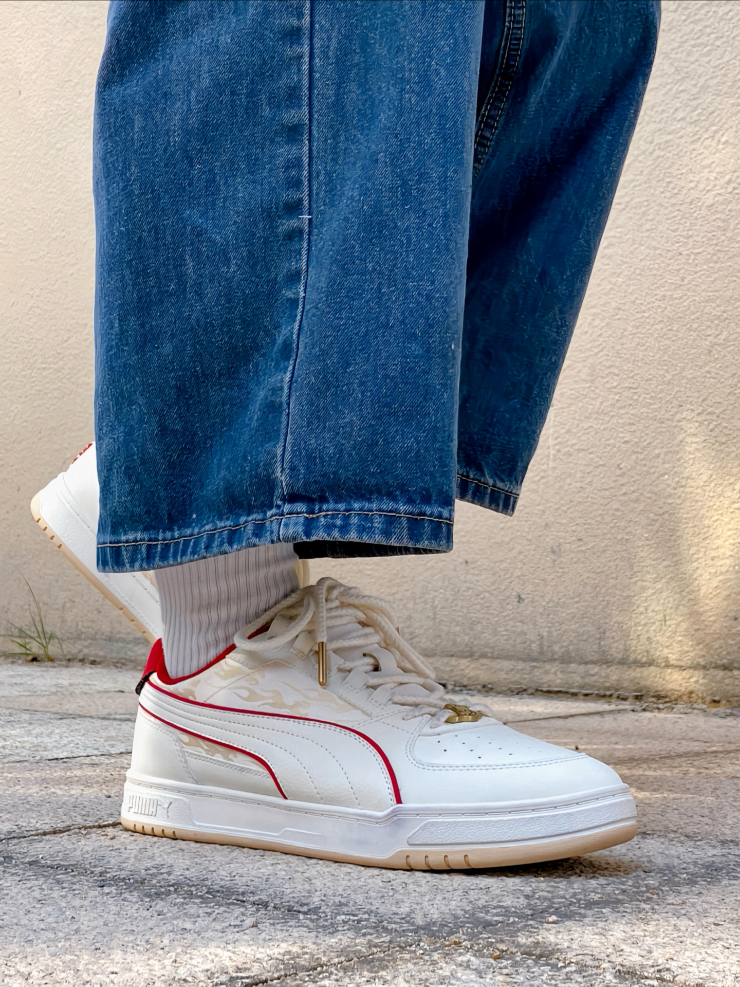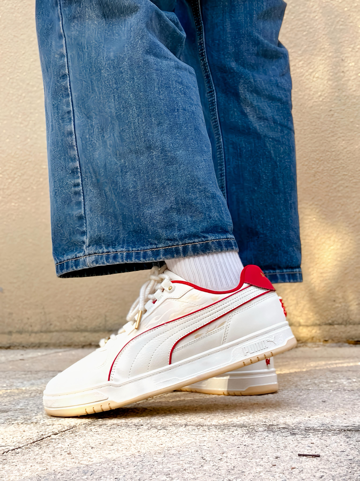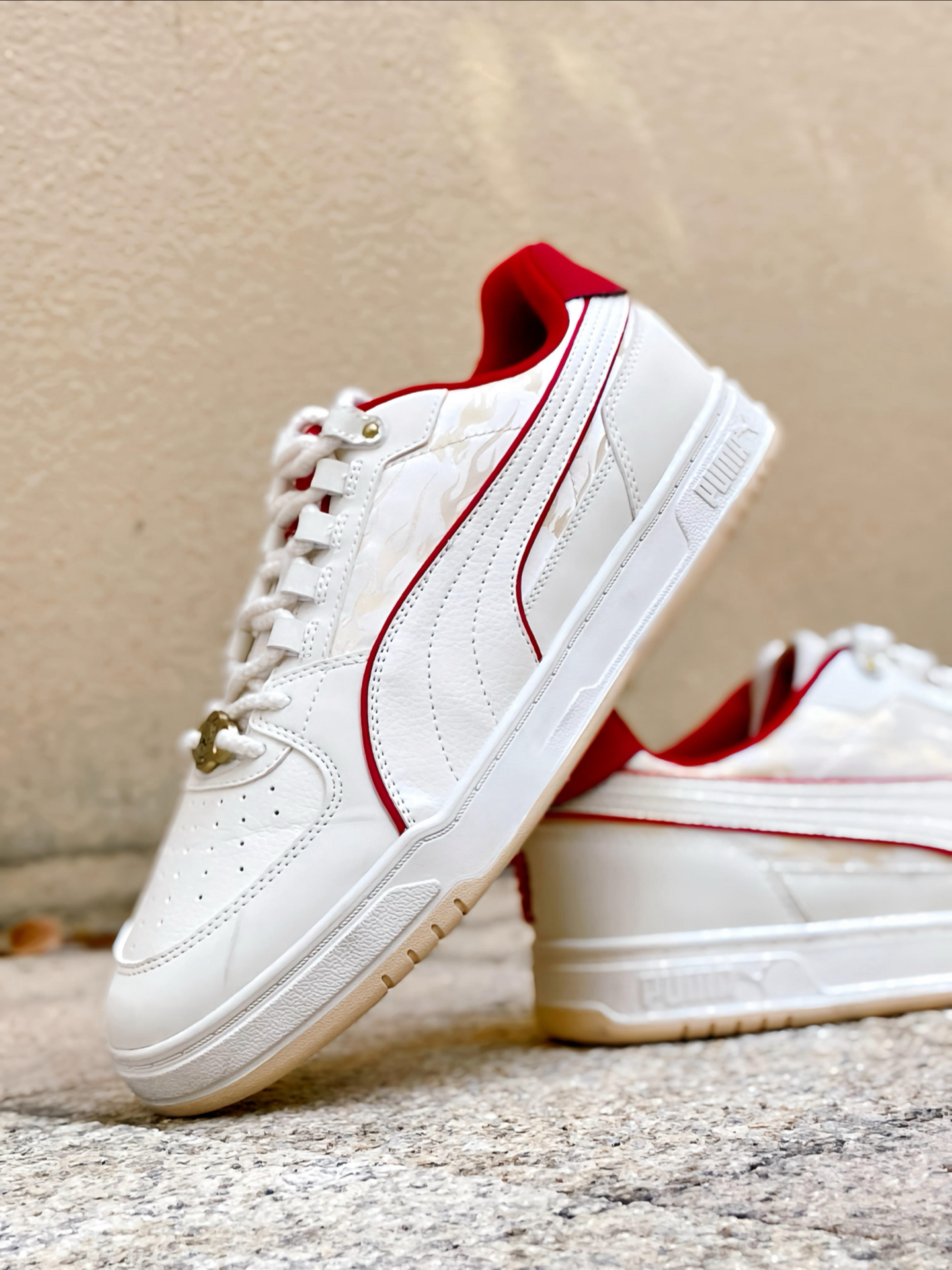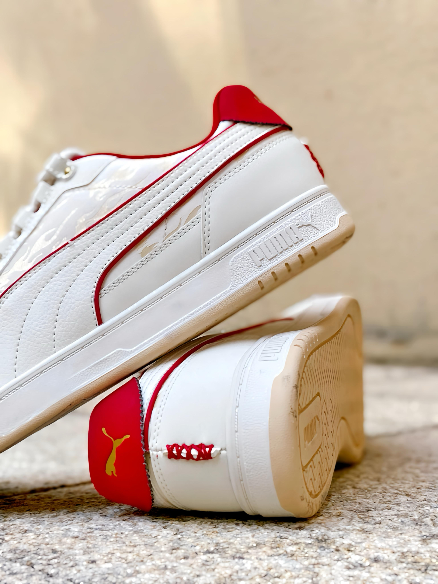 刚拿到这双 #PUMA Caven 3.0 马年配色时,我就觉得这白红的设计太合我心意了!白色鞋身干净清爽,鞋侧和后跟那几道红色线条点缀,喜庆又不张扬。特别喜欢鞋头那个带马蹄图案的金色鞋扣,细节感拉满,过年穿寓意也很好。 个人感觉这双板鞋真的挺好搭的,我日常穿牛仔裤、休闲裤都能配,白底色不挑衣服,红色点缀又让造型不单调。上脚也蛮舒服的,复古板鞋的版型不压脚,过年走亲访友或者平常通勤出街穿都很合...