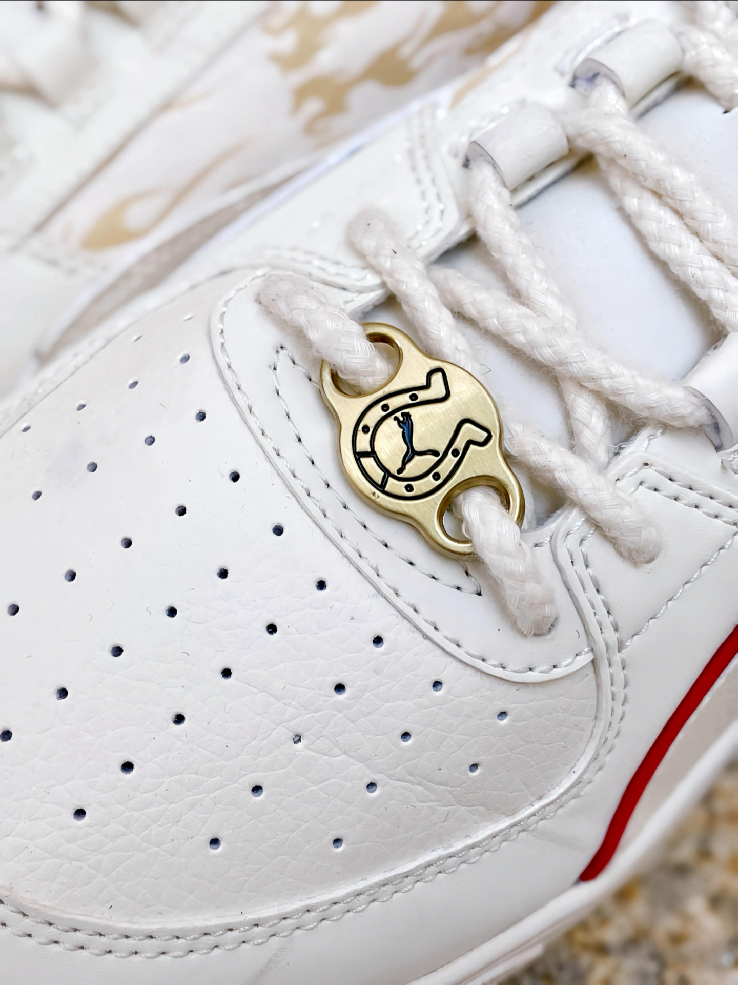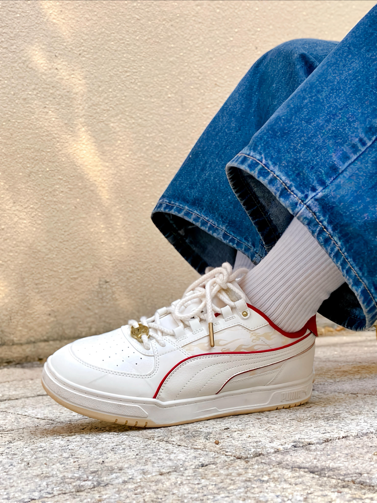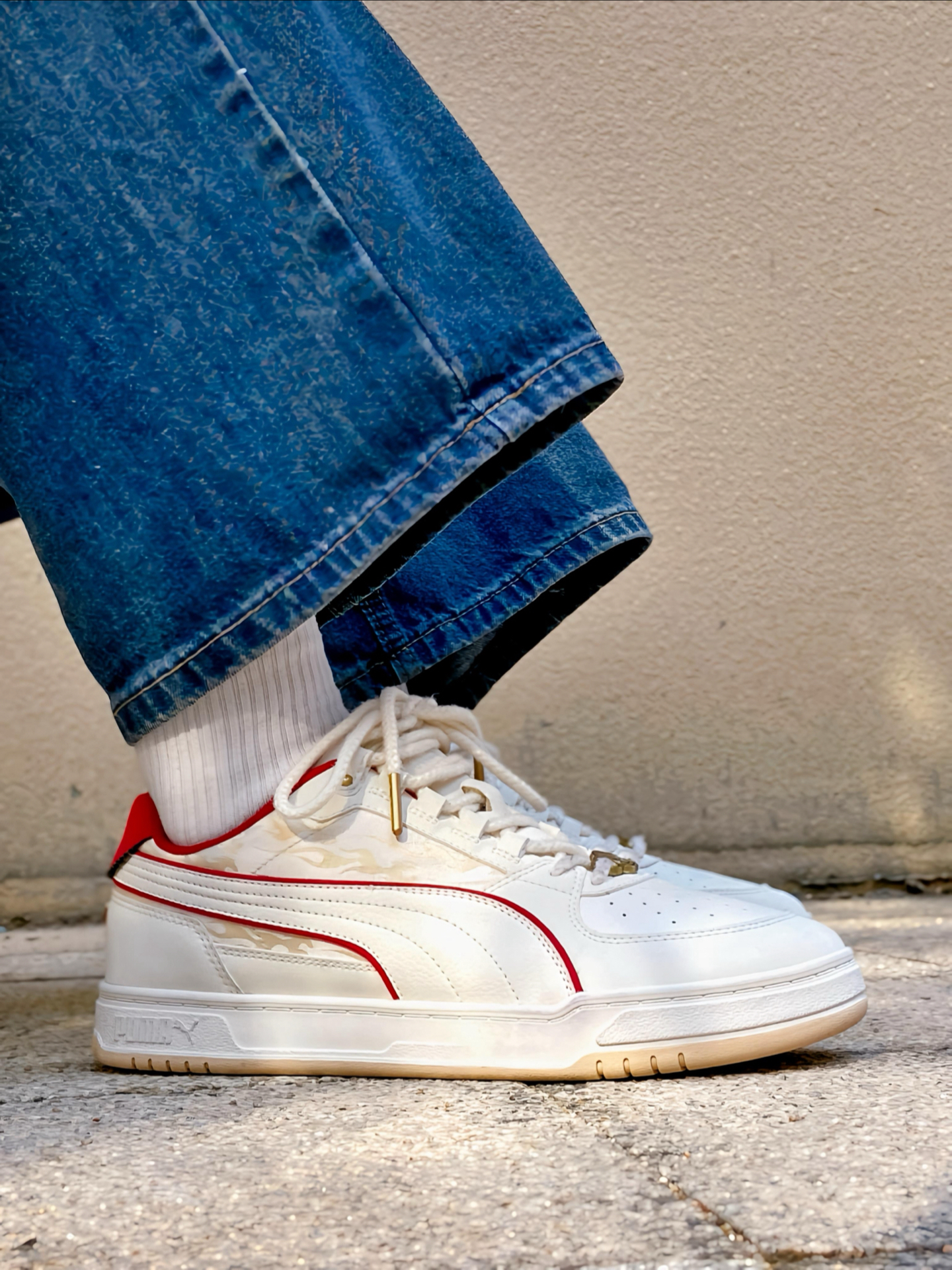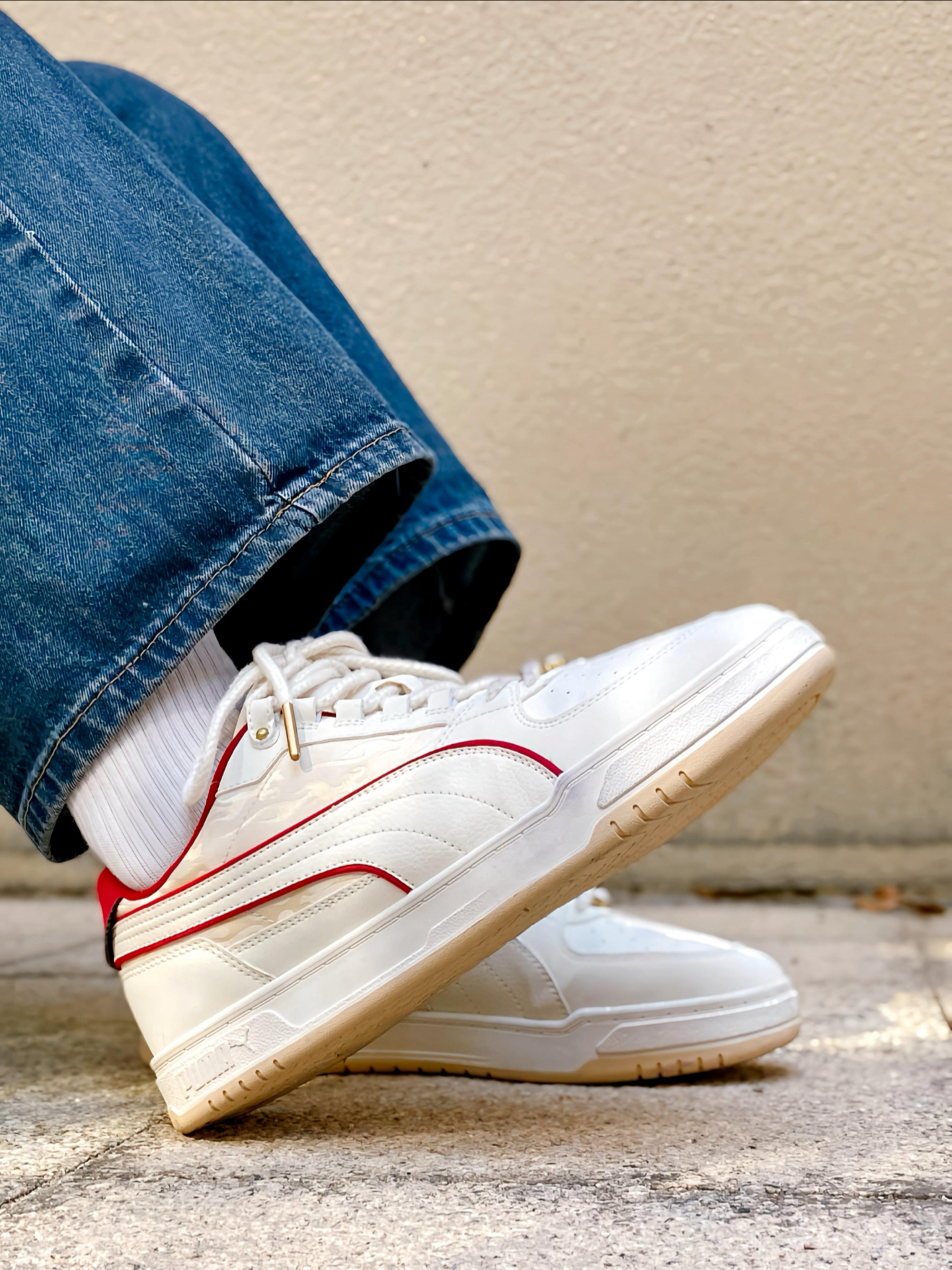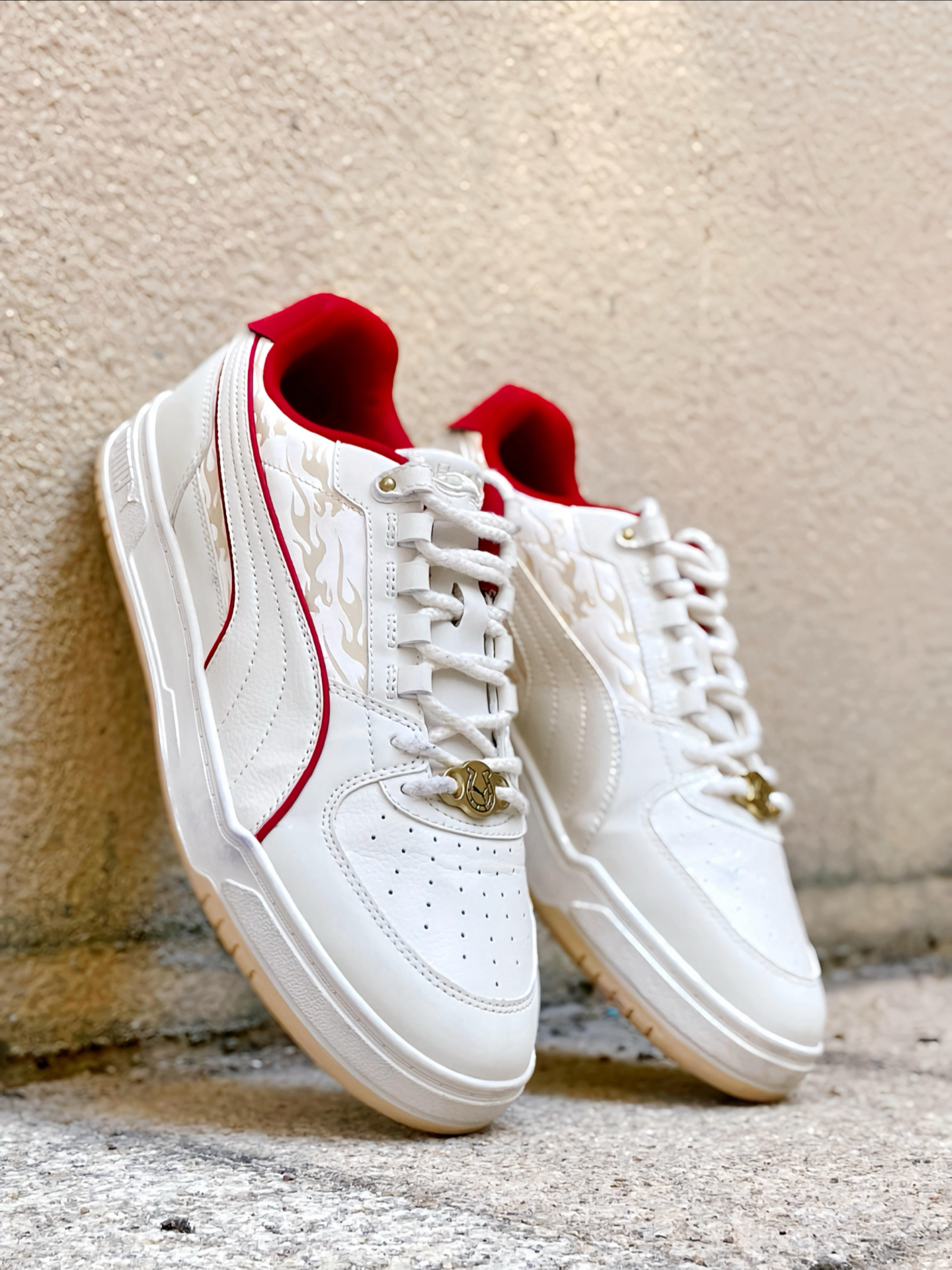 刚拿到这双 #PUMA Caven 3.0 马年配色时,我就觉得这白红的设计太合我心意了!白色鞋身干净清爽,鞋侧和后跟那几道红色线条点缀,喜庆又不张扬。特别喜欢鞋头那个带马蹄图案的金色鞋扣,细节感拉满,过年穿寓意也很好。 个人感觉这双板鞋真的挺好搭的,我日常穿牛仔裤、休闲裤都能配,白底色不挑衣服,红色点缀又让造型不单调。上脚也蛮舒服的,复古板鞋的版型不压脚,过年走亲访友或者平常通勤出街穿都很合...