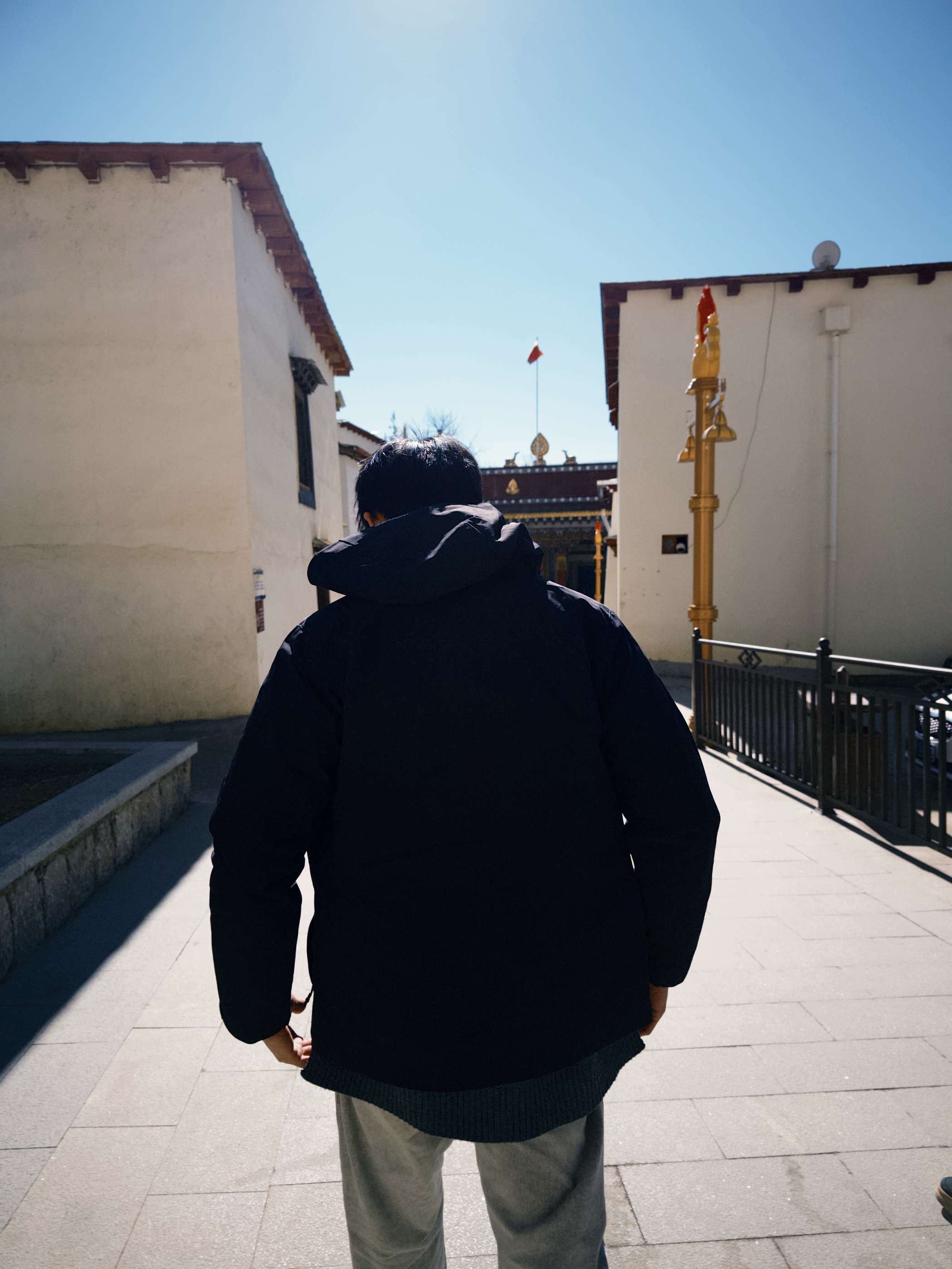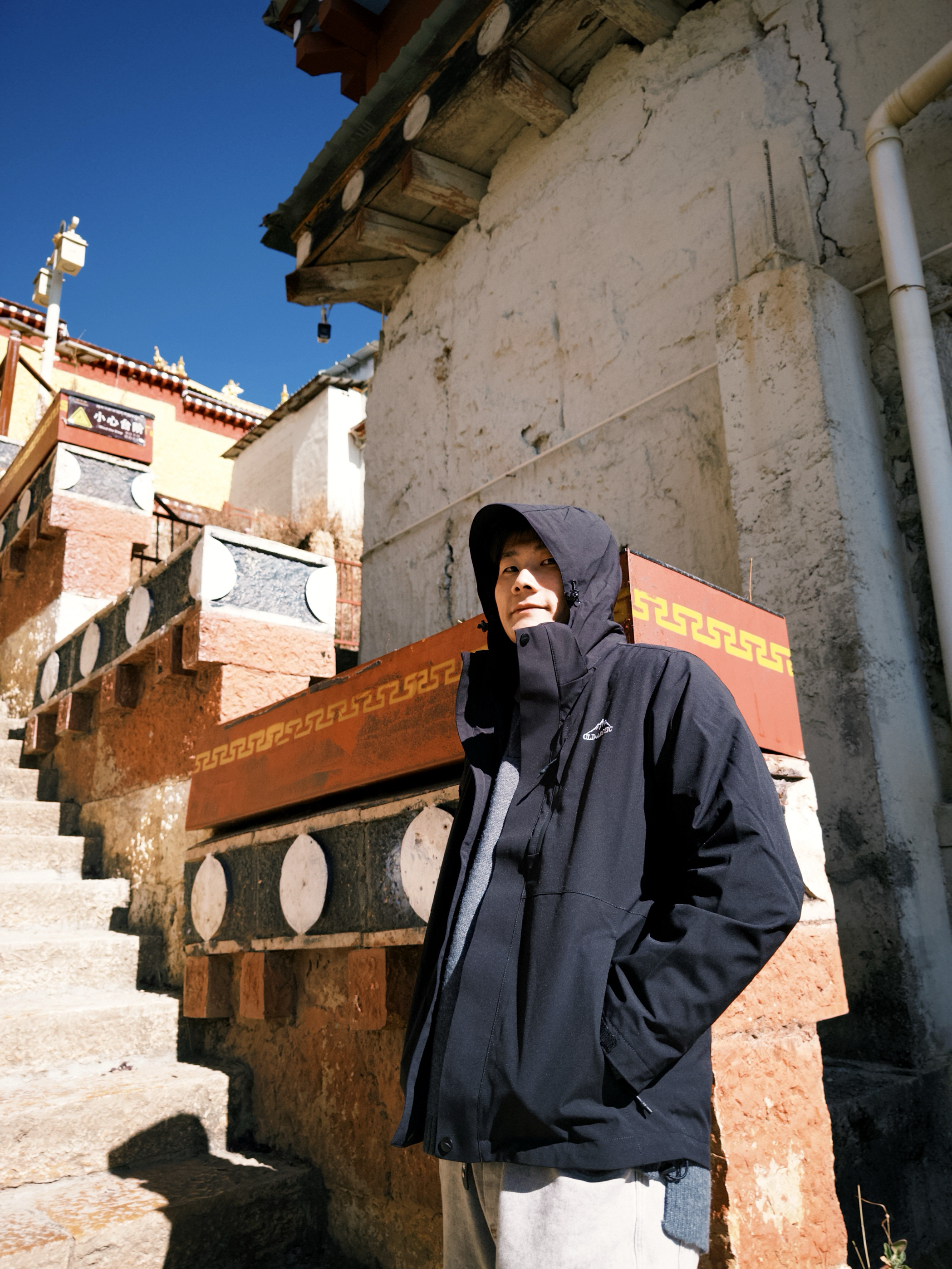 在藏式寺庙群观景台穿这件雪中飞的三合一羽绒服,专业度直接拉满! 90%鹅绒600+蓬的填充轻量又保暖,黑色和藏式金红建筑、湛蓝天空形成沉稳撞色,随手拍都有户外专业风撞藏式人文的独特氛围感。可拆卸摇粒绒内胆能灵活应对藏地温差,三防工艺挡住高海拔的冷风,宽松版型在观景台打卡、山地徒步都毫无束缚感。搭条浅灰休闲裤,简约更凸显户外机能细节~