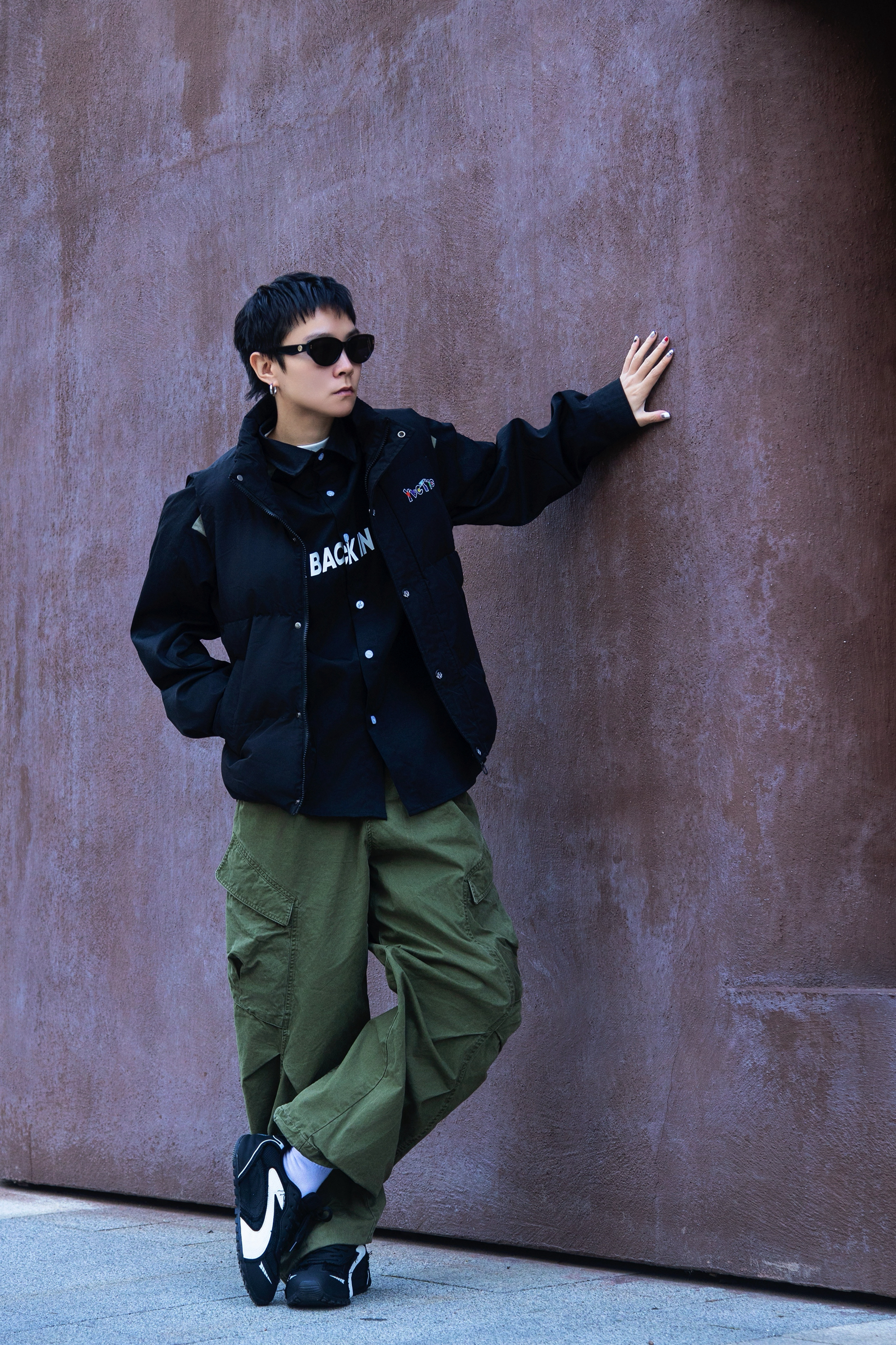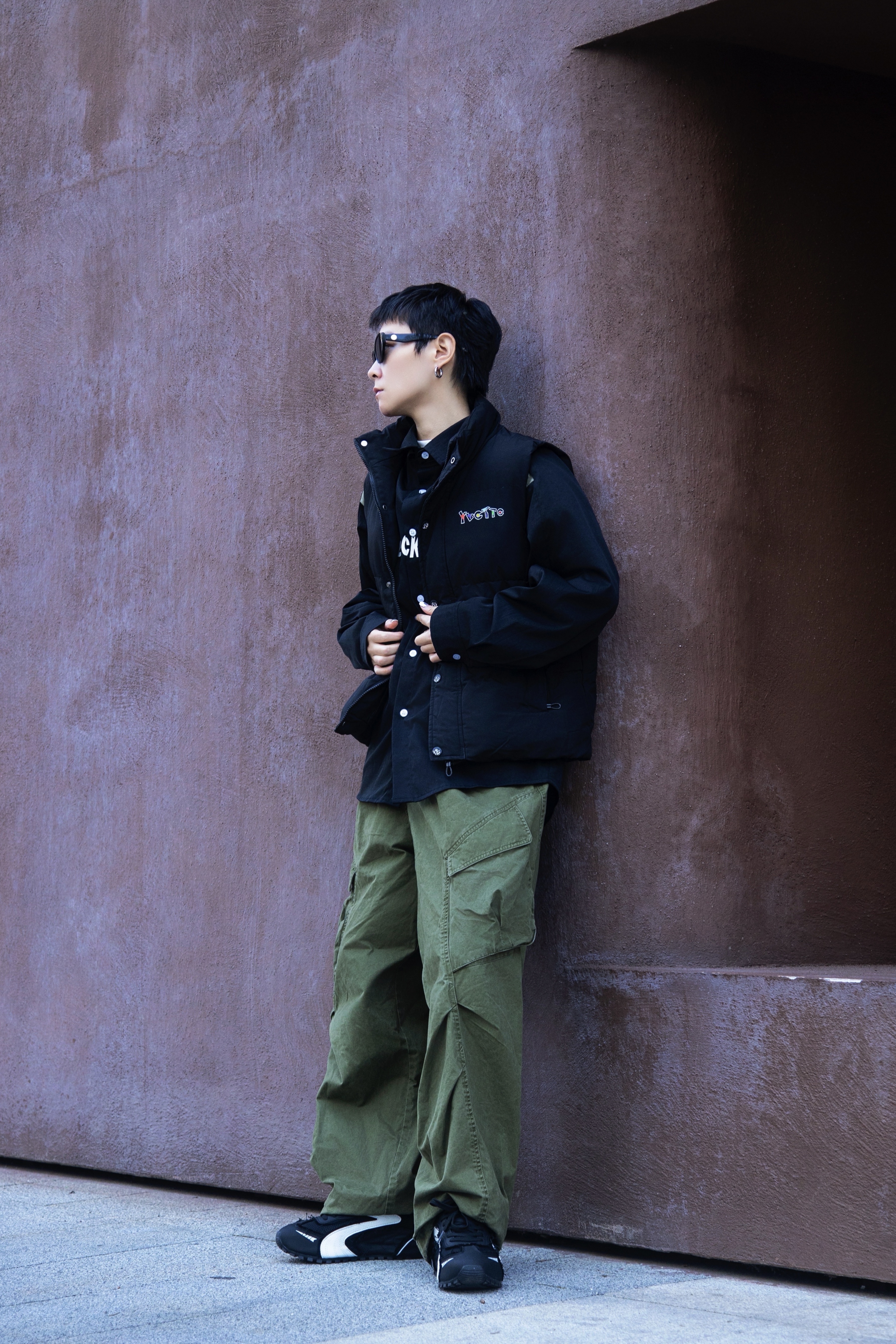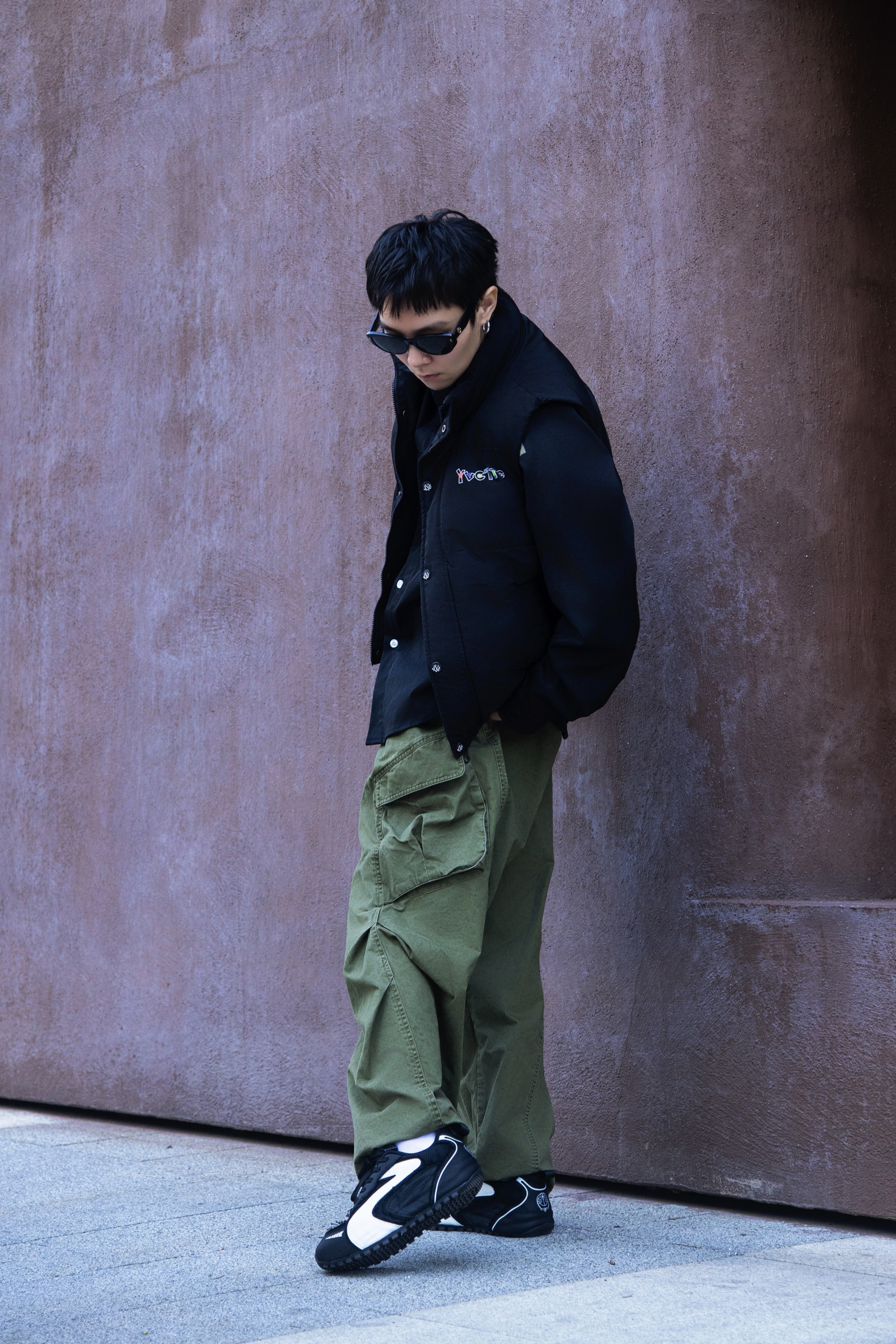 冬天除了羽绒服还能穿什么? 时髦精不能没有羽绒马甲 穿搭指南: 上身一件白色德绒打底 套一件黑色插肩袖衬衫 黑绿拼接加字母logo 街头感十足 再搭一件黑色羽绒马甲 冬天就要叠穿出层次 配一条军绿色工装休闲裤 上脚哆啦A梦黑色休闲鞋 薄底赛车鞋型真的泰酷啦 整套带点赛车风的工装穿搭拿捏