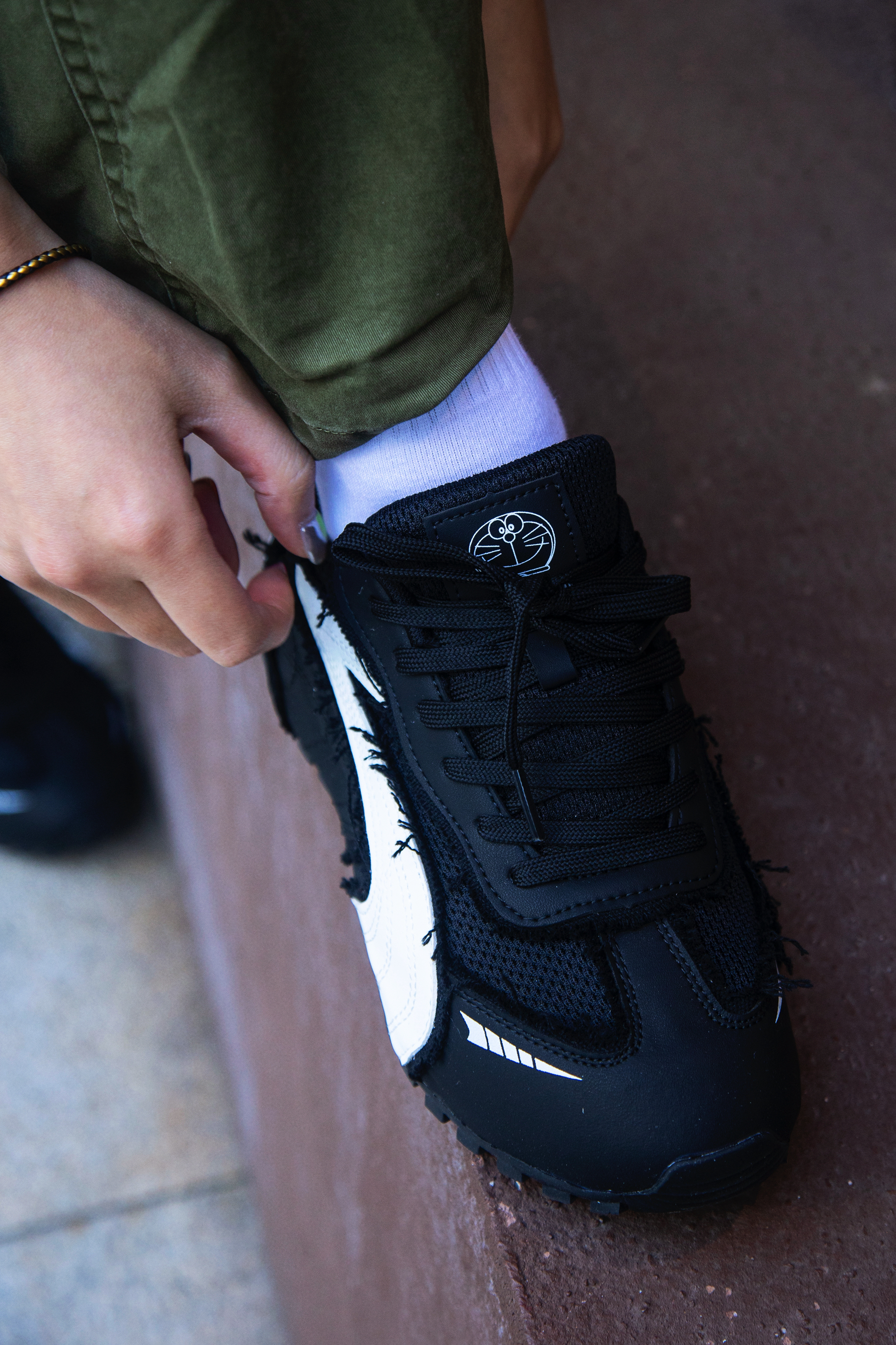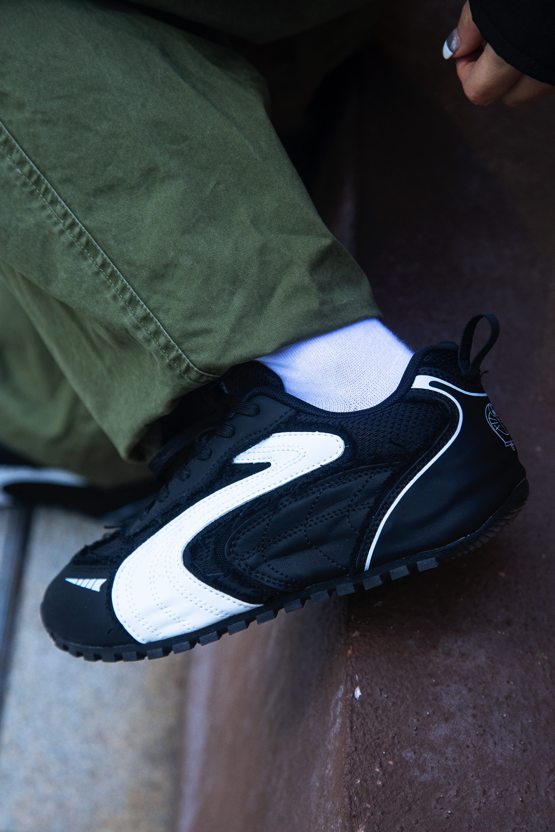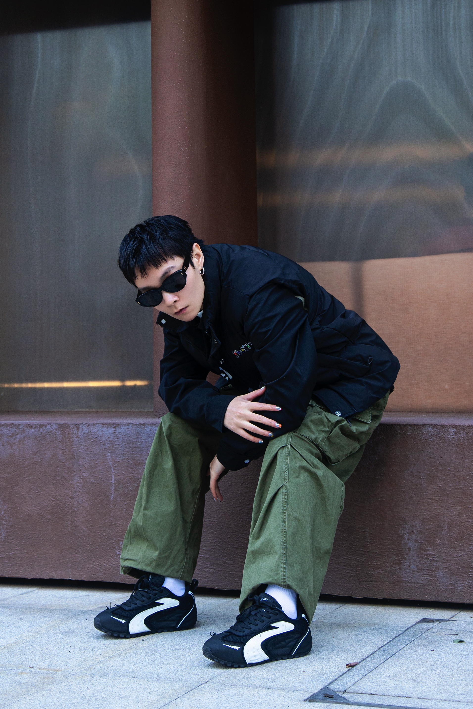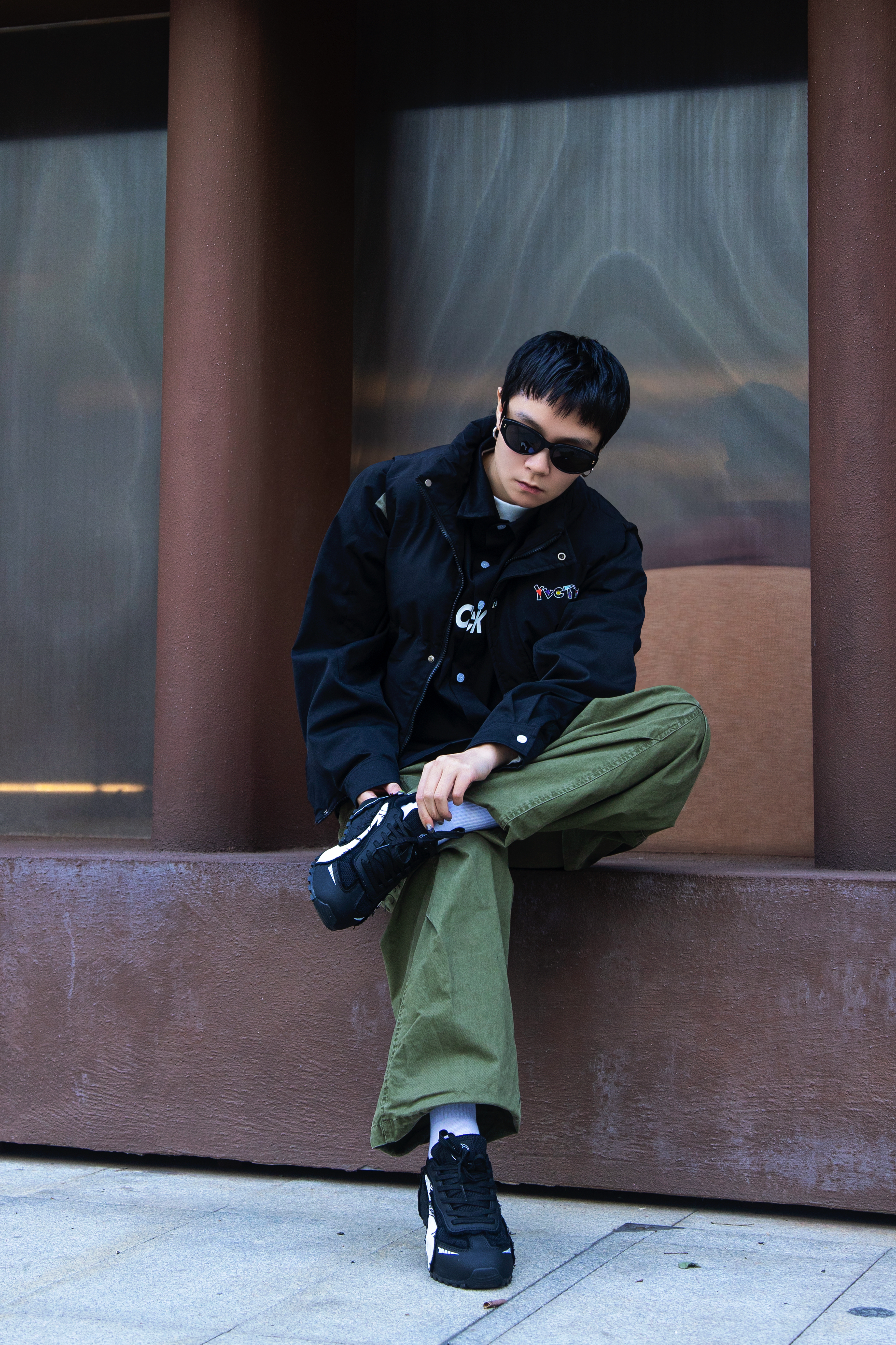 冬天除了羽绒服还能穿什么? 时髦精不能没有羽绒马甲 穿搭指南: 上身一件白色德绒打底 套一件黑色插肩袖衬衫 黑绿拼接加字母logo 街头感十足 再搭一件黑色羽绒马甲 冬天就要叠穿出层次 配一条军绿色工装休闲裤 上脚哆啦A梦黑色休闲鞋 薄底赛车鞋型真的泰酷啦 整套带点赛车风的工装穿搭拿捏