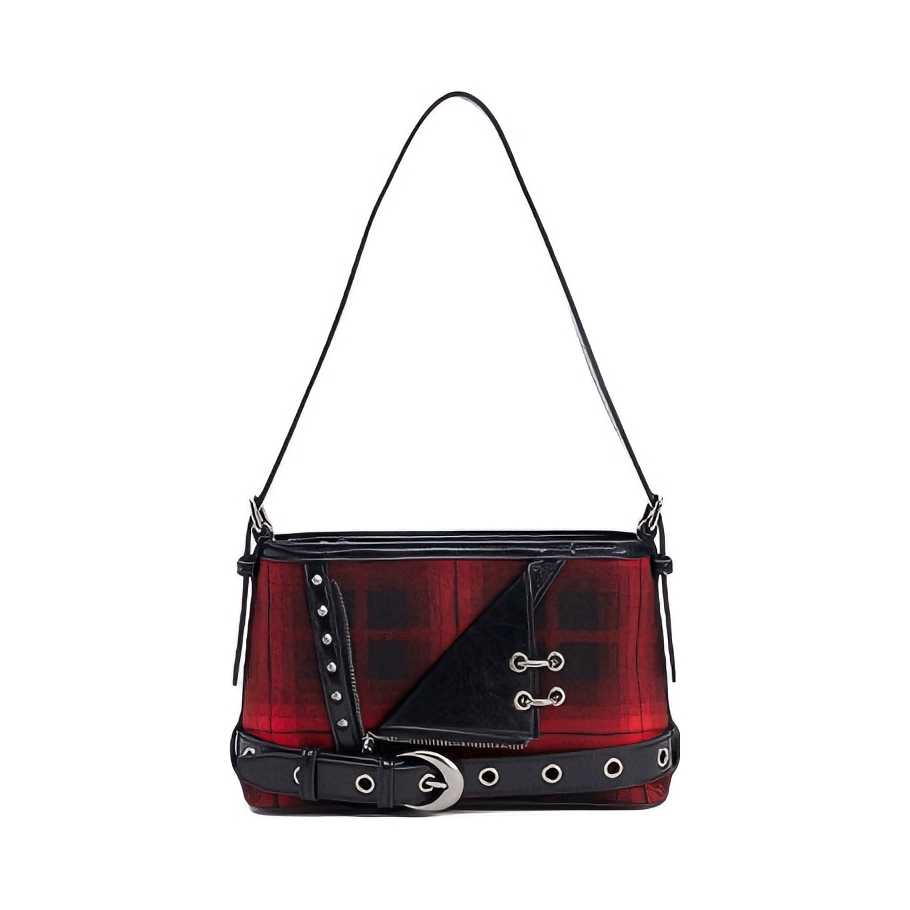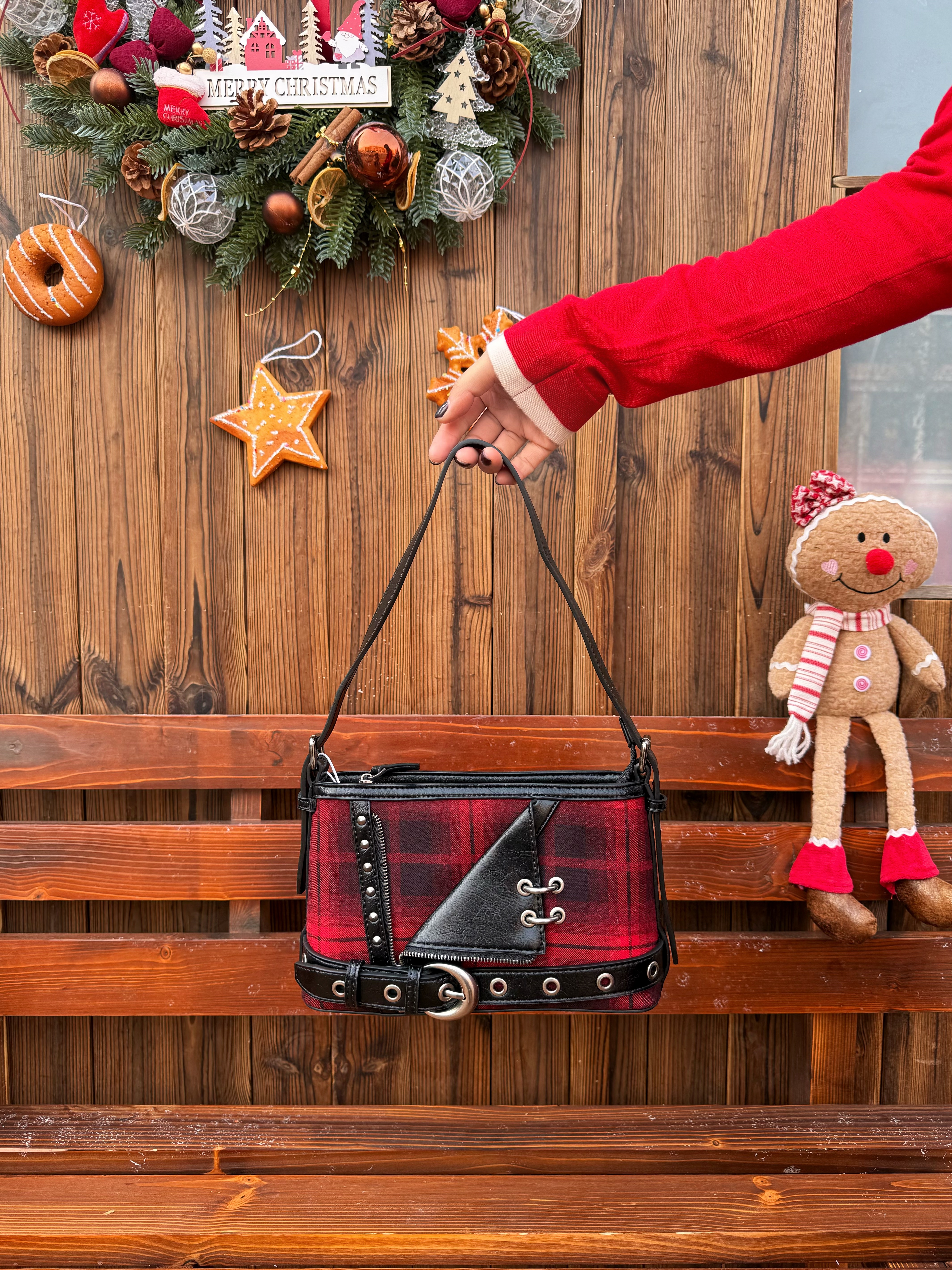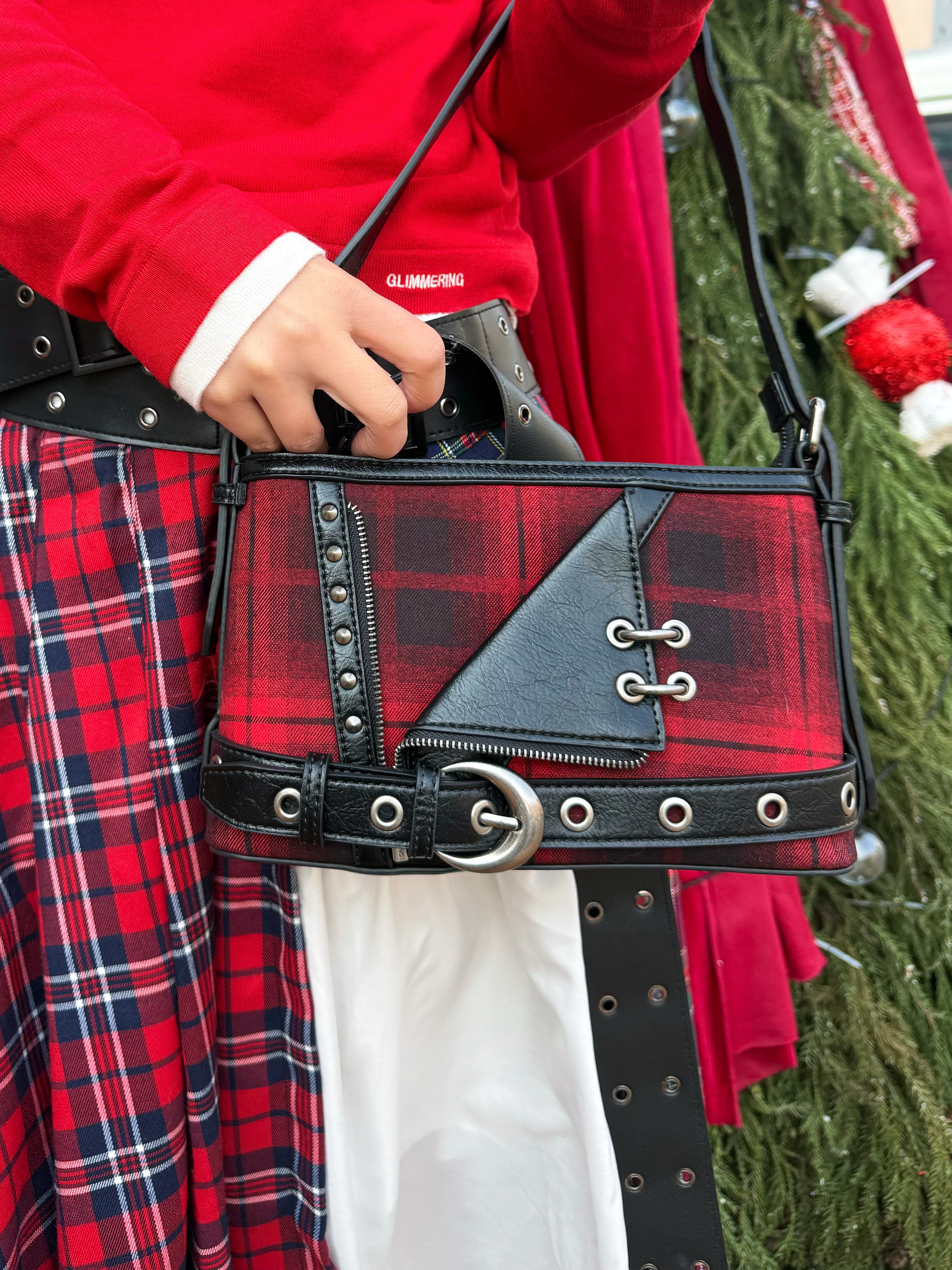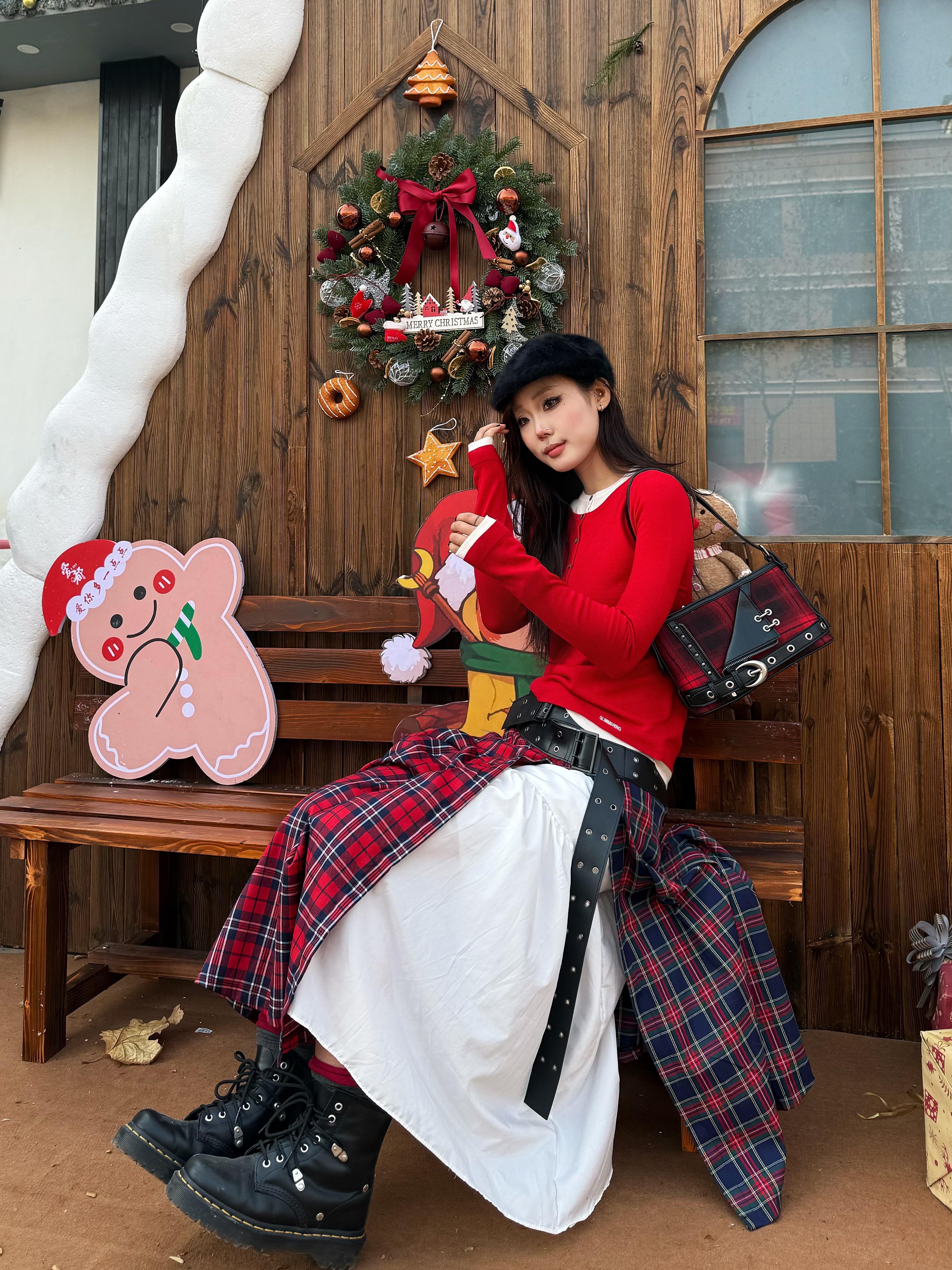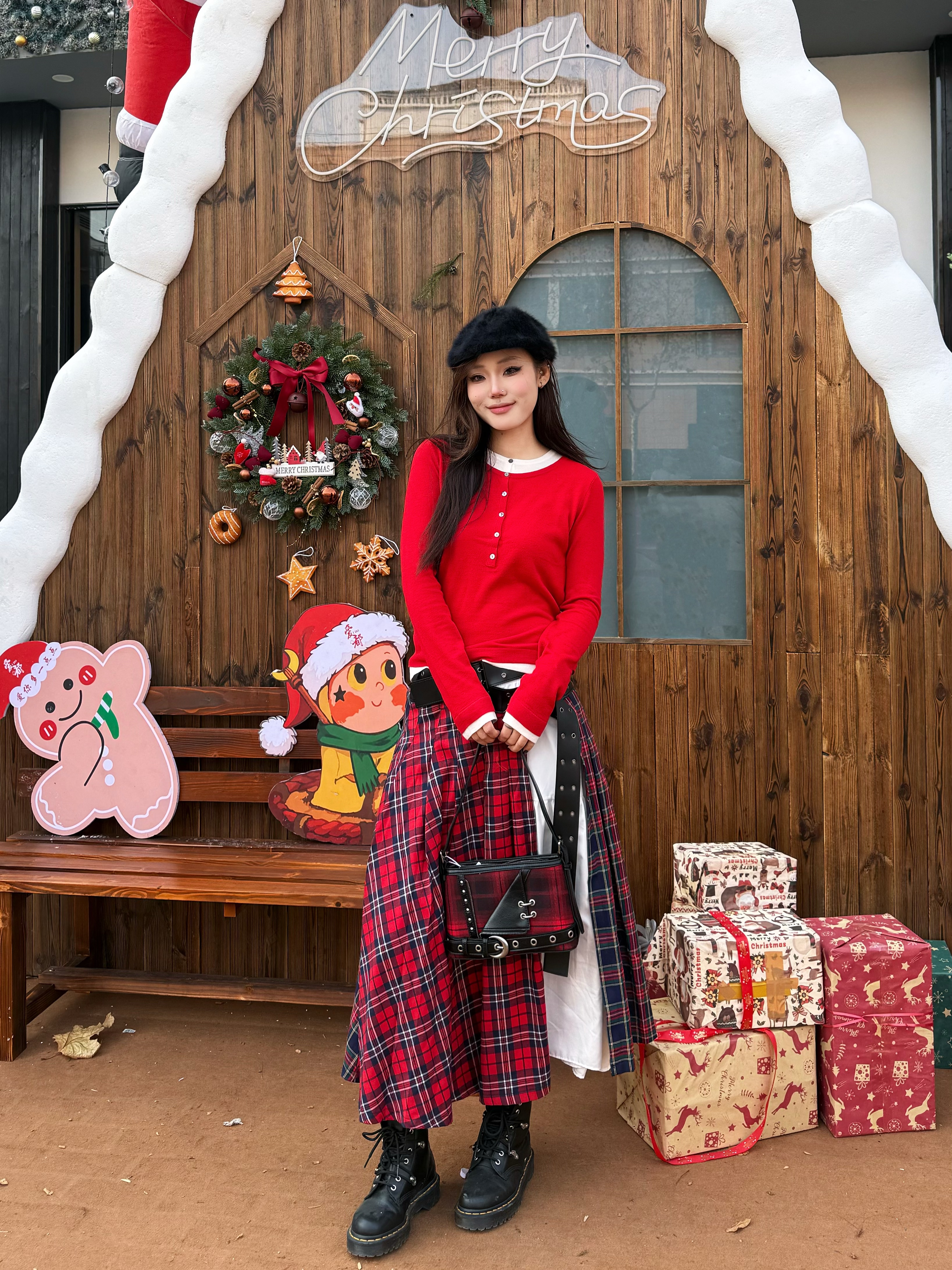 2026开局好东西? 看看UR这身穿搭 好出片! 红色撞色假两件针织衫自带节日感 搭配白色半裙和格纹屁帘层次感瞬间拉满 👜挎上黑红格纹腋下包戴上黑色贝雷帽 脚踩马丁靴甜酷平衡得刚好 站在圣诞树前拍照氛围感满满 发朋友圈要被夸麻了✨