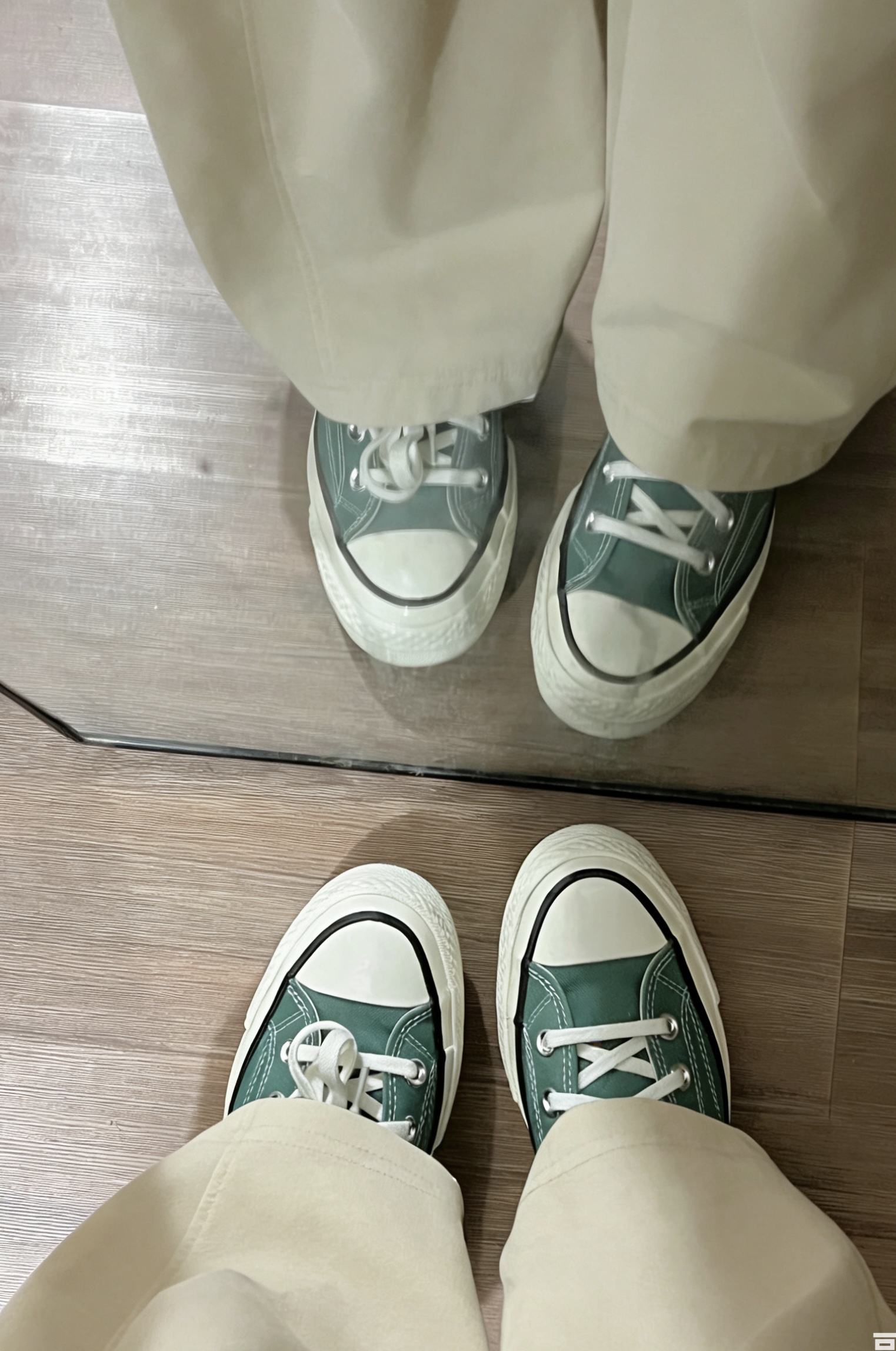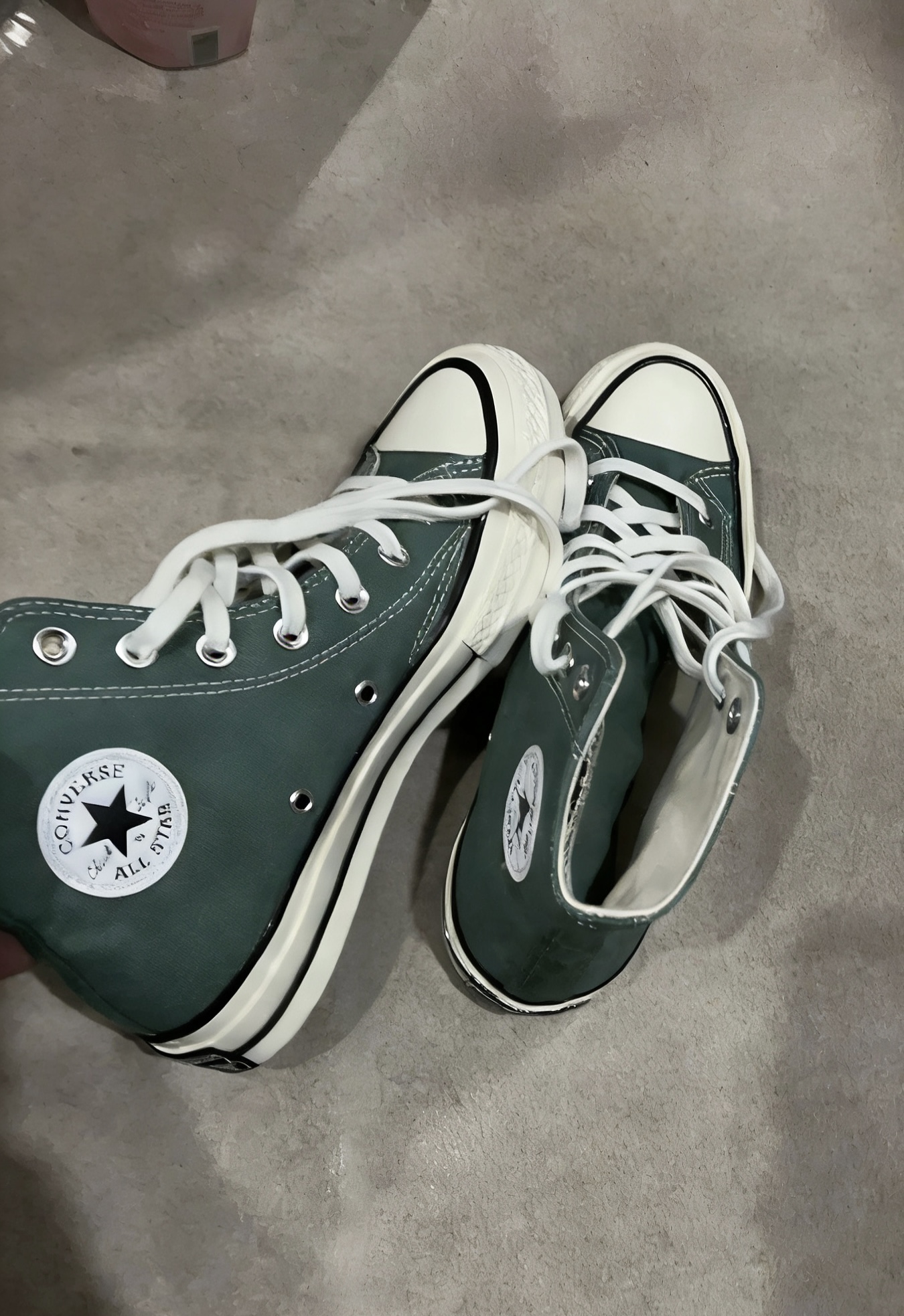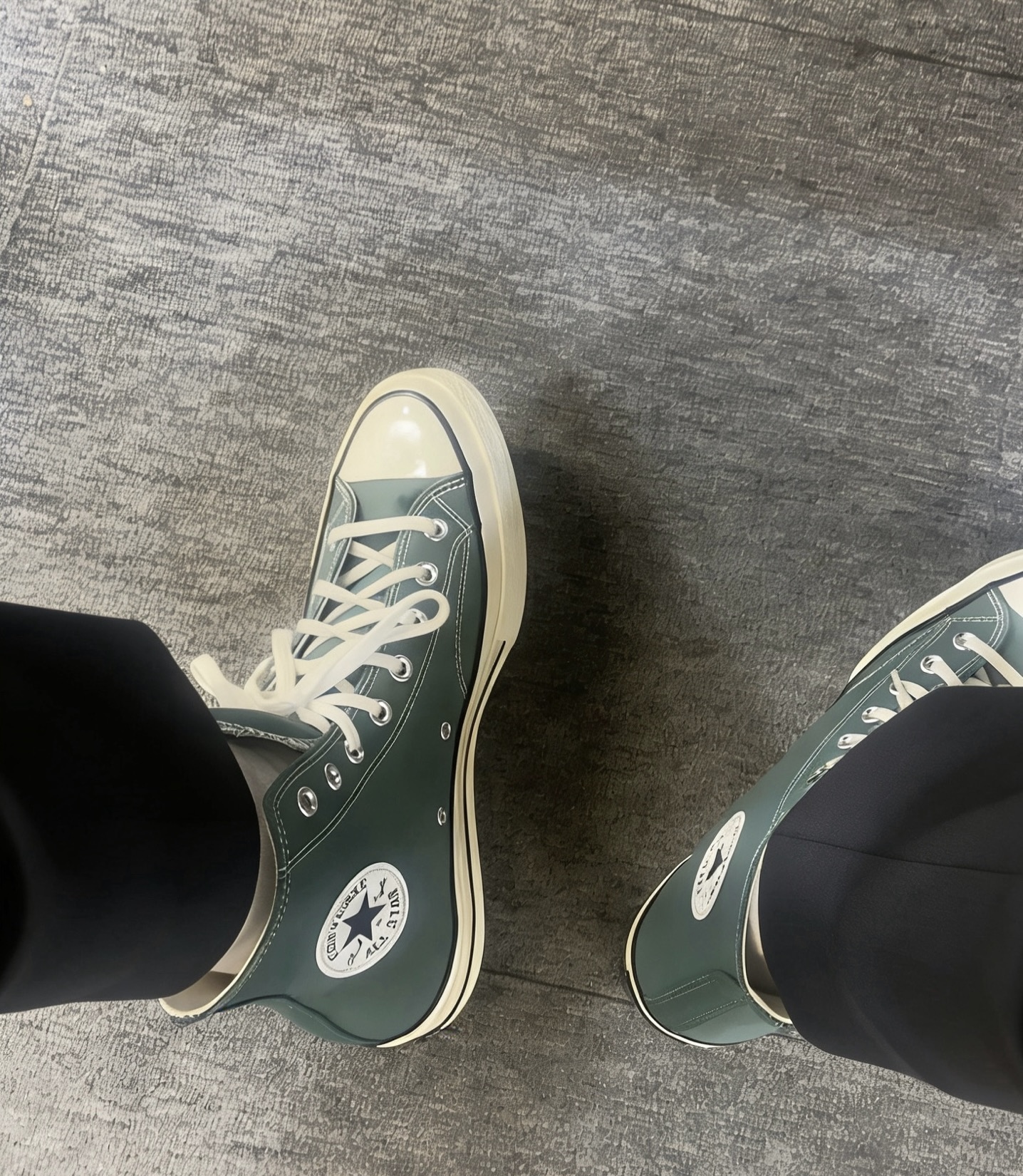 今日份OOTD的快乐是新鞋给的✨ 情侣鞋别再只买黑白了!这双墨绿高帮才是真·氛围感神器💚 匡威这双墨绿高帮真的太会了! 颜色是低饱和的森林绿,不挑穿搭还显白。 鞋边真的容易脏,脏了一定勤擦,不然后期不好清洗🧽 宽脚拍大或者慎入 经典款式,上配大衣、卫衣、牛仔外套都能搭,下配阔腿裤、工装裤都超搭,走路带风的复古感谁不爱!