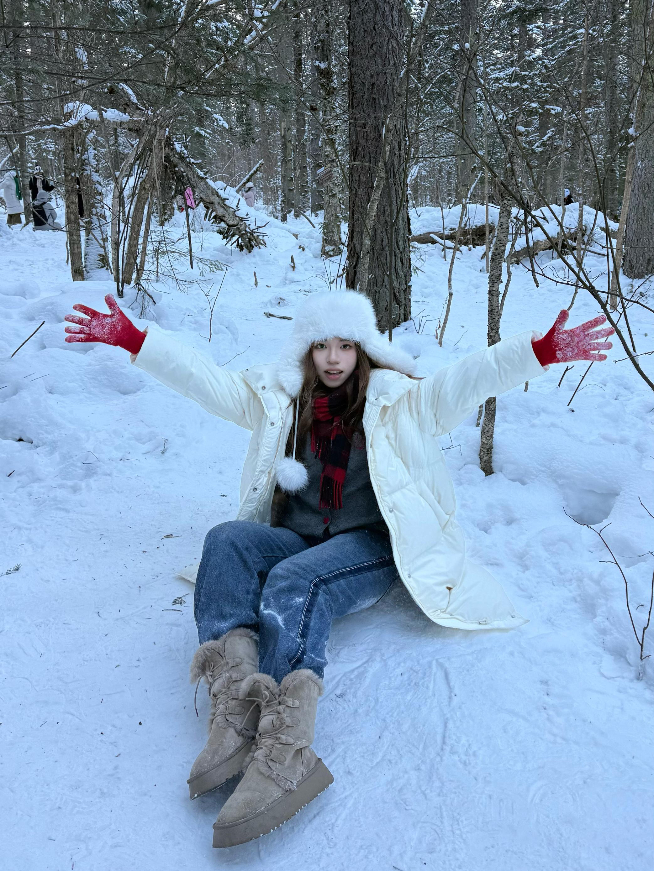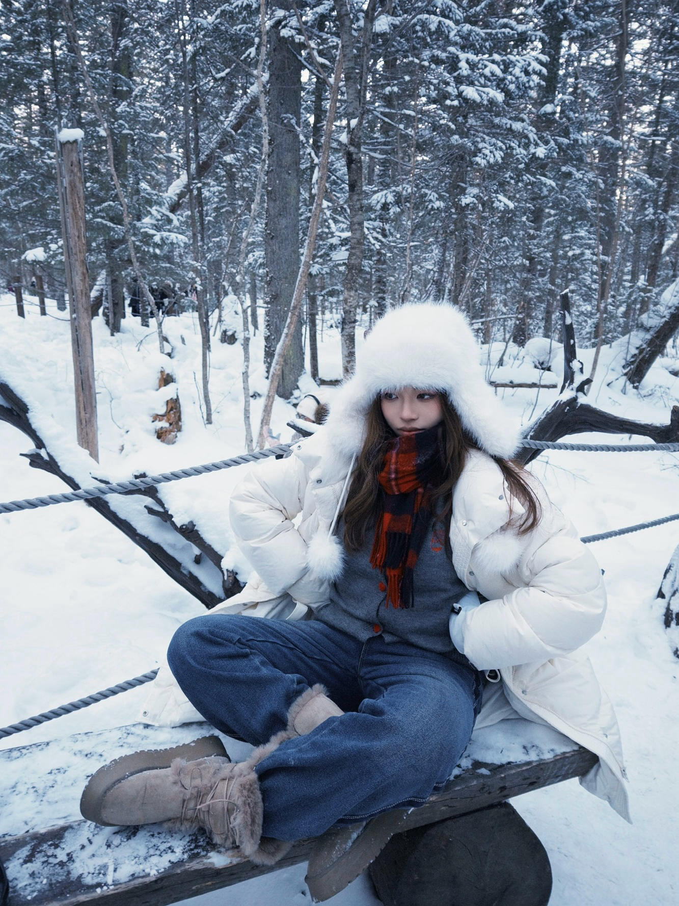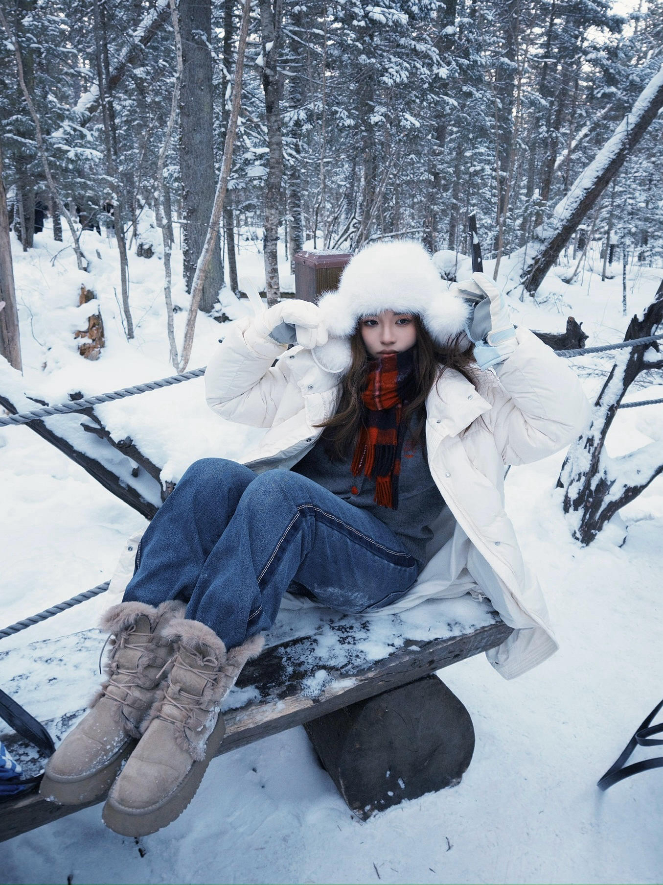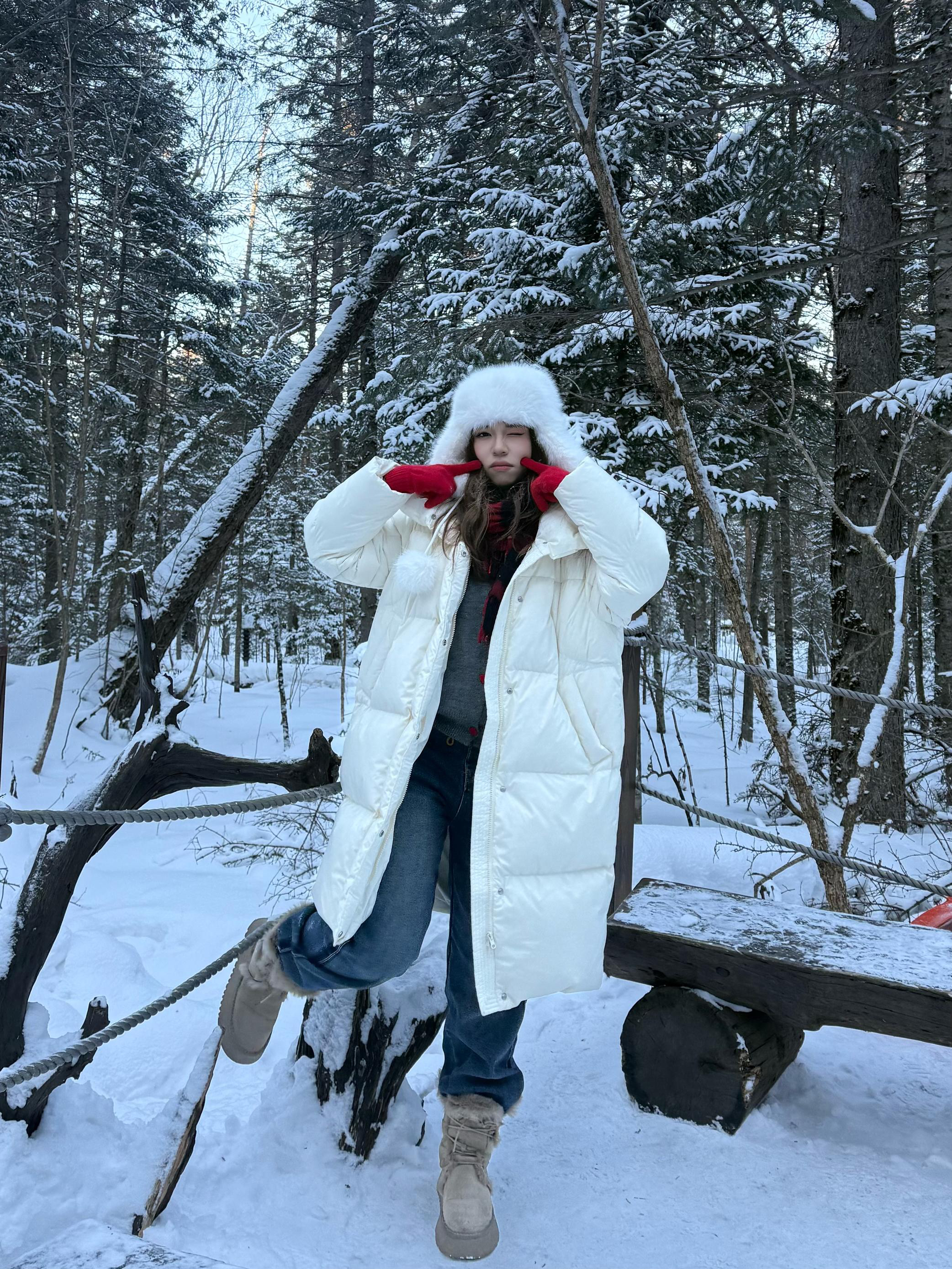 🧥白色长款羽绒服 衣身蓬松饱满保证保暖性 长款剪裁能最大程度阻挡寒风🌬️ 对身形的包裹性和修饰性俱佳 立领可贴合颈部锁温🐋 内搭多层衣物也不臃肿 兼顾了舒适度与穿搭的灵活性🪡 🧣红黑格纹围巾 红色调在白雪背景中格外亮眼 成为视觉焦点的同时提升保暖效果 👖深蓝色牛仔裤 👞浅卡其色雪地靴 整套穿搭凸显了冬日的温暖与浪漫