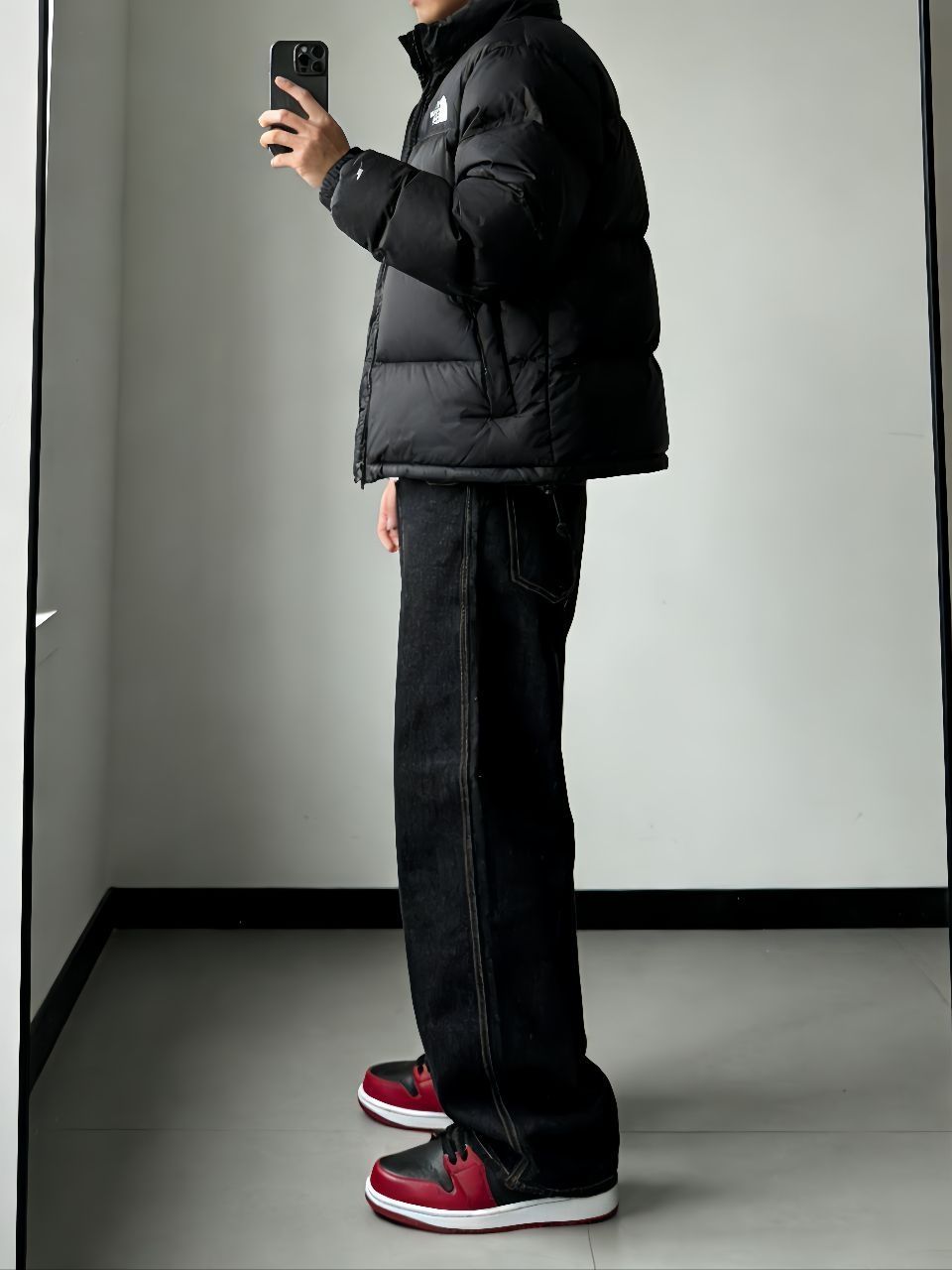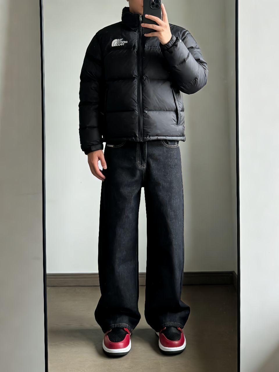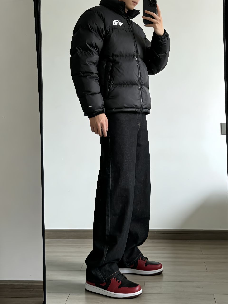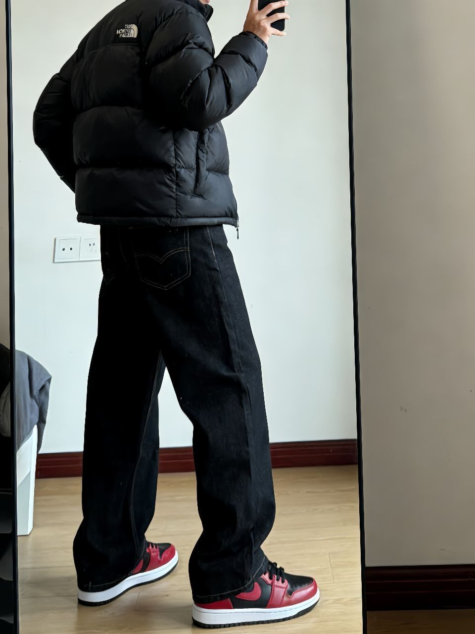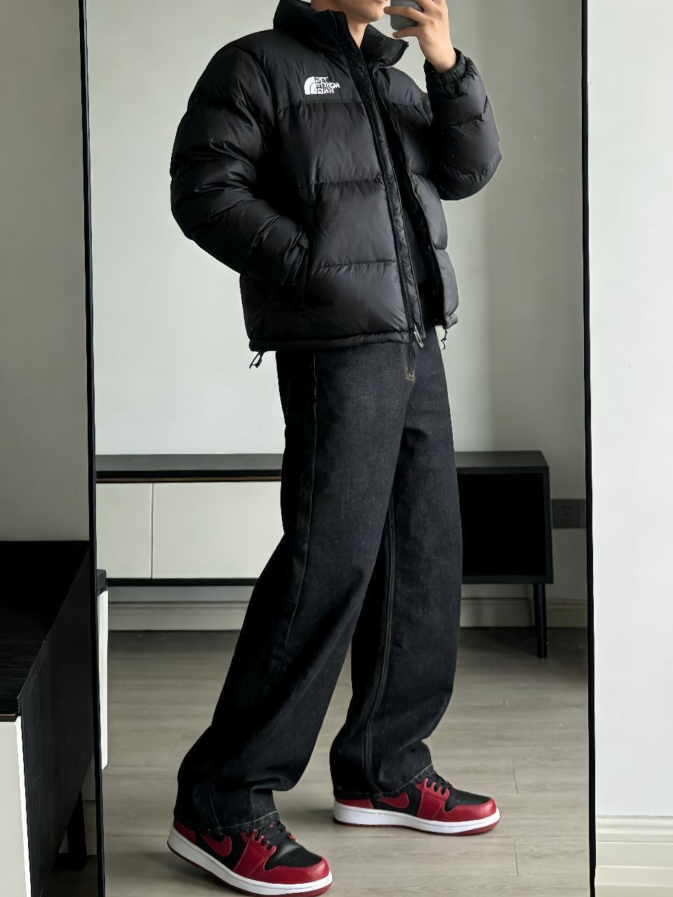 最近降温终于能穿羽绒服了!掏出我的北面1996黑色面包服,蓬松又轻便,裹着像裹小被子一样暖和。里头随便搭件卫衣就挺有层次,下半身配了新因素的黑色阔腿牛仔裤,版型真的绝——不拖地但显腿直,面料有筋骨,走路带风的感觉。 重点要说这双AJ1 Low黑红马年配色!黑红鞋身和羽绒服颜色呼应,脚感比想象中舒服,穿久了也不板脚。整套就是黑到底,但鞋子侧边一抹红瞬间提气,懒人搭配真的靠细节赢。 这样一身出门遛...