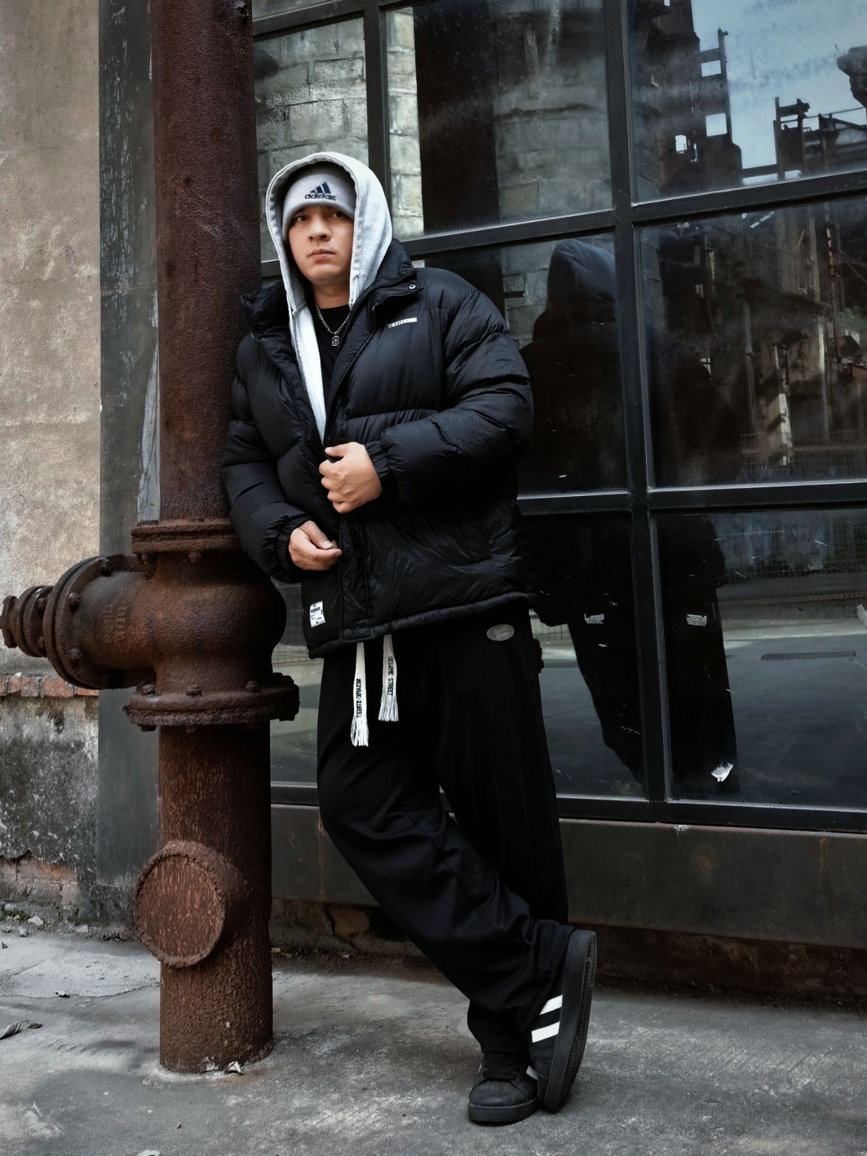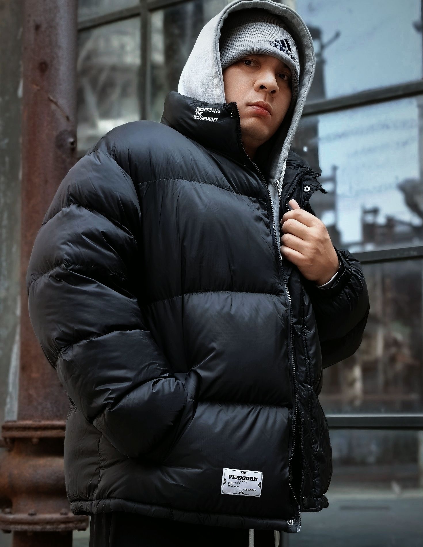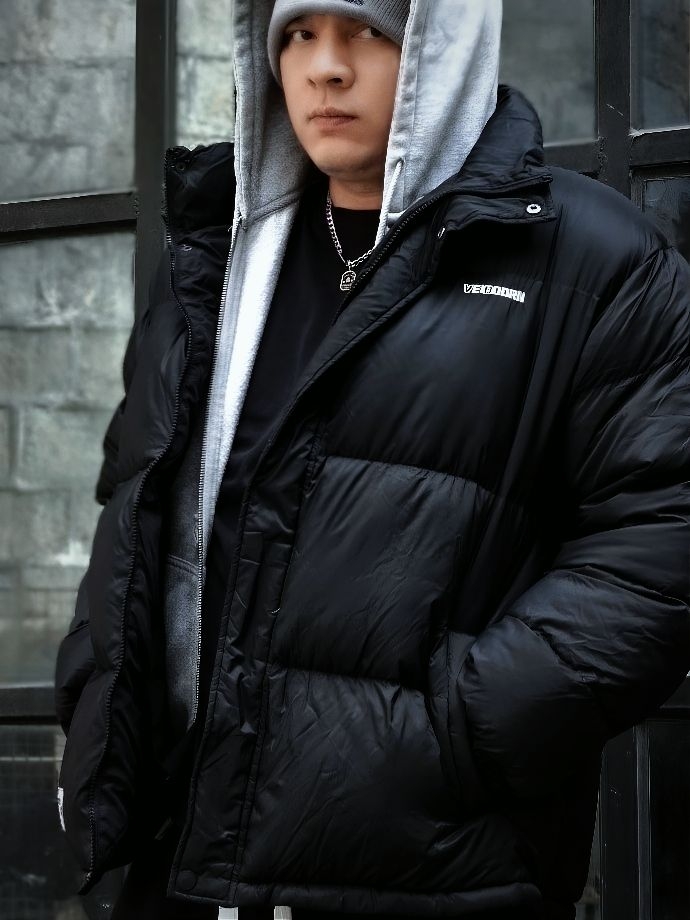 今天黑色系穿搭和旧厂区也太搭了! 分享一下这件维动VEIDOORN短款羽绒服,太好穿了 手感好轻好软,穿上身没有累赘感 填充也很厚实,更加的保暖锁温 经典黑色搭配上白线刺绣的小标识,很简约但不失时尚感 上图我尺码:180cm/90kg/3XL 今天搭配: 上身做了连帽卫衣内搭,层次感搭配 下身选一条同色系的宽松卫裤,显的酷酷的 这一身跟旧厂房碰撞出新的感觉!