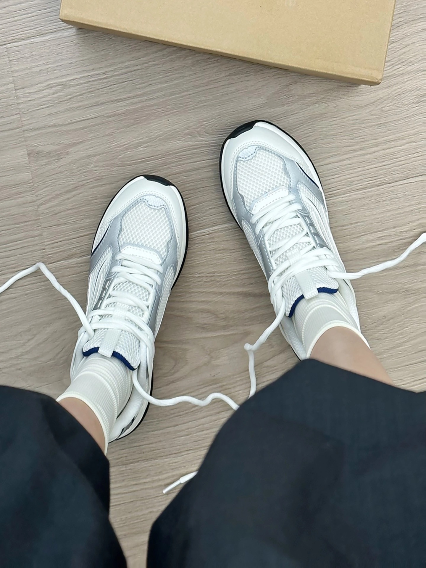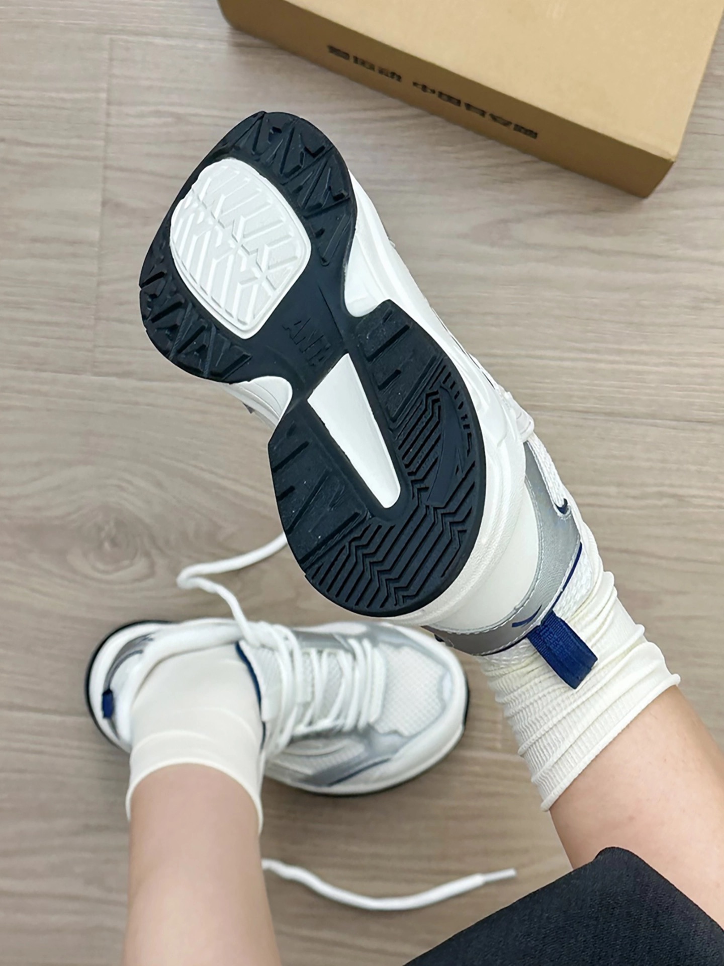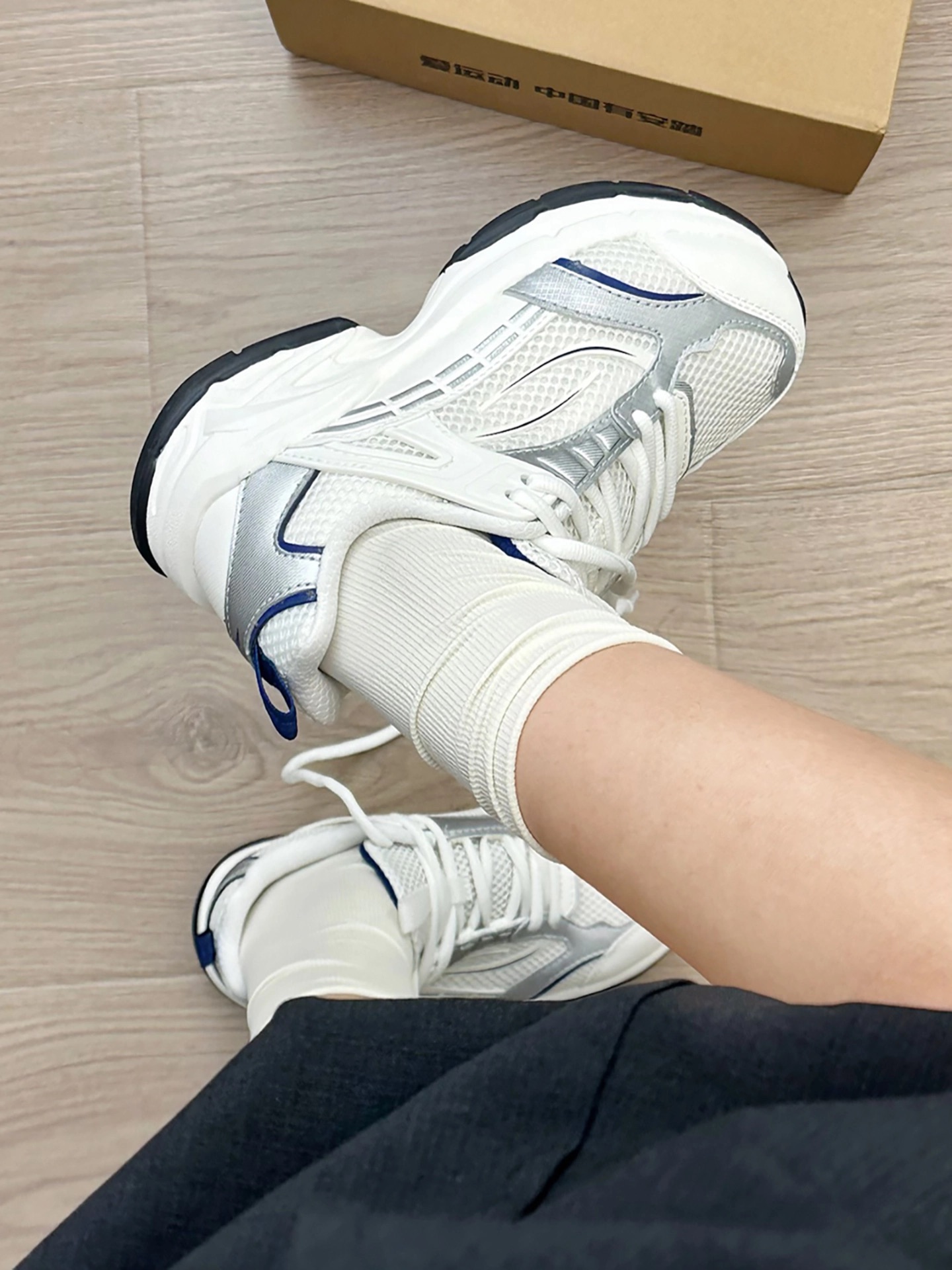 呜呜呜?? 我先穿为敬啦!! 鞋子整体是白灰蓝配色高级百搭 网面材质穿起来透气不闷脚 搭配衣服也很好搭配穿个卫衣,休闲服,牛仔裤都很合适 刚入手的时候,我开心的穿着它在商场逛了一大圈,搭配身上穿的白色休闲服,整个人看起来很时尚,朋友也夸我选的鞋子好看。而且我穿着它走了一天,我感觉脚感很舒服,一点也不觉得累脚 小伙伴可以参考下呦~