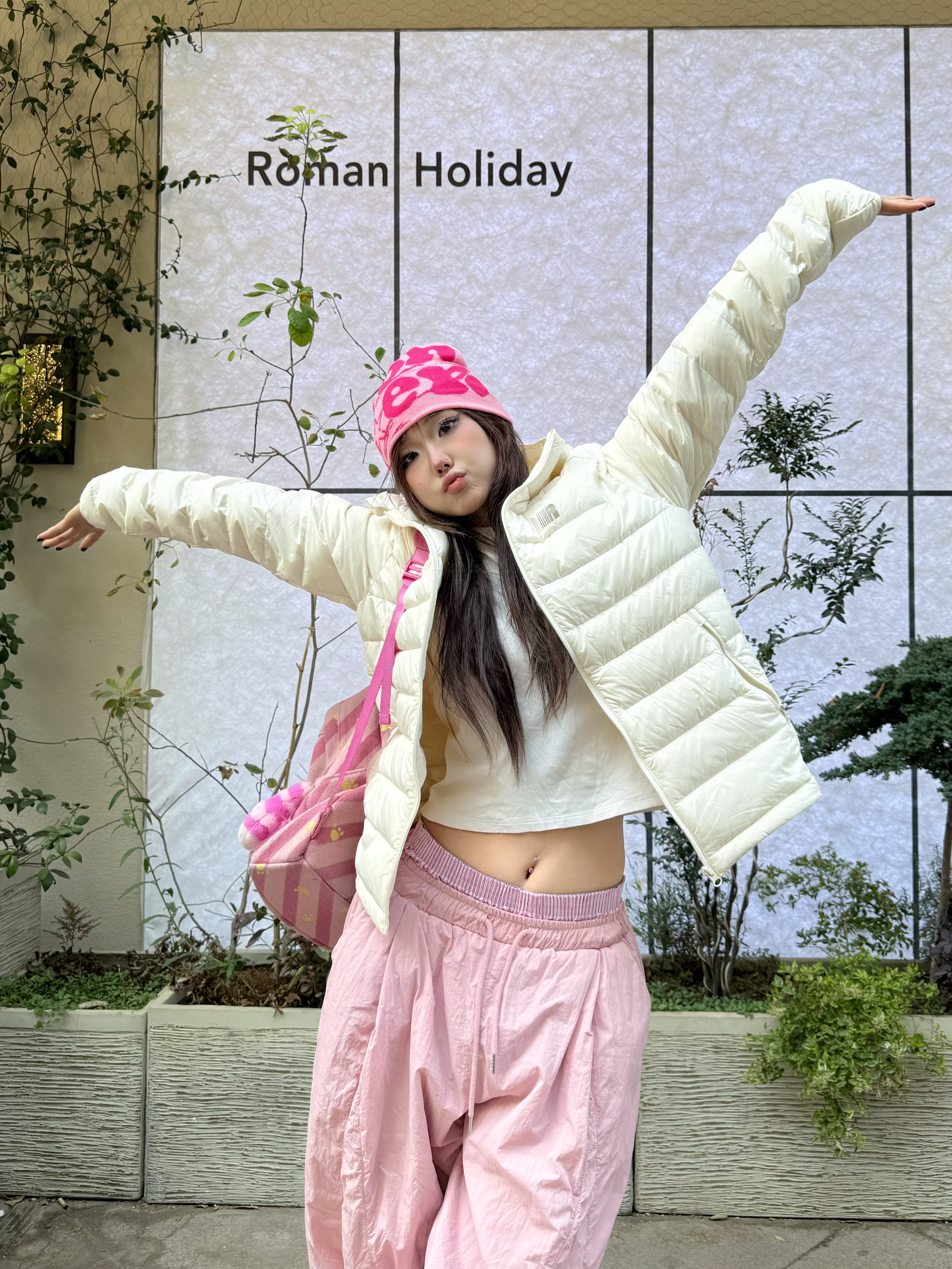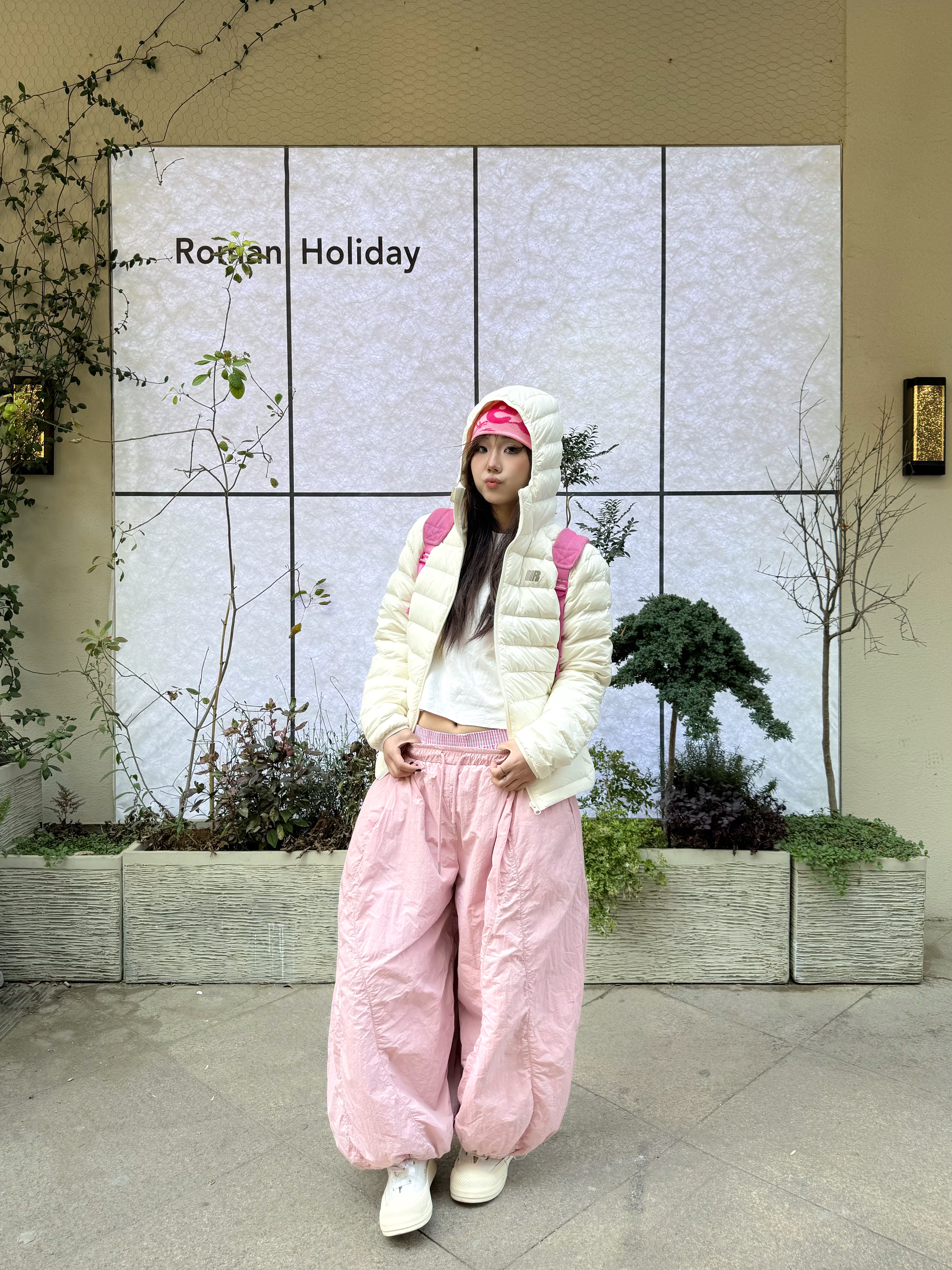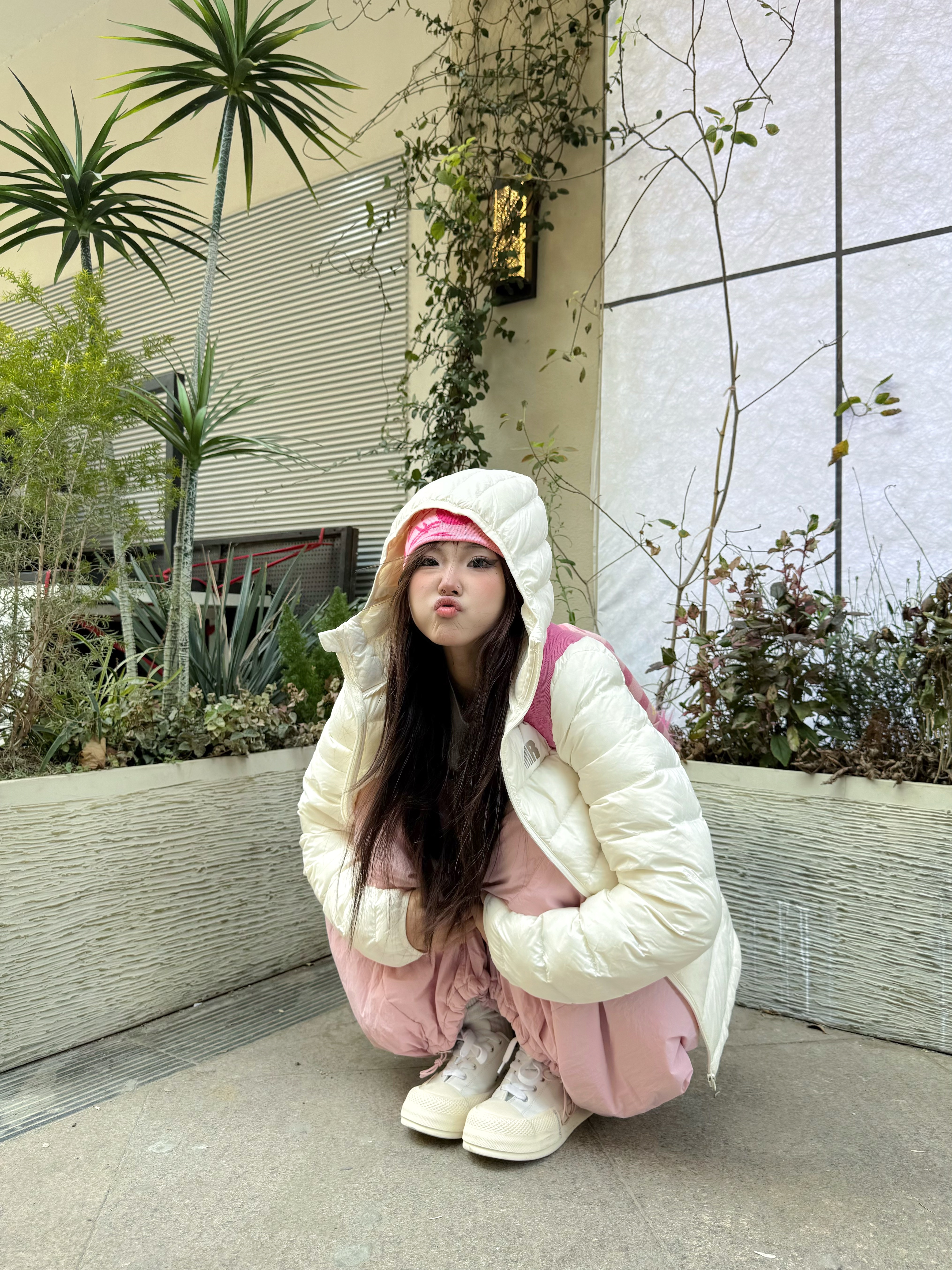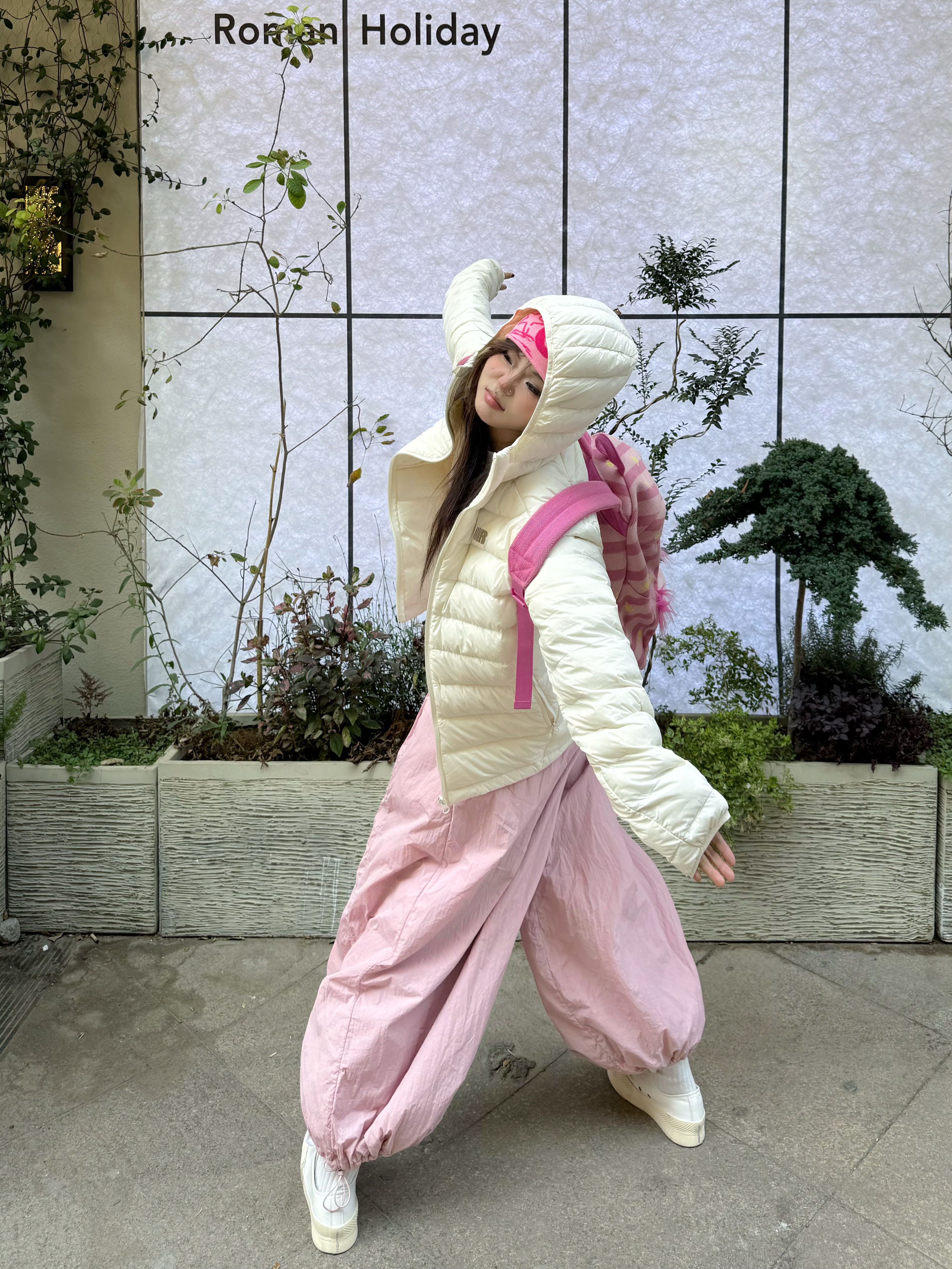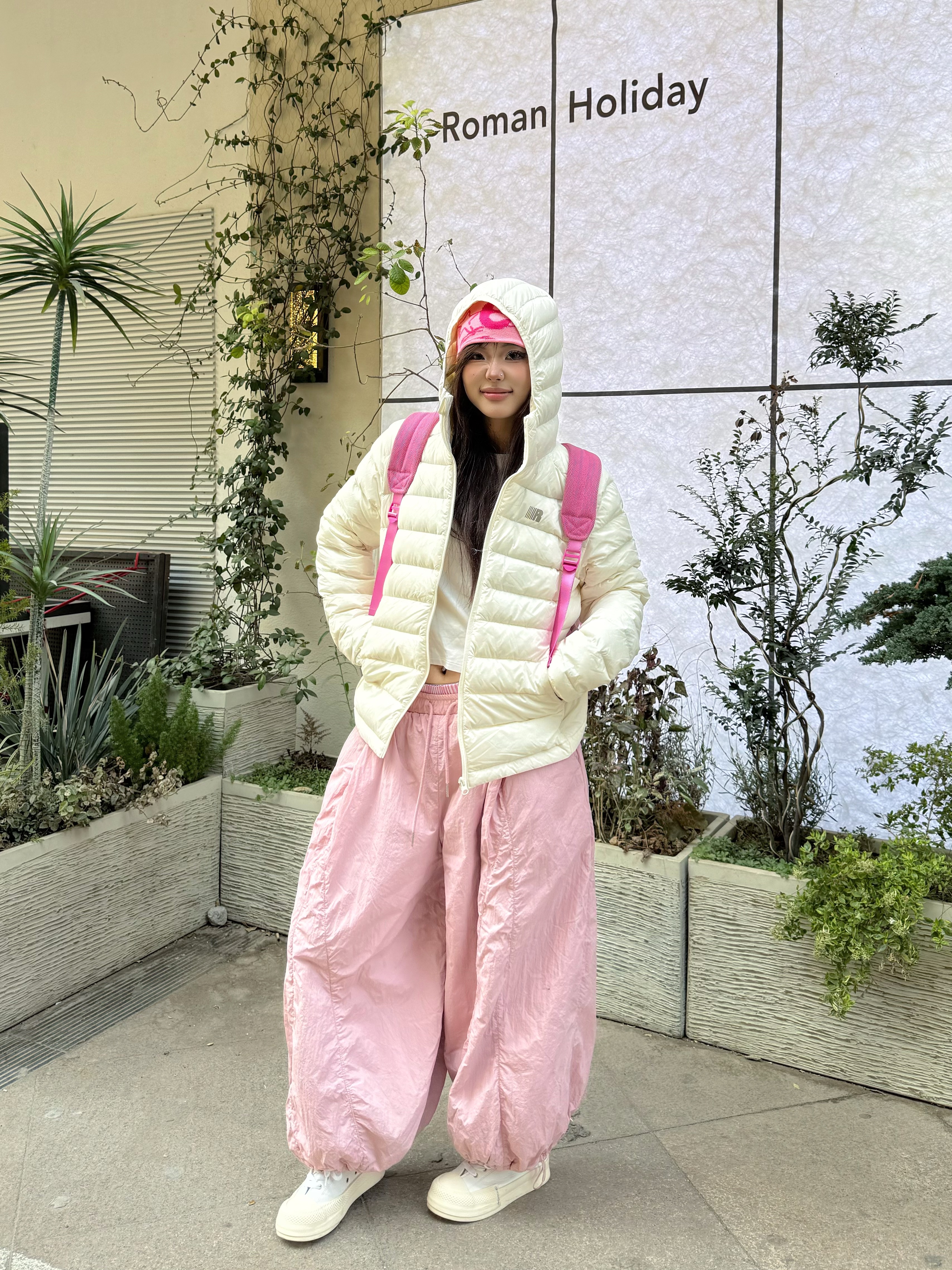 宋驭's ᴅᴀɪʟʏ ʟᴏᴏᴋ 168 ᴄᴍ /55 ᴋɢ 降温天的保暖穿搭也能很轻盈 这件 FDR 白色修身排骨羽绒服 当内胆或外穿都合适 简约干净 搭配粉色阔腿裤和白色帆布鞋 一身白粉配色显得人软软糯糯的 粉色冷帽同色系书包甜度刚好不腻人 保暖又上镜的日常穿搭