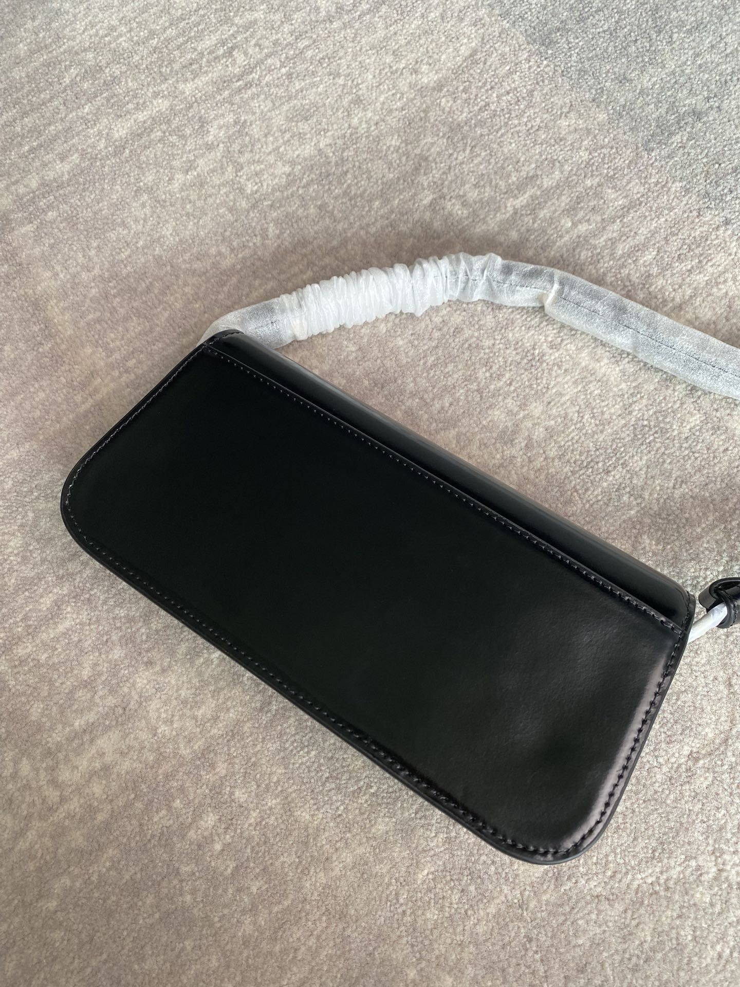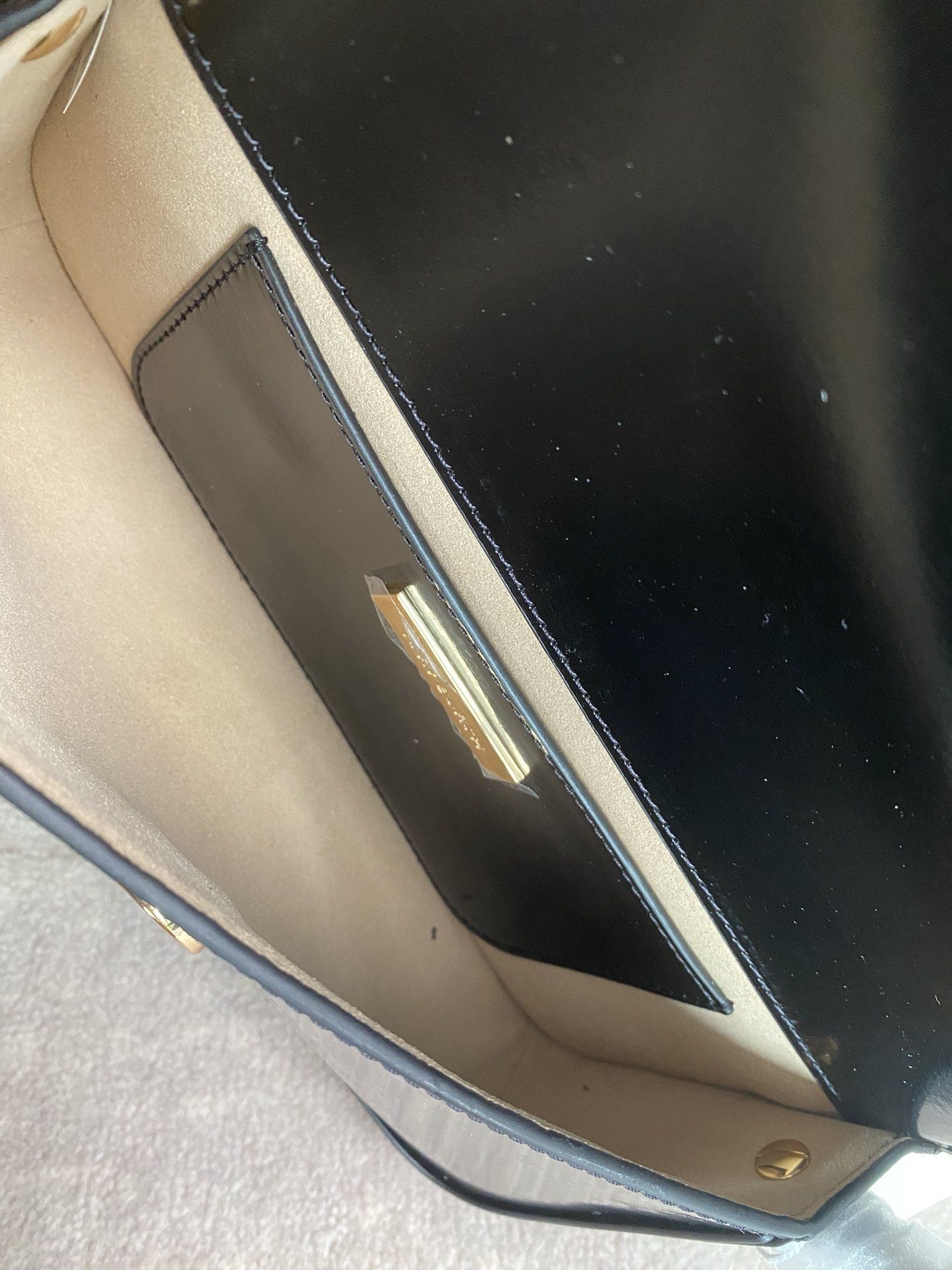 包身是挺括的黑色亮面漆皮,触手光滑冰凉,在光线下泛着含蓄的光泽,不是那种张扬的亮,是一种内敛的质感。25厘米的长度恰到好处,12厘米的厚度保证了容量,5厘米的宽度则让整体轮廓显得非常纤薄。我妹个子不算高,最怕包背起来压个子,这个尺寸对她来说刚刚好。最吸引我的是正面的金色圆形徽标,不是简单的logo粘贴,而是精致的金属件,边缘打磨得圆润光滑,像一枚小小的勋章。